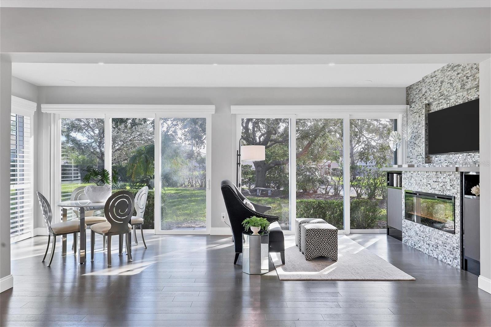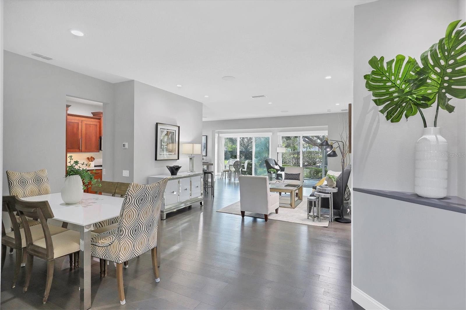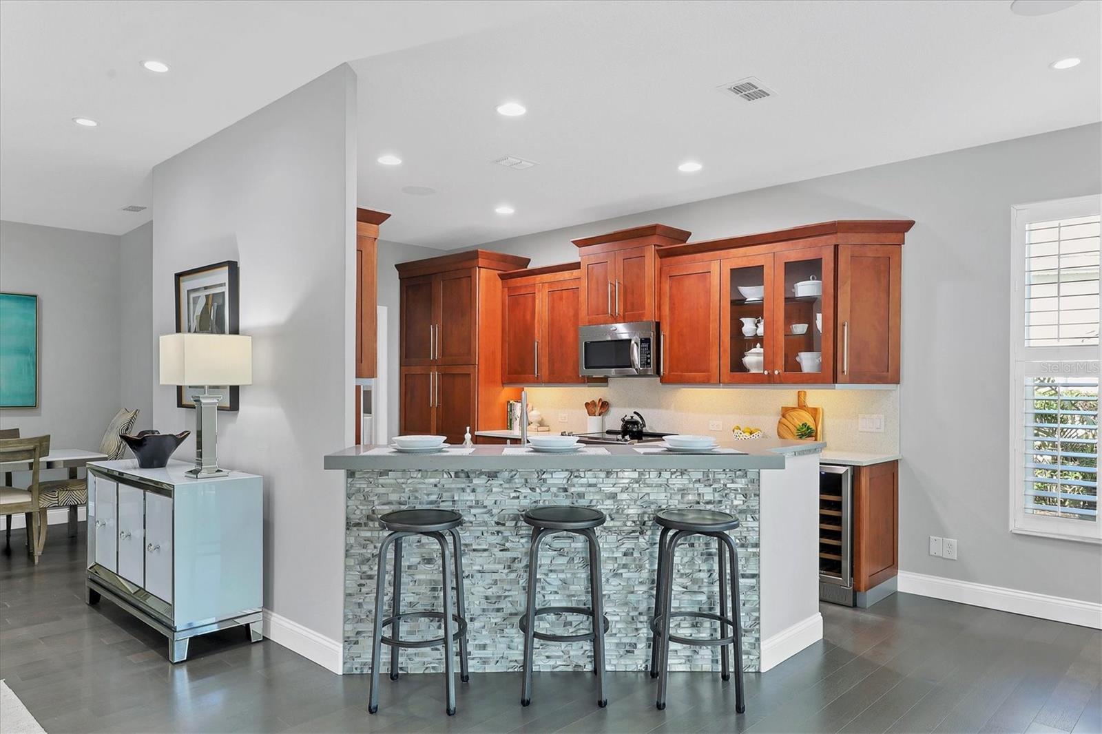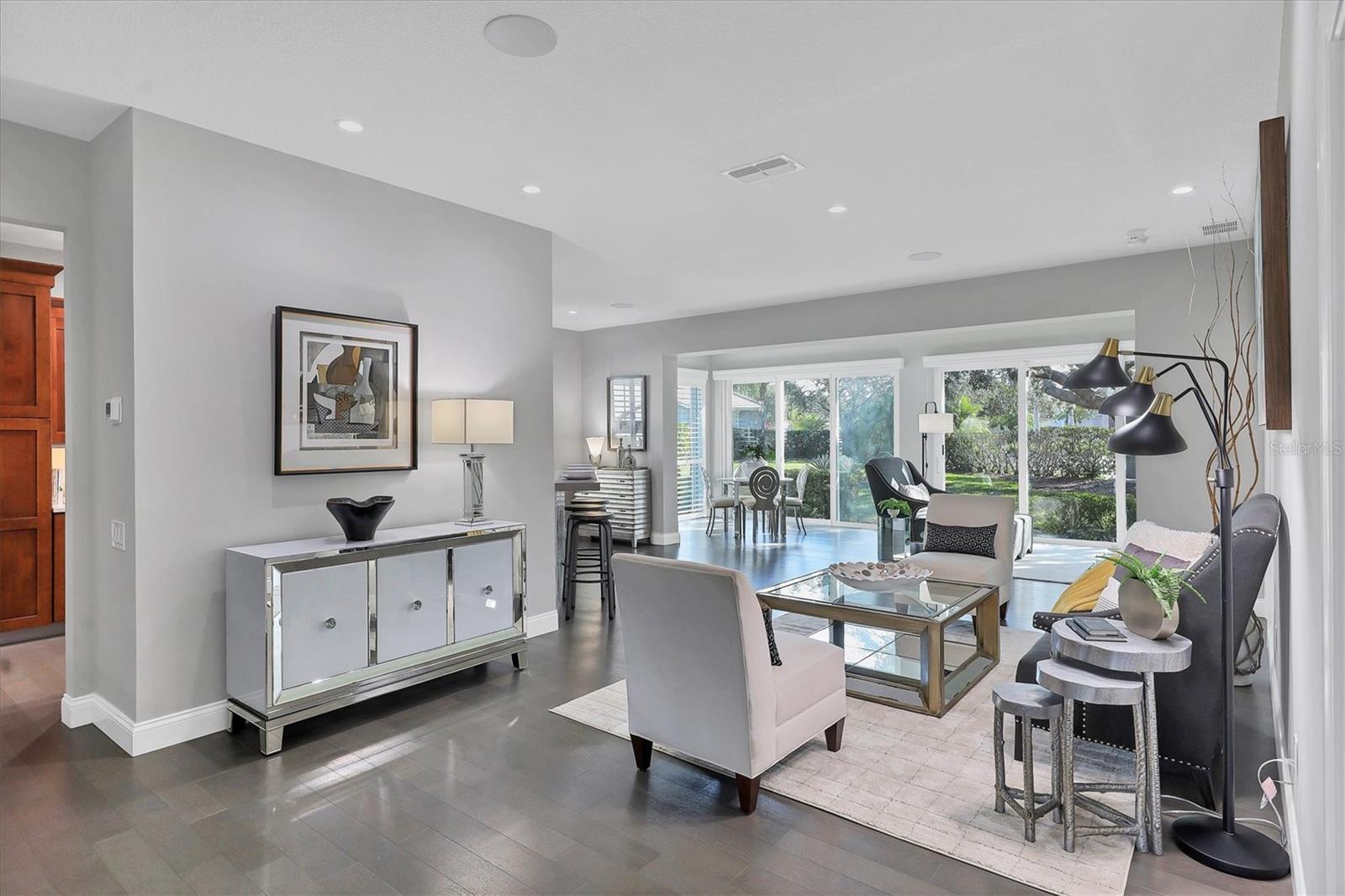 This beautiful updated three bedroom, two bathroom home in the Cove neighborhood of Edgewater Village will impress the most discerning buyer with its open floor plan and wonderful design features. The dining room and kitchen open into the great room creating an ideal gathering space for both daily activities and entertaining. A wall of sliding glass doors provides additional natural light and a wonderful view of the yard. This delightful home is appointed with newer engineered hardwood floors throughout and tile in both of the updated bathrooms. The impressively updated kitchen is fully equipped with solid wood custom cabinets, soft close dovetail constructed drawers, quartz counter tops and backsplash, under cabinet lighting, a wine refrigerator, counter seating, a large pantry and more. The Florida Room offers a place to sit and relax in front of the electric fireplace or to enjoy your favorite movie. The spacious primary suite includes a walk-in closet with built-ins and en-suite bath featuring separate vanities, quartz counters with undermount sink and a glass shower with ceramic tile. The third bedroom is currently used as an office with built-in cabinets and could be converted back to a bedroom if needed. This outstanding home is being offered turnkey furnished and has a number of additional features. These include impact glass doors and windows to eliminate the need for hurricane shutters, a tankless water heater to avoid running out of hot water, attractive plantation shutters throughout, unobtrusive retractable slider door shades, HVAC system new in 2022, abundant closet and garage storage, and refreshed front landscaping. You can say goodbye to the tedious landscaping chores because the HOA takes care of it for you in this maintenance free neighborhood. Edgewater residents have access to the 153 acre Lake Uihlein with its covered gazebo, fishing pier, canoe/kayak launch along the lake banks and walking trails that wind through the Village. This property is conveniently located near the community pool, downtown Lakewood Ranch, the new Centerpoint dining and shopping center, I-75, UTC Mall, downtown Sarasota and the beaches. Take advantage of the opportunity to make this extraordinary home your own.