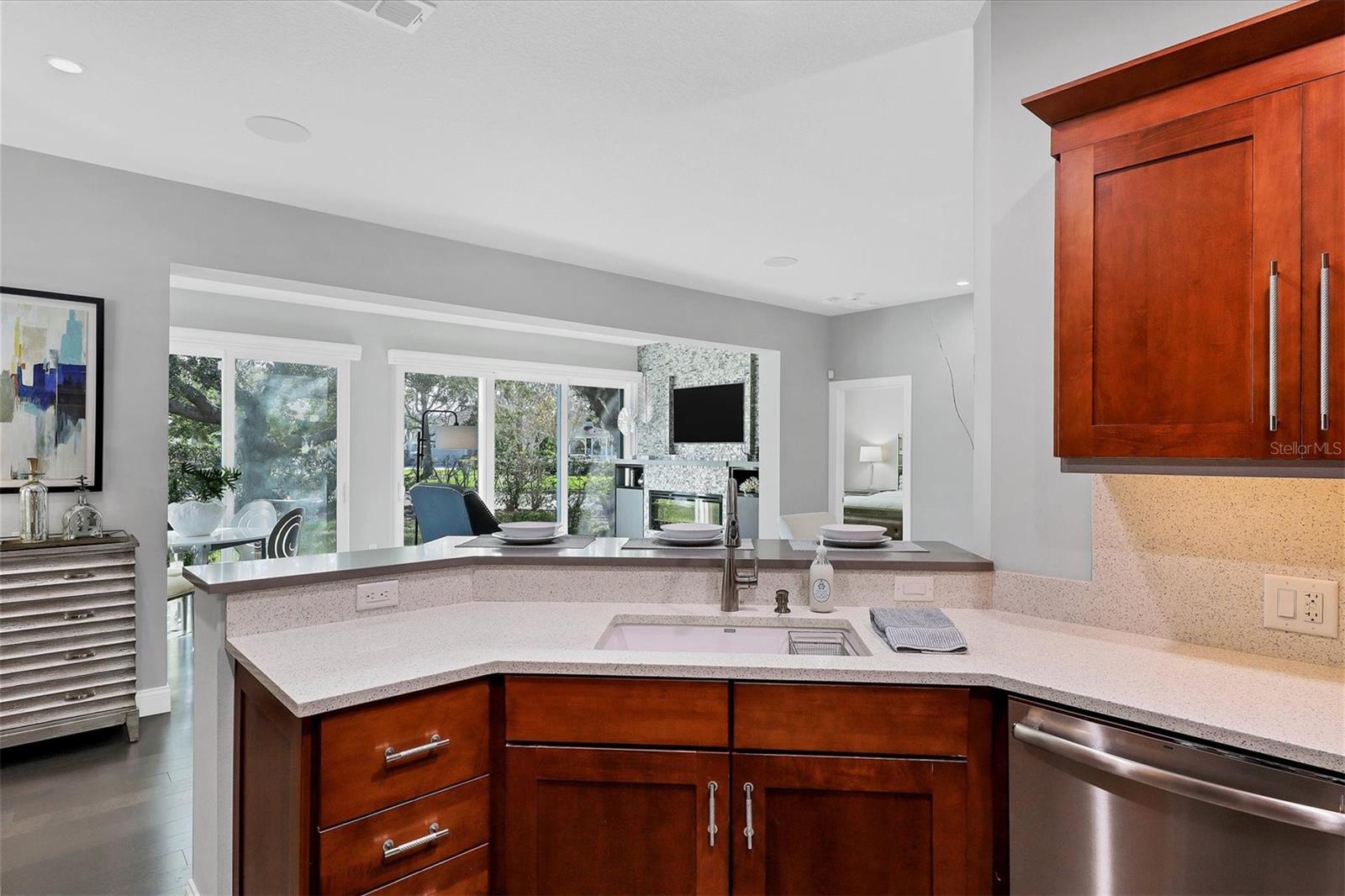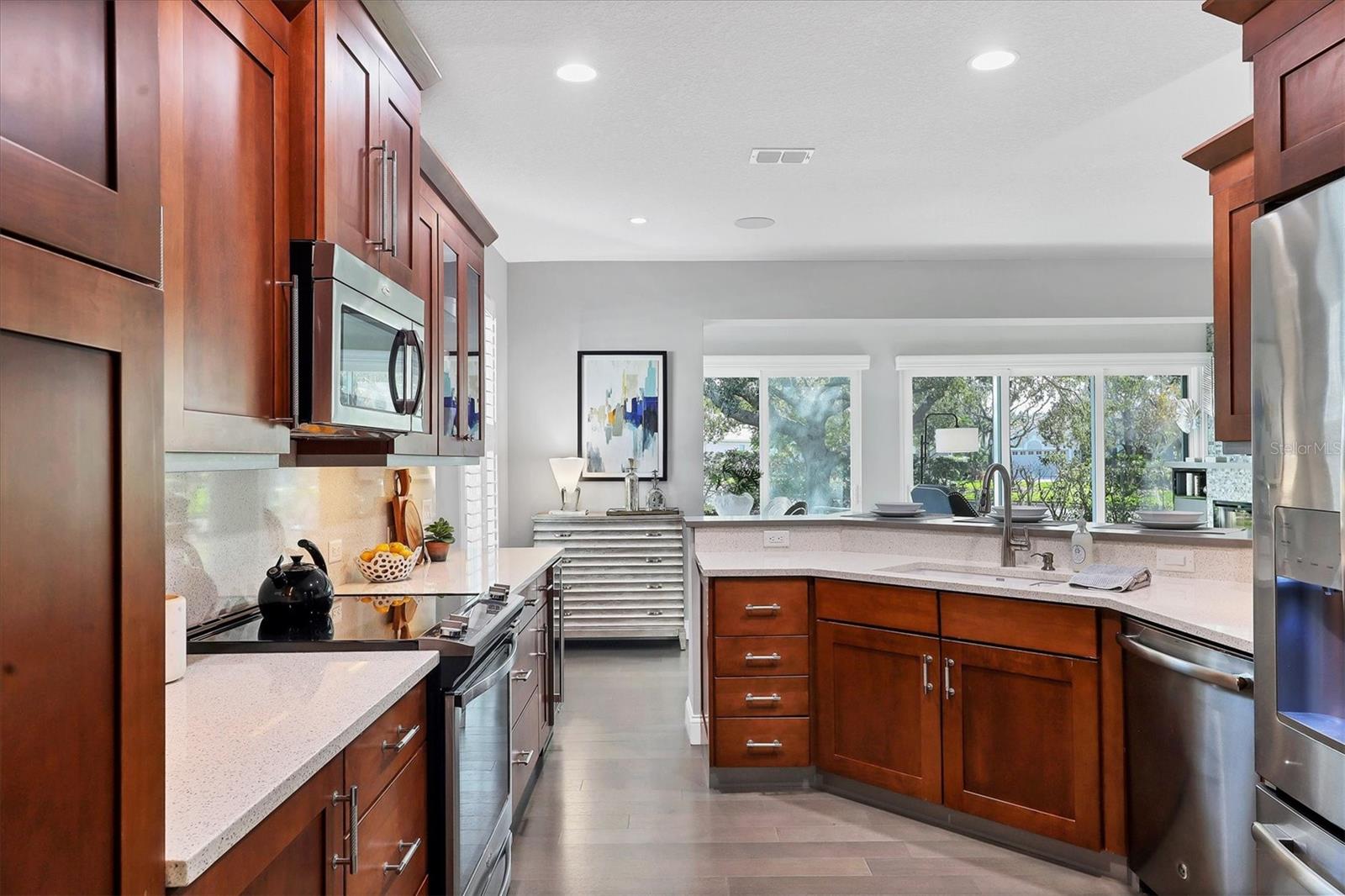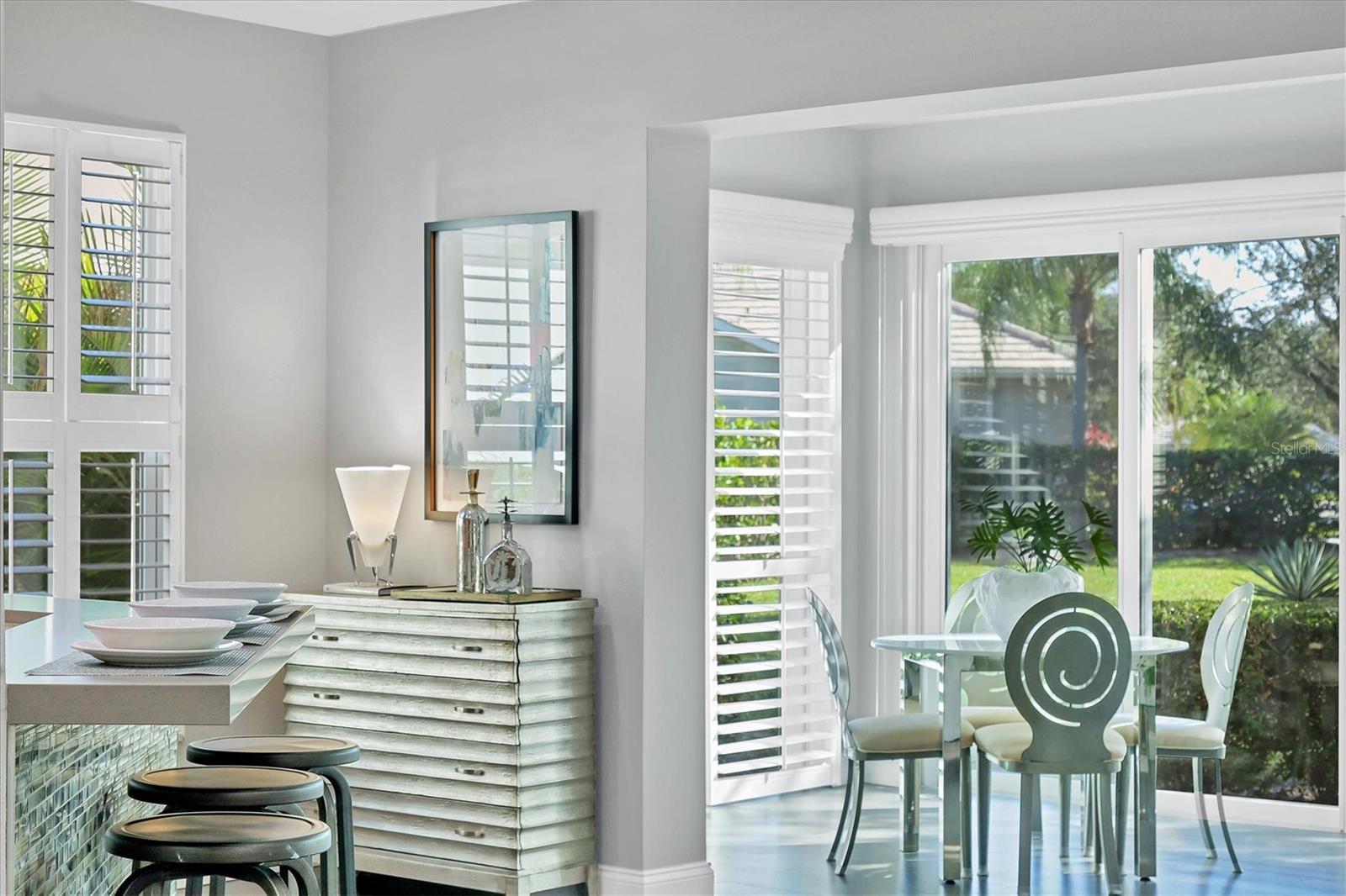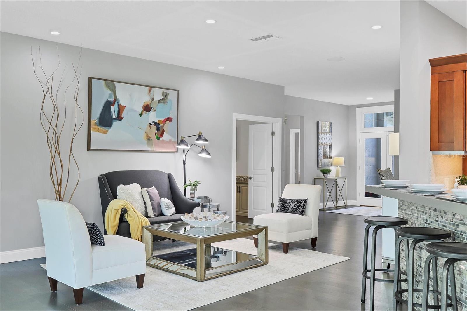 This beautiful updated three bedroom, two bathroom home in the Cove neighborhood of Edgewater Village will impress the most discerning buyer with its open floor plan and wonderful design features. The dining room and kitchen open into the great room creating an ideal gathering space for both daily activities and entertaining. A wall of sliding glass doors provides additional natural light and a wonderful view of the yard. This delightful home is appointed with newer engineered hardwood floors throughout and tile in both of the updated bathrooms. The impressively updated kitchen is fully equipped with solid wood custom cabinets, soft close dovetail constructed drawers, quartz counter tops and backsplash, under cabinet lighting, a wine refrigerator, counter seating, a large pantry and more. The Florida Room offers a place to sit and relax in front of the electric fireplace or to enjoy your favorite movie. The spacious primary suite includes a walk-in closet with built-ins and en-suite bath featuring separate vanities, quartz counters with undermount sink and a glass shower with ceramic tile. The third bedroom is currently used as an office with built-in cabinets and could be converted back to a bedroom if needed. This outstanding home is being offered turnkey furnished and has a number of additional features. These include impact glass doors and windows to eliminate the need for hurricane shutters, a tankless water heater to avoid running out of hot water, attractive plantation shutters throughout, unobtrusive retractable slider door shades, HVAC system new in 2022, abundant closet and garage storage, and refreshed front landscaping. You can say goodbye to the tedious landscaping chores because the HOA takes care of it for you in this maintenance free neighborhood. Edgewater residents have access to the 153 acre Lake Uihlein with its covered gazebo, fishing pier, canoe/kayak launch along the lake banks and walking trails that wind through the Village. This property is conveniently located near the community pool, downtown Lakewood Ranch, the new Centerpoint dining and shopping center, I-75, UTC Mall, downtown Sarasota and the beaches. Take advantage of the opportunity to make this extraordinary home your own.