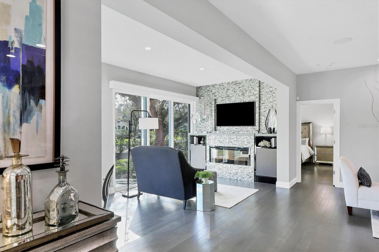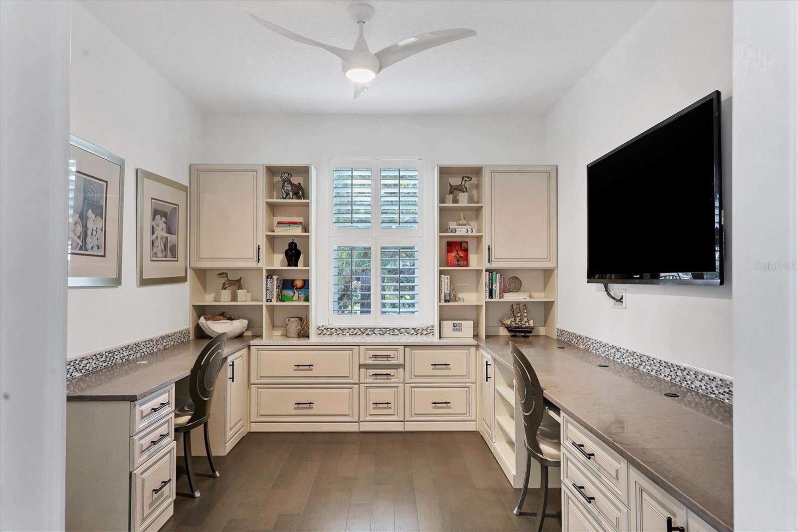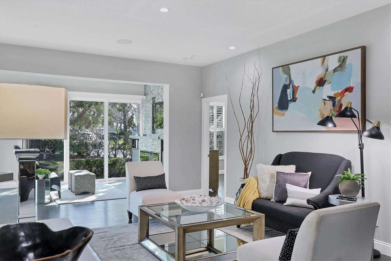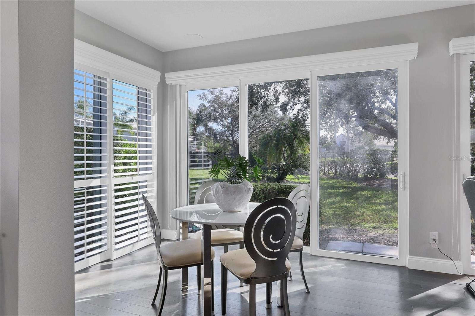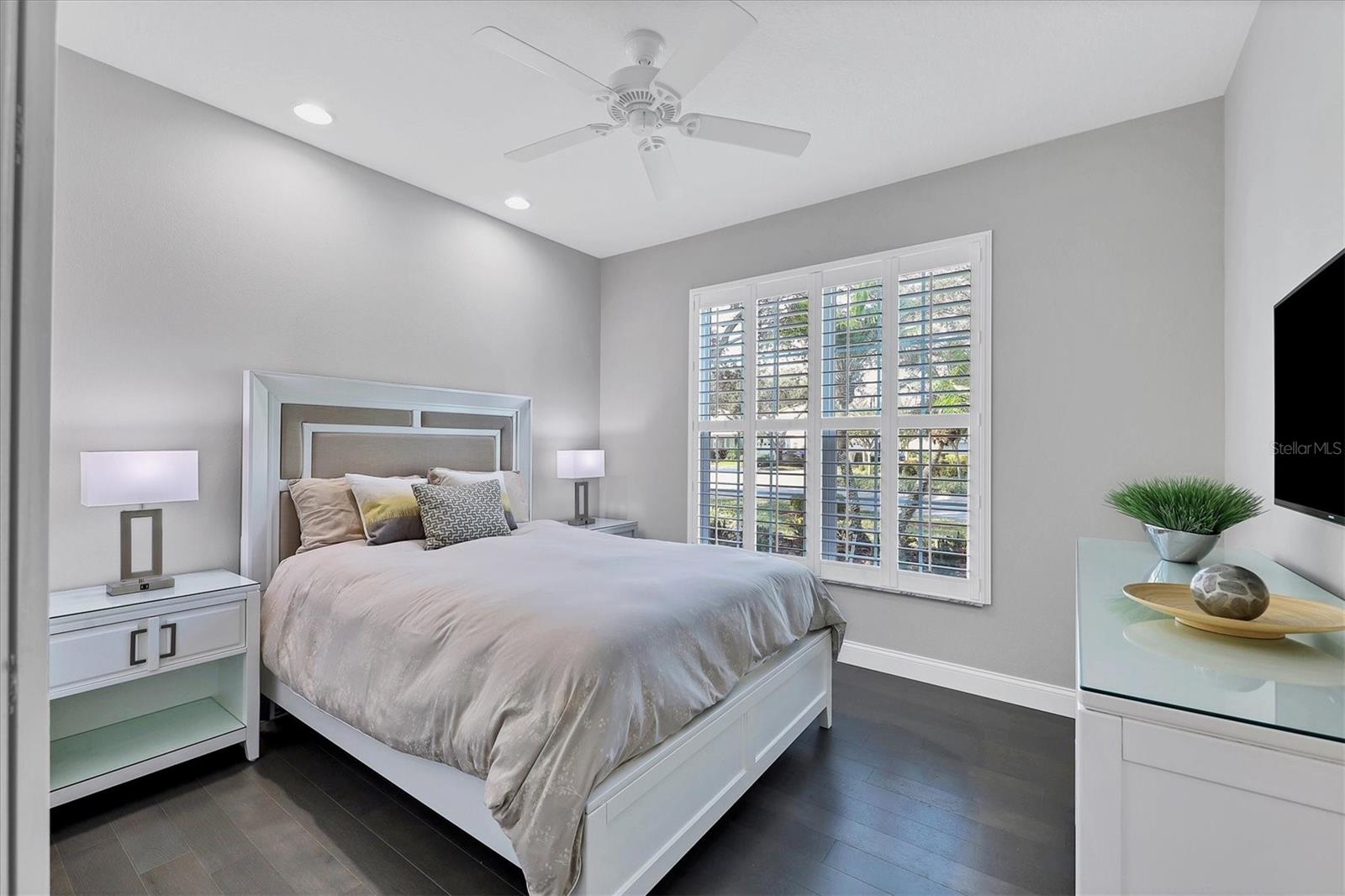 This beautiful updated three bedroom, two bathroom home in the Cove neighborhood of Edgewater Village will impress the most discerning buyer with its open floor plan and wonderful design features. The dining room and kitchen open into the great room creating an ideal gathering space for both daily activities and entertaining. A wall of sliding glass doors provides additional natural light and a wonderful view of the yard. This delightful home is appointed with newer engineered hardwood floors throughout and tile in both of the updated bathrooms. The impressively updated kitchen is fully equipped with solid wood custom cabinets, soft close dovetail constructed drawers, quartz counter tops and backsplash, under cabinet lighting, a wine refrigerator, counter seating, a large pantry and more. The Florida Room offers a place to sit and relax in front of the electric fireplace or to enjoy your favorite movie. The spacious primary suite includes a walk-in closet with built-ins and en-suite bath featuring separate vanities, quartz counters with undermount sink and a glass shower with ceramic tile. The third bedroom is currently used as an office with built-in cabinets and could be converted back to a bedroom if needed. This outstanding home is being offered turnkey furnished and has a number of additional features. These include impact glass doors and windows to eliminate the need for hurricane shutters, a tankless water heater to avoid running out of hot water, attractive plantation shutters throughout, unobtrusive retractable slider door shades, HVAC system new in 2022, abundant closet and garage storage, and refreshed front landscaping. You can say goodbye to the tedious landscaping chores because the HOA takes care of it for you in this maintenance free neighborhood. Edgewater residents have access to the 153 acre Lake Uihlein with its covered gazebo, fishing pier, canoe/kayak launch along the lake banks and walking trails that wind through the Village. This property is conveniently located near the community pool, downtown Lakewood Ranch, the new Centerpoint dining and shopping center, I-75, UTC Mall, downtown Sarasota and the beaches. Take advantage of the opportunity to make this extraordinary home your own.