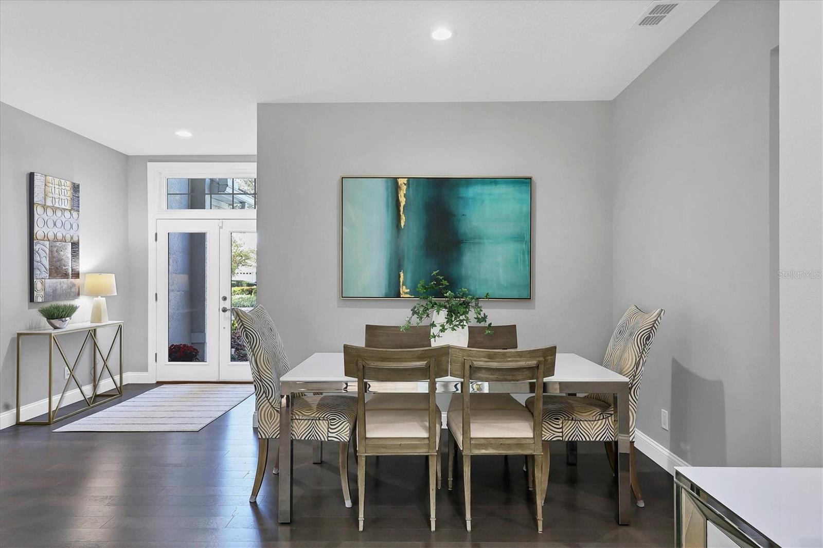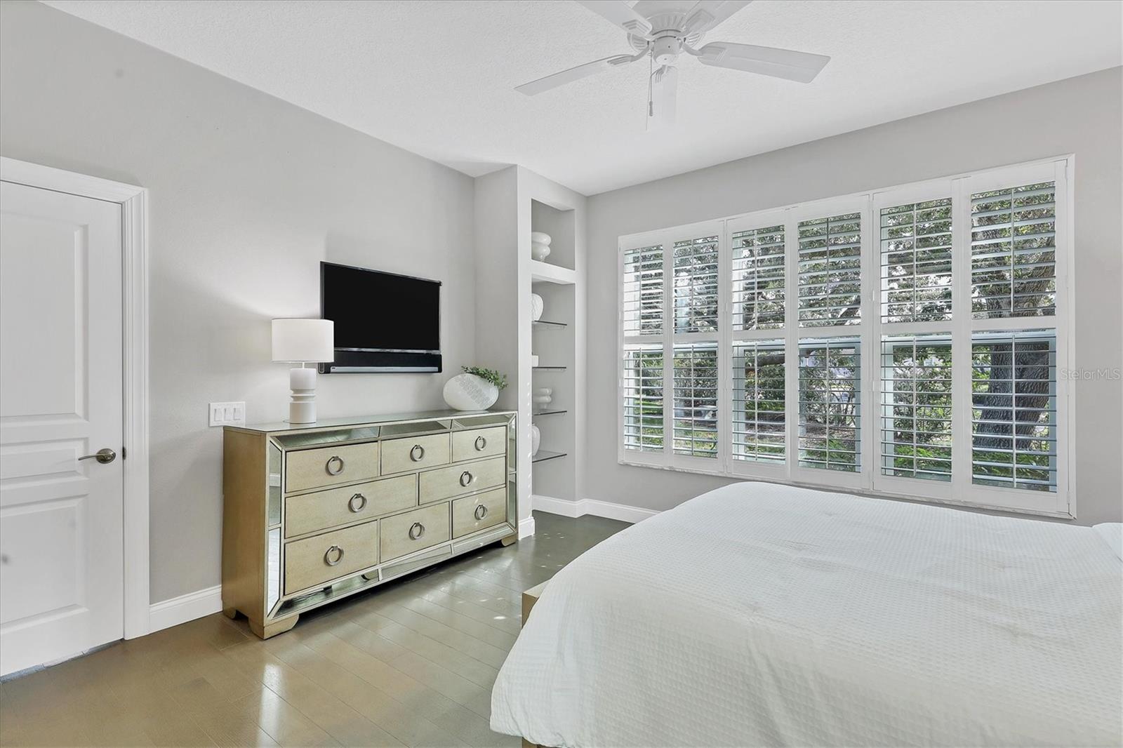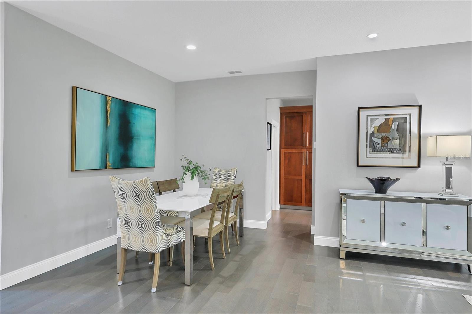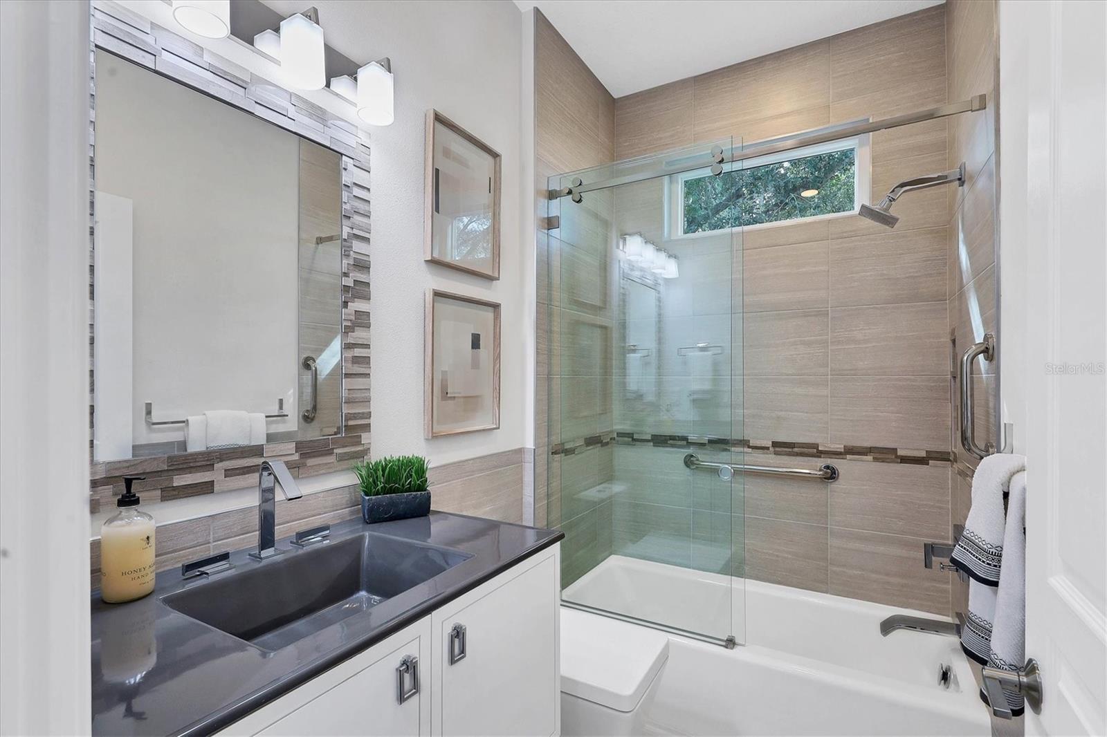 This beautiful updated three bedroom, two bathroom home in the Cove neighborhood of Edgewater Village will impress the most discerning buyer with its open floor plan and wonderful design features. The dining room and kitchen open into the great room creating an ideal gathering space for both daily activities and entertaining. A wall of sliding glass doors provides additional natural light and a wonderful view of the yard. This delightful home is appointed with newer engineered hardwood floors throughout and tile in both of the updated bathrooms. The impressively updated kitchen is fully equipped with solid wood custom cabinets, soft close dovetail constructed drawers, quartz counter tops and backsplash, under cabinet lighting, a wine refrigerator, counter seating, a large pantry and more. The Florida Room offers a place to sit and relax in front of the electric fireplace or to enjoy your favorite movie. The spacious primary suite includes a walk-in closet with built-ins and en-suite bath featuring separate vanities, quartz counters with undermount sink and a glass shower with ceramic tile. The third bedroom is currently used as an office with built-in cabinets and could be converted back to a bedroom if needed. This outstanding home is being offered turnkey furnished and has a number of additional features. These include impact glass doors and windows to eliminate the need for hurricane shutters, a tankless water heater to avoid running out of hot water, attractive plantation shutters throughout, unobtrusive retractable slider door shades, HVAC system new in 2022, abundant closet and garage storage, and refreshed front landscaping. You can say goodbye to the tedious landscaping chores because the HOA takes care of it for you in this maintenance free neighborhood. Edgewater residents have access to the 153 acre Lake Uihlein with its covered gazebo, fishing pier, canoe/kayak launch along the lake banks and walking trails that wind through the Village. This property is conveniently located near the community pool, downtown Lakewood Ranch, the new Centerpoint dining and shopping center, I-75, UTC Mall, downtown Sarasota and the beaches. Take advantage of the opportunity to make this extraordinary home your own.