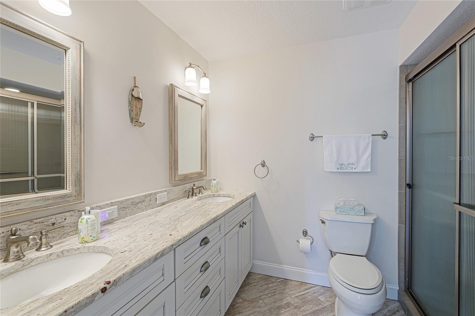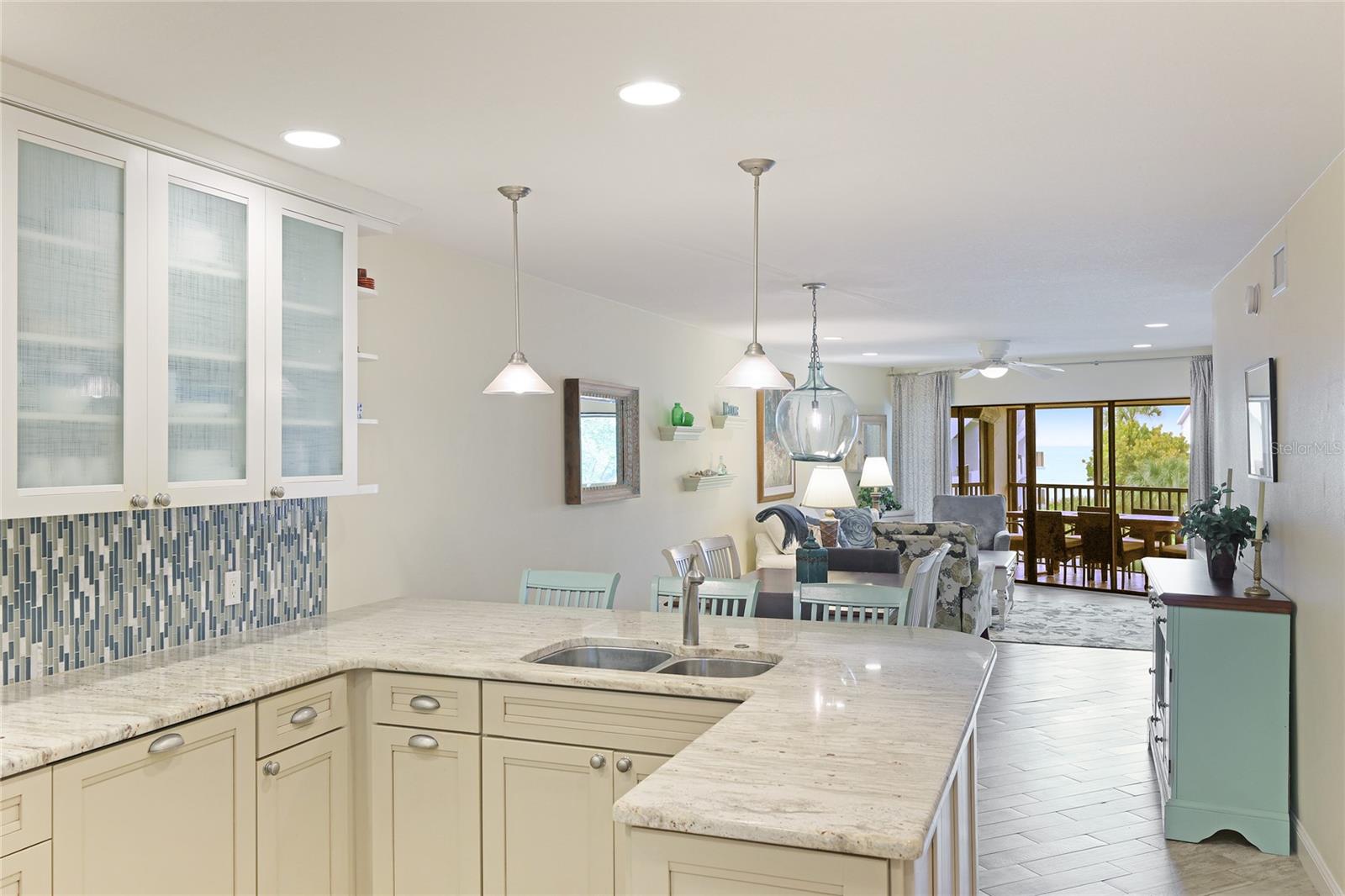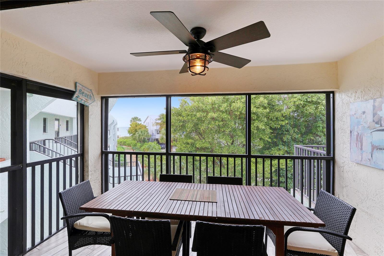 Enjoy Gulf views from the kitchen, dining and living areas as well as the Primary bedroom in this totally updated, fully furnished 2 bedroom condo in desirable Sun Plaza West. The building is constructed of sturdy pre-stressed concrete and concrete block with your reserved parking space conveniently located beneath the building. Take the elevator to the second (top) floor for easy access.There are hurricane shutters on the sliding glass doors off the living room as well as the primary bedroom for additional protection. This stunning condo boasts wood look porcelain tile throughout, a modern kitchen featuring tons of storage in the plentiful wood cabinets, and upgraded quartz countertops. In addition to a lovely dining area, and welcoming living area, there is a breakfast bar that seats three. The sliding glass doors open out to a screened, tiled patio, expanding the already ample entertaining area, and perfect for al fresco dining while watching the sunset on the Gulf. The spacious Primary bedroom offers its own private balcony, a large walk in closet, and a beautifully remodeled en suite bathroom. The welcoming guest bedroom also features a newly remodeled en suite bathroom. This exceptional condo offers more storage than usual as well as an assigned secure storage unit on the lower level. The owner has replaced the AC last year, the water heater two years ago, and the front door in 2020. The seller has a warranty for the kitchen appliances to Oct. 2024. Now the only thing for you to do is come to the beach and relax.