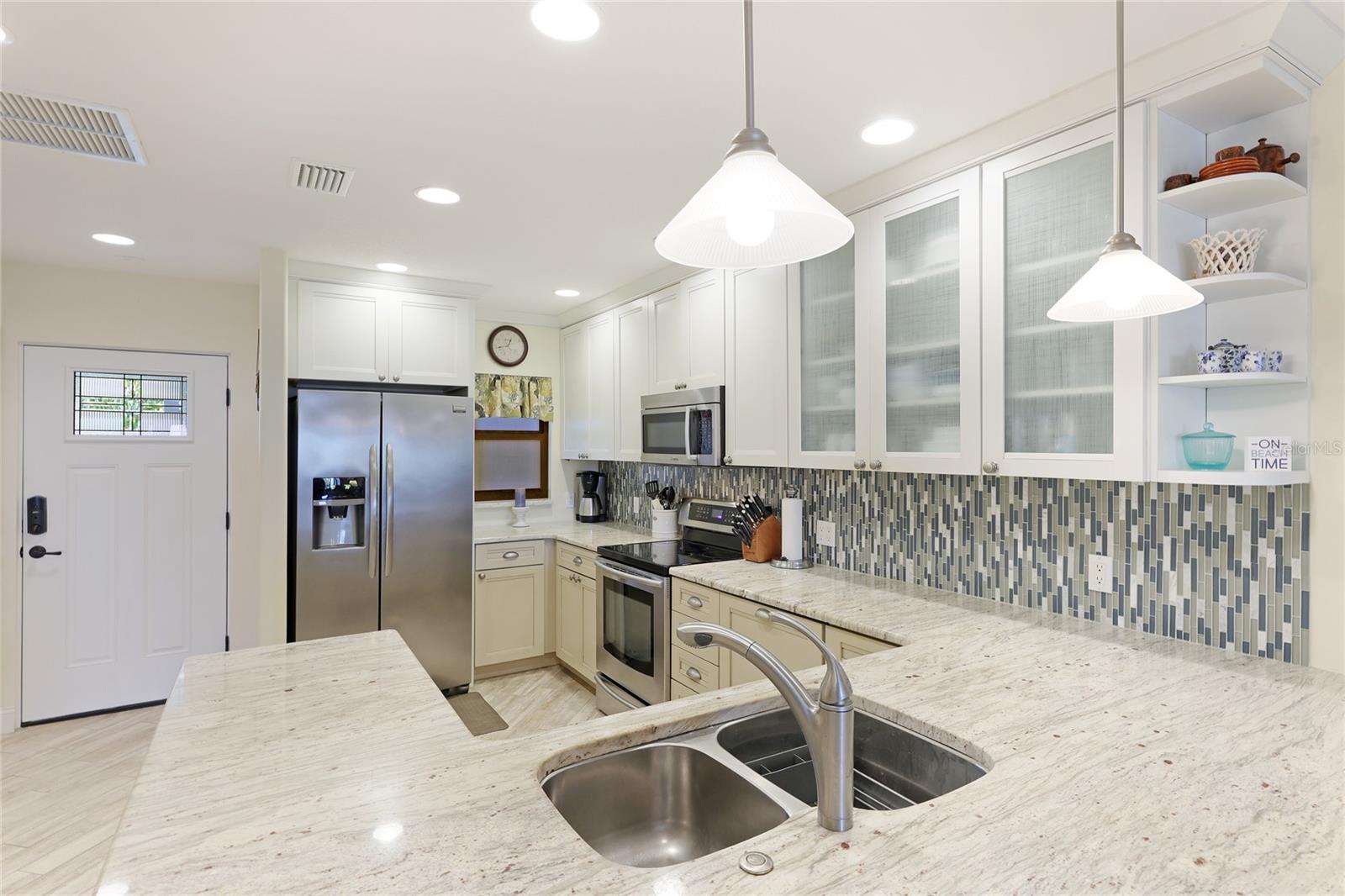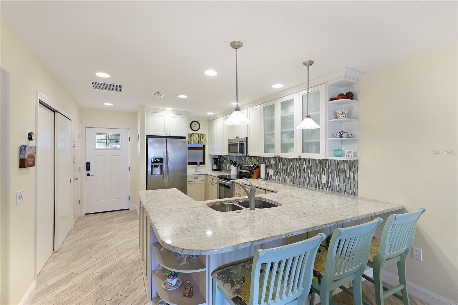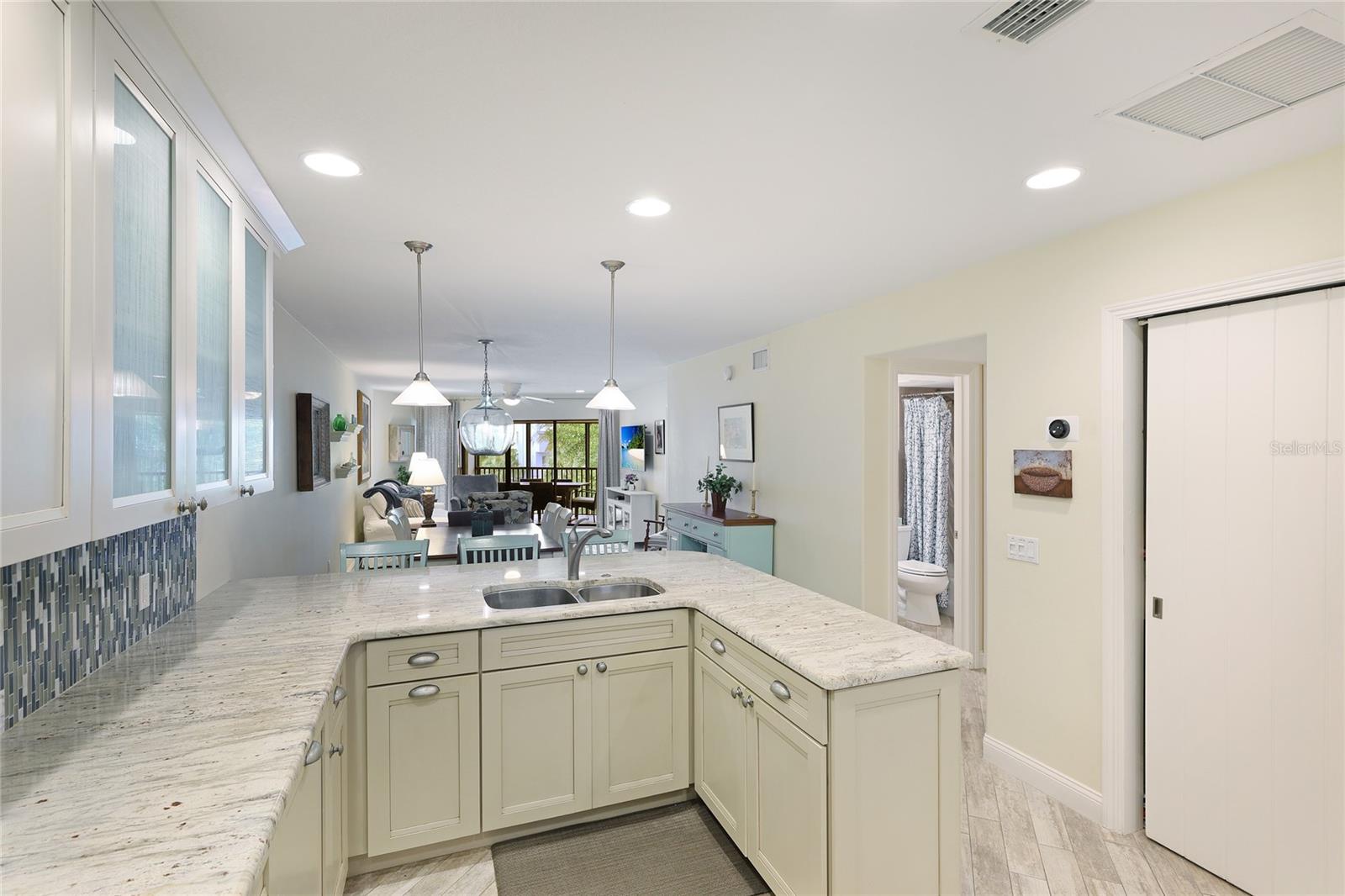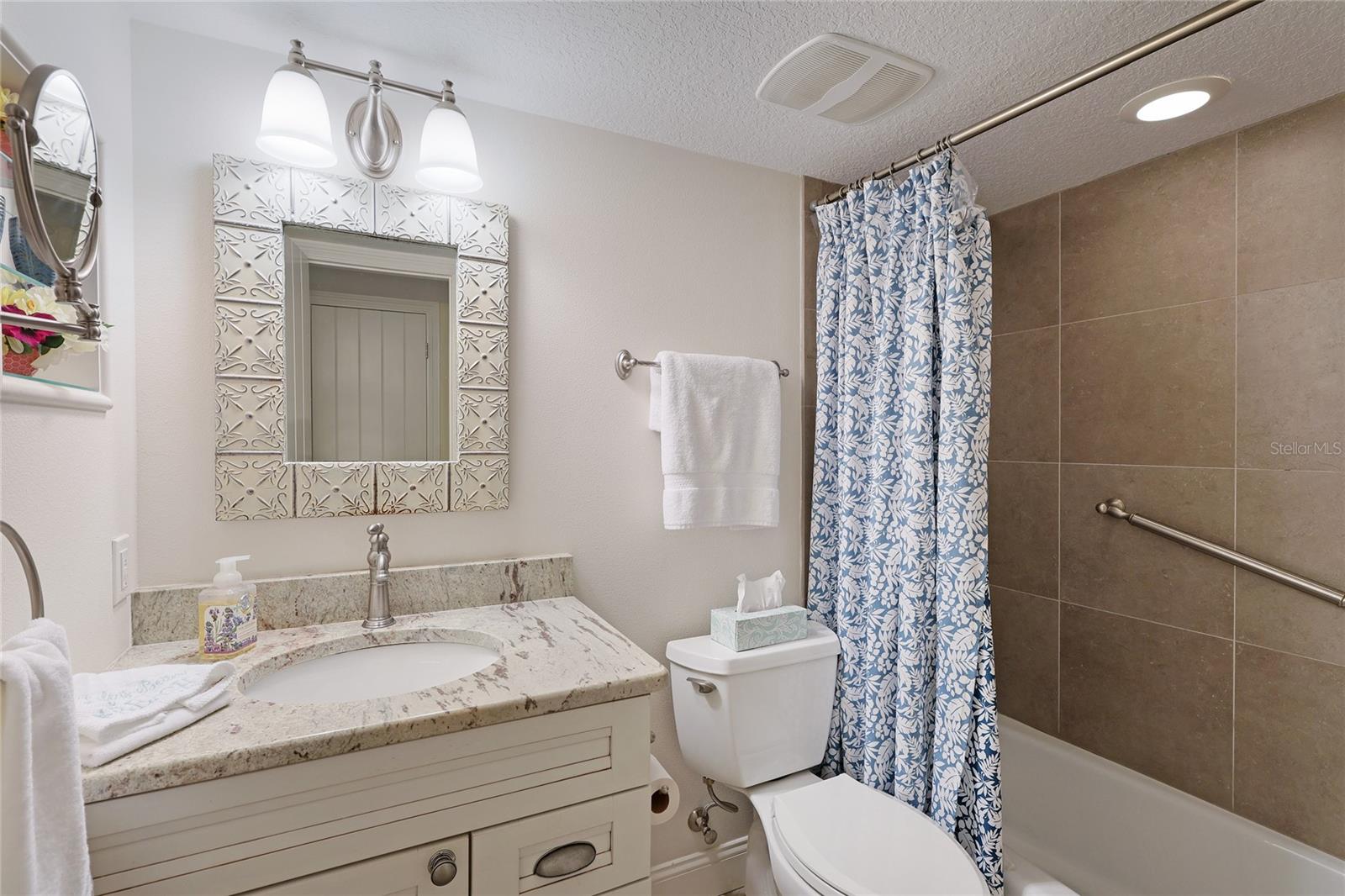 Enjoy Gulf views from the kitchen, dining and living areas as well as the Primary bedroom in this totally updated, fully furnished 2 bedroom condo in desirable Sun Plaza West. The building is constructed of sturdy pre-stressed concrete and concrete block with your reserved parking space conveniently located beneath the building. Take the elevator to the second (top) floor for easy access.There are hurricane shutters on the sliding glass doors off the living room as well as the primary bedroom for additional protection. This stunning condo boasts wood look porcelain tile throughout, a modern kitchen featuring tons of storage in the plentiful wood cabinets, and upgraded quartz countertops. In addition to a lovely dining area, and welcoming living area, there is a breakfast bar that seats three. The sliding glass doors open out to a screened, tiled patio, expanding the already ample entertaining area, and perfect for al fresco dining while watching the sunset on the Gulf. The spacious Primary bedroom offers its own private balcony, a large walk in closet, and a beautifully remodeled en suite bathroom. The welcoming guest bedroom also features a newly remodeled en suite bathroom. This exceptional condo offers more storage than usual as well as an assigned secure storage unit on the lower level. The owner has replaced the AC last year, the water heater two years ago, and the front door in 2020. The seller has a warranty for the kitchen appliances to Oct. 2024. Now the only thing for you to do is come to the beach and relax.