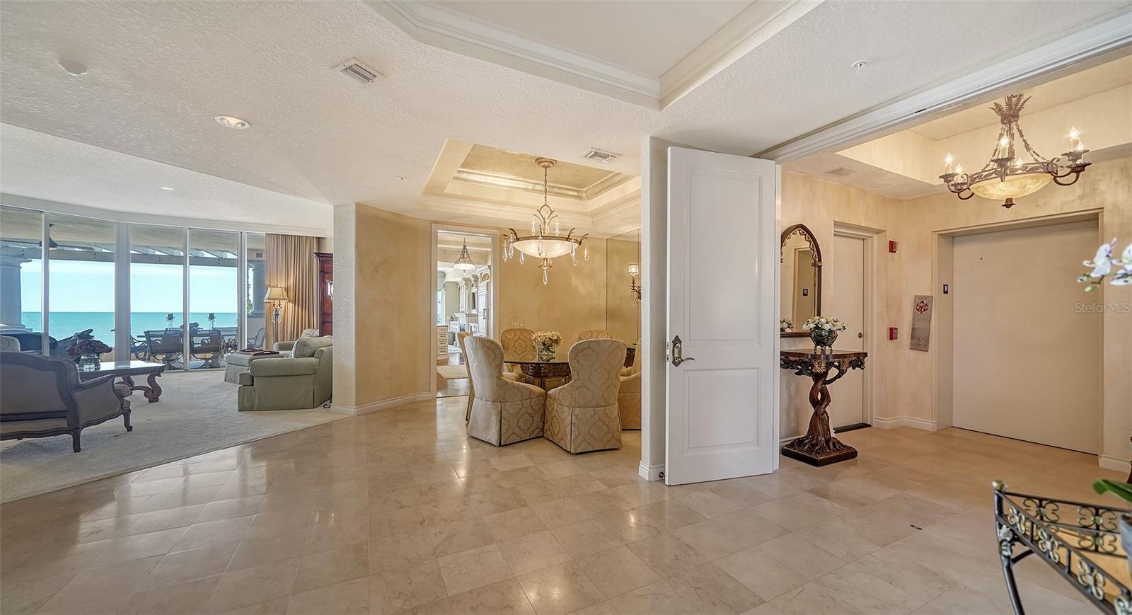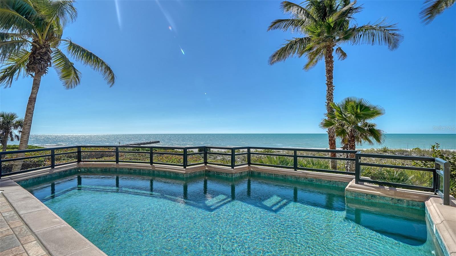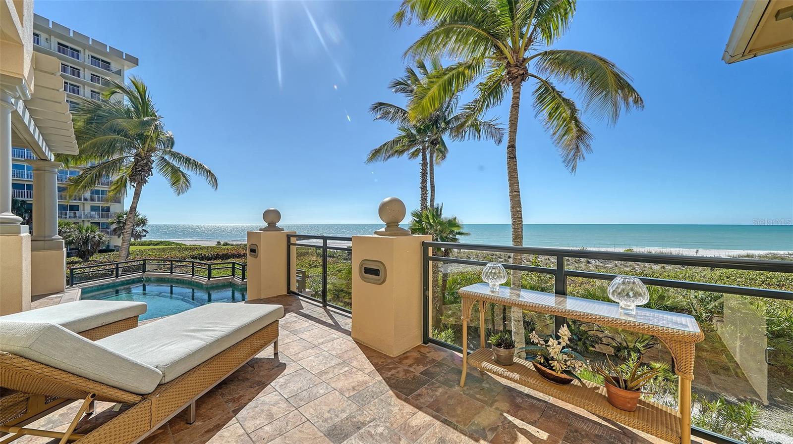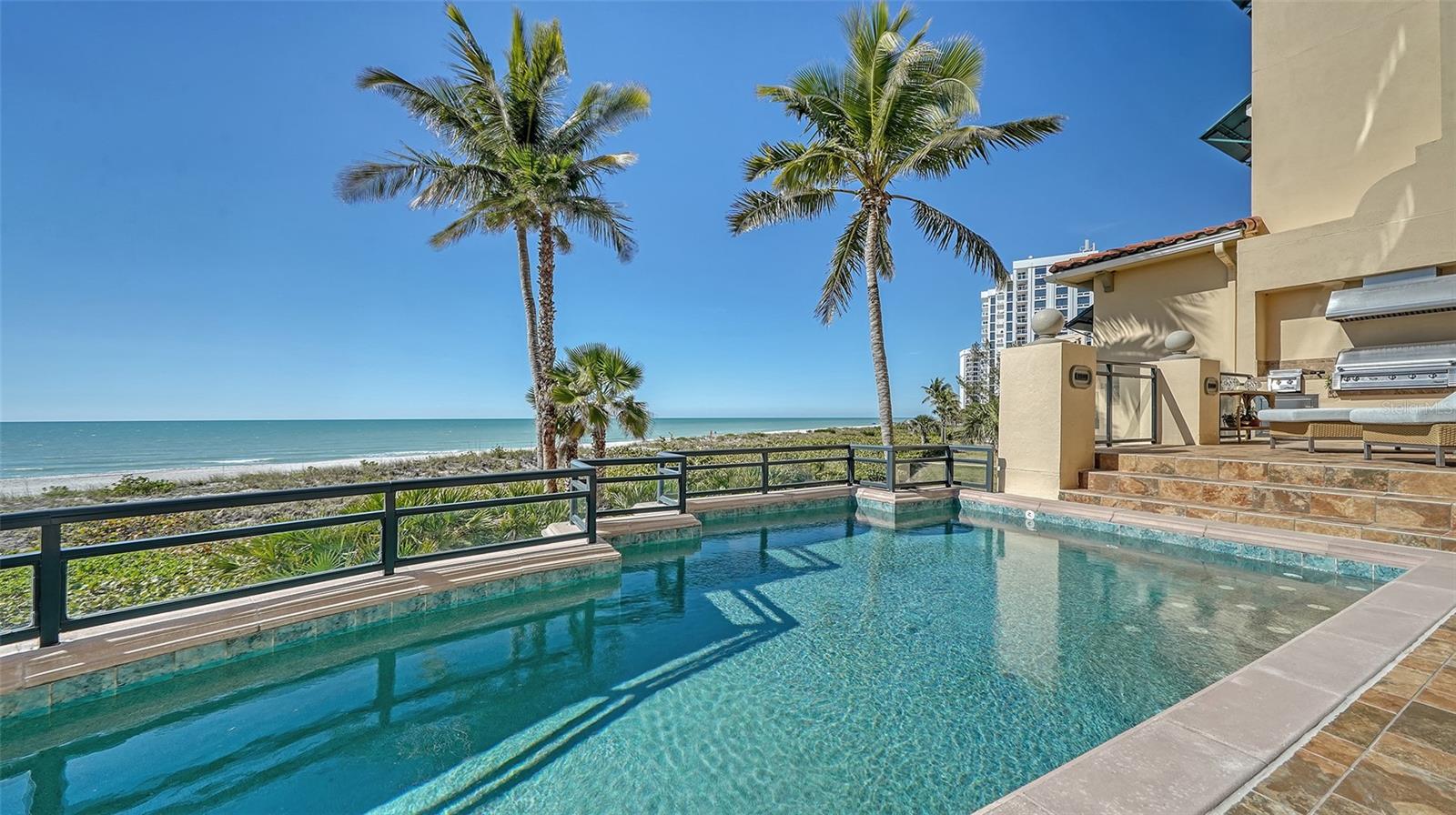 Discover unparalleled luxury living at Vizcaya, where this unique condominium redefines coastal elegance on the Gulf of Mexico. With its own private swimming pool and expansive terrace overlooking the sandy beach, every moment here is infused with tranquility and breathtaking views. Ascend via the private elevator, where you're greeted by a welcoming foyer that sets the tone for luxurious coastal living. Step inside to find a spacious layout. A beautiful custom kitchen sits adjacent to a family room, providing the ideal setting for culinary creations and gatherings with loved ones. Picture yourself cooking while gazing out at the expanse of the Gulf of Mexico, creating memories that will last a lifetime. Additionally, a separate dining room adjacent to the large living room offers an elegant space for formal dinners or intimate gatherings, with stunning views of the terrace and beyond. Whether you're entertaining guests or enjoying quiet evenings at home, every corner of this condominium exudes sophistication and coastal charm. The condominium has two large en-suite bedrooms. The primary bedroom offers a lavish retreat with a large bath, separate walk-in closets and panoramic vistas of the gulf. Meanwhile, the guest bedroom feels like a private sanctuary, complete with its own sitting room and exterior entrance for added convenience. For those who work or simply seek solitude, there's an office that can double as an additional bedroom. Indulge in the resort-style amenities of the Vizcaya community, including a large pool, tennis courts and a clubhouse with a fitness room. Wake up to the sight of dolphins dancing in the waves from your breakfast window or cast a line at the fishing pier just nearby. Notably, only a select few units in Vizcaya boast their private swimming pool, elevating this residence to a league of its own. With its unparalleled features and thoughtful design, this unit seamlessly blends comforts of home with allure of resort living.