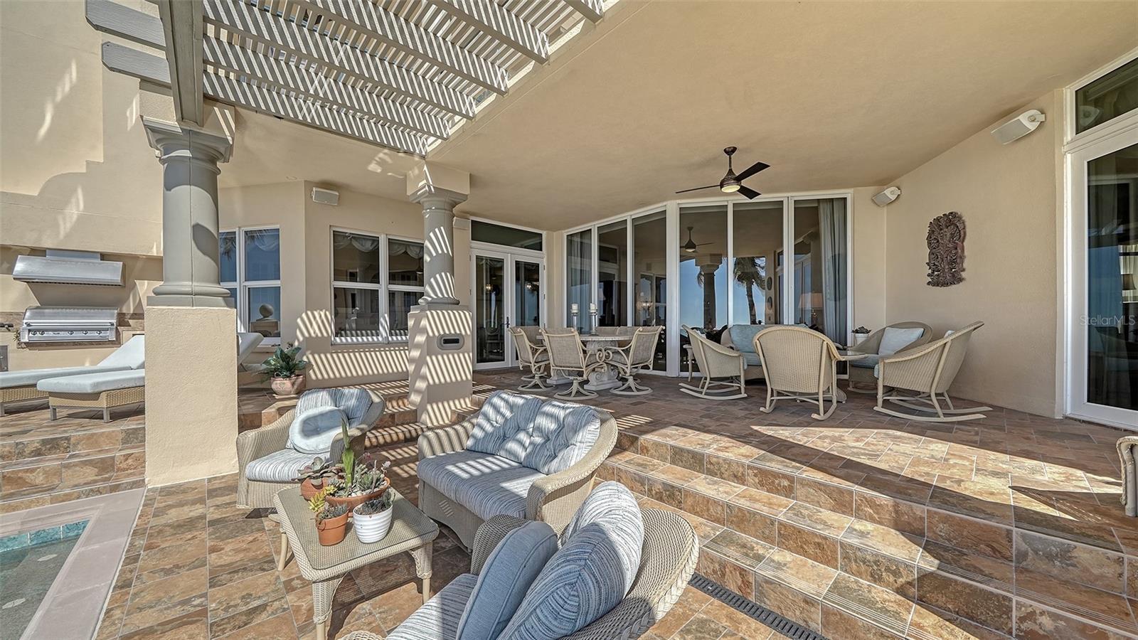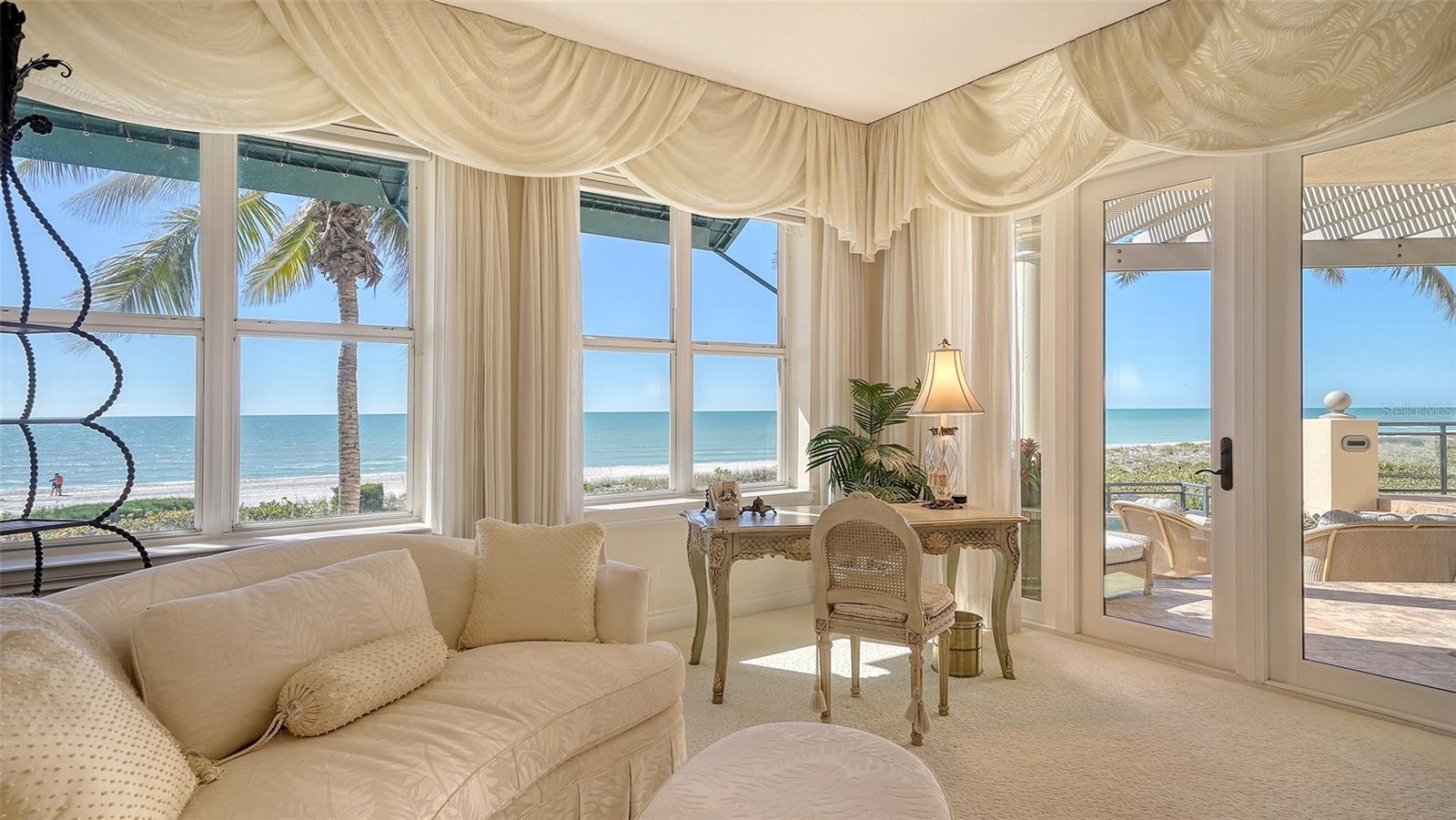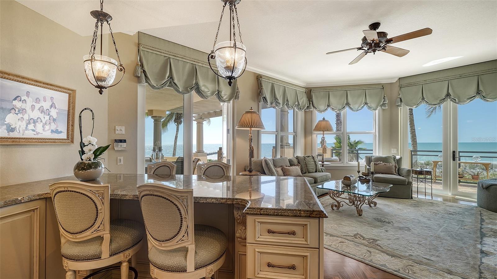 Discover unparalleled luxury living at Vizcaya, where this unique condominium redefines coastal elegance on the Gulf of Mexico. With its own private swimming pool and expansive terrace overlooking the sandy beach, every moment here is infused with tranquility and breathtaking views. Ascend via the private elevator, where you're greeted by a welcoming foyer that sets the tone for luxurious coastal living. Step inside to find a spacious layout. A beautiful custom kitchen sits adjacent to a family room, providing the ideal setting for culinary creations and gatherings with loved ones. Picture yourself cooking while gazing out at the expanse of the Gulf of Mexico, creating memories that will last a lifetime. Additionally, a separate dining room adjacent to the large living room offers an elegant space for formal dinners or intimate gatherings, with stunning views of the terrace and beyond. Whether you're entertaining guests or enjoying quiet evenings at home, every corner of this condominium exudes sophistication and coastal charm. The condominium has two large en-suite bedrooms. The primary bedroom offers a lavish retreat with a large bath, separate walk-in closets and panoramic vistas of the gulf. Meanwhile, the guest bedroom feels like a private sanctuary, complete with its own sitting room and exterior entrance for added convenience. For those who work or simply seek solitude, there's an office that can double as an additional bedroom. Indulge in the resort-style amenities of the Vizcaya community, including a large pool, tennis courts and a clubhouse with a fitness room. Wake up to the sight of dolphins dancing in the waves from your breakfast window or cast a line at the fishing pier just nearby. Notably, only a select few units in Vizcaya boast their private swimming pool, elevating this residence to a league of its own. With its unparalleled features and thoughtful design, this unit seamlessly blends comforts of home with allure of resort living.