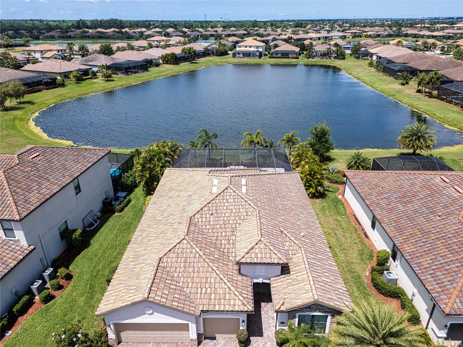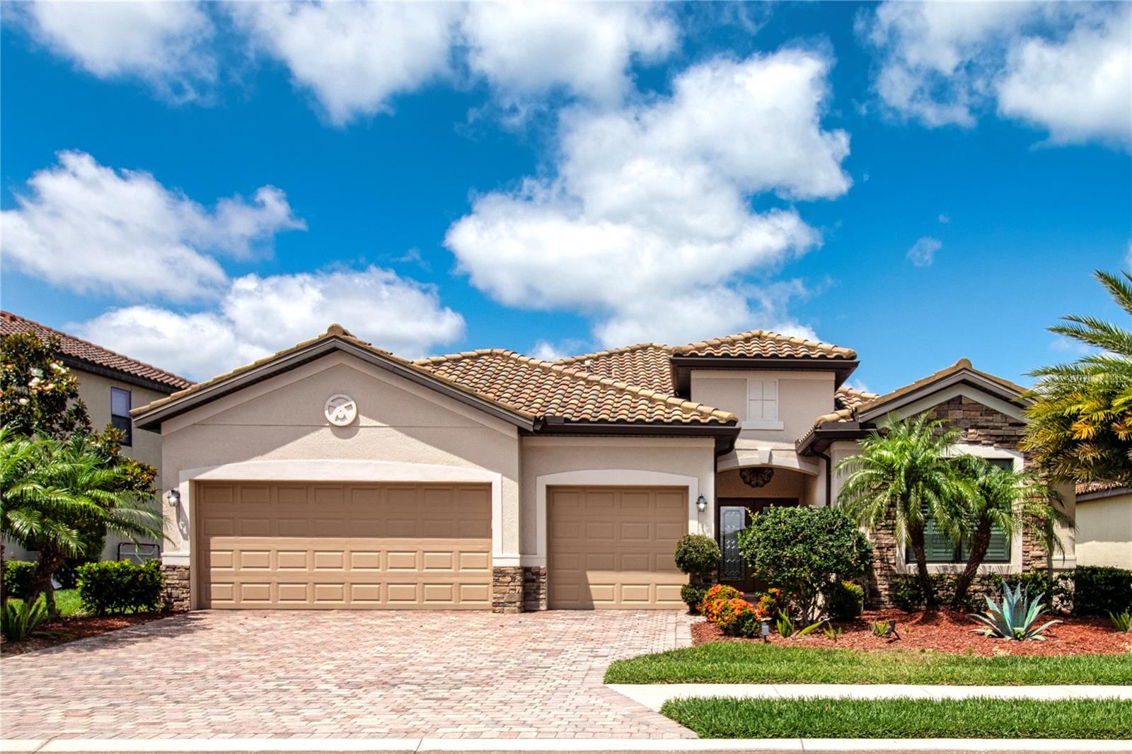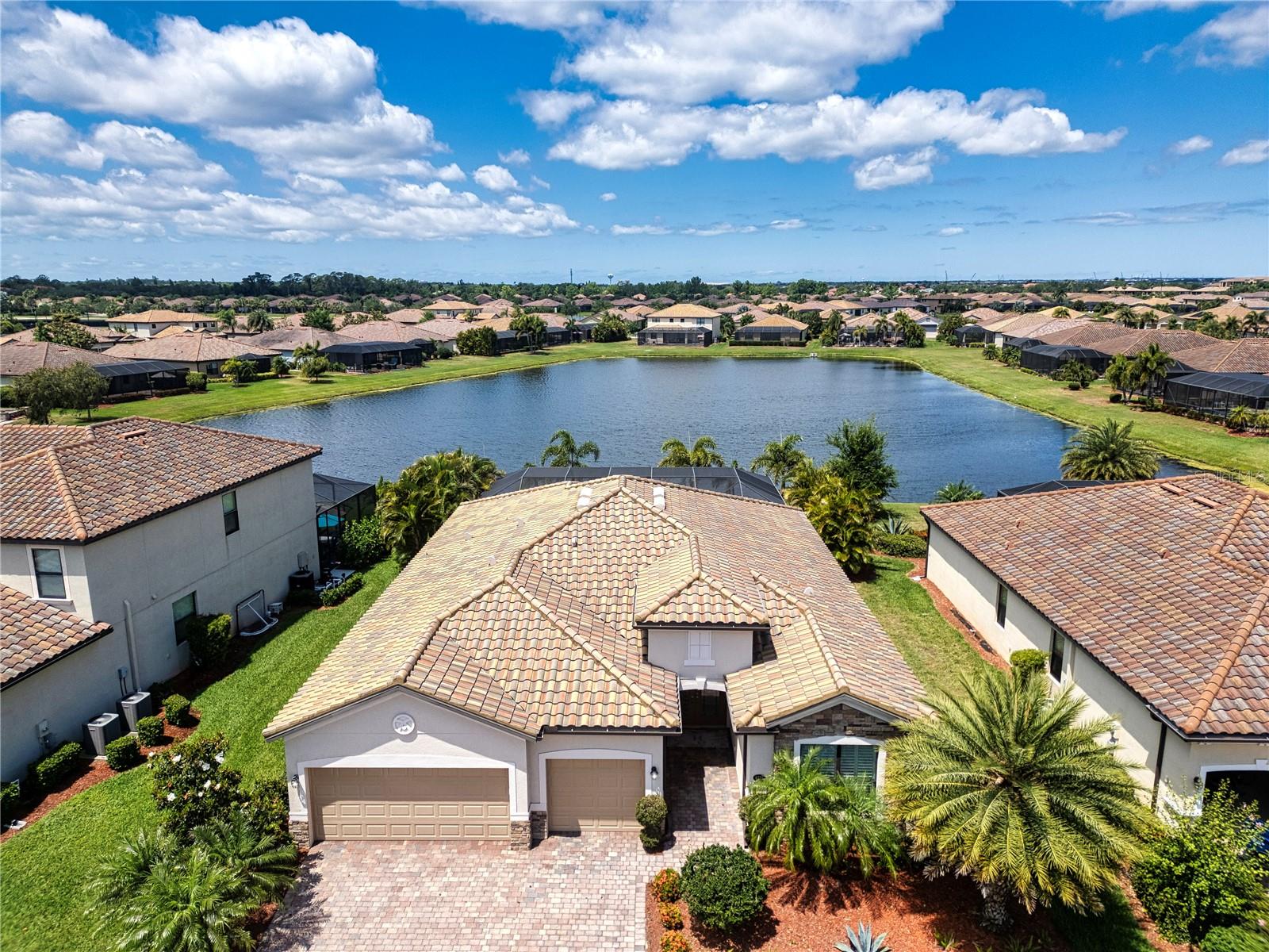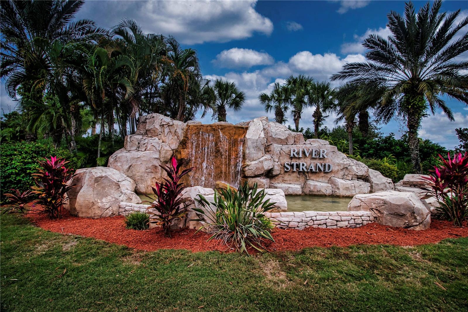 Sought after Summerville II in River Strand Golf and Country Club! You will fall in love with this Stunning 3 BR plus Den home with 3 Car Garage! Incredible full lake view! River Strand Sanctuary has a Social Membership! Crown molding and plantation shutters are throughout the whole house along with many designer features! The open concept floor plan offers plenty of room for entertaining along with a gourmet kitchen, spacious flat counter breakfast bar. Kitchen also boasts a new SS vented hood over stove, 42" wood cabinets, granite counters, tiled backsplash, pendant lights and more! Expansive Great Rm. has a beautiful tray ceiling with crown molding and triple slider overlooking pool and lake. Spacious dining area also has the lake view! Retire to your generous owner's suite with tray ceiling with crown, large walkin closet, luxurious bath with tiled shower and access to lanai! Den has double glass drs and could be used as a 4th BR! 2nd bedroom has ensuite bath for extra comfort and privacy for guests. 3 rd BR has a double dr closet. Relax by your luxurious heated pool overlooking peaceful and serene lake. Plenty of room for entertaining on gorgeous travertine tiled lanai! There are many upgraded features such as barrel tile roof, driveway with pavers and hurricane shutters. Live like you're on vacation all year round with extraordinary clubhouse, fine and casual dining restaurant, poolside tiki bar, heated resort pools and resistance pool as well as spas and many other satellite pools, 9 Har Tru tennis courts and pro shop, pickleball courts, 2 state of the art fitness centers, active clubhouse and activities, billiards and card rooms, dog parks and more! Access to golf usually from April to Sept and Heritage Harbour Golf and Eatery just minutes away also in Heritage Harbour. Close to Anna Maria Island's famous beaches, Siesta Key, downtown Sarasota and Lakewood Ranch, lots of shopping and restaurants, I 75, airports and more! Amazing location! Welcome to Paradise! Note: CDD fees are already shown in taxes.