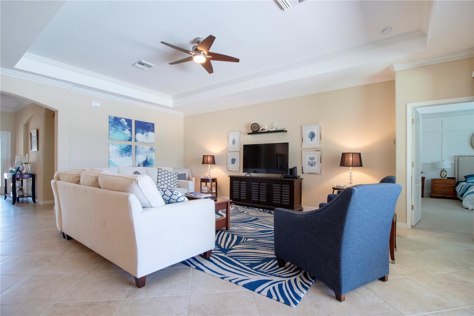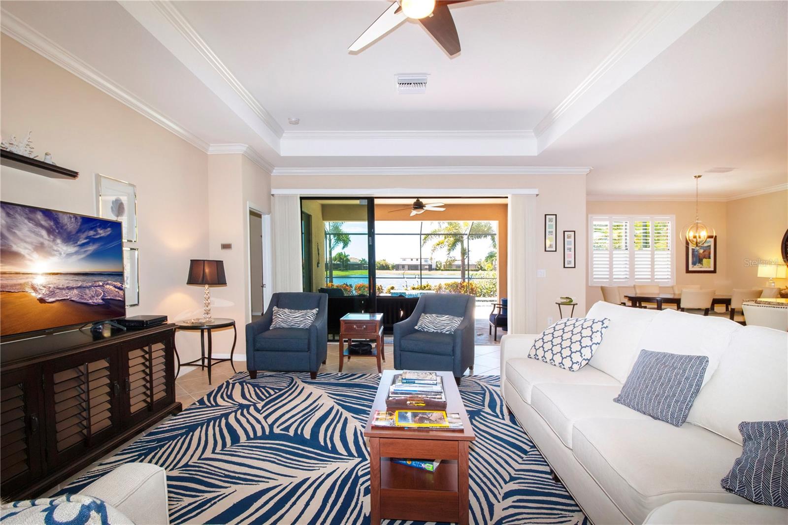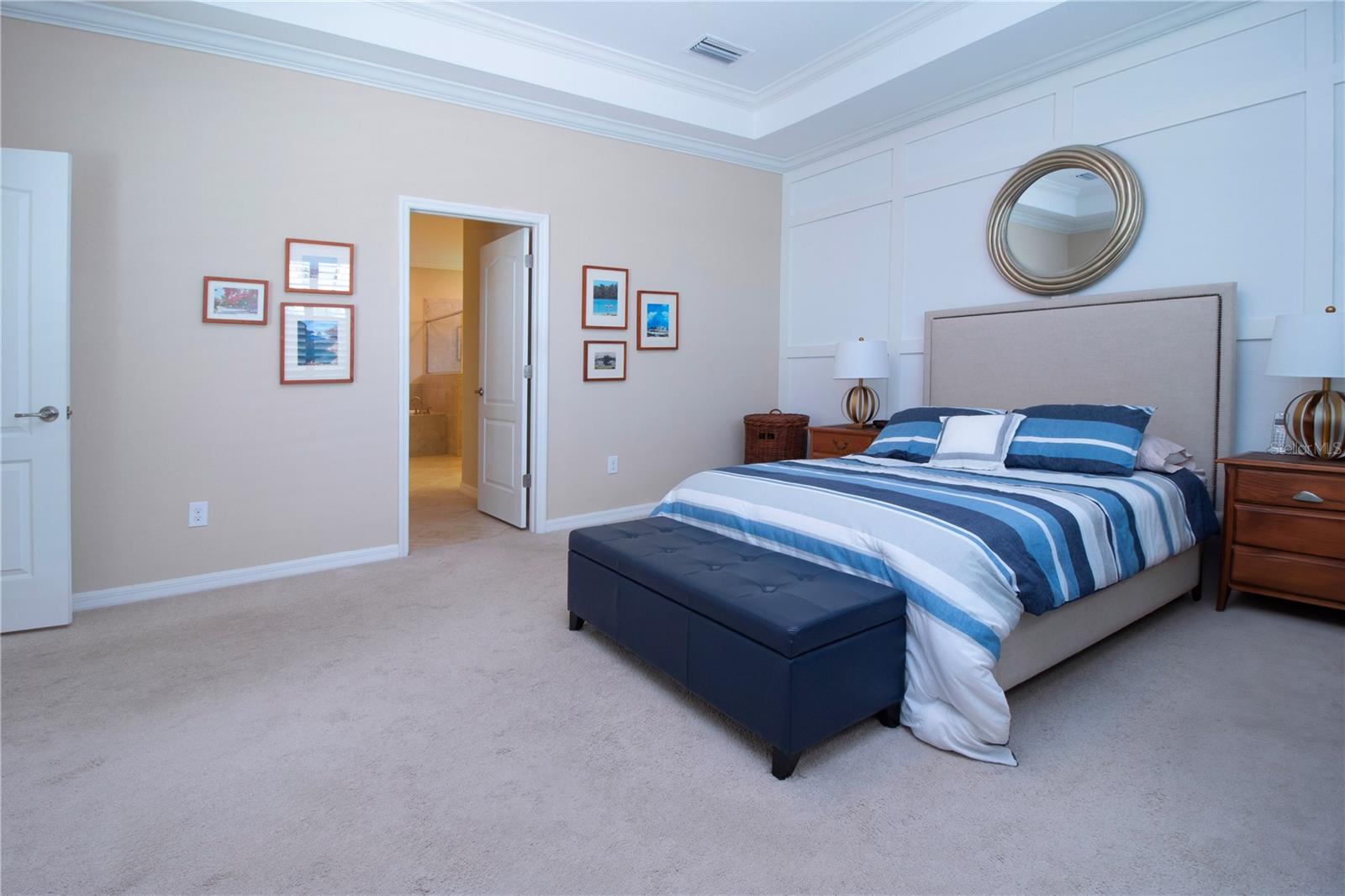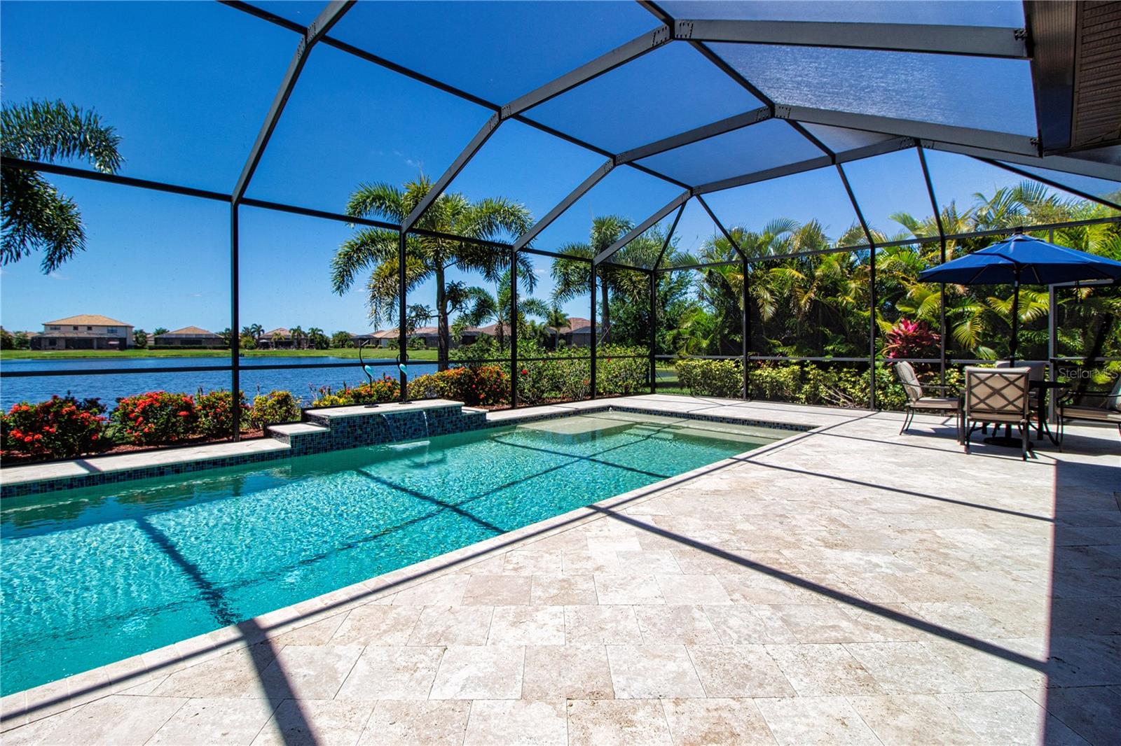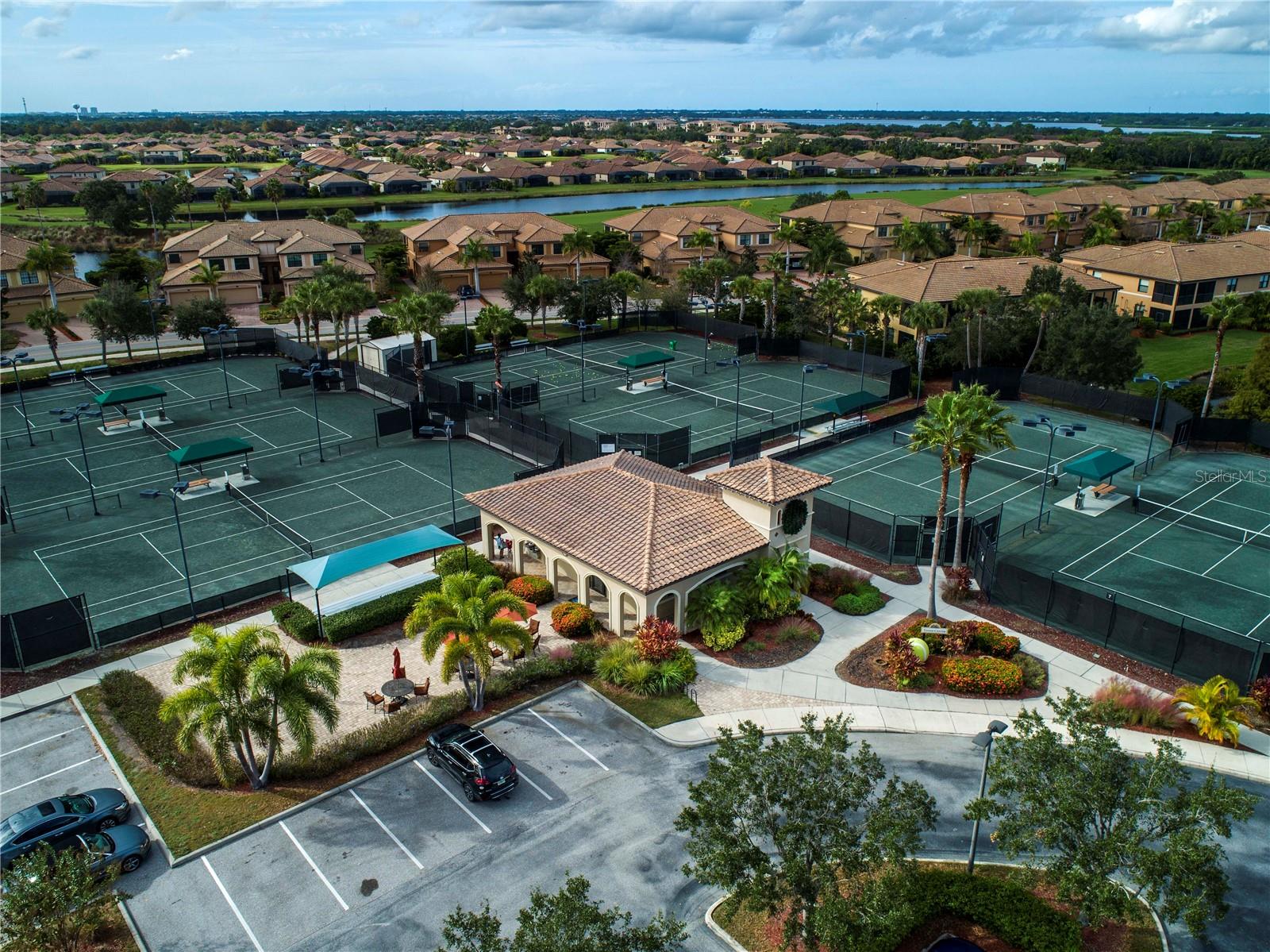 Sought after Summerville II in River Strand Golf and Country Club! You will fall in love with this Stunning 3 BR plus Den home with 3 Car Garage! Incredible full lake view! River Strand Sanctuary has a Social Membership! Crown molding and plantation shutters are throughout the whole house along with many designer features! The open concept floor plan offers plenty of room for entertaining along with a gourmet kitchen, spacious flat counter breakfast bar. Kitchen also boasts a new SS vented hood over stove, 42" wood cabinets, granite counters, tiled backsplash, pendant lights and more! Expansive Great Rm. has a beautiful tray ceiling with crown molding and triple slider overlooking pool and lake. Spacious dining area also has the lake view! Retire to your generous owner's suite with tray ceiling with crown, large walkin closet, luxurious bath with tiled shower and access to lanai! Den has double glass drs and could be used as a 4th BR! 2nd bedroom has ensuite bath for extra comfort and privacy for guests. 3 rd BR has a double dr closet. Relax by your luxurious heated pool overlooking peaceful and serene lake. Plenty of room for entertaining on gorgeous travertine tiled lanai! There are many upgraded features such as barrel tile roof, driveway with pavers and hurricane shutters. Live like you're on vacation all year round with extraordinary clubhouse, fine and casual dining restaurant, poolside tiki bar, heated resort pools and resistance pool as well as spas and many other satellite pools, 9 Har Tru tennis courts and pro shop, pickleball courts, 2 state of the art fitness centers, active clubhouse and activities, billiards and card rooms, dog parks and more! Access to golf usually from April to Sept and Heritage Harbour Golf and Eatery just minutes away also in Heritage Harbour. Close to Anna Maria Island's famous beaches, Siesta Key, downtown Sarasota and Lakewood Ranch, lots of shopping and restaurants, I 75, airports and more! Amazing location! Welcome to Paradise! Note: CDD fees are already shown in taxes.