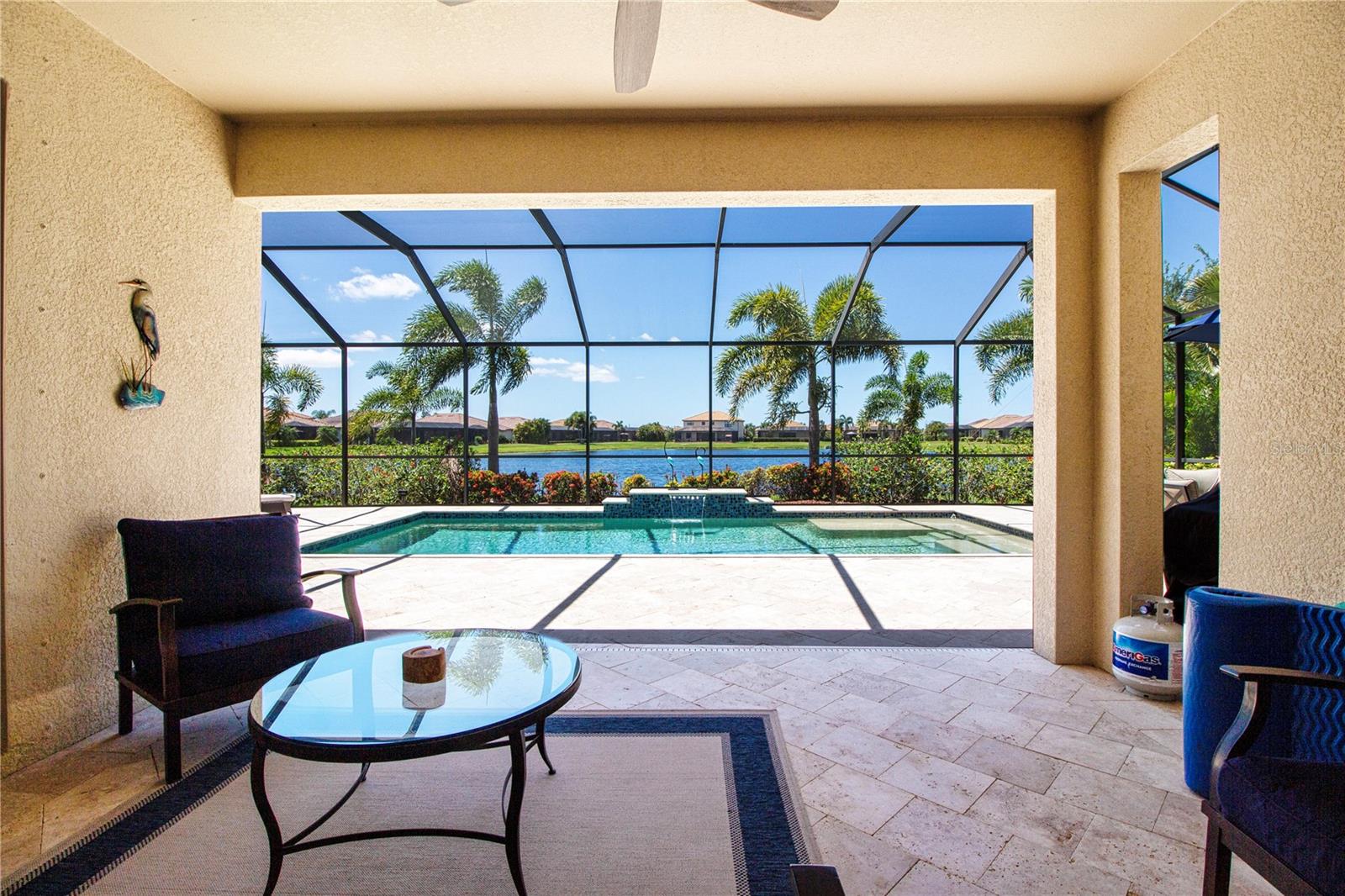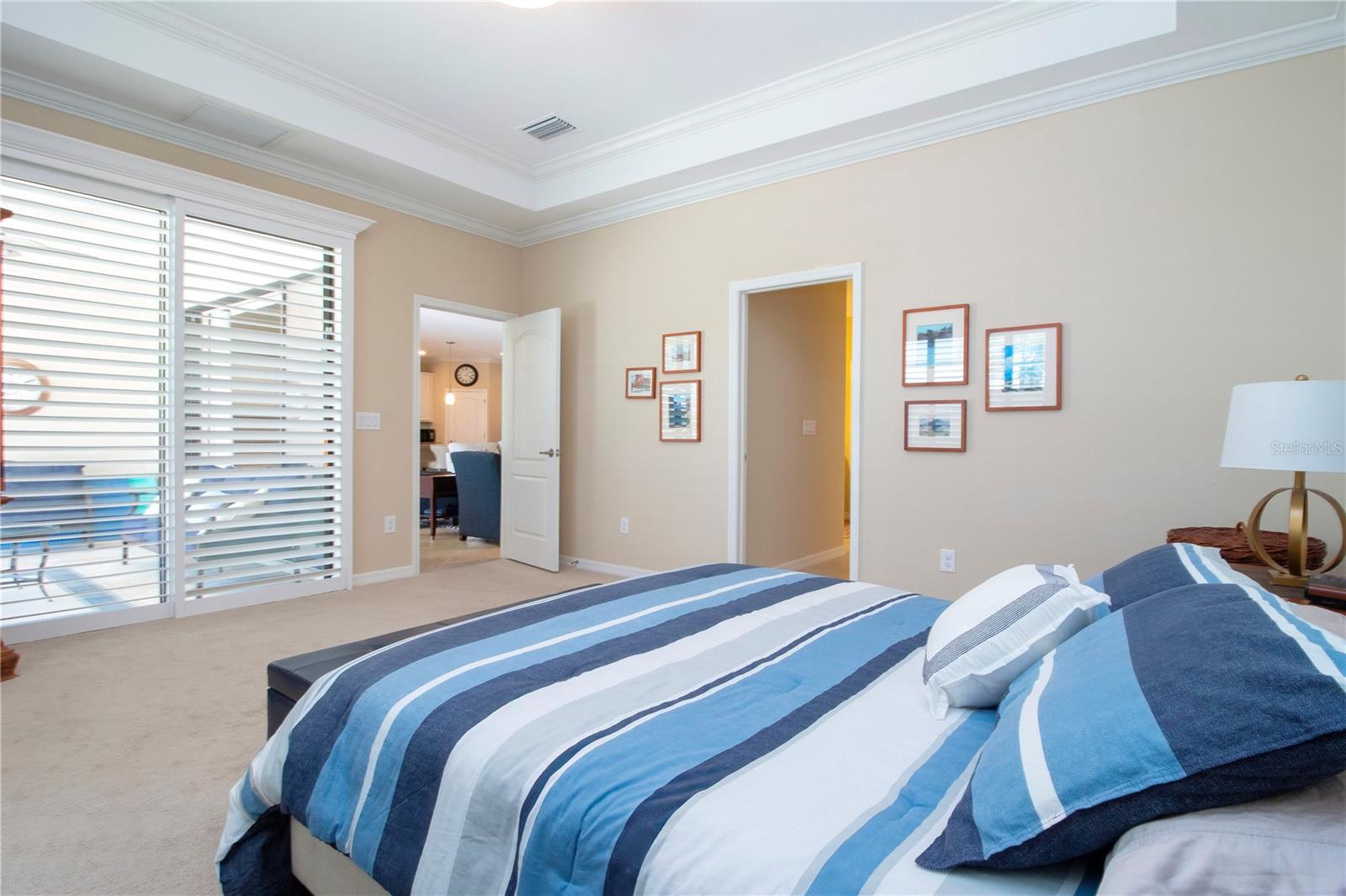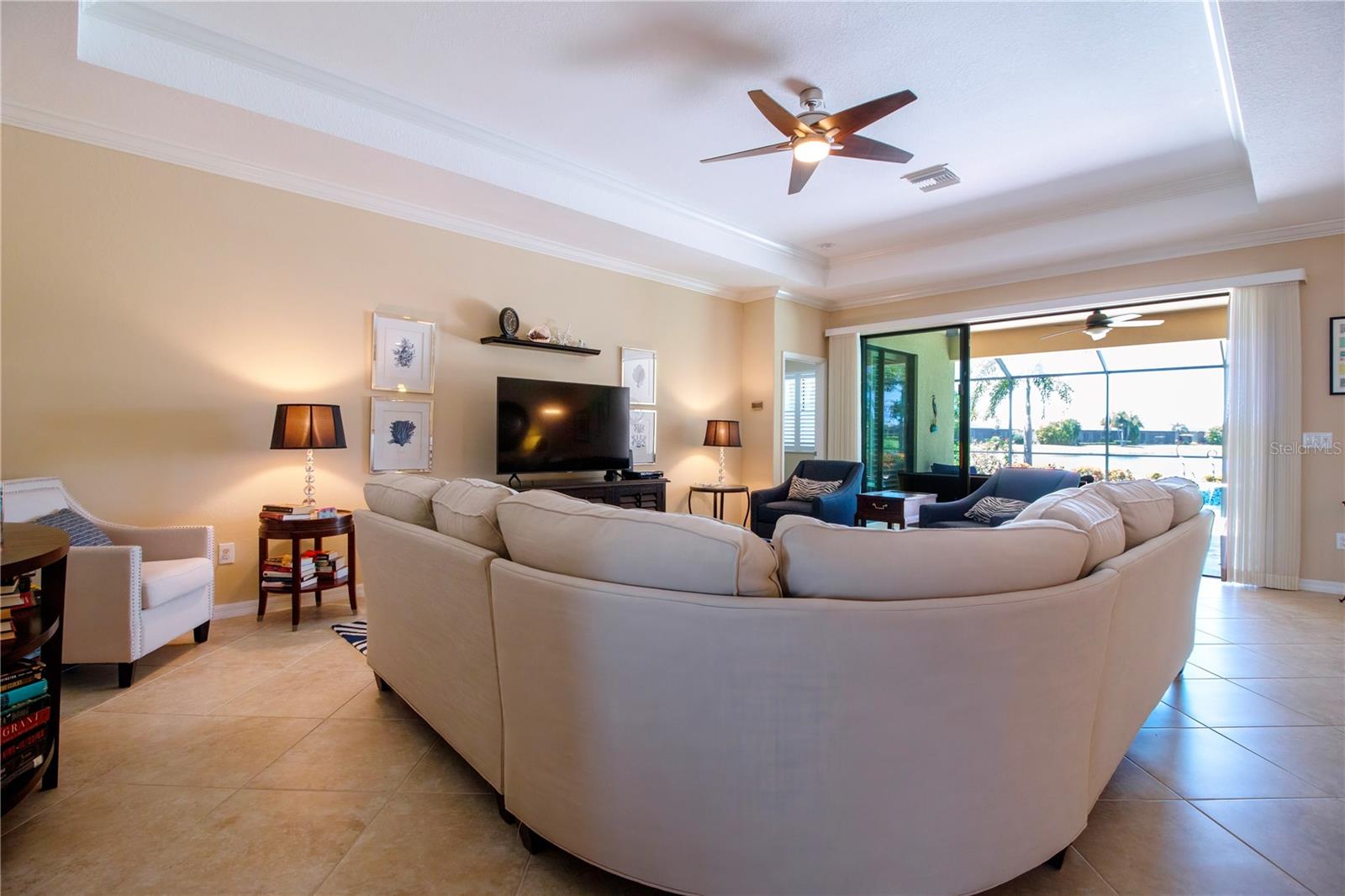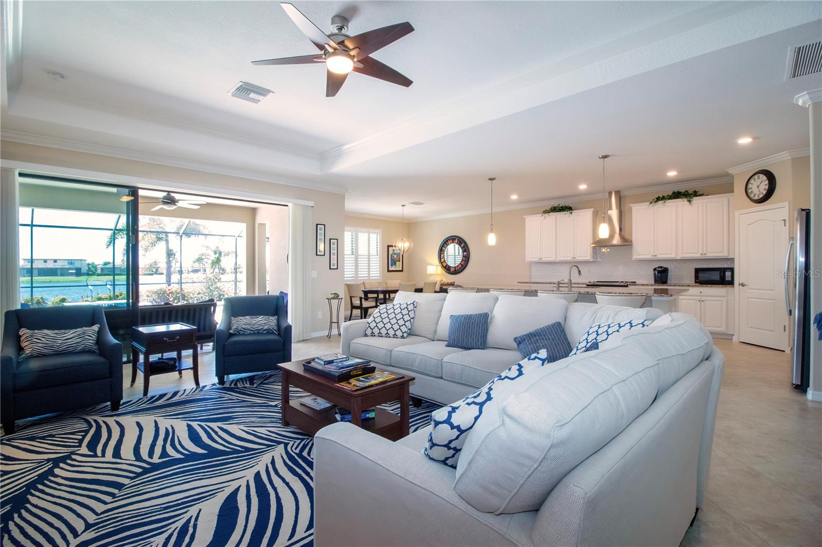 Sought after Summerville II in River Strand Golf and Country Club! You will fall in love with this Stunning 3 BR plus Den home with 3 Car Garage! Incredible full lake view! River Strand Sanctuary has a Social Membership! Crown molding and plantation shutters are throughout the whole house along with many designer features! The open concept floor plan offers plenty of room for entertaining along with a gourmet kitchen, spacious flat counter breakfast bar. Kitchen also boasts a new SS vented hood over stove, 42" wood cabinets, granite counters, tiled backsplash, pendant lights and more! Expansive Great Rm. has a beautiful tray ceiling with crown molding and triple slider overlooking pool and lake. Spacious dining area also has the lake view! Retire to your generous owner's suite with tray ceiling with crown, large walkin closet, luxurious bath with tiled shower and access to lanai! Den has double glass drs and could be used as a 4th BR! 2nd bedroom has ensuite bath for extra comfort and privacy for guests. 3 rd BR has a double dr closet. Relax by your luxurious heated pool overlooking peaceful and serene lake. Plenty of room for entertaining on gorgeous travertine tiled lanai! There are many upgraded features such as barrel tile roof, driveway with pavers and hurricane shutters. Live like you're on vacation all year round with extraordinary clubhouse, fine and casual dining restaurant, poolside tiki bar, heated resort pools and resistance pool as well as spas and many other satellite pools, 9 Har Tru tennis courts and pro shop, pickleball courts, 2 state of the art fitness centers, active clubhouse and activities, billiards and card rooms, dog parks and more! Access to golf usually from April to Sept and Heritage Harbour Golf and Eatery just minutes away also in Heritage Harbour. Close to Anna Maria Island's famous beaches, Siesta Key, downtown Sarasota and Lakewood Ranch, lots of shopping and restaurants, I 75, airports and more! Amazing location! Welcome to Paradise! Note: CDD fees are already shown in taxes.