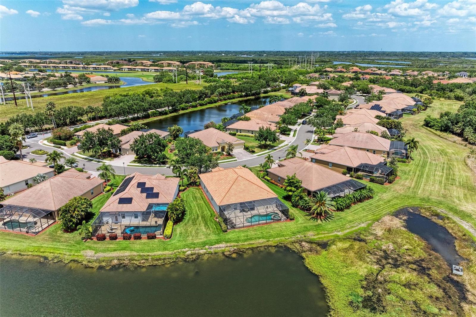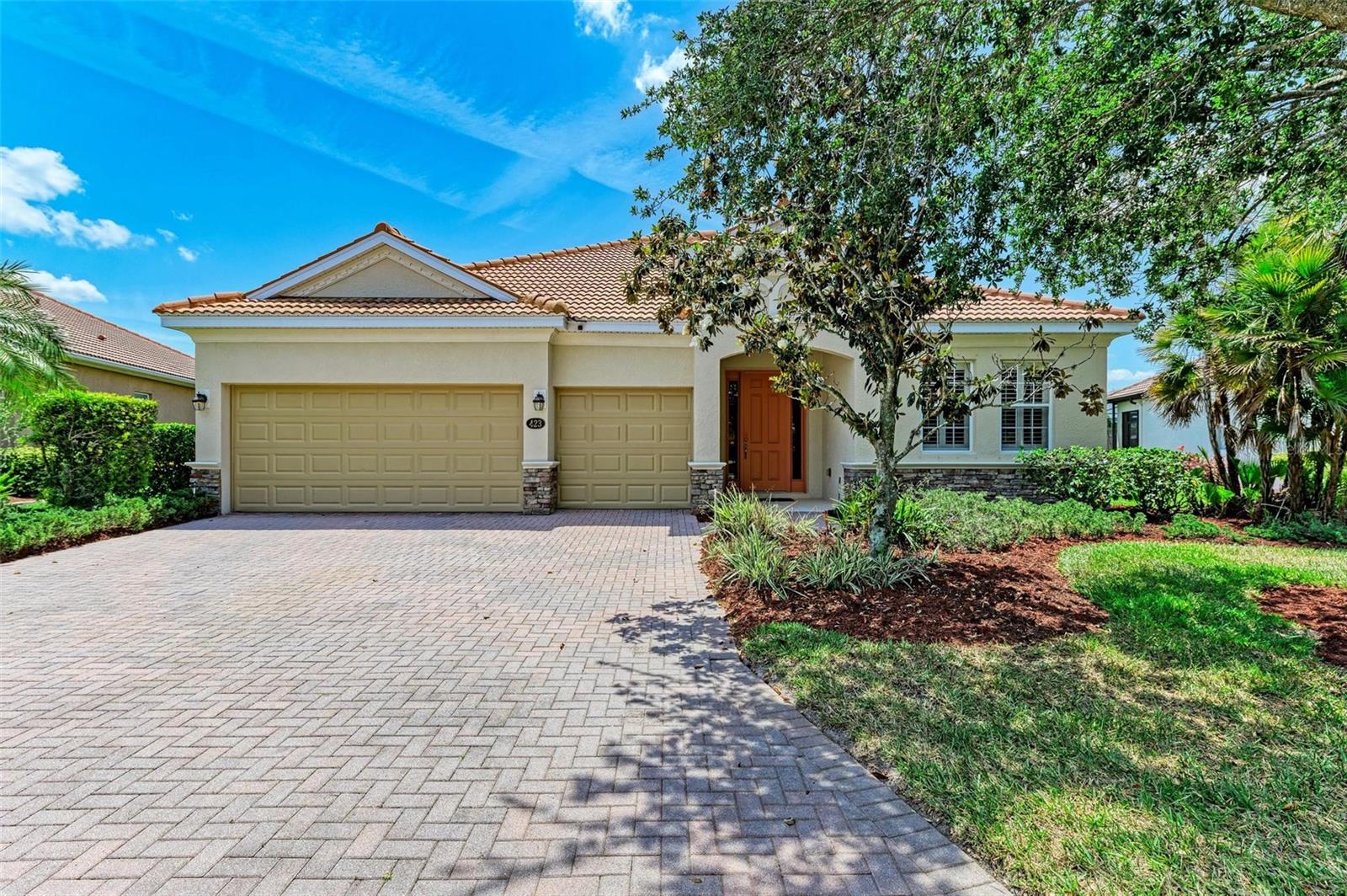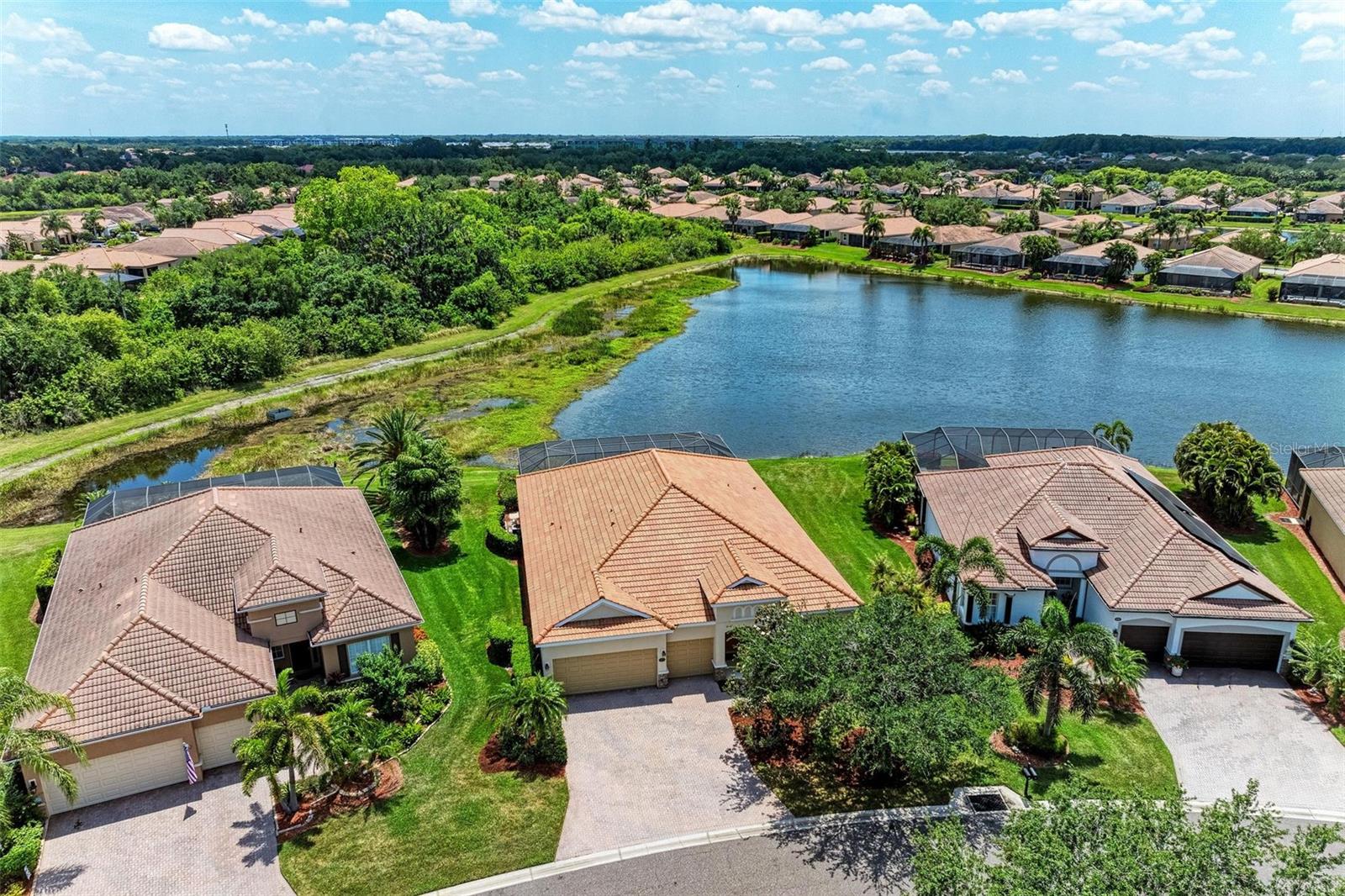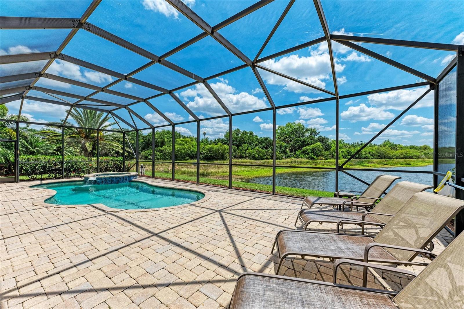 Massive price drop. Add this to your viewing shortlist before it's gone! Located on a small cul-de-sac, this home sits on a pie shaped lot affording rear privacy as well as offering wonderful southeastern views of the lake and preserve. This property comes with full golf and country club membership. The home has four good sized bedrooms plus a den/office/possible 5th, three full bathrooms, three car garage and heated pool/spa. Upon entering, the sensation of spaciousness is obvious. To the right of the entrance sits the den. Immediately in front, the living area features a pool table that is included in the sale of the home. Adjacent, and conveniently located is the formal dining area. The family room beyond feels more like a great room with its good size and openness to the kitchen. The master bedroom has sliding doors to the pool area and accesses the master bathroom suite which includes dual vanities, walk in shower, bathtub and private WC. The master closet has an additional lockable closet within, ideal for an owner wanting a secure place to use as an 'owners' closet' if interested in renting. The pool area has a paver deck, and the pool/spa can be heated via a heat pump. The rear view is wonderful, a mixture of lake, preserve and a littoral pond shelf that attracts lots of interesting wildlife. River Strand golf & Country Club offers 27 Arthur Hills designed golf (the course was recently renovated), 9 Har-Tru tennis courts, 8 pickleball courts, Gym, restaurant, community pools with tiki bar and much, much more. Resort living at its finest. Located close to I-75 means easy access to great shopping/dining at the UTC and a straight shot on SR-64 to the world-famous beaches of Anna Maria Island.