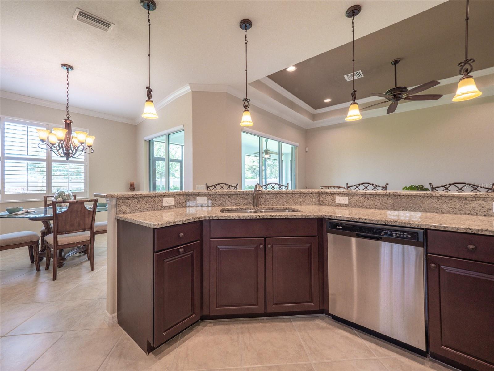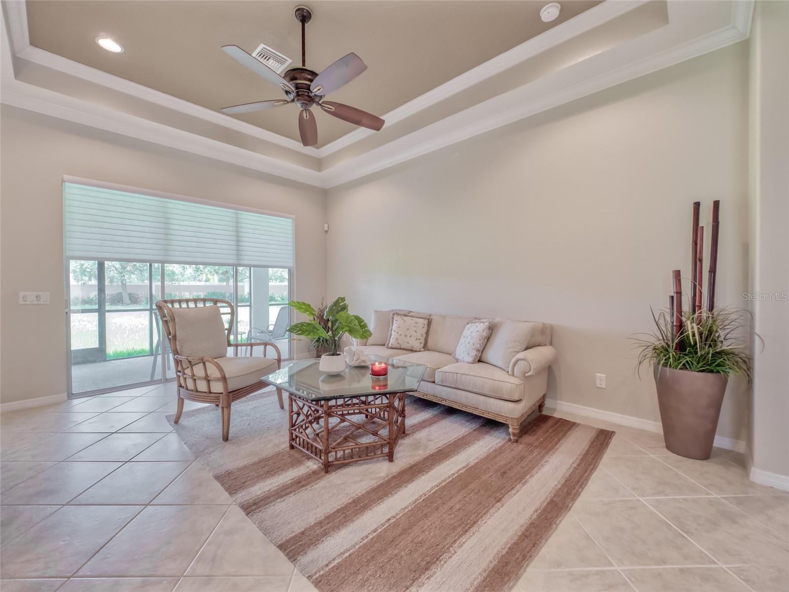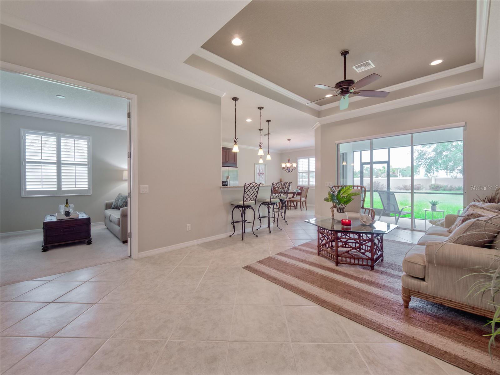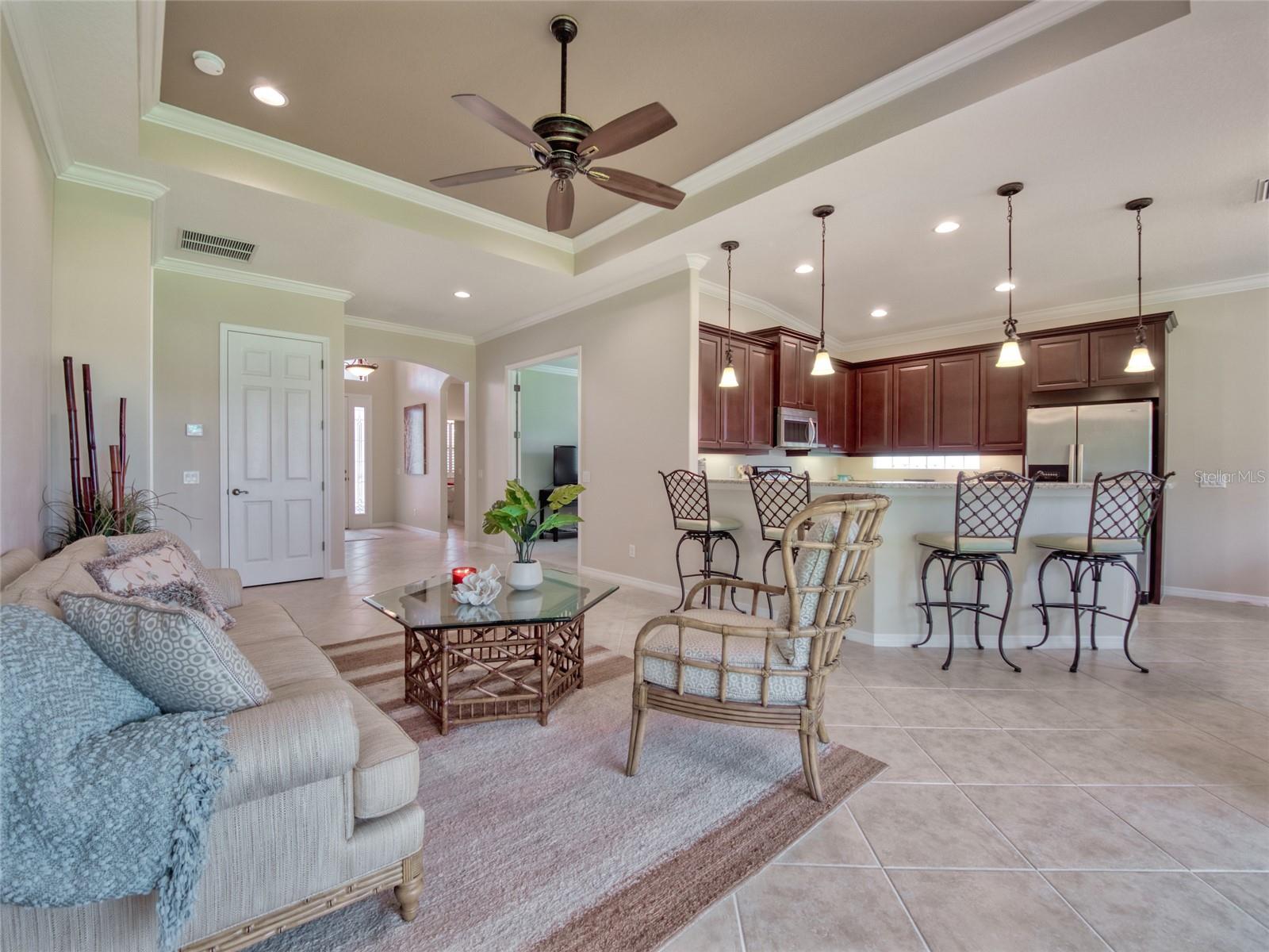 Paradise Found! Enjoy a DYNAMIC FLORIDA LIFESTYLE in your Classic & Charming Home, within an Active Community, in a Prime Location! This pristine home has been lightly lived-in & fastidiously maintained by original owners. New A/C system 2023, Newly painted Home Exterior & new Backflow System in 2022. Enjoy the light-filled living space w/ 11' HIGH CEILINGS, 8' DOORS, CROWN MOLDING, MOTORIZED LANAI SHADES & tasteful PLANTATION SHUTTERS. Open Concept Floor Plan - the large, CHEF's KITCHEN is open to the FAMILY ROOM & DINING ROOM. Upgraded Kitchen features Granite Counters, Stainless Steel Appliances, Wood Cabinets, Under-Cabinet Lights - offering abundant Counter space for cooking & Cabinet space for storage. Enter the impressive & private Master Suite through Double Doors. On the left, the spacious MASTER BEDROOM offers a TRANQUIL RETREAT. On the right, the EN_SUITE MASTER BATHROOM features a walk-in Shower, Double Sinks w/ Granite Countertops & a large Walk-In Closet. A 2nd BEDROOM on the opposite side of the home provides a separate space for family or guests. The adjacent 2nd BATHROOM offers a Tub/Shower as well as Granite countertops. A central DEN w/ Double Door privacy can be used as an Office, Guest Space or TV area. The SCREENED LANAI w/ a Ceiling Fan is accessed via Sliding Doors in the Dining Room or Family Room. The Lanai presents a perfect area for outdoor dining, morning coffee or simply relaxing. Enjoy convenience in the LAUNDRY ROOM, with a Laundry Sink & Storage Cabinets. The Stylish Home Furniture can be available via a separate agreement. Hurricane Shutters. Curb appeal! The attractive PAVER DRIVEWAY leads to a 2-Car GARAGE. Cascades offers 55+, resort-style living in a gated, maintenance free & lushly landscaped environment. This vibrant community features a luxurious 25,000sf CLUBHOUSE w/ rooms for every activity - Events Room (with stage), Billiards Room, Library, Art Room, Conference Room, Game Room & Card Room. Behind the Clubhouse is a separate Fitness Center w/ equipment, instructor & exercise classes. Enjoy a unique Indoor/Outdoor heated resort-style Pool & Spa, as well as 6 lighted Har-Tru Tennis Courts, a Tennis Pro Shop w/ a Tennis Pro on Staff, 2 Pickle Ball Courts & 3 Bocce Courts. Stay active with a monthly calendar filled with clubs, groups & social gatherings. Low HOA Fees cover Lawn Maintenance, Irrigation, Cable TV & Internet, Security Gates & all Amenities. No CDD Fees. Cascades is centrally located just 3 miles from SRQ Airport, a short drive to the UTC Mall, Downtown Sarasota, St. Armand's Circle & Award-winning Beaches. Minutes to Lakewood Ranch Main Street, Waterside Place & Sarasota Polo Club. This perfect home in Paradise is MOVE-IN READY. Visit today!