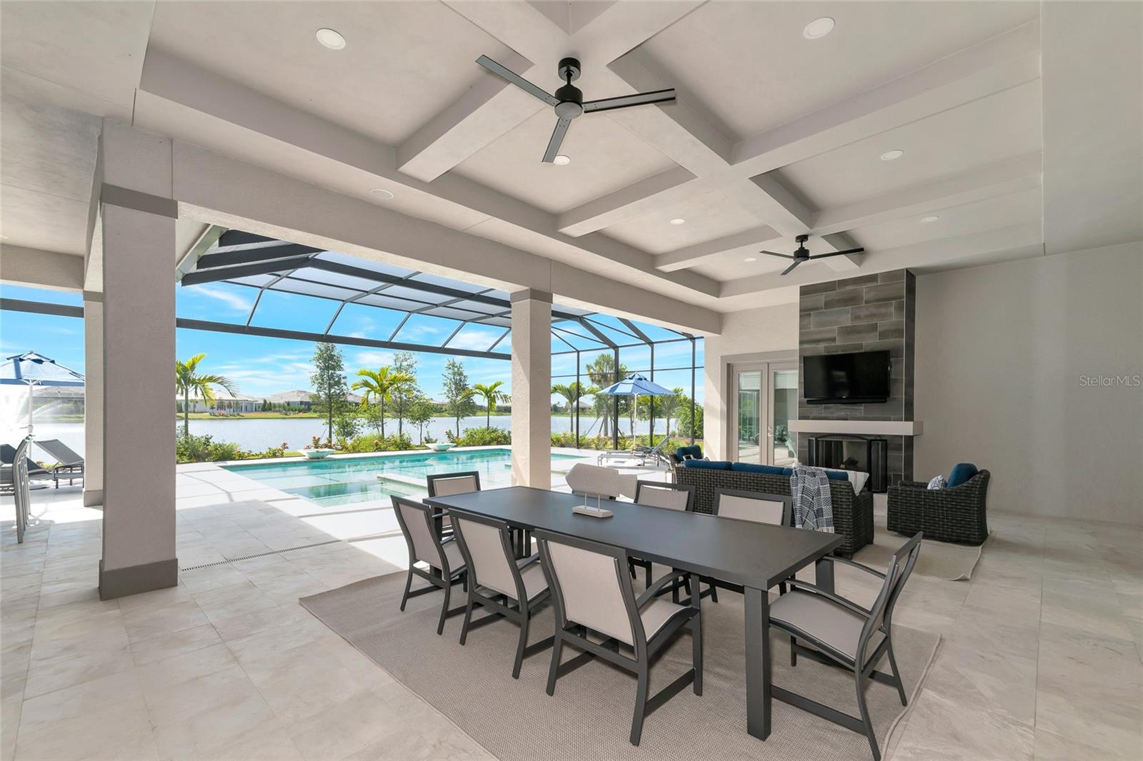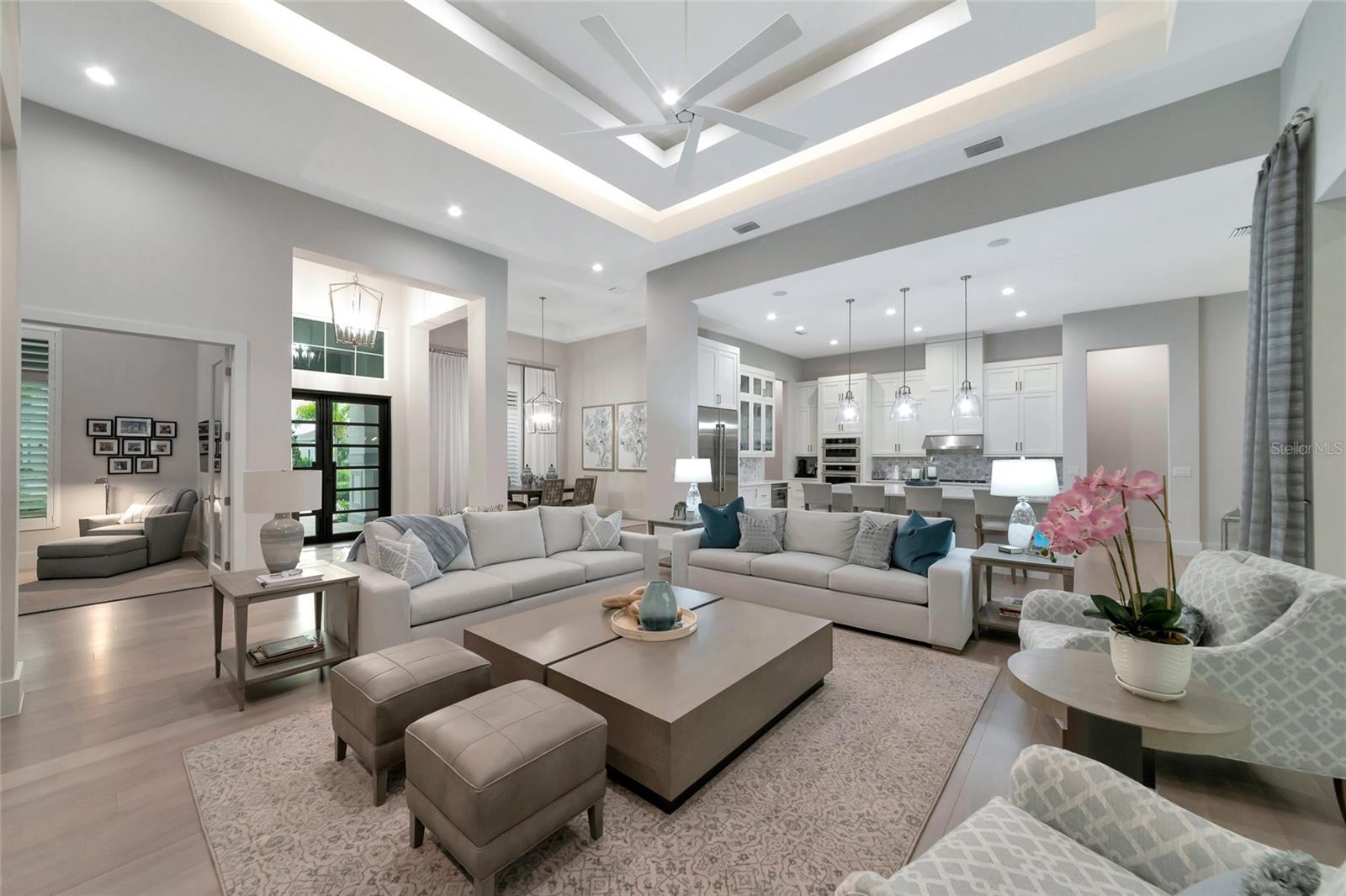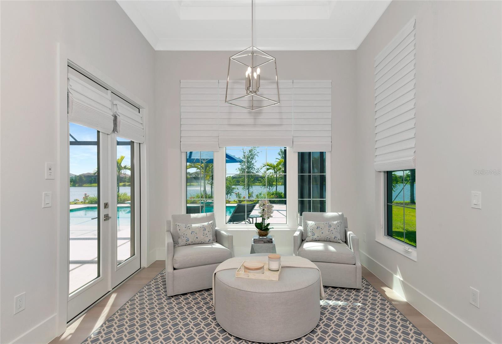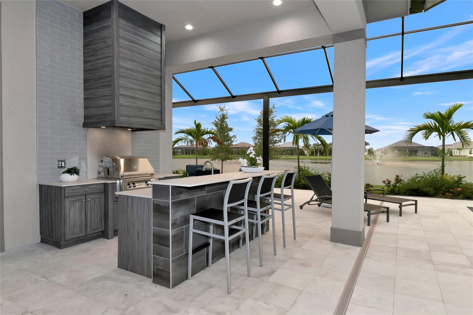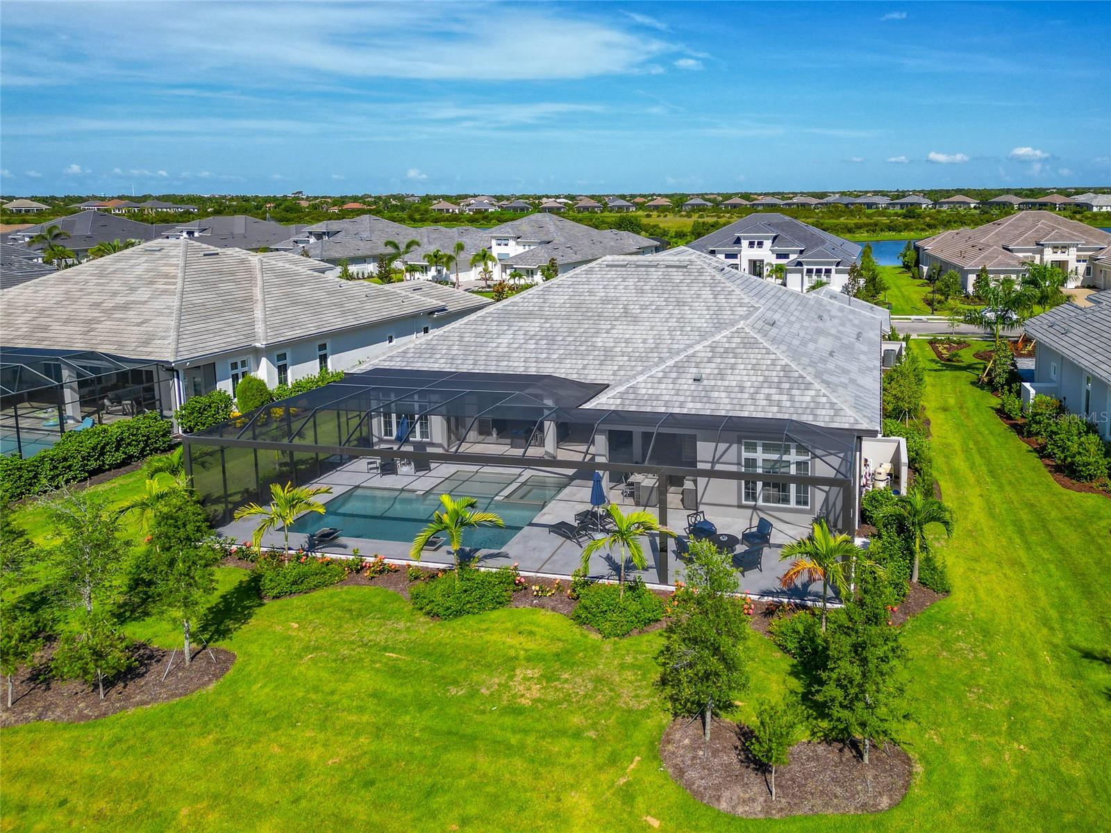 4 Bed, 4.5 Bath, Bonus Room, Office, 4,369 Sq Ft, Water Views, Heated Saltwater Pool & Spa, Expansive Lanai, Outdoor Kitchen, Engineered Hardwood, Tray Ceilings, Custom Lighting, Whole-Home Generator, Impact Doors and Windows, Resort Style Amenities. Make your home the vision of sophistication in Lakewood Ranch's most exclusive village, The Lake Club. This recently crafted Clairborne II custom model by Stock Development is a luxurious 4-bedroom, 4 1/2-bath estate spanning 4,369 square feet. The stunning home features a private study, exercise room, expansive great room, dining room, and a grand outdoor living area, complete with a four-car garage.The heart of this residence is an expansive great room, which is beautifully illuminated with natural light and features a custom LED backlit, drop-down tray ceiling. This space seamlessly flows into the kitchen and dining areas, creating a cohesive living environment. The open kitchen has a large central island, which becomes a natural gathering spot for guests, and includes a gourmet setup with a dry bar, additional storage, and a wine refrigerator. The room's grand openness harmonizes with the cozy intimacy of its functional spaces, offering both a spacious and inviting atmosphere.Engineered hardwood floors add elegance and durability by flowing seamlessly throughout the home. The wall of sliding glass doors in the great room not only lets in abundant natural light, but also seamlessly transitions into an exquisite outdoor space, featuring an expansive east-facing lanai. Here, you can enjoy a cozy fireplace, gourmet outdoor kitchen, and a sparkling salt-water pool and spa, all set against a breathtaking waterfront vista. The panoramic screen enclosure frames impressive water views from every corner.The master suite includes separate his and her closets, a cozy seating area, and a lavish bath featuring a freestanding soaking tub, spacious walk-in shower with frameless glass enclosure, dual-sink vanity, and porcelain tile flooring.Guests and family alike will appreciate the inviting accommodations in this home, featuring two comfortable bedrooms with ensuite bathrooms, a bonus room (currently used as the third bedroom), and an exercise room. Throughout the home, impact-resistant windows and sliding doors enhance security and durability, showcasing recent construction for lasting quality. For ultimate peace of mind, a whole-home generator ensures that you'll never be without power. The Lake Club offers premier amenities and recreational facilities within the community, convenient access to world-class beaches, and A-rated schools. Enjoy a Grande Clubhouse with a restaurant, pool, basketball, tennis and pickleball courts, playground, fitness center, dog park, kayaking, and fishing. This home truly offers the perfect blend of luxury, comfort, and convenience.