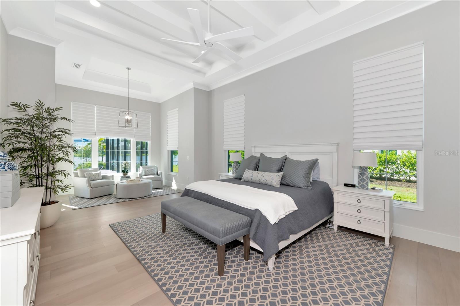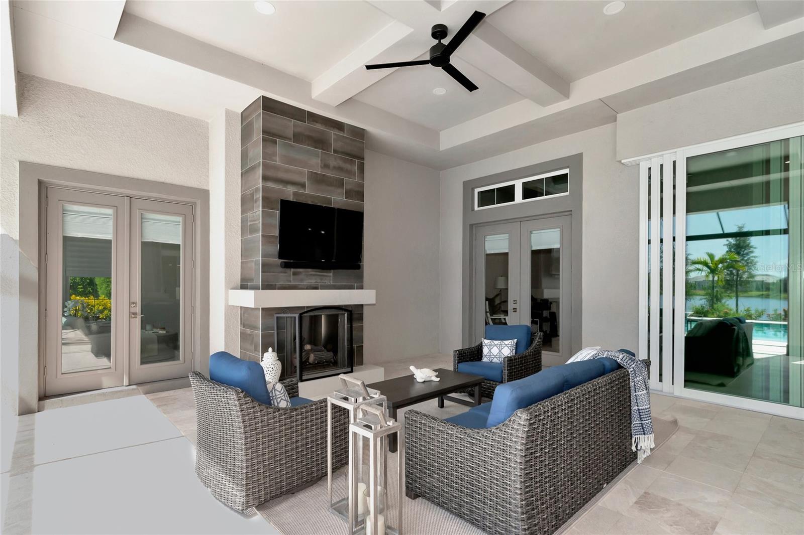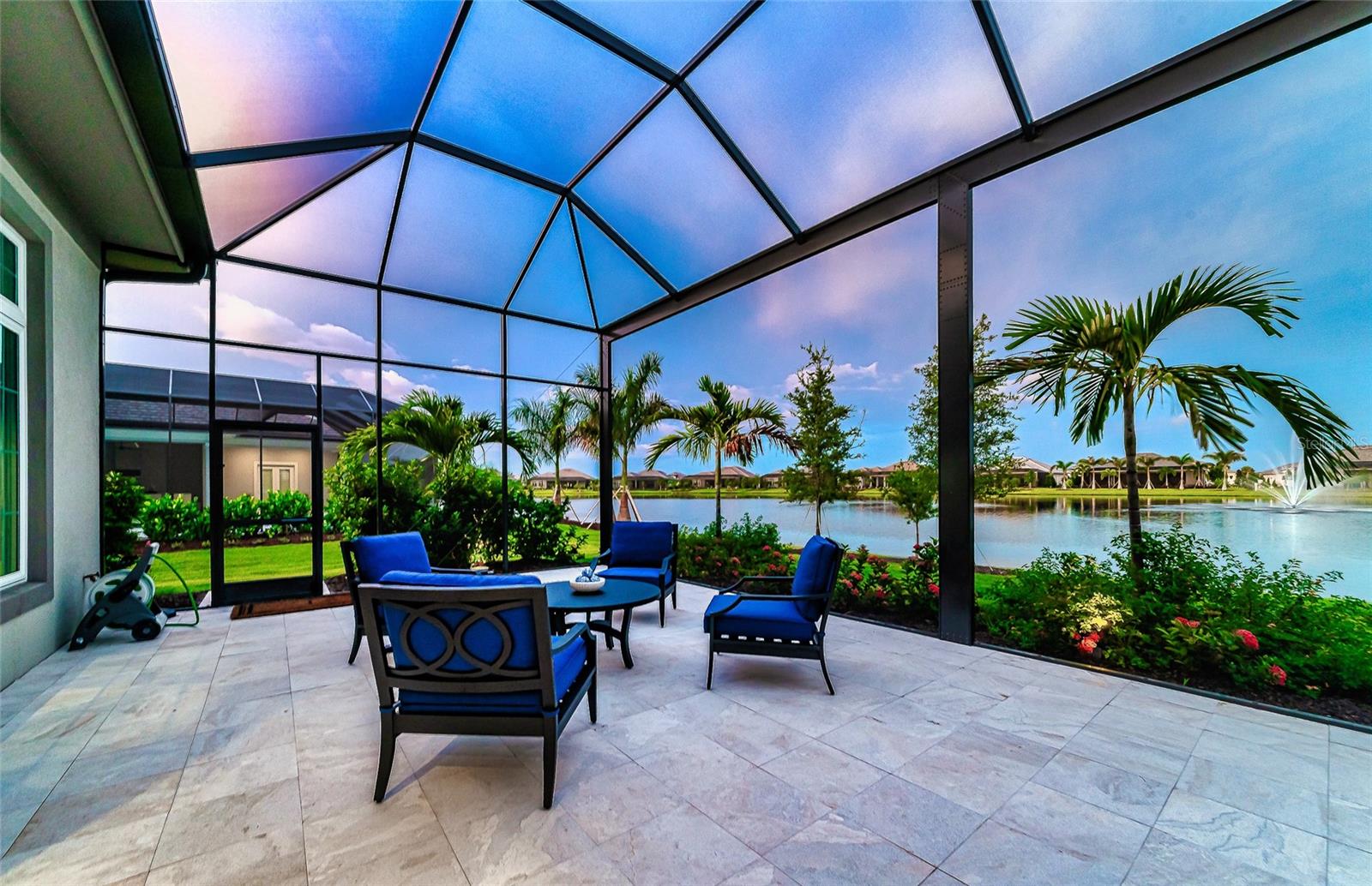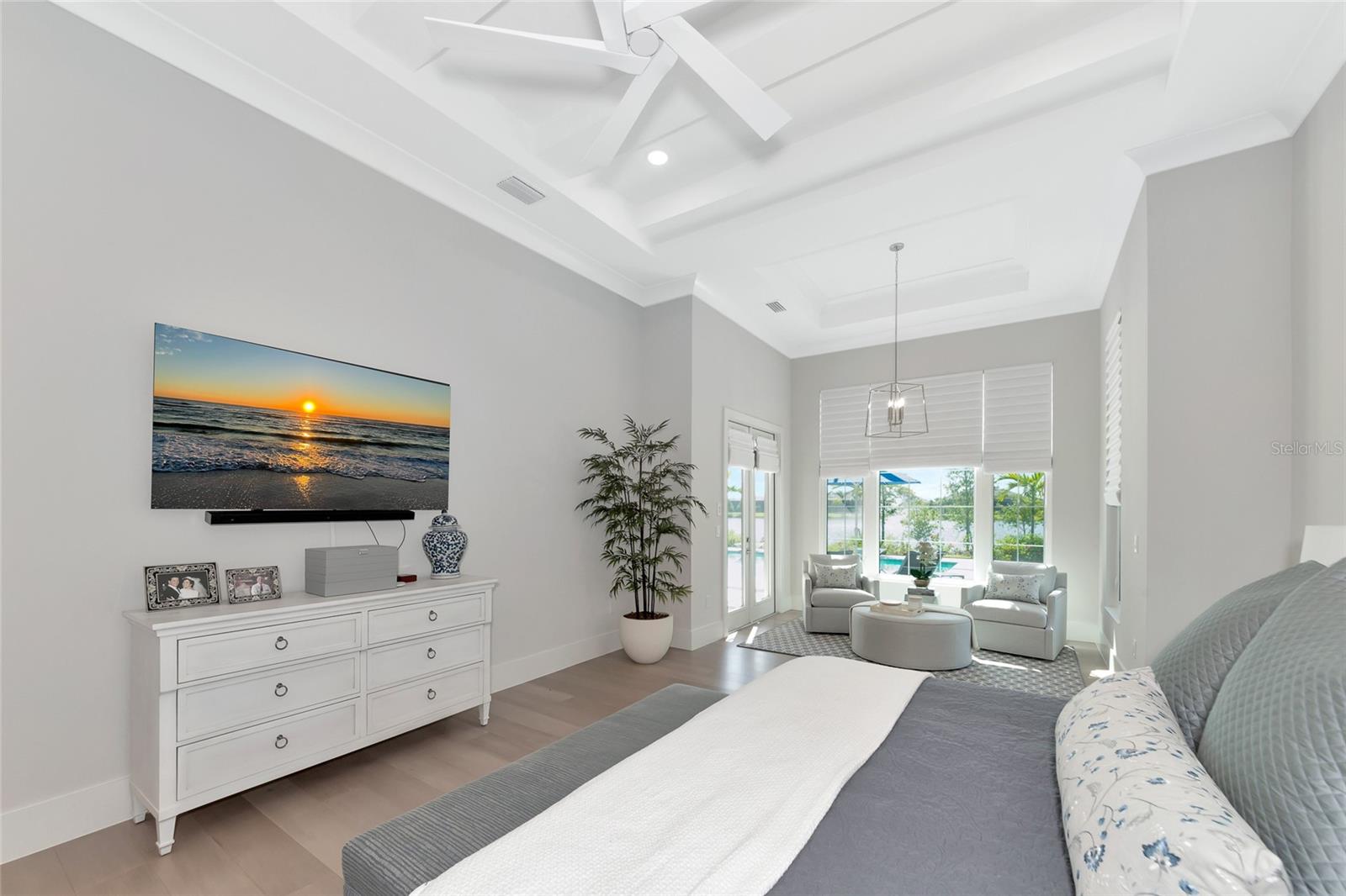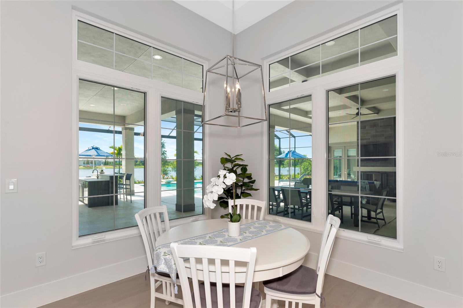 4 Bed, 4.5 Bath, Bonus Room, Office, 4,369 Sq Ft, Water Views, Heated Saltwater Pool & Spa, Expansive Lanai, Outdoor Kitchen, Engineered Hardwood, Tray Ceilings, Custom Lighting, Whole-Home Generator, Impact Doors and Windows, Resort Style Amenities. Make your home the vision of sophistication in Lakewood Ranch's most exclusive village, The Lake Club. This recently crafted Clairborne II custom model by Stock Development is a luxurious 4-bedroom, 4 1/2-bath estate spanning 4,369 square feet. The stunning home features a private study, exercise room, expansive great room, dining room, and a grand outdoor living area, complete with a four-car garage.The heart of this residence is an expansive great room, which is beautifully illuminated with natural light and features a custom LED backlit, drop-down tray ceiling. This space seamlessly flows into the kitchen and dining areas, creating a cohesive living environment. The open kitchen has a large central island, which becomes a natural gathering spot for guests, and includes a gourmet setup with a dry bar, additional storage, and a wine refrigerator. The room's grand openness harmonizes with the cozy intimacy of its functional spaces, offering both a spacious and inviting atmosphere.Engineered hardwood floors add elegance and durability by flowing seamlessly throughout the home. The wall of sliding glass doors in the great room not only lets in abundant natural light, but also seamlessly transitions into an exquisite outdoor space, featuring an expansive east-facing lanai. Here, you can enjoy a cozy fireplace, gourmet outdoor kitchen, and a sparkling salt-water pool and spa, all set against a breathtaking waterfront vista. The panoramic screen enclosure frames impressive water views from every corner.The master suite includes separate his and her closets, a cozy seating area, and a lavish bath featuring a freestanding soaking tub, spacious walk-in shower with frameless glass enclosure, dual-sink vanity, and porcelain tile flooring.Guests and family alike will appreciate the inviting accommodations in this home, featuring two comfortable bedrooms with ensuite bathrooms, a bonus room (currently used as the third bedroom), and an exercise room. Throughout the home, impact-resistant windows and sliding doors enhance security and durability, showcasing recent construction for lasting quality. For ultimate peace of mind, a whole-home generator ensures that you'll never be without power. The Lake Club offers premier amenities and recreational facilities within the community, convenient access to world-class beaches, and A-rated schools. Enjoy a Grande Clubhouse with a restaurant, pool, basketball, tennis and pickleball courts, playground, fitness center, dog park, kayaking, and fishing. This home truly offers the perfect blend of luxury, comfort, and convenience.