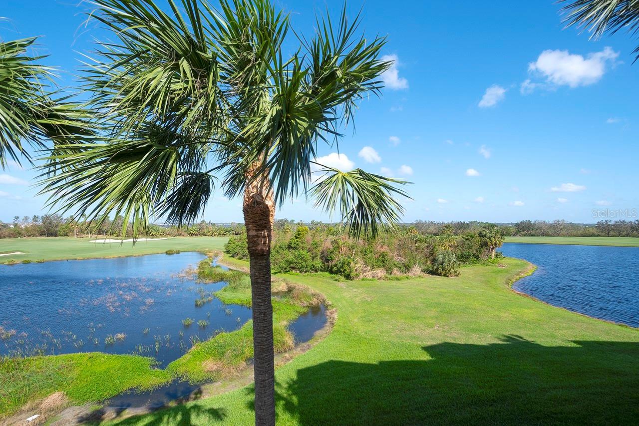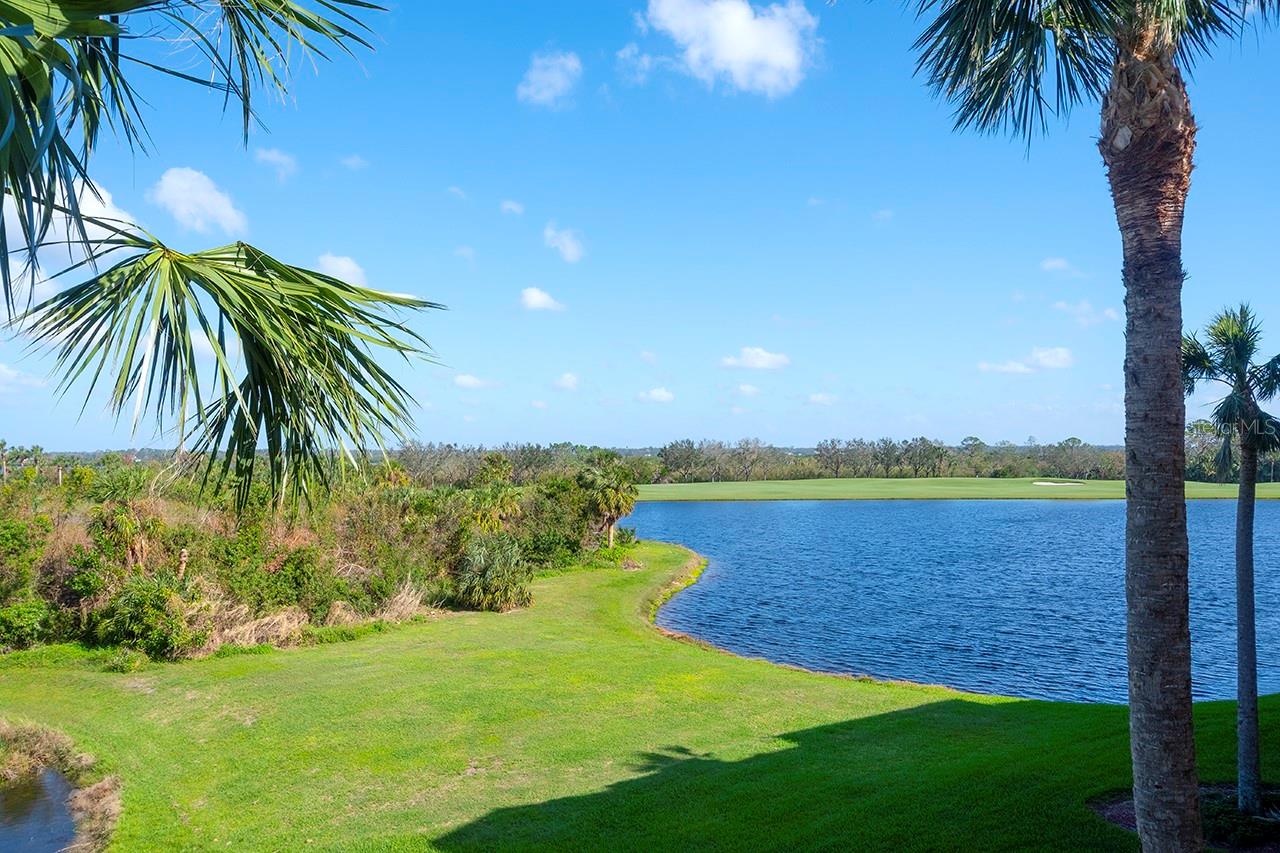 You'll enjoy outstanding WATER AND GOLF COURSE VIEWS from this top floor penthouse location. Nestled securely within the gates of River Strand, this popular COLONADE END-UNIT, the largest of The Terrace's floor plans, features 2 bedrooms, 2 full baths and versatile DEN. Vacant and ready for immediate occupancy, the home is a blank canvas awaiting your personal touches. Notable features include: an open floor plan, porcelain floor tiles installed on the diagonal, crown moldings, screened lanai and outside storage room for bicycles & beach chairs. HURRICANE RESISTANT WINDOWS & PATIO DOORS provide safety and peace of mind, in fact, the building was virtually unscathed in two of the worst storms in recent history, a testament to the construction and protected location. The spacious eat-in kitchen, central to all activities, features granite countertops with breakfast bar, solid wood cabinets, stainless-steel appliances, pantry, and the convenience of a separate adjoining laundry room. The owner's suite features ensuite bath with his & hers walk-in closets and the versatile den with pocketing double doors is valuable bonus space adaptable to a variety of uses including home office, media room or extra guest space if needed. Ownership includes DEEDED SOCIAL MEMBERSHIP in the 39,000 sq ft Tuscan inspired club house with on-site restaurant and grill room, 2 state of the art fitness centers with 24/7 access, Tiki Bar, 2 resort style pools with hot tub and resistance pool, plus 8 heated satellite pools, Pickle Ball courts plus separate tennis club with 8 Har-Tru lighted courts. Close to restaurants, world-class shopping, award-winning beaches plus a variety of cultural & sports venues and activities. Costco, Walmart Super Center, Home Depot and the Ellenton Outlets are only minutes away. LIVING IS EASY & SECURE in this ACTIVE LIFESTYLE COMMUNITY, and you'll love the LOCK & LEAVE CONVENIENCE of maintenance free living!