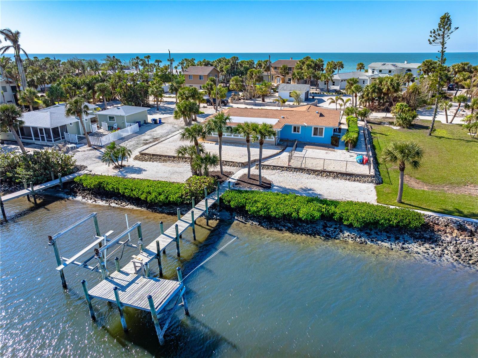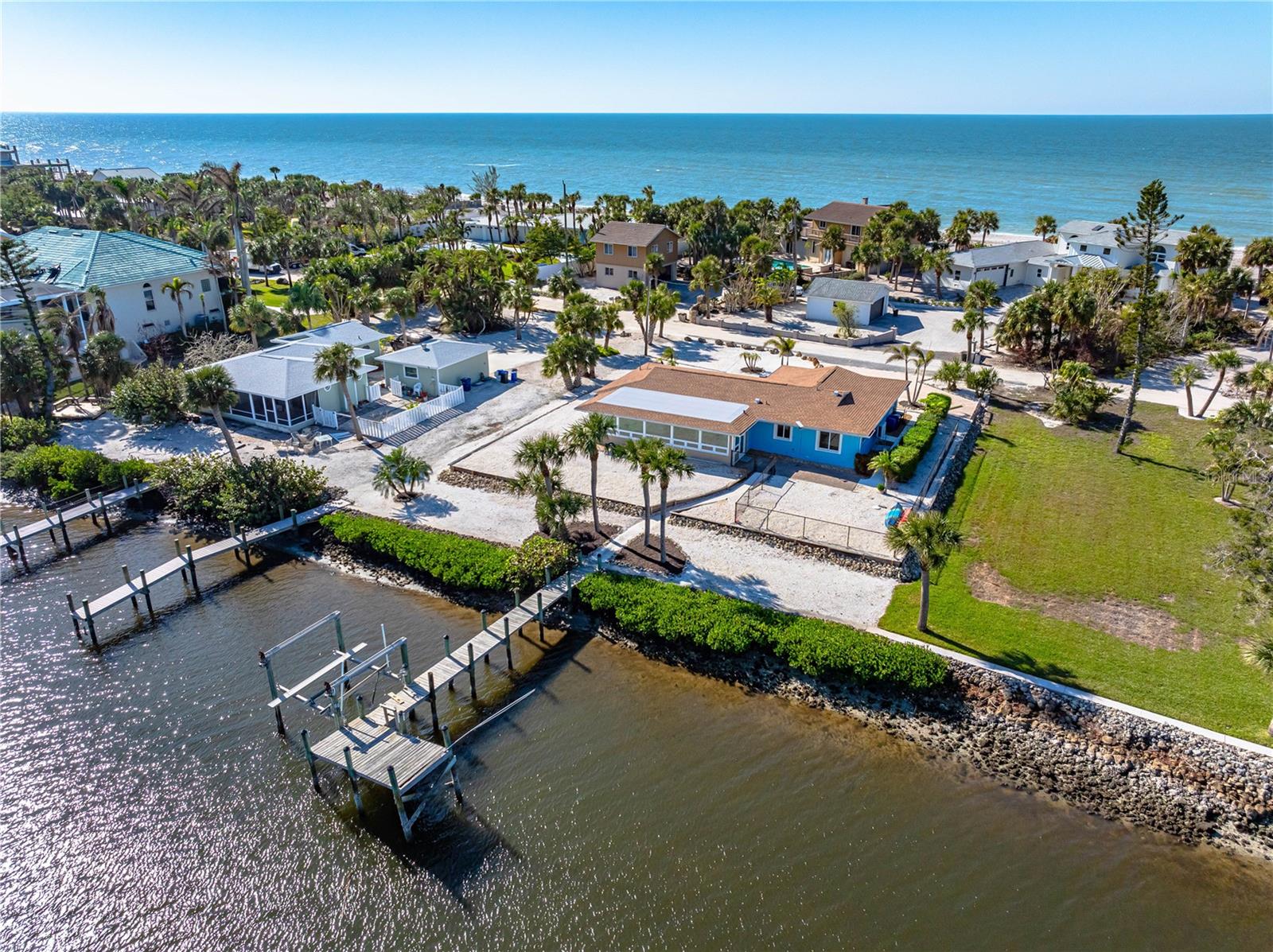 This beautifully updated 2-bedroom, 2-bathroom home offers the perfect blend of coastal charm and modern convenience. Located in the exclusive, small, gated community of North Manasota Key, it boasts breathtaking intercoastal water views right from your doorstep. Enjoy easy access to local beaches and the nearby bridge, providing a quick connection to the mainland. Inside, the spacious open floor plan creates a seamless flow between the bright kitchen and living areas, flooded with natural Florida light. Both the primary and guest bathrooms have been tastefully updated with walk-in showers for a sleek, modern touch. Each bedroom is equipped with generously sized closets, providing ample storage. The Florida room adds extra living space, offering panoramic views of the intercostal perfect for relaxing while soaking in the serene waterfront scenery. For boating enthusiasts, the private dock with a lift on the intercoastal waterway is a true highlight ideal for boating, fishing, or simply unwinding while enjoying the tranquil water views. With all storm damage fully remediated, this home is in excellent move-in condition and ready for you to enjoy.