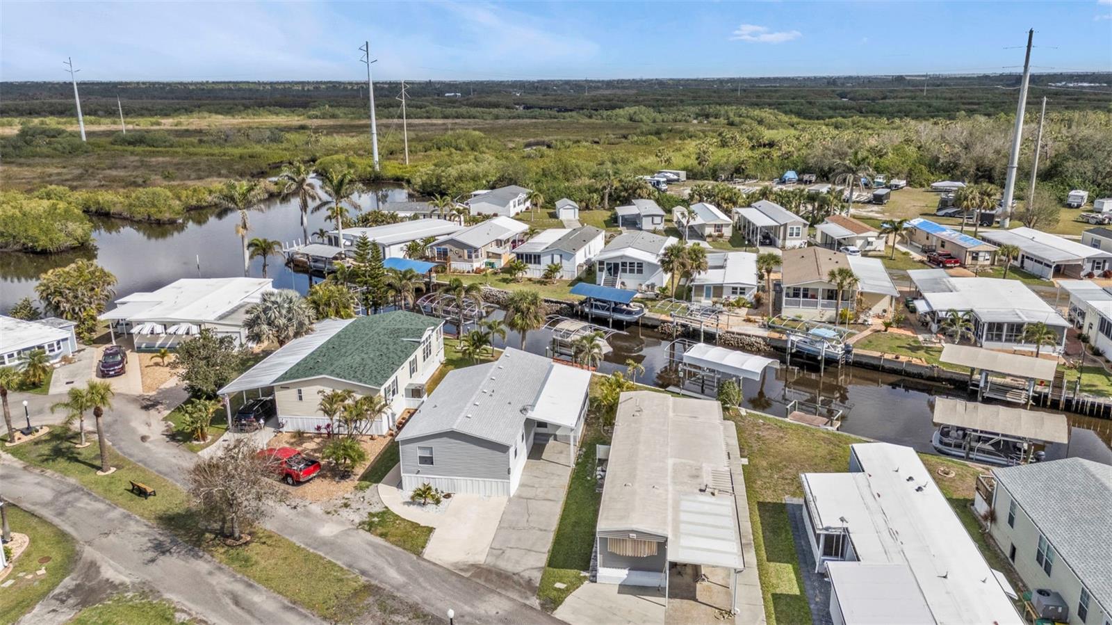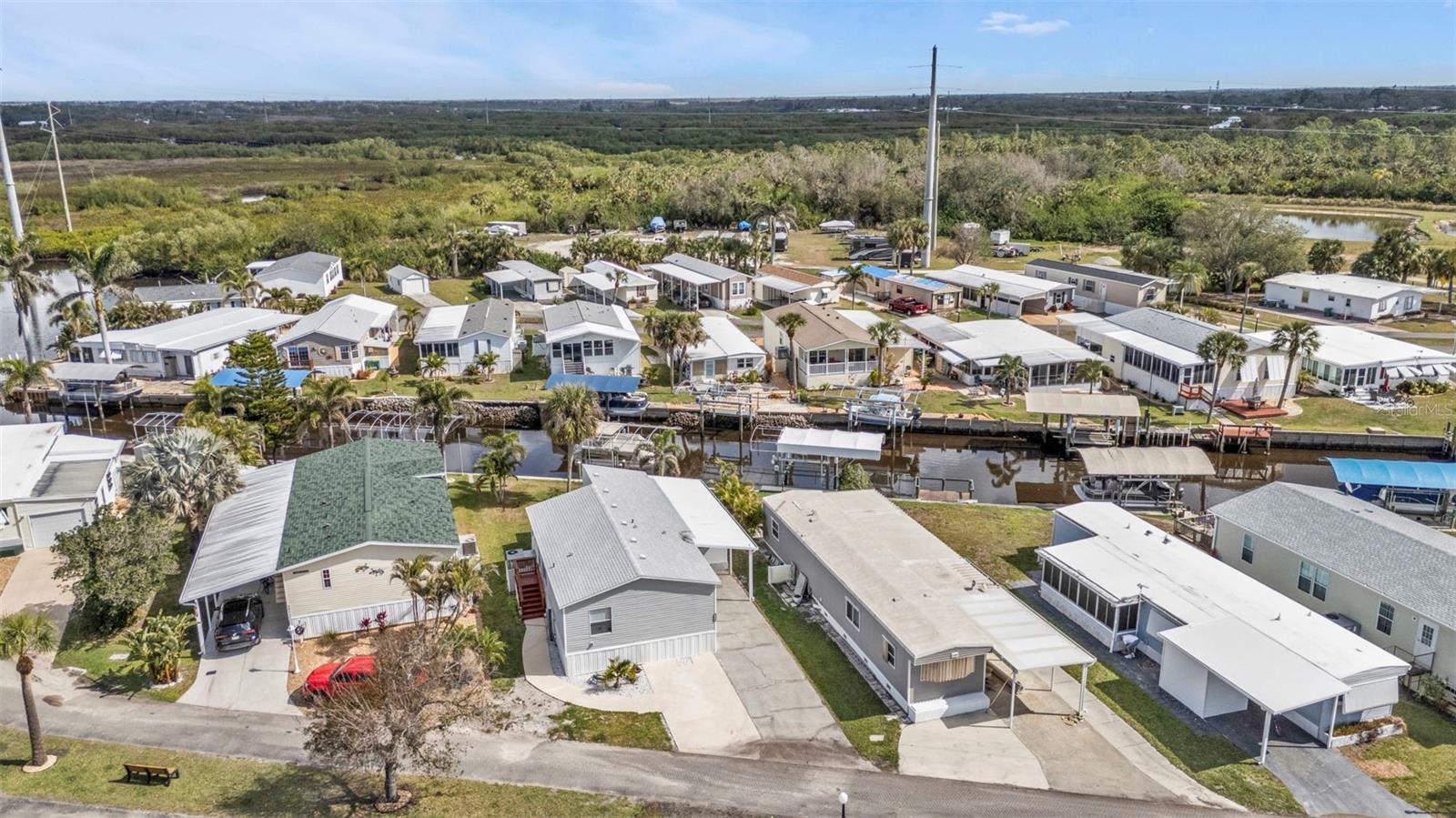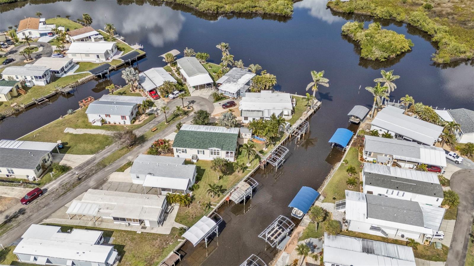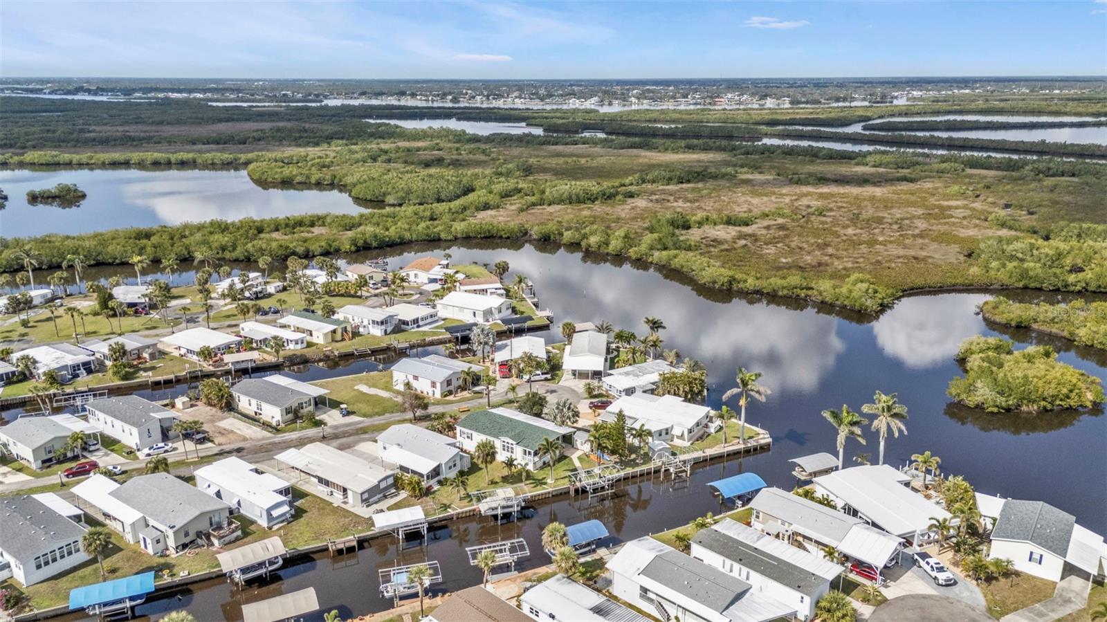 One or more photo(s) has been virtually staged. Welcome to your waterfront retreat in Pelican Harbor Mobile Home Estates, a 55+ community offering a boating lifestyle with fantastic amenities. This 2005 Fleetwood manufactured home sits on 50 feet of direct waterfrontage along the widest canal in the community (60 feet across!), providing immediate access to Charlotte Harbor and out to the Gulf of Mexico--a true boater's paradise.Enjoy your own private dock with electric, a brand-new covered boat lift (2024) with updated breakers, and a concrete seawall replaced in 2017 for lasting waterfront security. Inside, the home offers 2 bedrooms and 2 bathrooms with luxury vinyl plank flooring throughout for a modern, low-maintenance feel. The bright kitchen features white cabinetry, granite countertops, a range, dishwasher, and center island perfect for casual dining. Overlooking the open-concept living space, this layout is ideal for entertaining. A large bonus room with expansive windows showcases stunning backyard and waterfront views--perfect as a sunroom, dining area, or home office. Step outside to your spacious screened-in and covered patio/Florida room to relax in the peaceful waterfront setting. Major upgrades include a new roof and HVAC system (2023), new exterior skirting with hurricane tie-downs, updated foam insulation and vapor barrier, and a new 10x10 storage shed (2024). The home also offers a large driveway and covered carport for plenty of parking.Pelican Harbor Mobile Home Estates features top-notch 55+ amenities: a boat trailer/RV storage yard, heated pool, community clubhouse, and tool shop for borrowing tools. The low $175/month HOA fee includes water and sewer. Close to local marinas, shops, dining, and outdoor recreation--this is an exceptional opportunity to enjoy the Florida waterfront lifestyle with direct boating access to the Gulf! Enjoy one year of HOA dues paid by the seller.