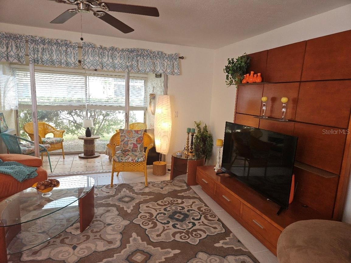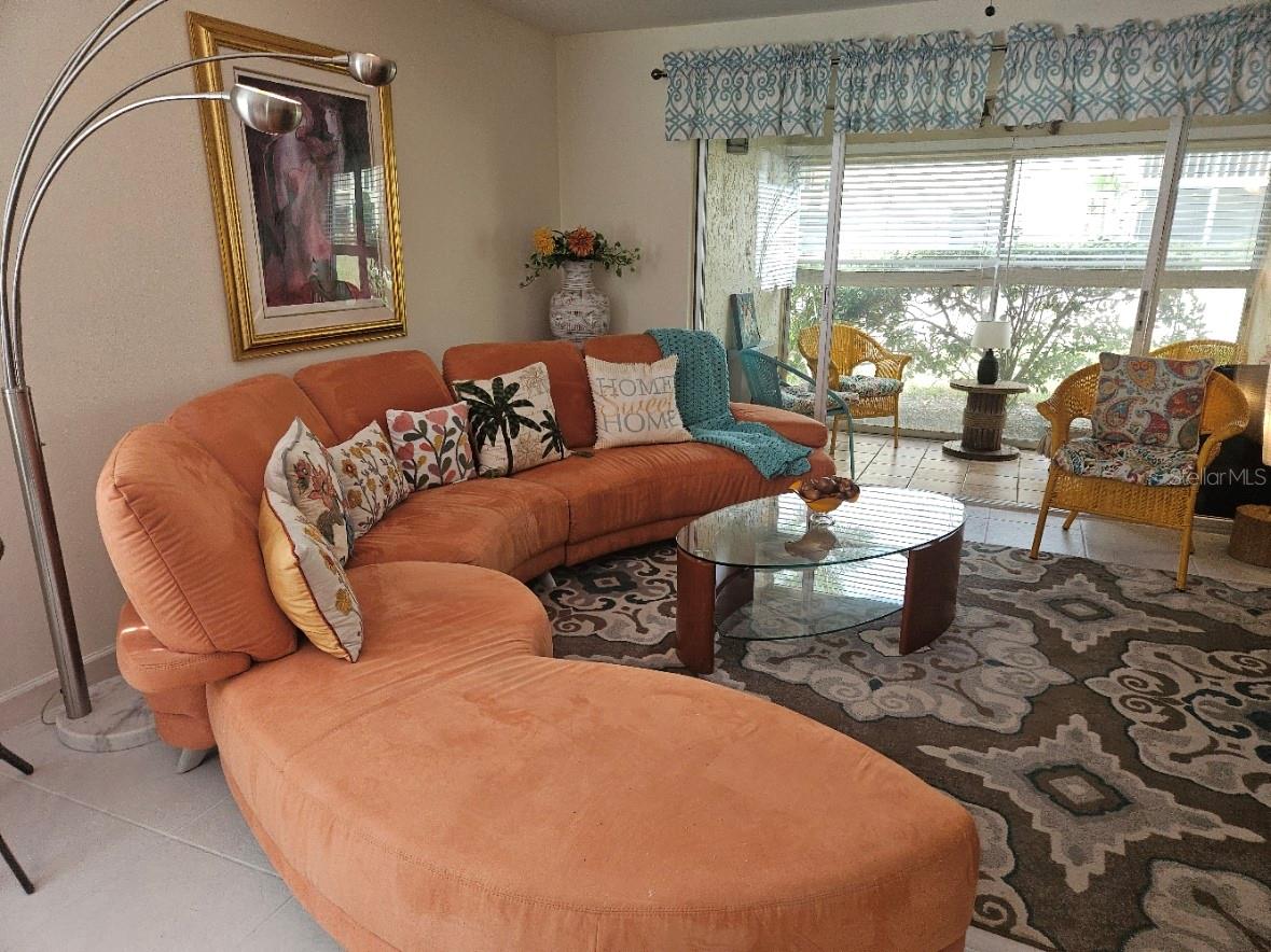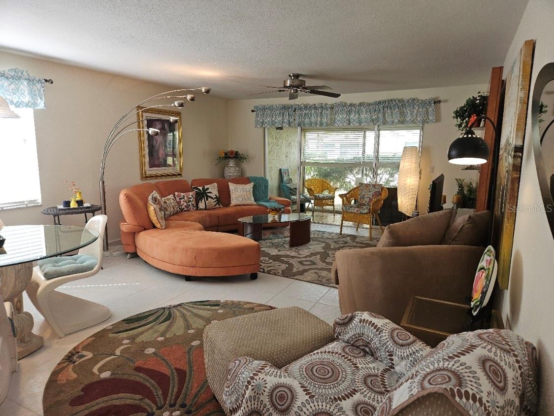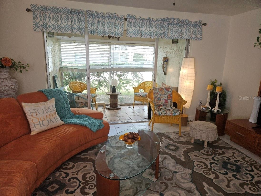 Don't miss this colorful and cozy first floor condo in 55+ Village Plaza; turnkey furnished and available for a quick close. The location can't be beat - just around the corner from groceries, banking, medical facilities, shopping, restaurants and public transit, 3 miles from I75 and 15 minutes to downtown Sarasota. The floor plan is designed for easy living - a generous sized living / dining area opens to a comfortable screened lanai that is also glassed in so you can make the most of every Florida season. The primary bedroom is quite large, has a walk in closet and a pocket door that opens to the bathroom, with double vanity and walk in shower. The guest room is set up both for sleeping and as a home office. The property is available turnkey furnished as a convenience to those who appreciate the eclectic style of the furnishings! The condo is just a few short steps to one of two nearby laundry rooms and just a few more steps to the clubhouse where there is always something happening: fitness classes, billiards, card games, weekly happy hour, community BBQ area, shuffleboard, pickleball, movie nights, parties, Bingo ... and more!!