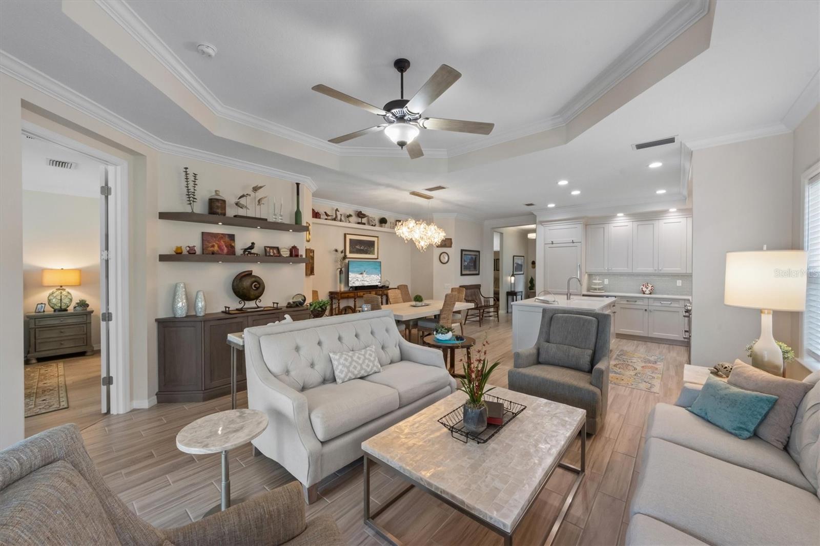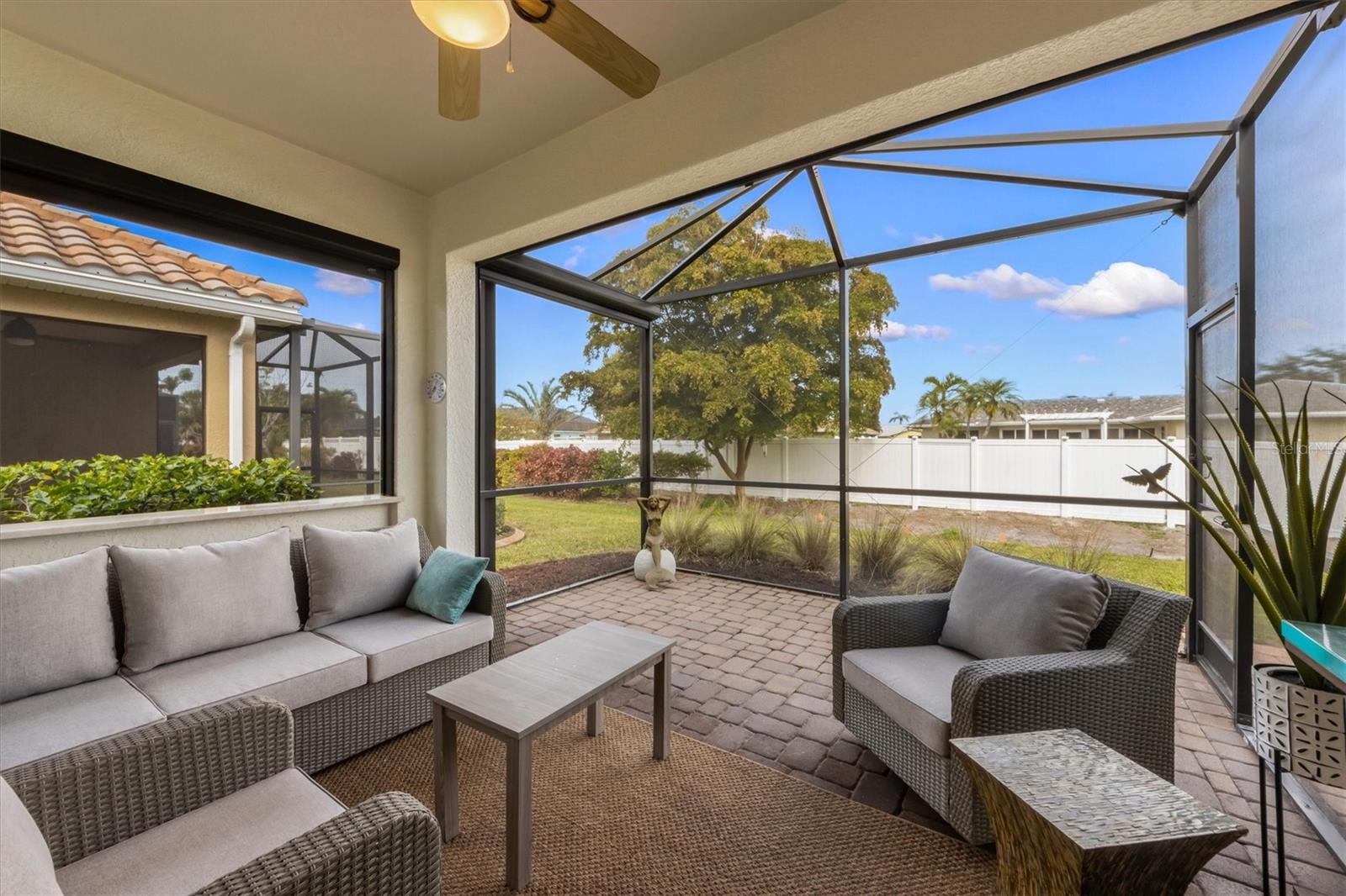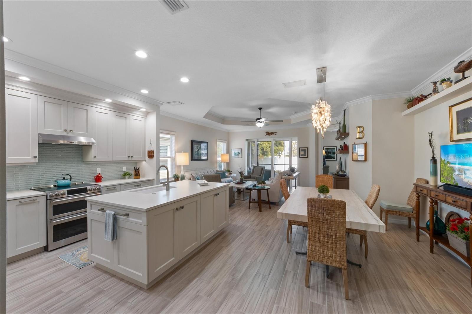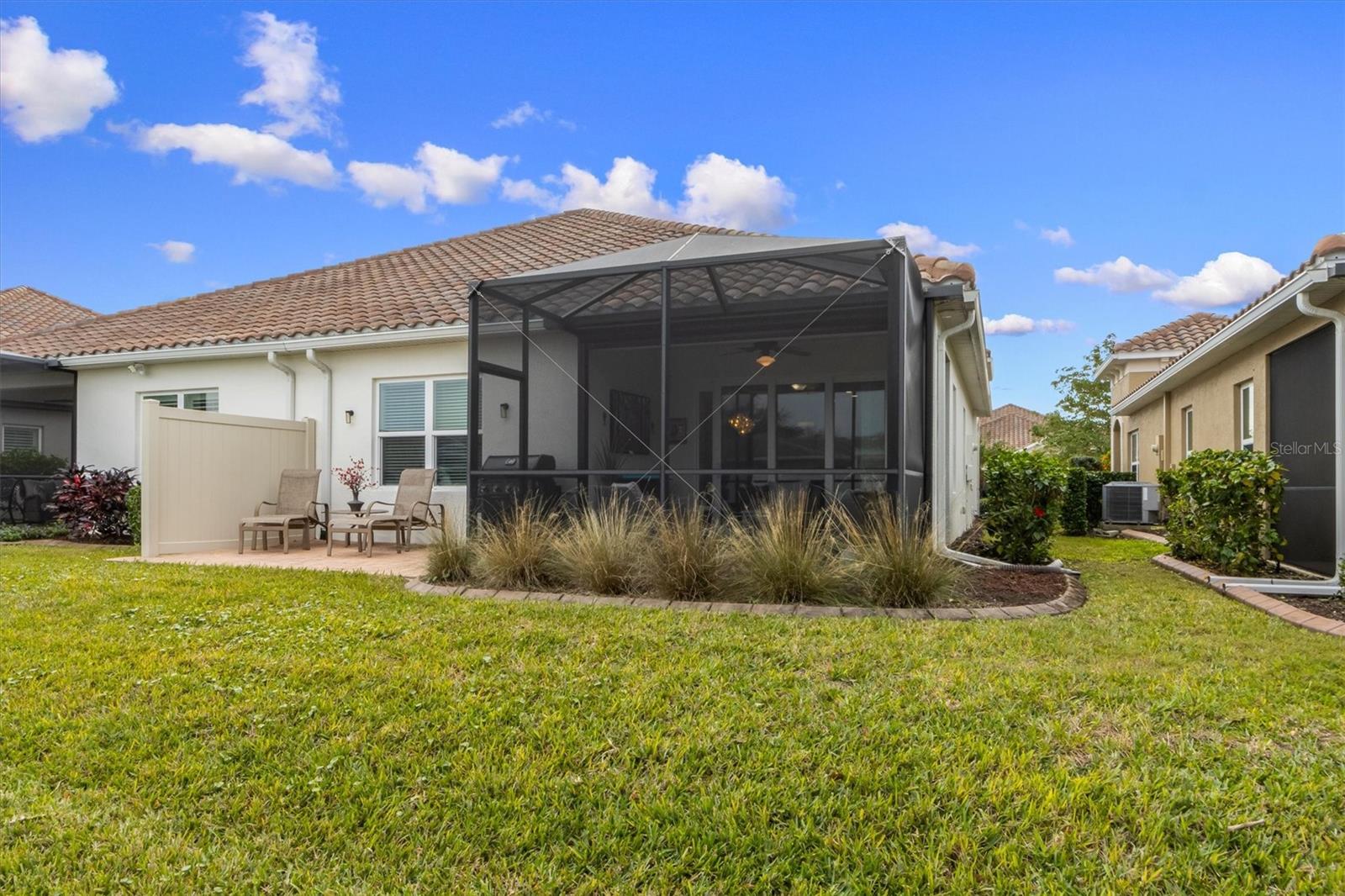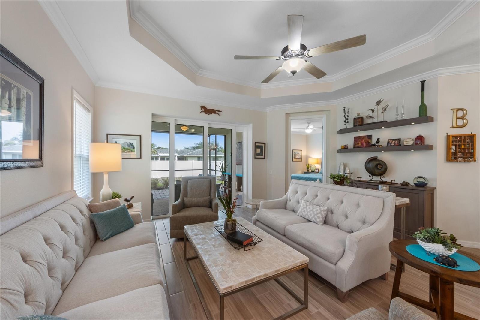 Above and beyond: That's what you'll find in this Mirabella home: Construction that meets the most stringent requirements in this fantastic 55 plus community, this LEED Platinum community is located in NW Bradenton. This home has meticulously been upgraded with new custom kitchen cabinets, Caesarstone quartz counter tops and LED lighting package. Impact hurricane windows and pocket slider. The den/office also has custom cabinets and quartz counter tops, set up as both craft room and office. Mirabelle is more than just a home; it's a lifestyle. Nestled in a serene, beautifully maintained neighborhood with access to exclusive amenities such as a community pool, clubhouse, gym and pickleball courts. A very short drive takes you to kayaking at Robinson Preserve or swimming and sunning on Island beaches. Mirabelle is absolutely unscathed by stormy weather but within reach of so much. The 2200 sq ft 2-bedroom, 2-bath home, plus a den, offers an effortlessly flowing floor plan. It moves seamlessly from the entry foyer, through a spacious living/dining room with high tray ceilings to an extended screened patio. This home has a coastal flair for you. The bedrooms feature new luxury vinyl flooring, and the study has been upgraded with porcelain tile. All the major rooms have new ceiling fans. Enjoy proximity to fine dining and shopping in this highly sought-after NW Bradenton community. A community dog park provides a place to meet neighbors and walk your four-foot fur babies, also at your fingertips, are the clubhouse, pool, and pickleball.Please note all bushes are being replaced in the back yard along the fence.