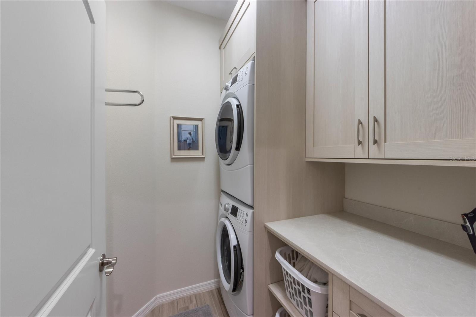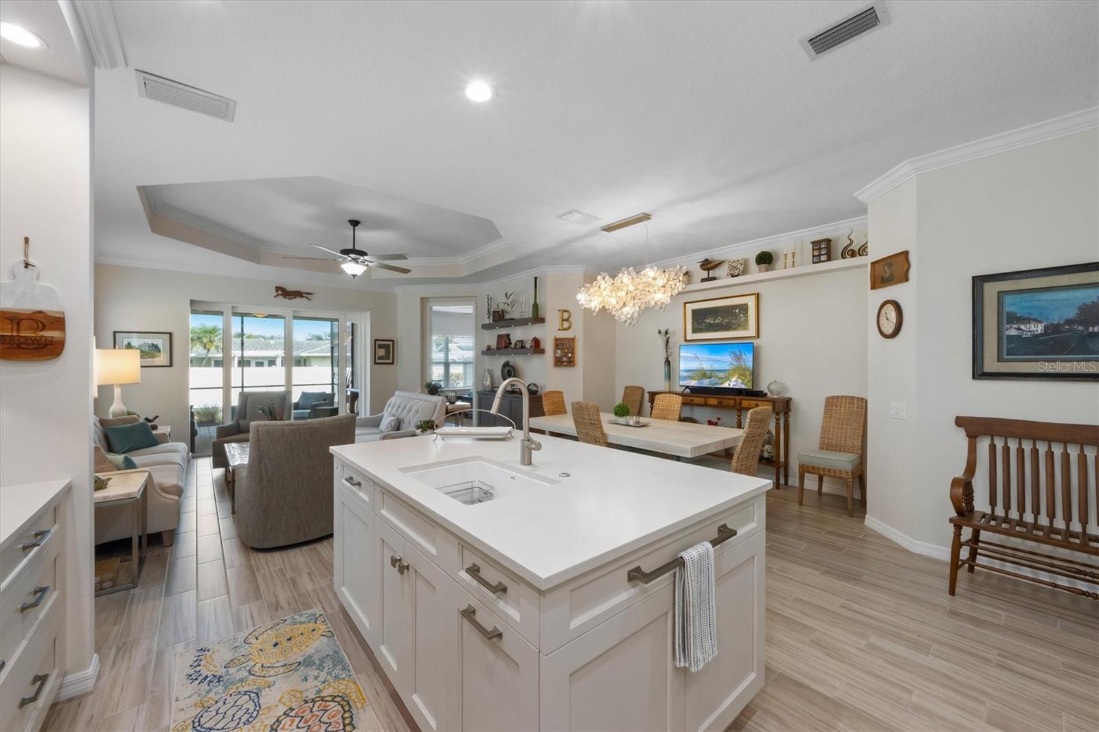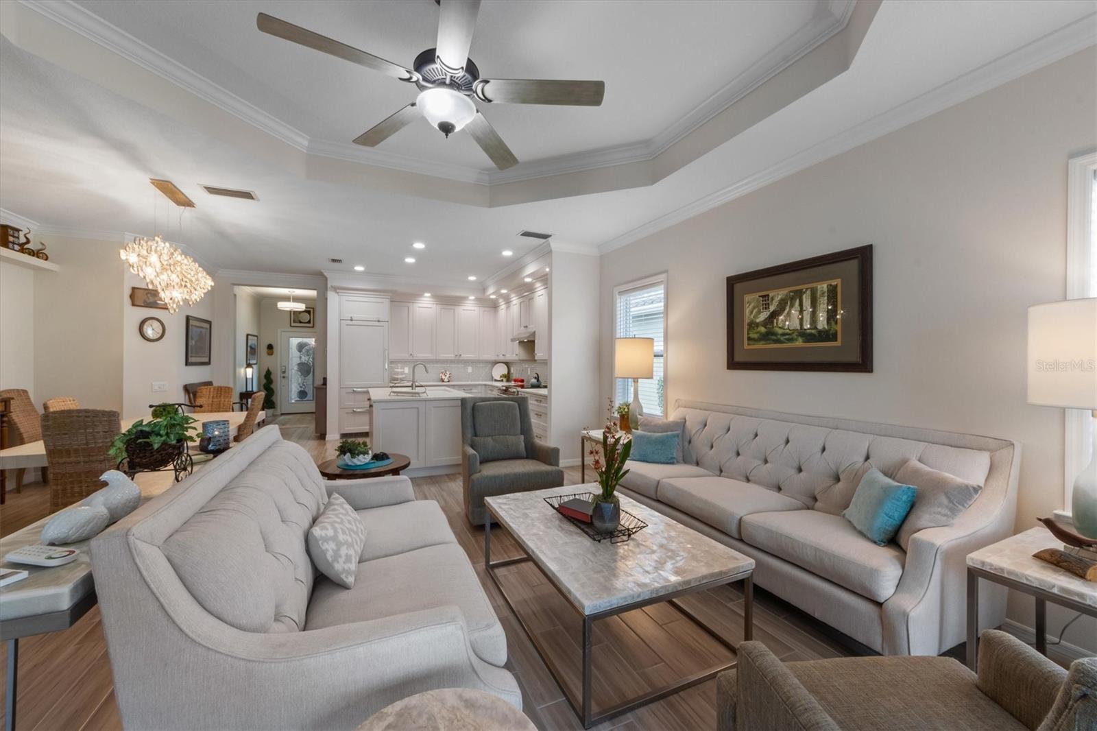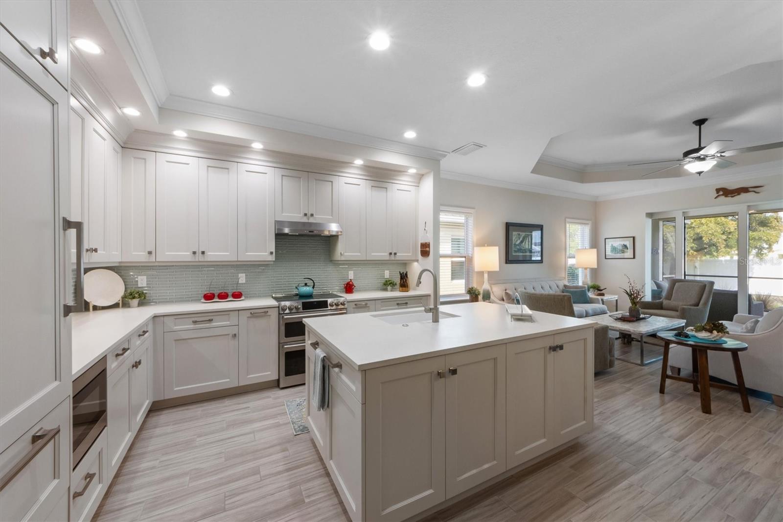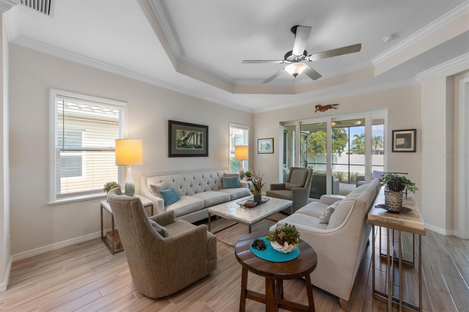 Above and beyond: That's what you'll find in this Mirabella home: Construction that meets the most stringent requirements in this fantastic 55 plus community, this LEED Platinum community is located in NW Bradenton. This home has meticulously been upgraded with new custom kitchen cabinets, Caesarstone quartz counter tops and LED lighting package. Impact hurricane windows and pocket slider. The den/office also has custom cabinets and quartz counter tops, set up as both craft room and office. Mirabelle is more than just a home; it's a lifestyle. Nestled in a serene, beautifully maintained neighborhood with access to exclusive amenities such as a community pool, clubhouse, gym and pickleball courts. A very short drive takes you to kayaking at Robinson Preserve or swimming and sunning on Island beaches. Mirabelle is absolutely unscathed by stormy weather but within reach of so much. The 2200 sq ft 2-bedroom, 2-bath home, plus a den, offers an effortlessly flowing floor plan. It moves seamlessly from the entry foyer, through a spacious living/dining room with high tray ceilings to an extended screened patio. This home has a coastal flair for you. The bedrooms feature new luxury vinyl flooring, and the study has been upgraded with porcelain tile. All the major rooms have new ceiling fans. Enjoy proximity to fine dining and shopping in this highly sought-after NW Bradenton community. A community dog park provides a place to meet neighbors and walk your four-foot fur babies, also at your fingertips, are the clubhouse, pool, and pickleball.Please note all bushes are being replaced in the back yard along the fence.