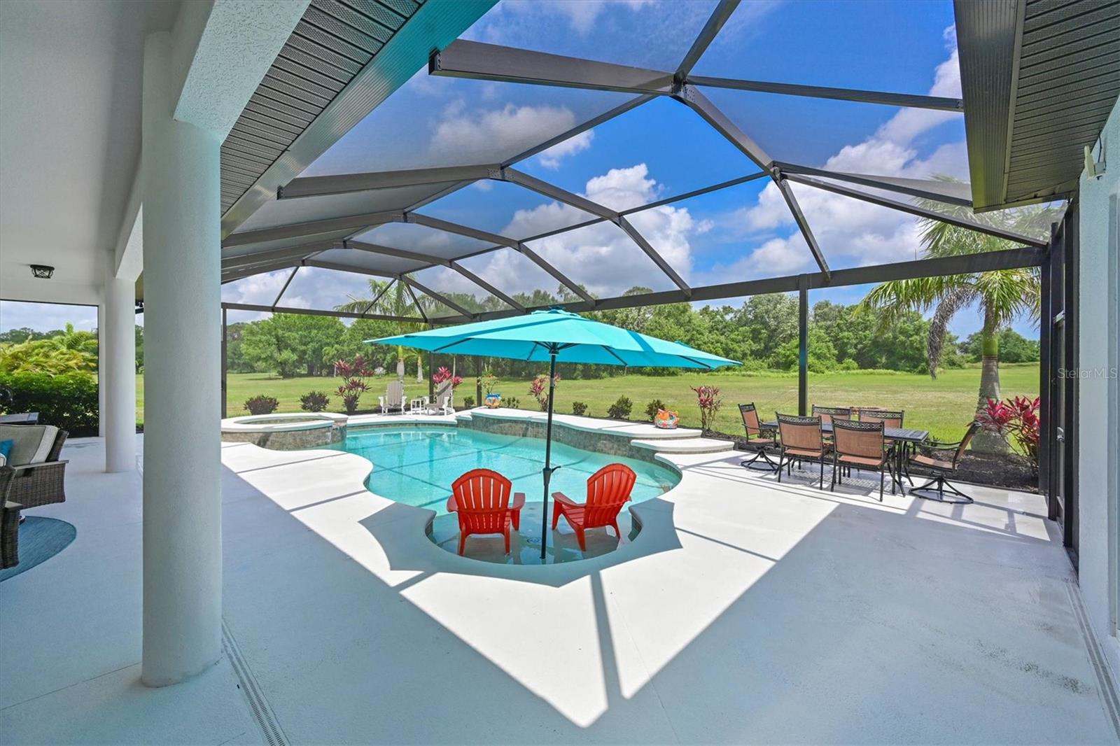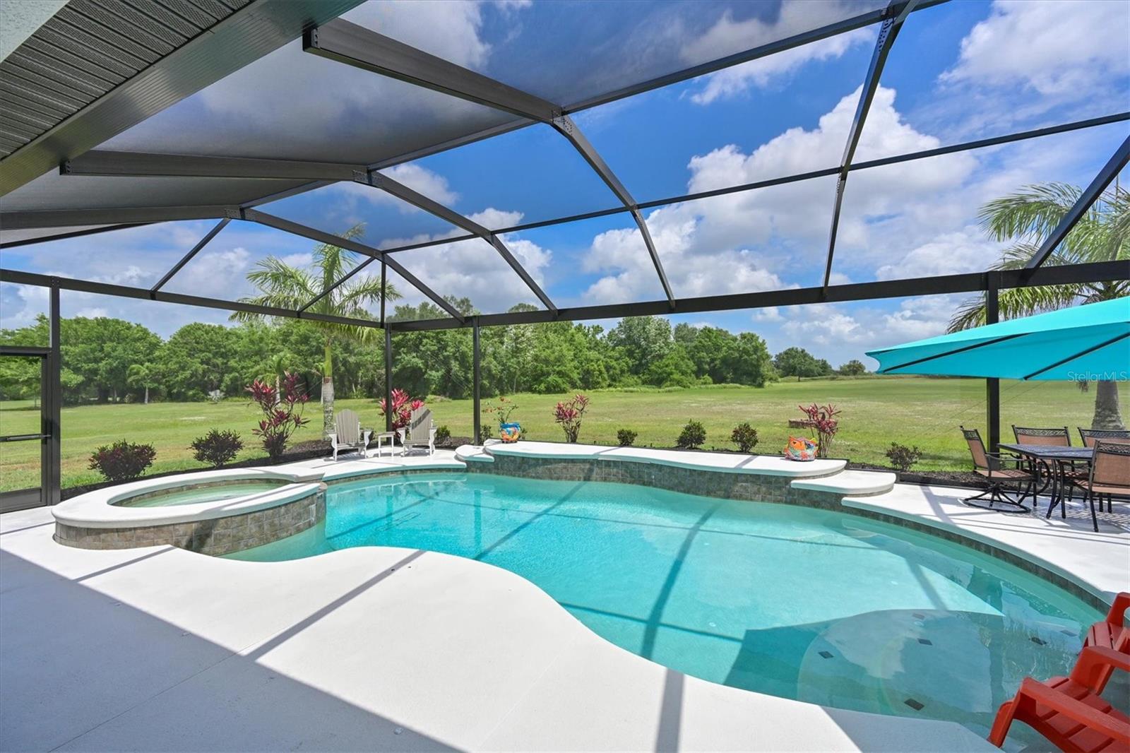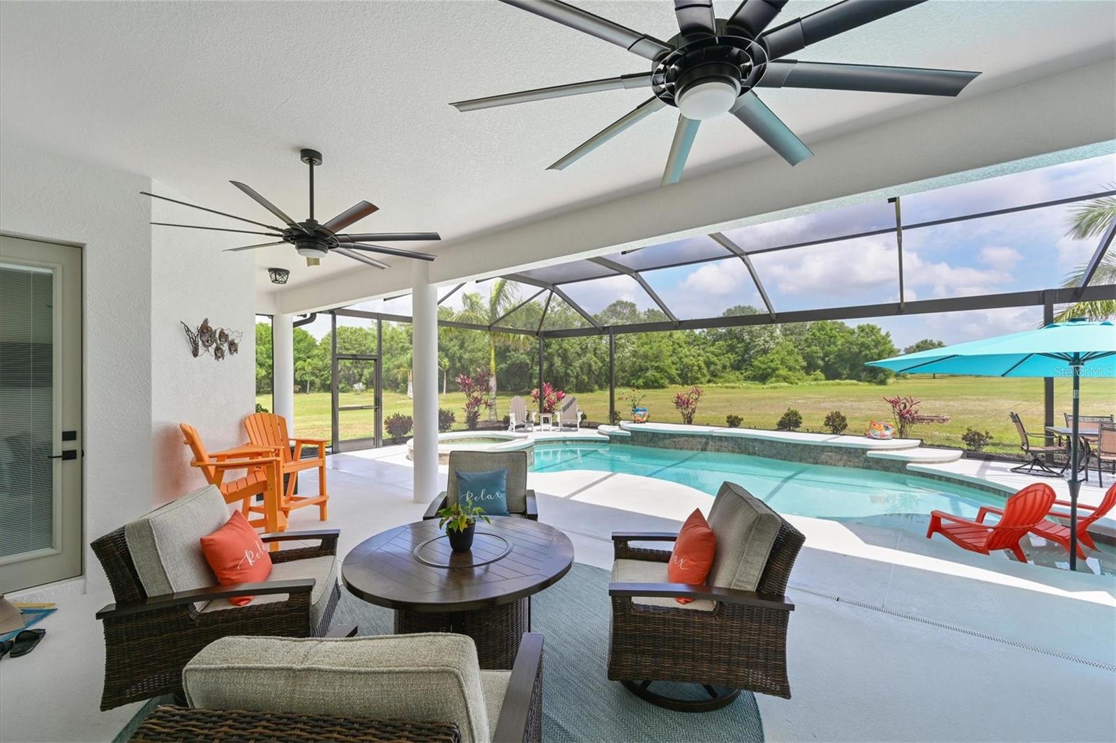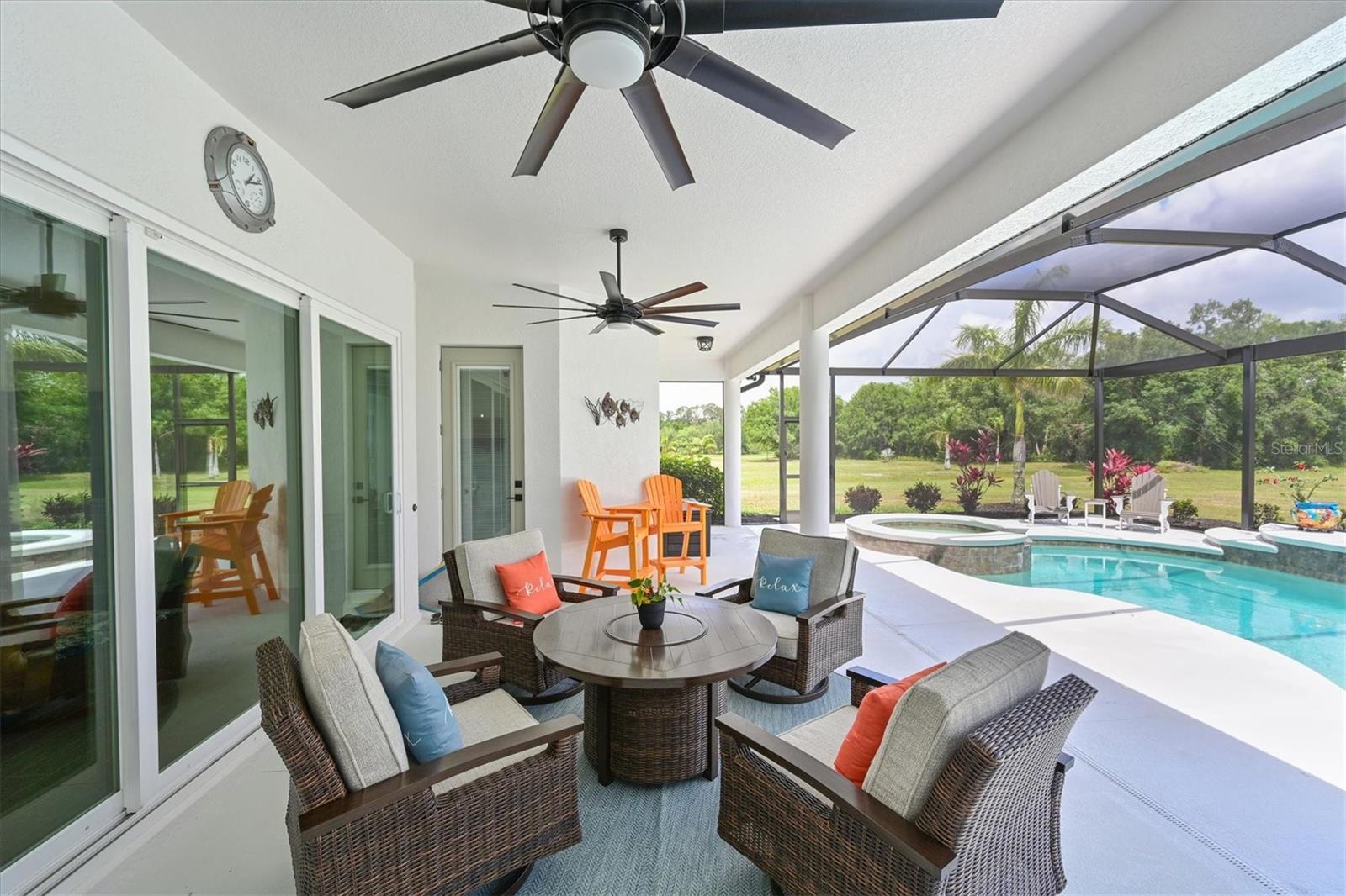 Welcome to your dream home in the prestigious Foxbrook Community of Parrish! Nestled on over 5 acres of serene, picturesque land, this stunning estate offers the perfect blend of luxury, comfort, and privacy. With 3,472 square feet of elegant living space, this home is a true retreat, thoughtfully designed for relaxation and entertaining, featuring a greatroom, 4 spacious bedrooms, 4 beautifully appointed bathrooms, a dedicated office, and a versatile bonus room. The heart of the home is made for both gathering and retreat. The greatroom living space flows seamlessly with the open kitchen, and the 8ft. pocketing glass doors create a wide uninterrupted opening, bridging the indoor and outdoor spaces! This design offers abundant natural light and tranquil views of the pool and lanai. Culinary enthusiasts will appreciate this kitchen which was designed with Holidays in mind! The large island with multiple ovens for creating all your family recipes and multiple prep surfaces make this the perfect place to create and congregate! The upgraded kitchen features an induction range with air fryer capability, Advantium microwave and a Bosch dishwasher, extensive storage and full pantry! The master suite is a private sanctuary, complete with an ensuite bathroom featuring dual vanities, a spa-like oversized shower, and a serene garden soaking tub. The thoughtful split-bedroom floor plan ensures privacy for all, with three distinct bedroom areas, and ensuite baths-- ideal for guests or family members. The caged pool area features a clear view screen enclosure ('24) and a relaxing spa, creating the ultimate space for leisure and entertaining. The expansive 4+ car garage includes a large storage room and has space ideal for a deluxe man cave or workshop setup. This home has been meticulously constructed and updated with comfort and convenience in mind. Thoughtfully chosen energy-efficient upgrades include impact-rated windows and doors that enhance storm protection and reduce energy costs, along with Icynene spray foam insulation, which delivers superior indoor air quality and consistent temperature control throughout the home. Dual HVAC units ensure personalized climate zones and a new Roof ('24). Additional features include: a state-of-the-art water softener and filtration system with Reverse Osmosis drinking water, and a modern hot water recirculating system ('24). Located in the Foxbrook Community, this property is perfect for equestrian enthusiasts, as the community is horse-friendly and offers equestrian use. Enjoy the beauty of nature and the freedom of horseback riding right at your doorstep, making this home not only a luxurious retreat but also a haven for horse lovers. Experience the perfect blend of privacy and comfort in this remarkable community! Don't miss the opportunity to make this luxurious, private retreat your forever home--where functionality, elegance, and lifestyle meet!