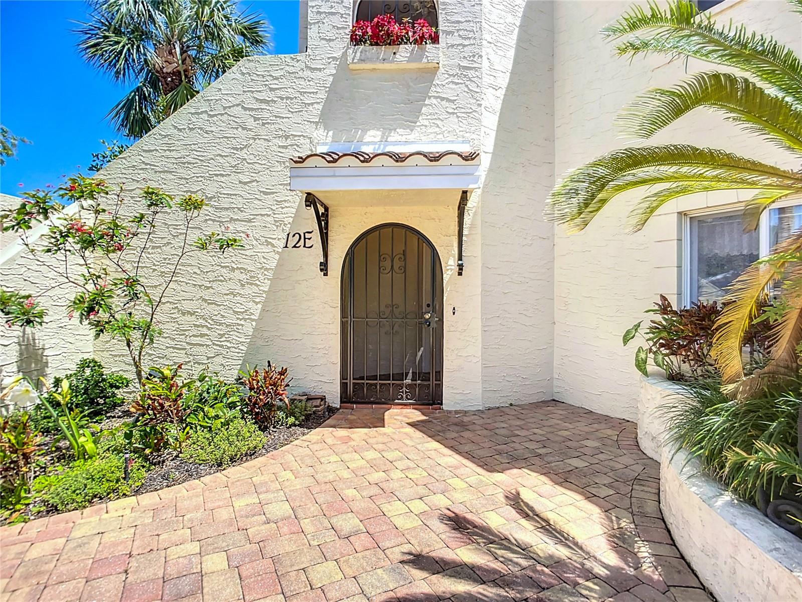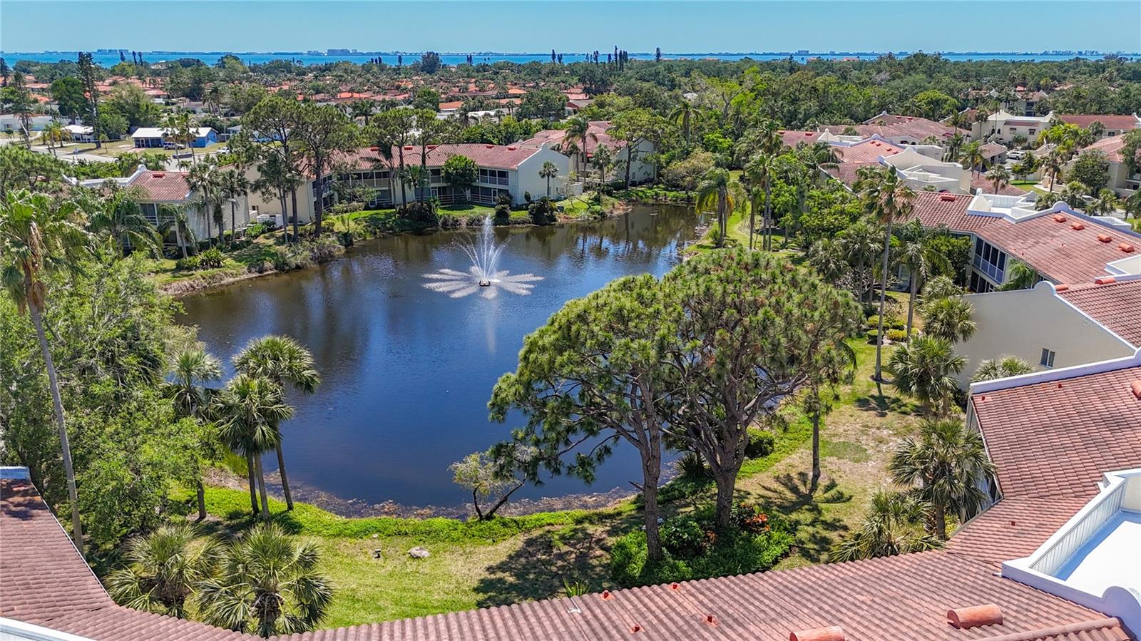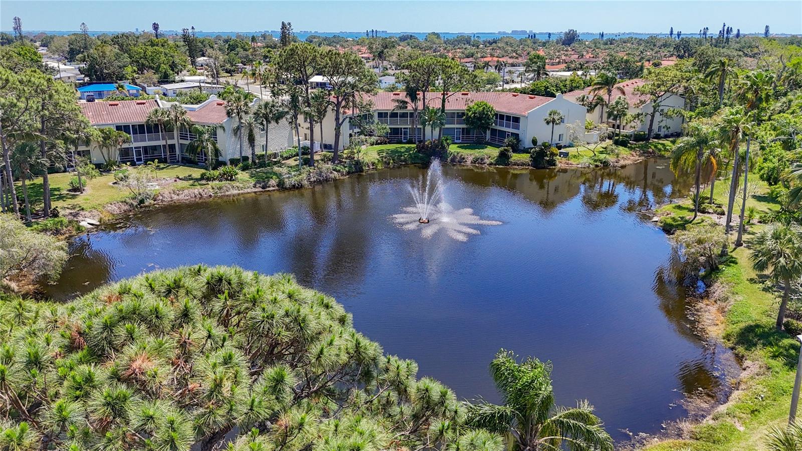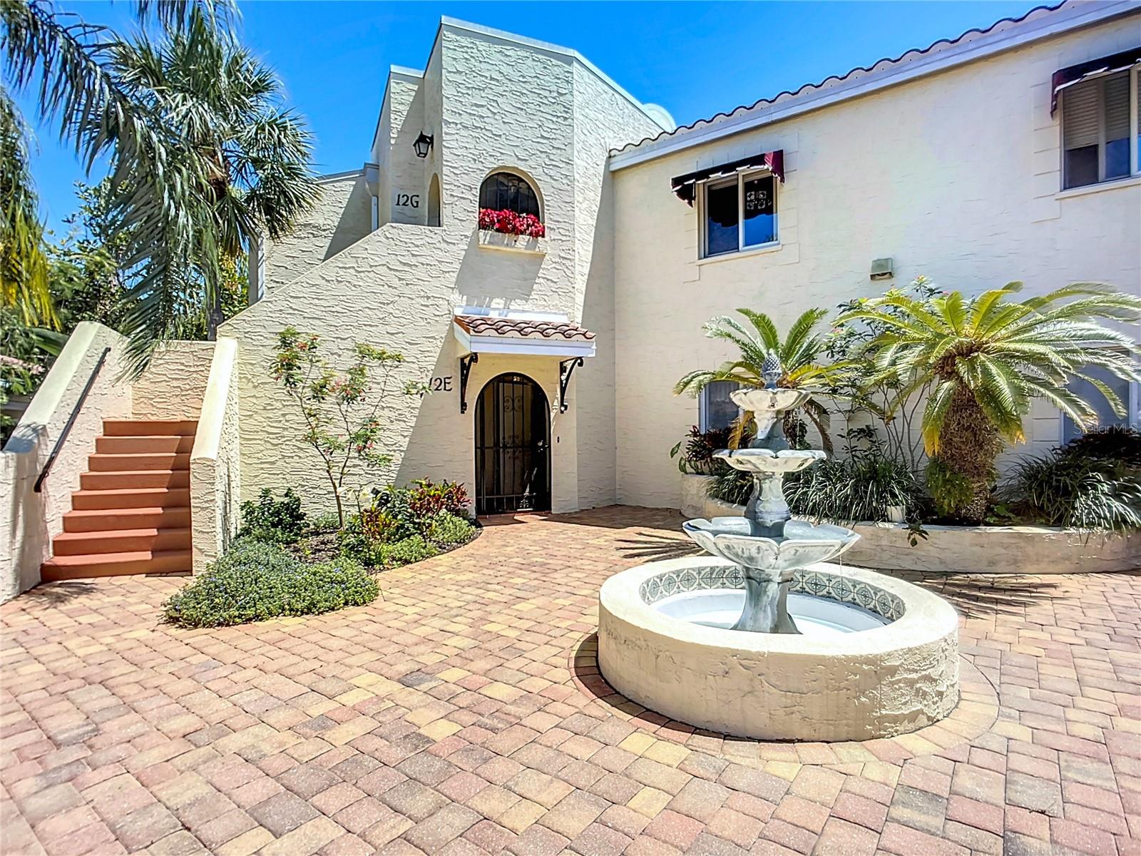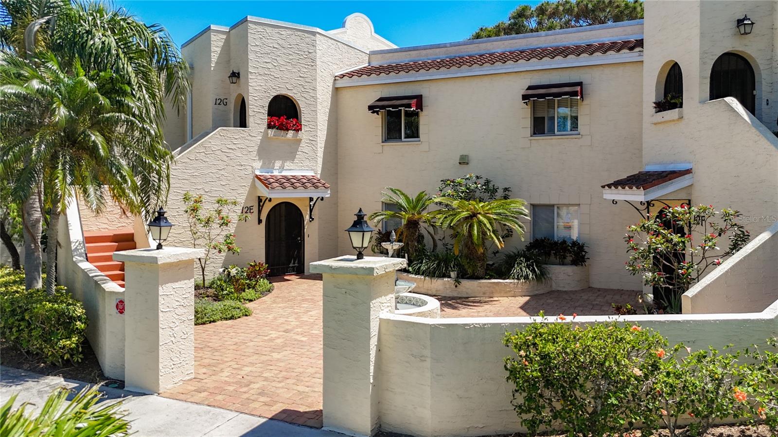 GROUND FLOOR, TURNKEY FURNISHED Spanish Mediterranean Gem with Stunning Courtyard Entry and POND VIEWS. Enter through a grand shared courtyard adorned with a water fountain, terra cotta brick pavers, and lush tropical landscaping--shared with only three other residences for an impressive sense of privacy and community. Experience the security and peace of mind that comes with living in a gated community--plus the added protection of a wrought iron gate before you even reach your front door. Double entry doors open to a spacious interior featuring LUXURY VINYL PLANK flooring and elegant CROWN MOLDING THROUGHOUT, including all three bathrooms. Newly painted, the condo also boasts a newer water heater and appliances replaced within the past five years. Enjoy peaceful pond and fountain views from nearly every angle, especially from the expansive glass and screen-enclosed Florida room. This versatile space is perfect for entertaining with a built-in grill, wine cooler, and sink. Sliding doors from the living room, dining area, and primary bedroom seamlessly connect the indoor and outdoor living spaces. The kitchen is a chef's delight with an island counter, stone tile backsplash, barstool seating and a pass-through to the breakfast bar and dining area. The adjacent dining room features stylish white built-in cabinetry for extra storage. Enjoy abundant opportunities to embrace the outdoors with the primary suite bathrooms opening to a screened, brick-paved lanai and courtyard on one side, and sliding door access to the Florida room on the other. Inside, you'll find two spacious walk-in closets and the convenience of two separate bathrooms--one featuring a charming claw-foot tub and vanity, the other with a walk-in shower. The guest bedroom also enjoys private outdoor access through sliding glass doors that lead to its own covered lanai and courtyard. A nearby guest bathroom includes a shower for added comfort. The Florida room also includes a washer and dryer tucked away in a closet with a utility sink and added shelving. Vizcaya is an active and beautifully maintained gated community featuring an Olympic-sized heated pool and spa, a clubhouse, kitchen, card room, and meeting areas. On-site management adds to the convenience. Ideally situated near IMG Academy, Sarasota-Bradenton International Airport, State College of Florida, shopping, restaurants, Bradenton Beach, and Anna Maria Island. Being Sold As-Is. Furnishings can be removed if Buyer prefers.