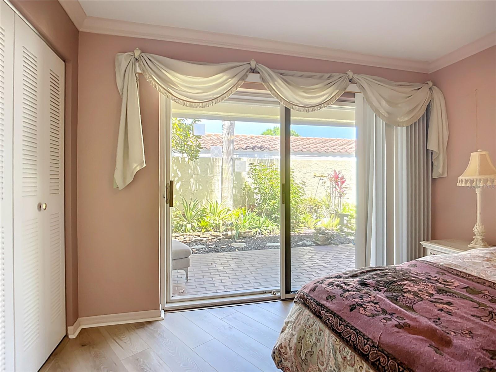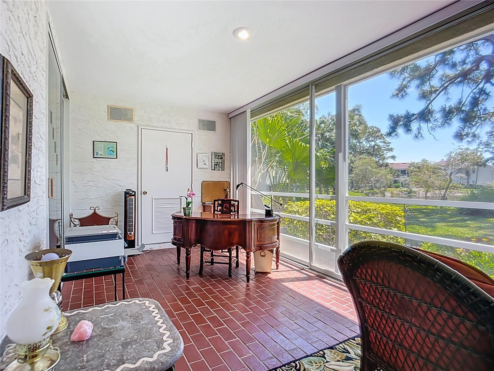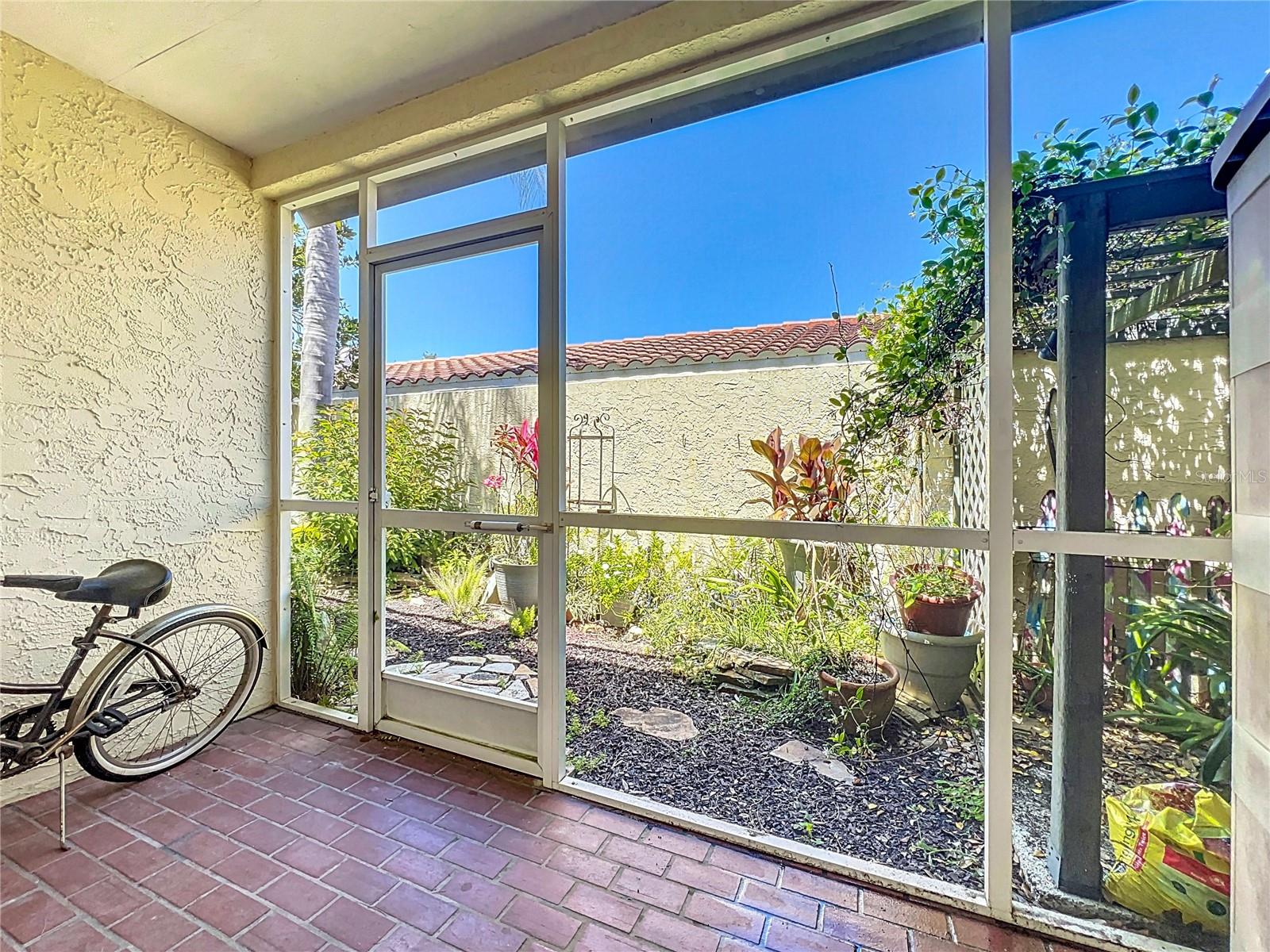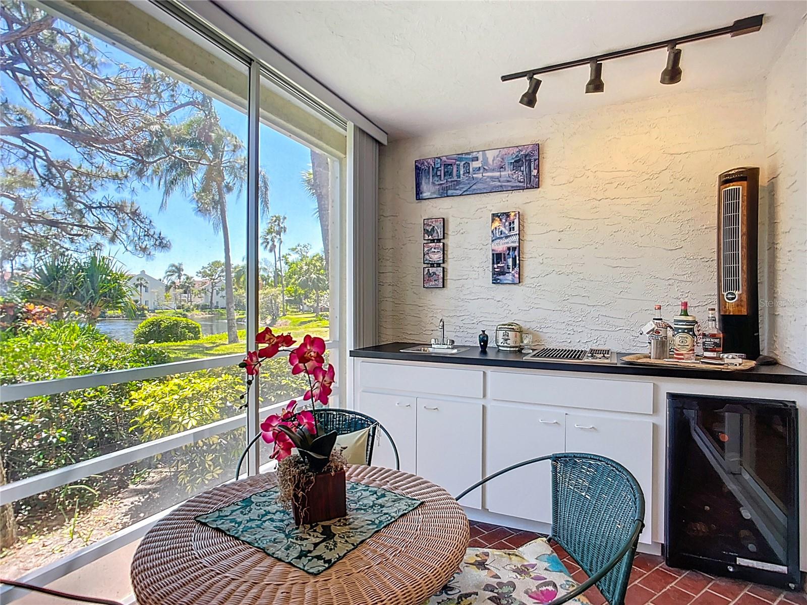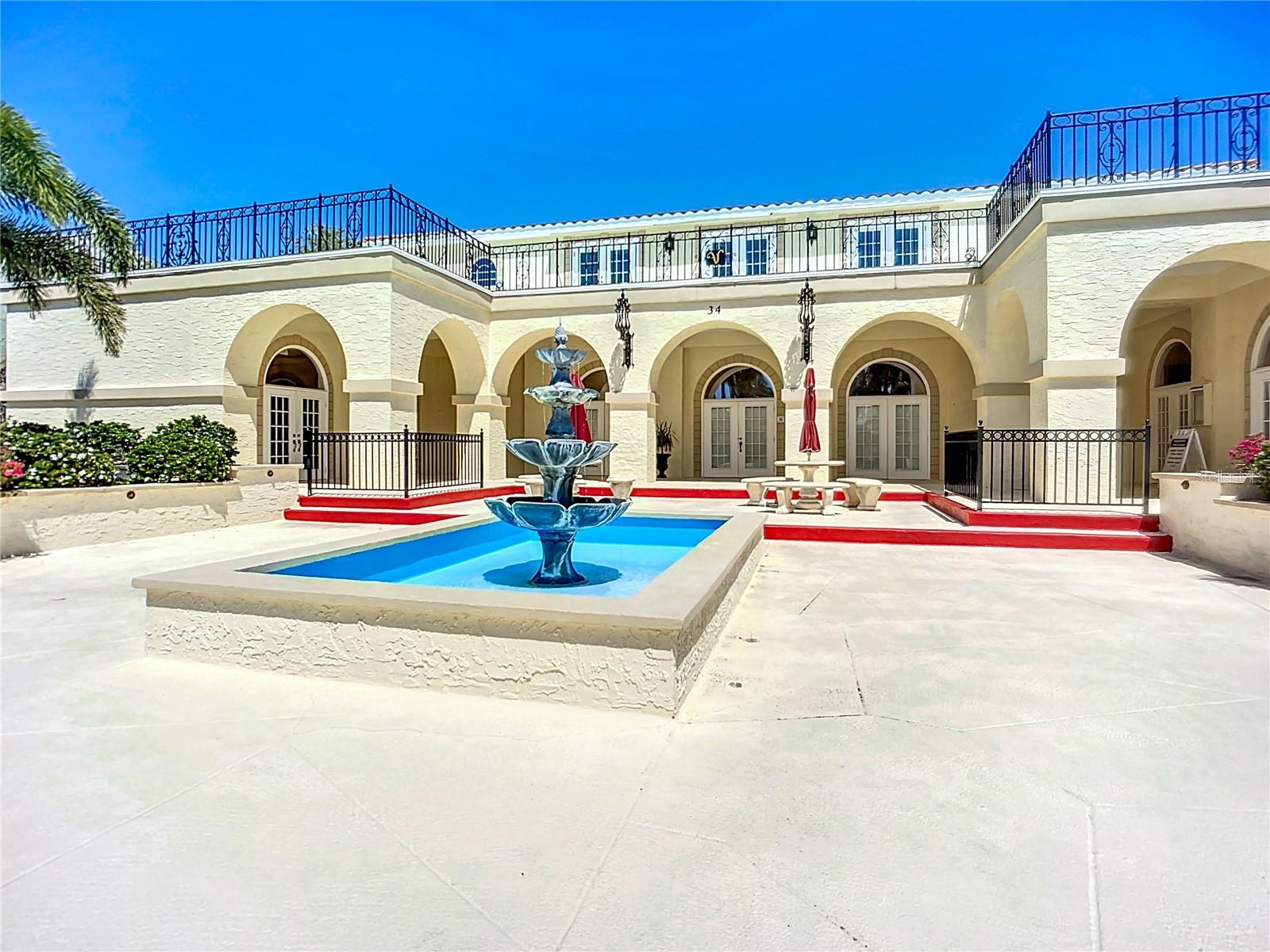 GROUND FLOOR, TURNKEY FURNISHED Spanish Mediterranean Gem with Stunning Courtyard Entry and POND VIEWS. Enter through a grand shared courtyard adorned with a water fountain, terra cotta brick pavers, and lush tropical landscaping--shared with only three other residences for an impressive sense of privacy and community. Experience the security and peace of mind that comes with living in a gated community--plus the added protection of a wrought iron gate before you even reach your front door. Double entry doors open to a spacious interior featuring LUXURY VINYL PLANK flooring and elegant CROWN MOLDING THROUGHOUT, including all three bathrooms. Newly painted, the condo also boasts a newer water heater and appliances replaced within the past five years. Enjoy peaceful pond and fountain views from nearly every angle, especially from the expansive glass and screen-enclosed Florida room. This versatile space is perfect for entertaining with a built-in grill, wine cooler, and sink. Sliding doors from the living room, dining area, and primary bedroom seamlessly connect the indoor and outdoor living spaces. The kitchen is a chef's delight with an island counter, stone tile backsplash, barstool seating and a pass-through to the breakfast bar and dining area. The adjacent dining room features stylish white built-in cabinetry for extra storage. Enjoy abundant opportunities to embrace the outdoors with the primary suite bathrooms opening to a screened, brick-paved lanai and courtyard on one side, and sliding door access to the Florida room on the other. Inside, you'll find two spacious walk-in closets and the convenience of two separate bathrooms--one featuring a charming claw-foot tub and vanity, the other with a walk-in shower. The guest bedroom also enjoys private outdoor access through sliding glass doors that lead to its own covered lanai and courtyard. A nearby guest bathroom includes a shower for added comfort. The Florida room also includes a washer and dryer tucked away in a closet with a utility sink and added shelving. Vizcaya is an active and beautifully maintained gated community featuring an Olympic-sized heated pool and spa, a clubhouse, kitchen, card room, and meeting areas. On-site management adds to the convenience. Ideally situated near IMG Academy, Sarasota-Bradenton International Airport, State College of Florida, shopping, restaurants, Bradenton Beach, and Anna Maria Island. Being Sold As-Is. Furnishings can be removed if Buyer prefers.