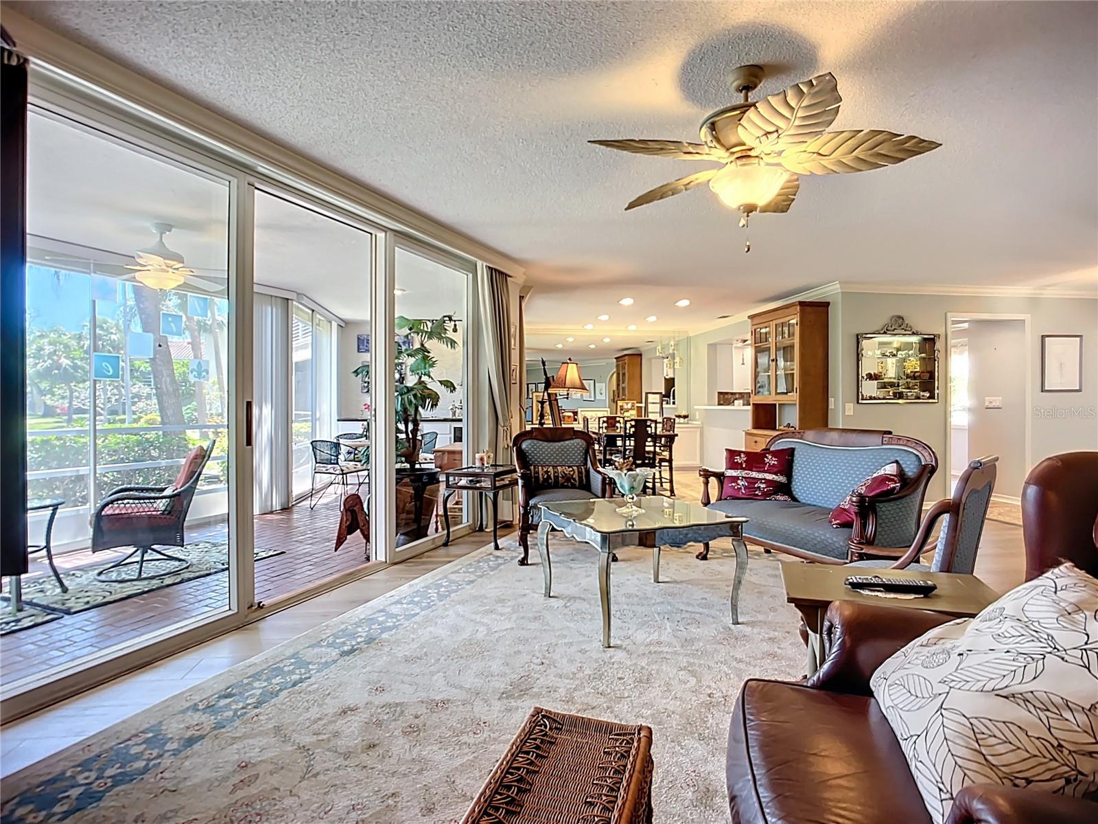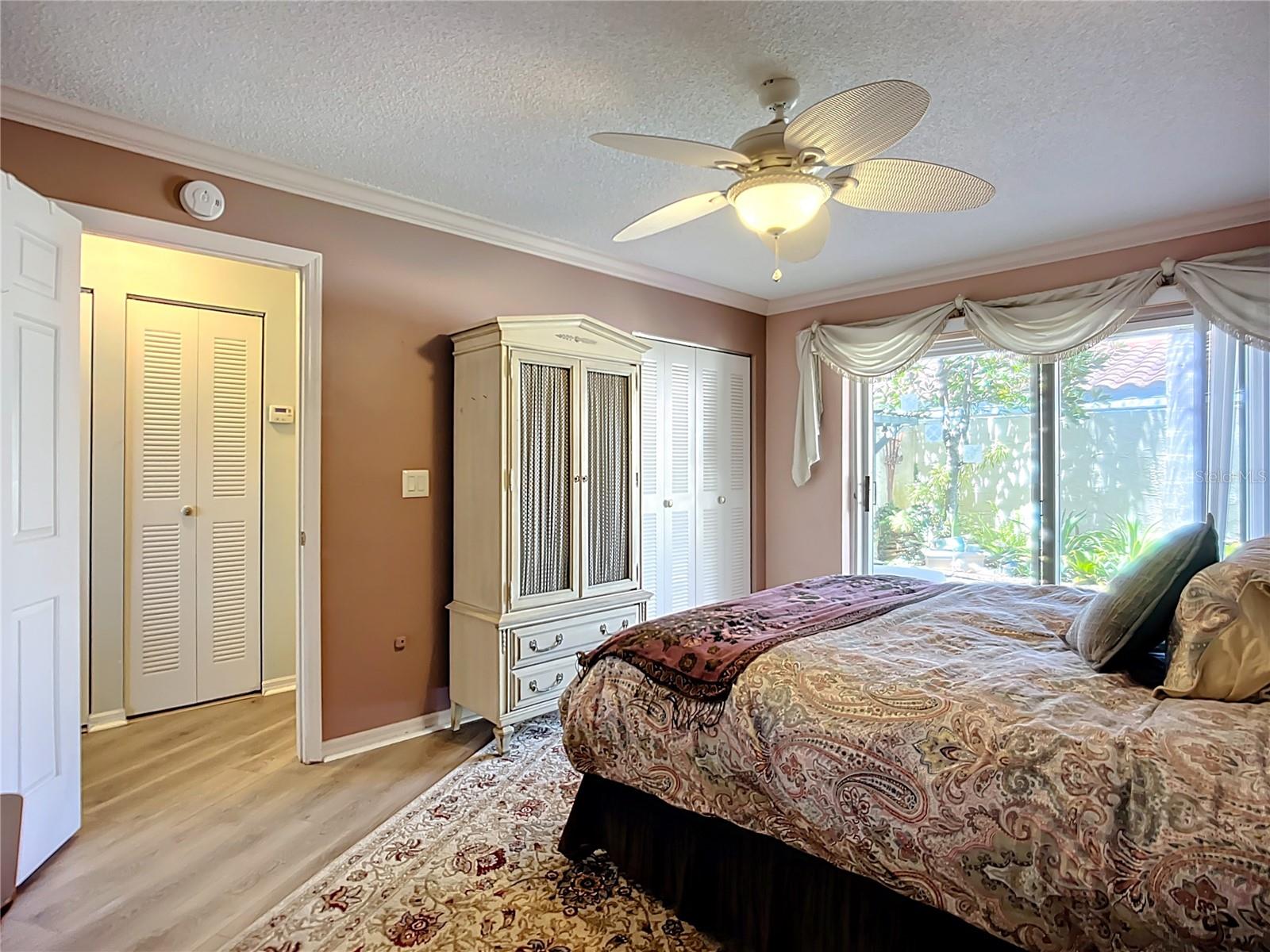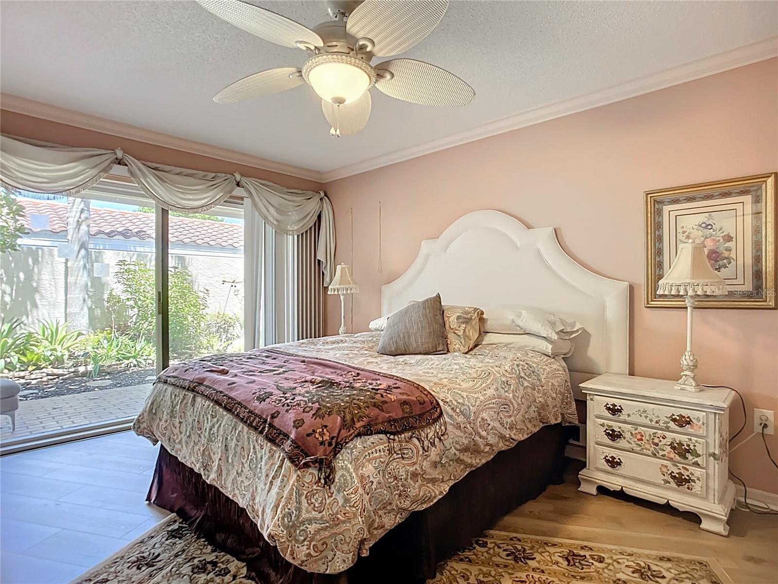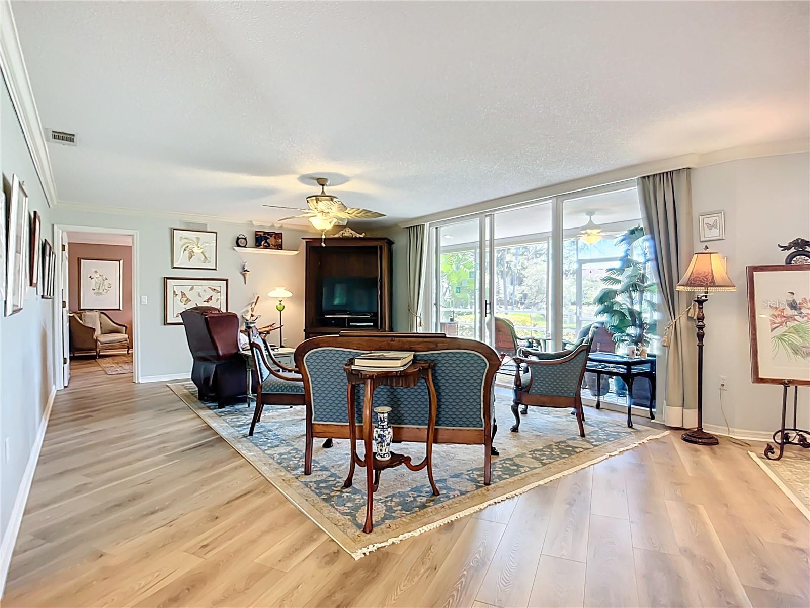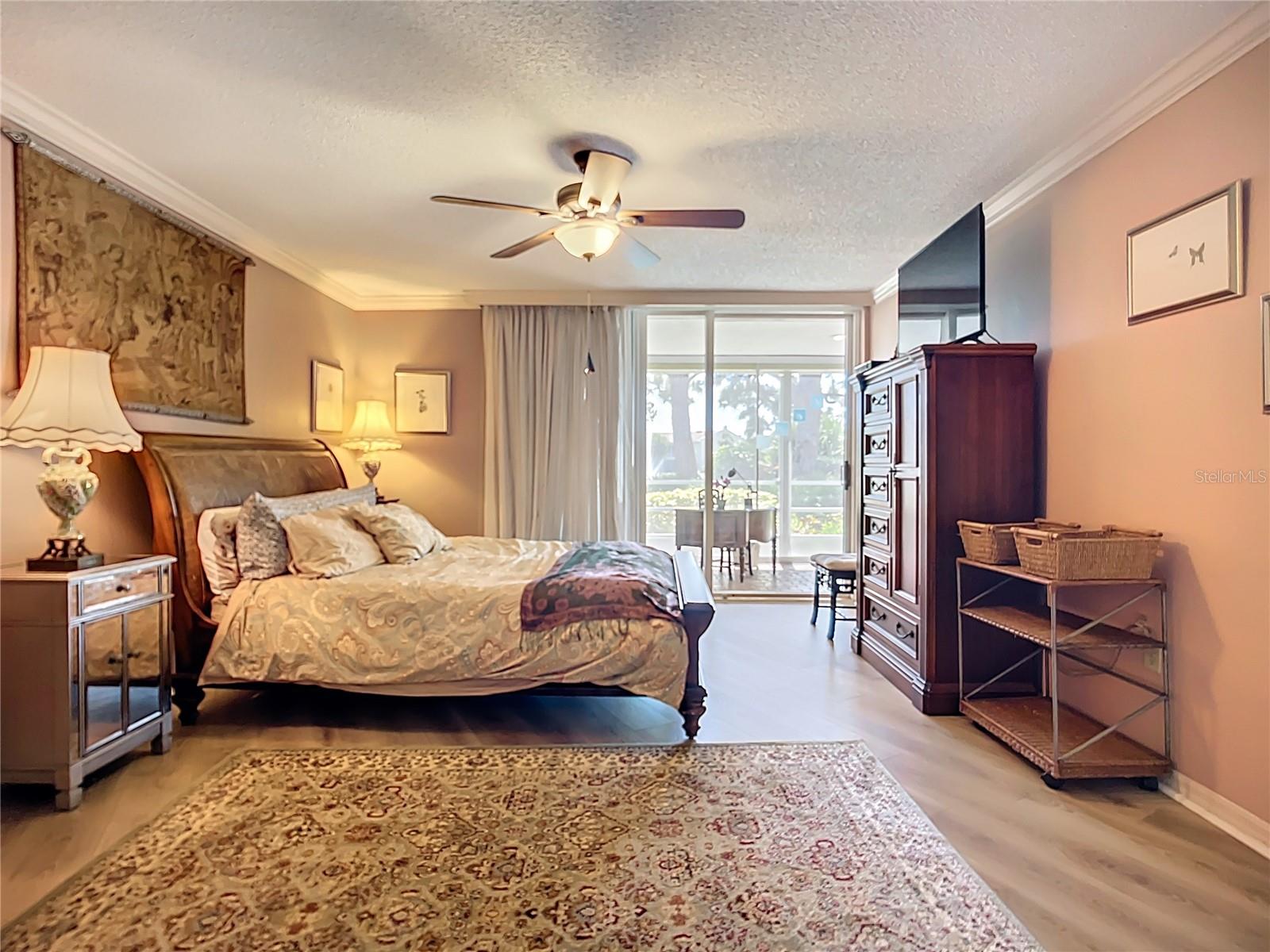 GROUND FLOOR, TURNKEY FURNISHED Spanish Mediterranean Gem with Stunning Courtyard Entry and POND VIEWS. Enter through a grand shared courtyard adorned with a water fountain, terra cotta brick pavers, and lush tropical landscaping--shared with only three other residences for an impressive sense of privacy and community. Experience the security and peace of mind that comes with living in a gated community--plus the added protection of a wrought iron gate before you even reach your front door. Double entry doors open to a spacious interior featuring LUXURY VINYL PLANK flooring and elegant CROWN MOLDING THROUGHOUT, including all three bathrooms. Newly painted, the condo also boasts a newer water heater and appliances replaced within the past five years. Enjoy peaceful pond and fountain views from nearly every angle, especially from the expansive glass and screen-enclosed Florida room. This versatile space is perfect for entertaining with a built-in grill, wine cooler, and sink. Sliding doors from the living room, dining area, and primary bedroom seamlessly connect the indoor and outdoor living spaces. The kitchen is a chef's delight with an island counter, stone tile backsplash, barstool seating and a pass-through to the breakfast bar and dining area. The adjacent dining room features stylish white built-in cabinetry for extra storage. Enjoy abundant opportunities to embrace the outdoors with the primary suite bathrooms opening to a screened, brick-paved lanai and courtyard on one side, and sliding door access to the Florida room on the other. Inside, you'll find two spacious walk-in closets and the convenience of two separate bathrooms--one featuring a charming claw-foot tub and vanity, the other with a walk-in shower. The guest bedroom also enjoys private outdoor access through sliding glass doors that lead to its own covered lanai and courtyard. A nearby guest bathroom includes a shower for added comfort. The Florida room also includes a washer and dryer tucked away in a closet with a utility sink and added shelving. Vizcaya is an active and beautifully maintained gated community featuring an Olympic-sized heated pool and spa, a clubhouse, kitchen, card room, and meeting areas. On-site management adds to the convenience. Ideally situated near IMG Academy, Sarasota-Bradenton International Airport, State College of Florida, shopping, restaurants, Bradenton Beach, and Anna Maria Island. Being Sold As-Is. Furnishings can be removed if Buyer prefers.