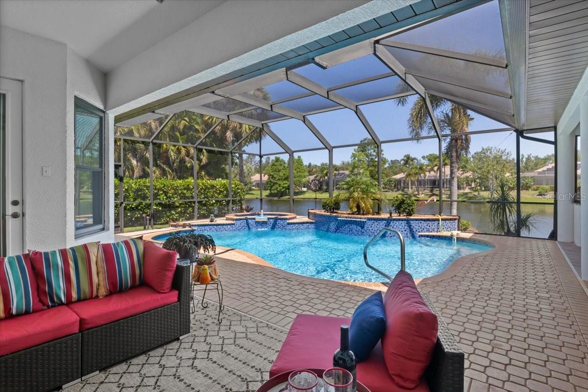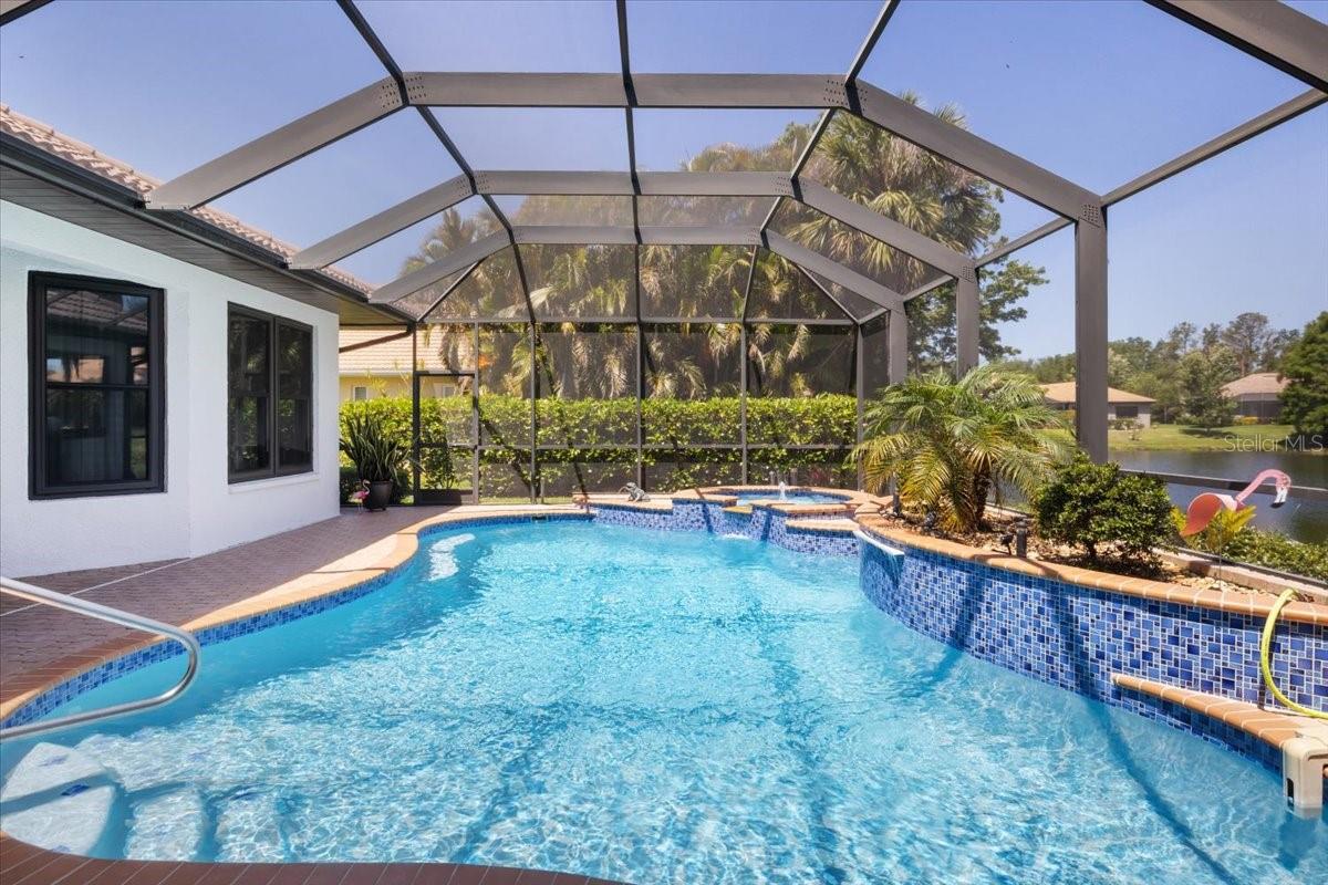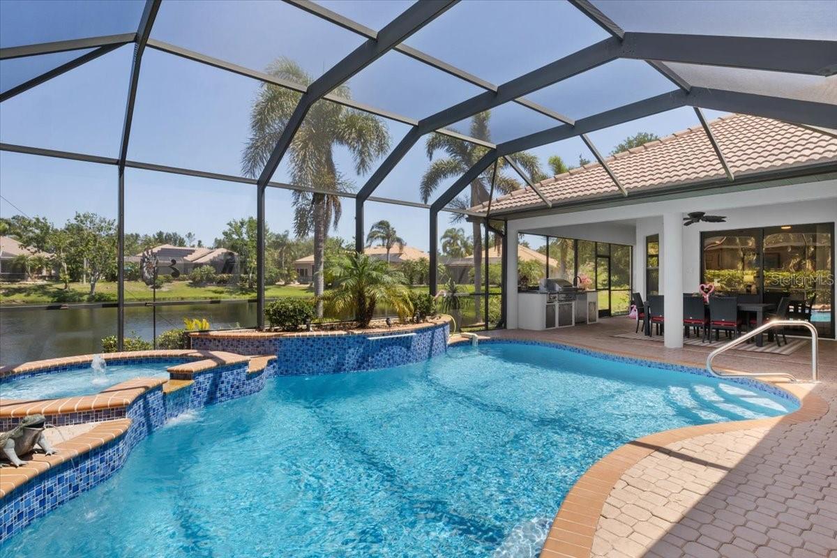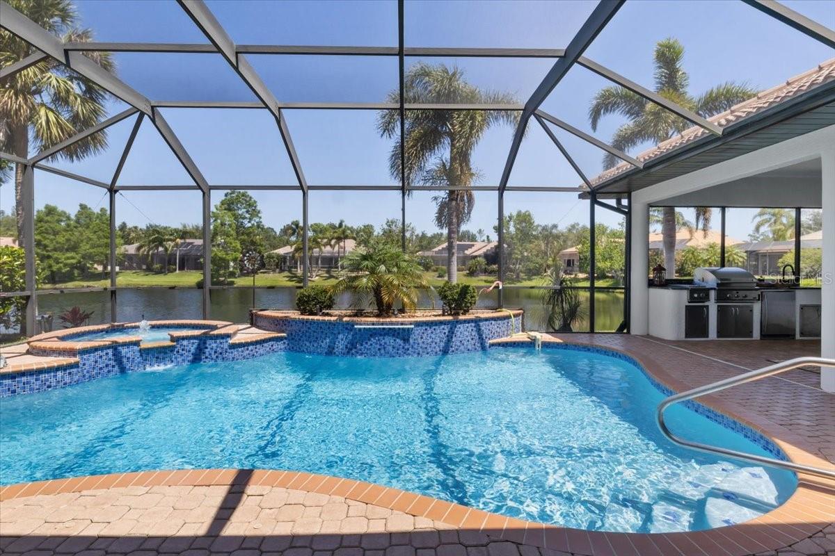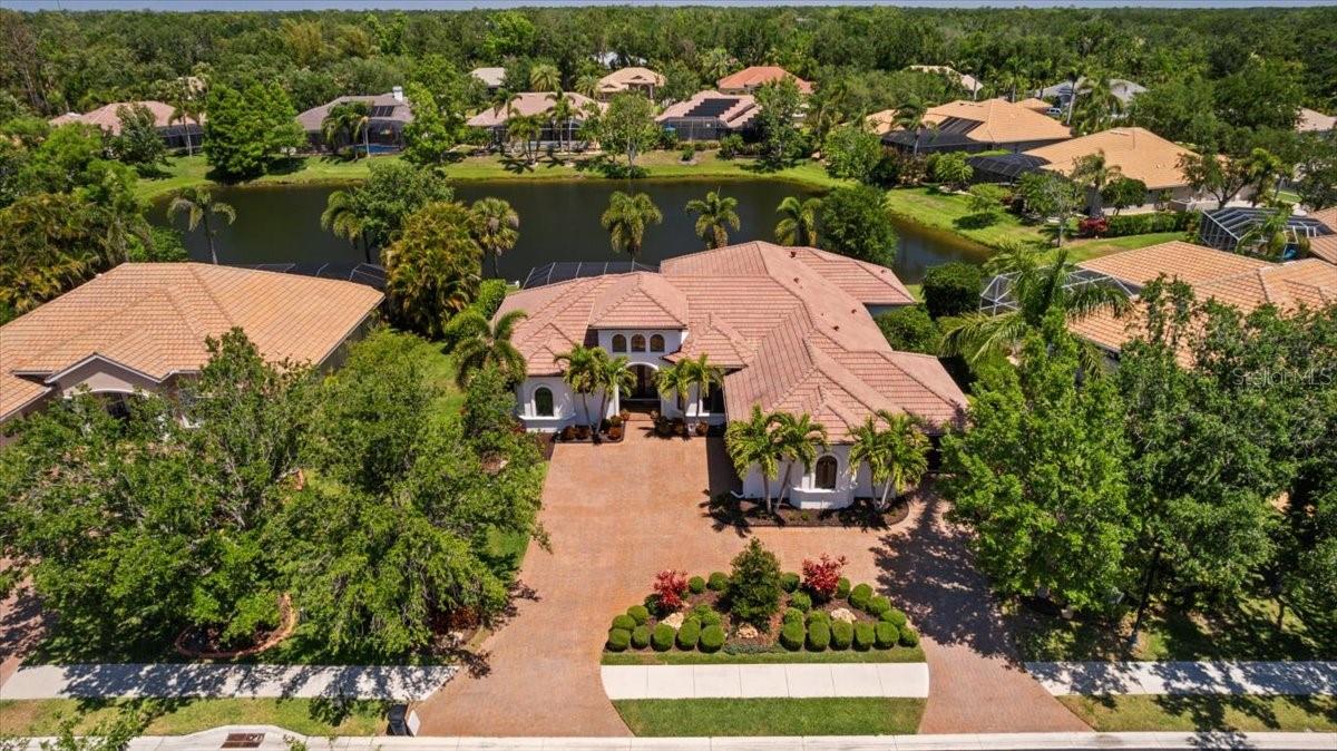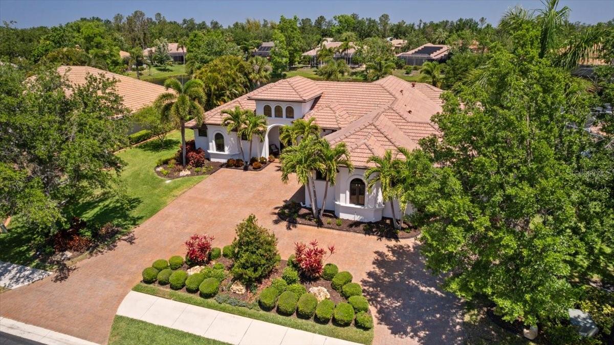 Tucked away on a private interior street off the main thoroughfare, sets this house up to be your private enclave! Located near THE ISLANDS ON THE MANATEE and mirroring the style and feel of the Island's Spanish Colonial homes, this home provides all the feels without the pricetag, flood zone and extra HOA fees! As you enter the front door, you will be drawn to the EXPANSIVE LAKE VIEW that is maximized throughout the home. The large lanai encompasses two covered entertaining areas, your competely resurfaced and retiled pool & spa (2025), and waterside summer kitchen. This 3,396 sq ft, FOUR BEDROOM (all with walk-in closets), FOUR BATHROOM floorplan blends function and livability with just the right mix of casual and formal spaces. The kitchen and family room areas are highlighted by the panoramic views of the pool, spa and lake providing the perfect casual entertaining ambiance. The kitchen features all new stainless steel appliances with double ovens, induction cooktop and walk-in pantry. The primary bedroom is huge and features a large tray ceiling with ambiant lighting, two walk-in closets, a gorgeous ensuite bath with spa tub, dual sinks and private toilet room with a bidet. The right side of the house contains two bedrooms with an adjoining bathroom and a dry bar that serves the dining room and right wing of the home. There is a bonus room with a wet bar (that could easily be turned into a kitchenette with the addition of a microwave), full bath and private bedroom that could serve as a MOTHER-IN-LAW suite located just beyond the family room. The THREE-CAR garage is oversized with over 900 sq ft of space. The exterior of the home is beautifully landscaped, has dusk to dawn lighting and crisp curbing. Notable upgrades include: IMPACT WINDOWS (9 windows) AND A HURRICANE SCREEN PACKAGE on rest of windows, NEW ROOF ($86,000) being installed May 2025), new energy-saving variable-speed pool pump and a 250-gallon in ground propane tank that supplies the pool heater and outdoor grill. RW is an established community with winding, tree-lined streets with tall oaks and mature landscaping. Walkers, bikers and neighbors walking their dogs set the scene for an active and social community. The Club offers golf, tennis, social activities, pickle ball, pool and more. The community can dine at the club without a membership. Various golf memberships available. Fitness pass to all amenities (except golf) available for $100 ind./$150 month family. Boat and RV storage in community. For the nature lovers, there are hiking trails and abundant wildlife. There are two 24-hour manned gates. There is a COMMUNITY BOAT RAMP that is open to the entire community and provides direct access to the Manatee River. RW is PERFECTLY LOCATED! Strategically positioned between St. Pete and Sarasota provides easy access to 2 airports (45 min.) and several hospitals to the north and south. The newly constructed Ft Hammer Park located on the beautiful Manatee River is just minutes south of the front gate and features a boat ramp, fishing pier plus picnic pavilion. Lakewood Ranch and Sarasota are near-by where fine dining and shopping are within easy reach. The very popular Ellenton Outlet Mall offers designer brands at discount prices and is only 10 min away. A new shopping complex is open offering Lowes, HomeGoods, and nail spa well as several other stores and restaurants. No trucks in driveway overnight in RW. SF to be verified by Buyer/Agents. Fireplace is decorative.