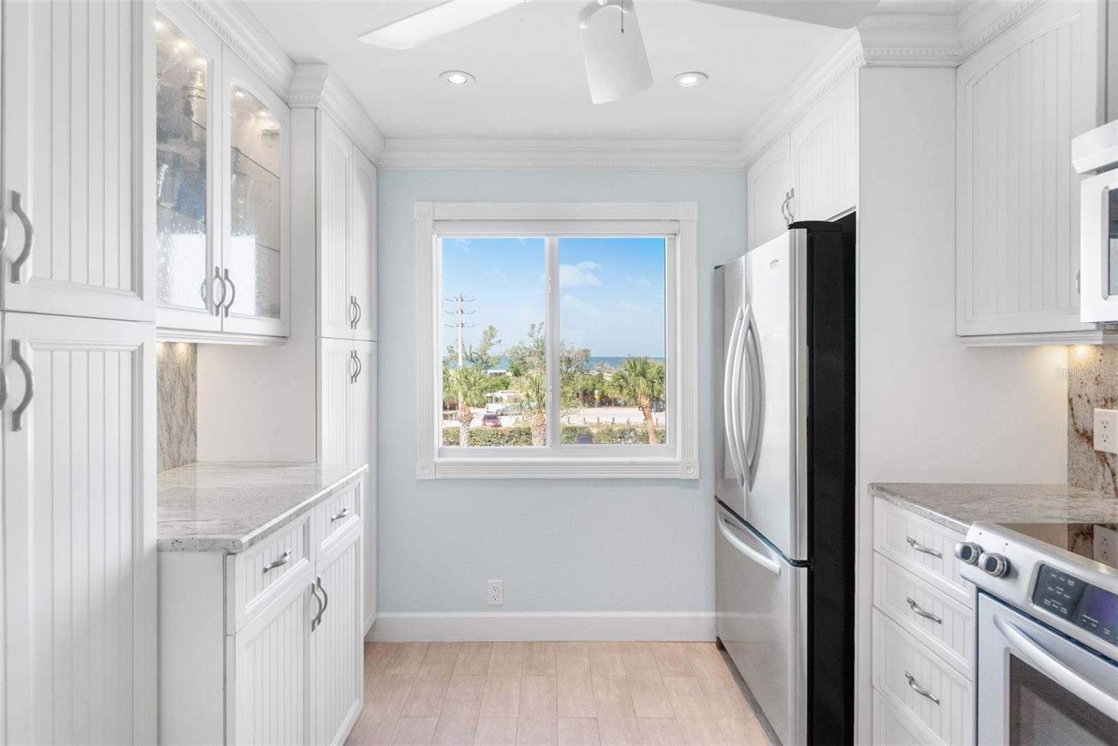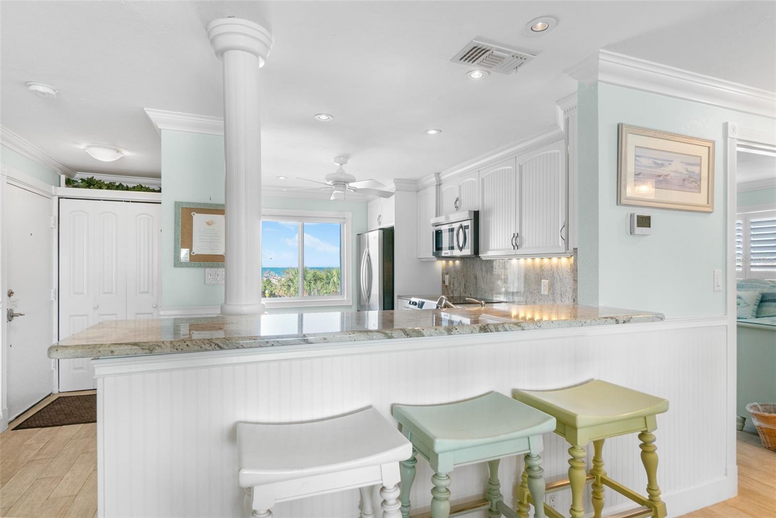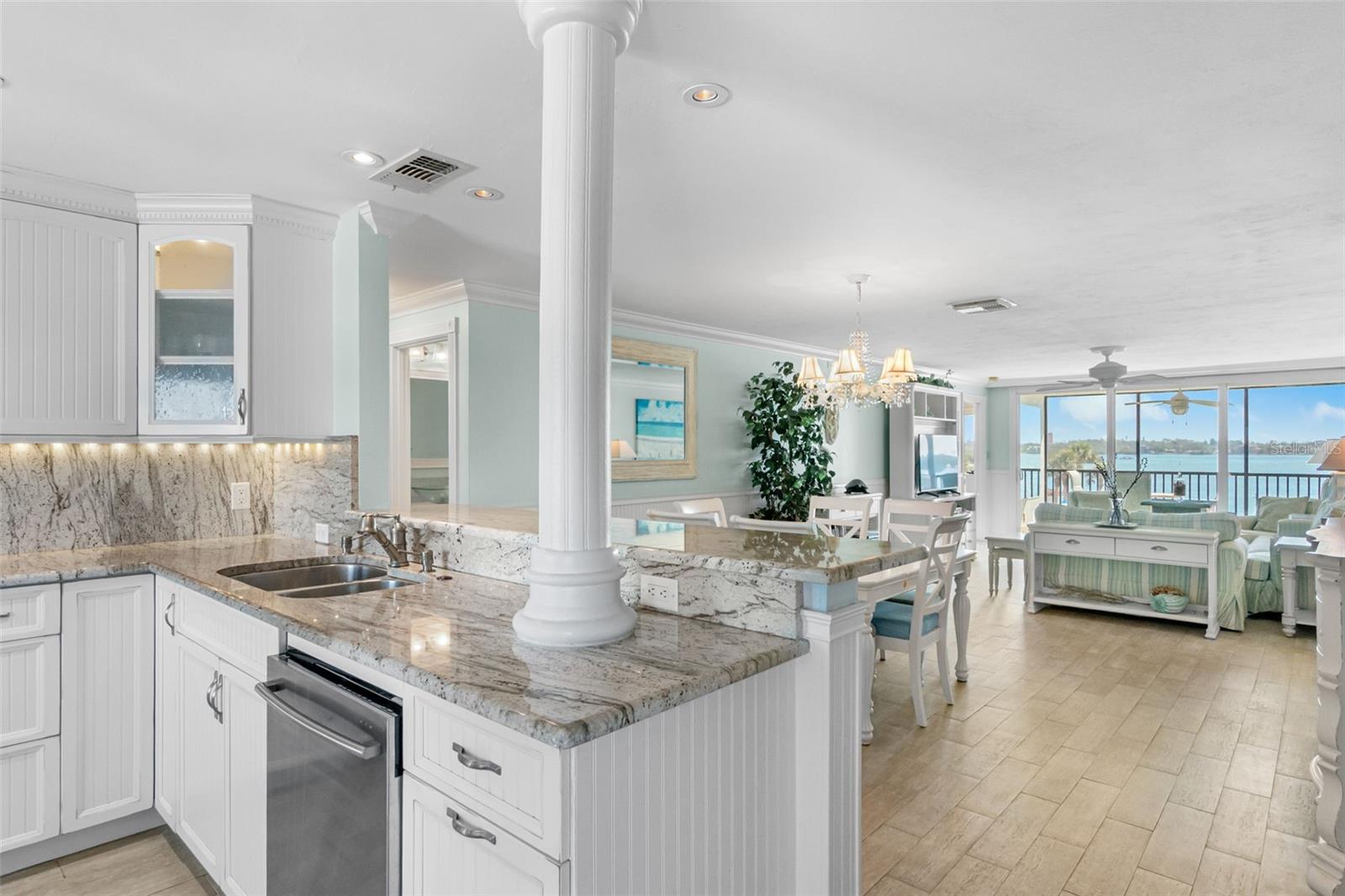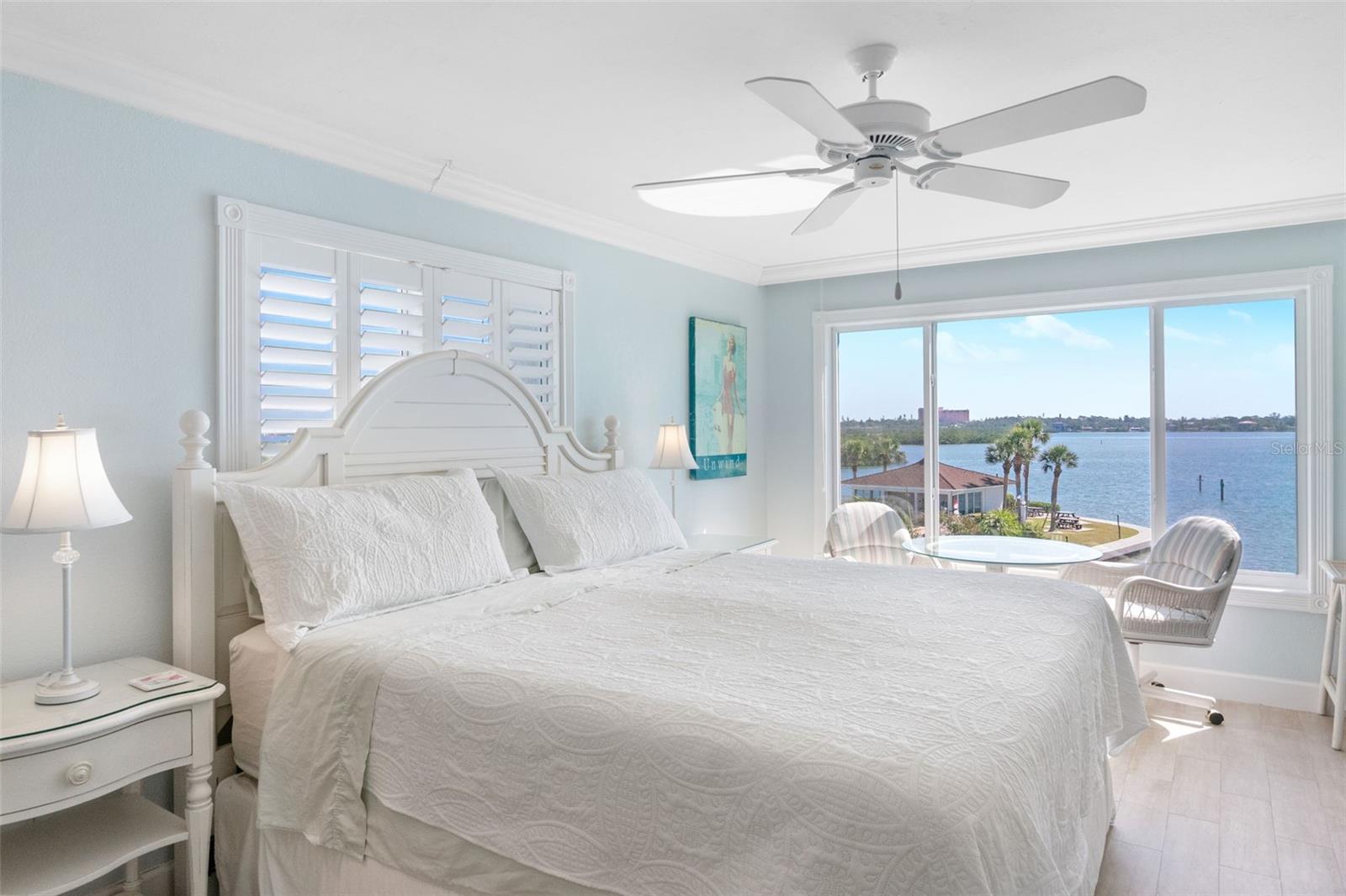 Embrace waterfront living in this end-unitresidence in SunriseCove, an updated, turnkey-furnished 2-bed/2-bath condo offering 1,228 sq ft of coastal style, just one shared wall, tile flooring and crown molding throughout, abundant closets, and a coveted in-unit washer-dryer. The granite kitchen features high-end stainless appliances, two pantries, and generous cabinetry, while impact-rated windows, plantation-shuttered in both bedrooms, capture spectacular sunrise panoramas over Little Sarasota Bay from the living area and screened lanai and serene sunset Gulf views from the kitchen and guest suite. Extra end-unit windows flood the primary suite and guest room with light; newer systems include an HVAC (2022) and water heater (2021). Community highlights: two heated pools (one Olympic length), lighted tennis/pickleball courts, a freshly renovated clubhouse, fitness and game rooms, barbecue area, kayak launch and optional boat docks, all tended by an on-site crew Monday, Friday, with a funded assessment for new roofs, carports, and dock upgrades under way. On-site management supports 30-day rentals for effortless income potential, while Turtle Beach, three restaurants, and the free Siesta Key Breeze trolley are just steps from your door, delivering the complete island lifestyle and an investment opportunity in one.