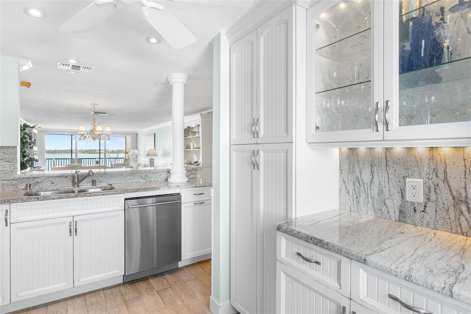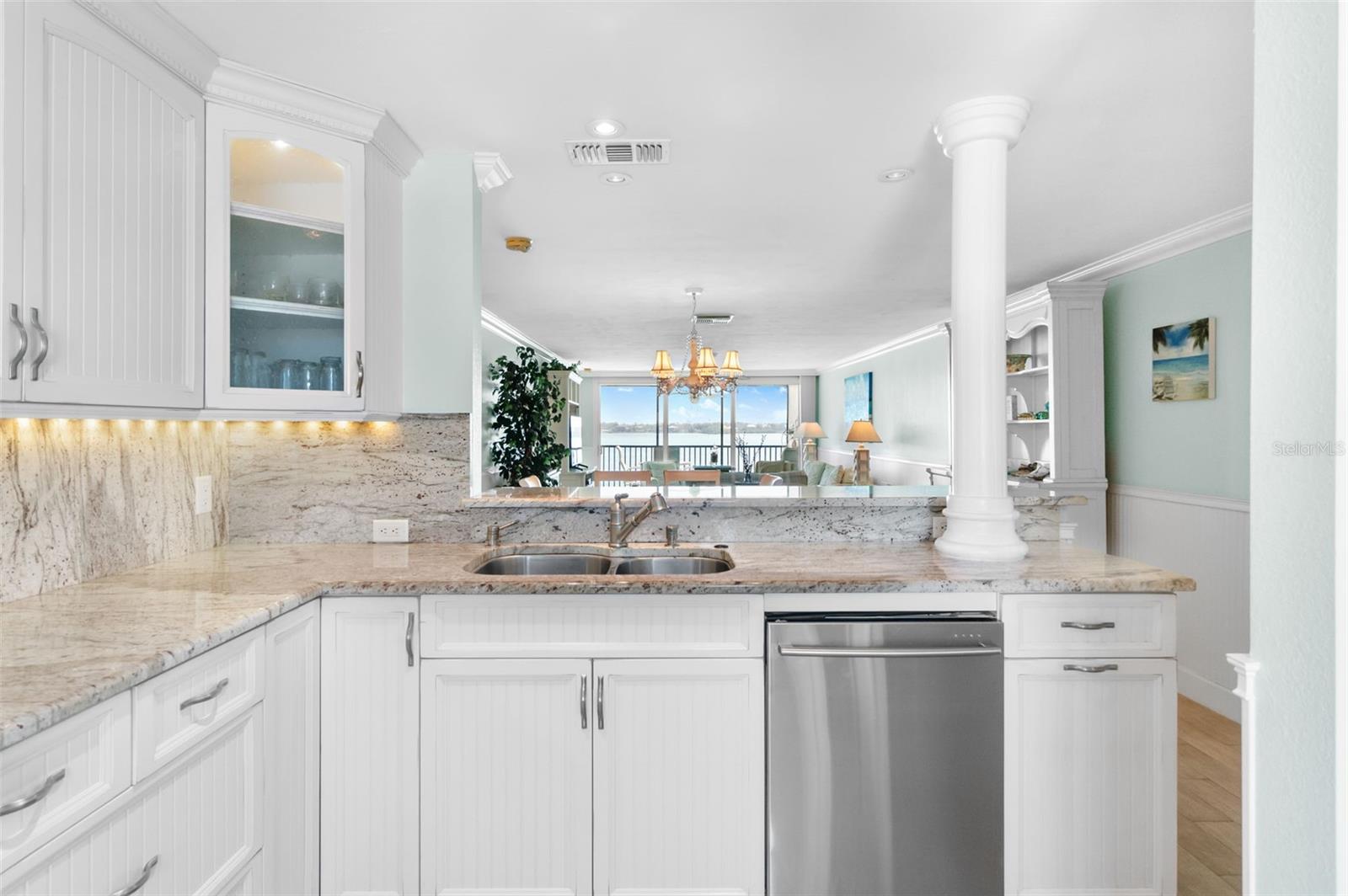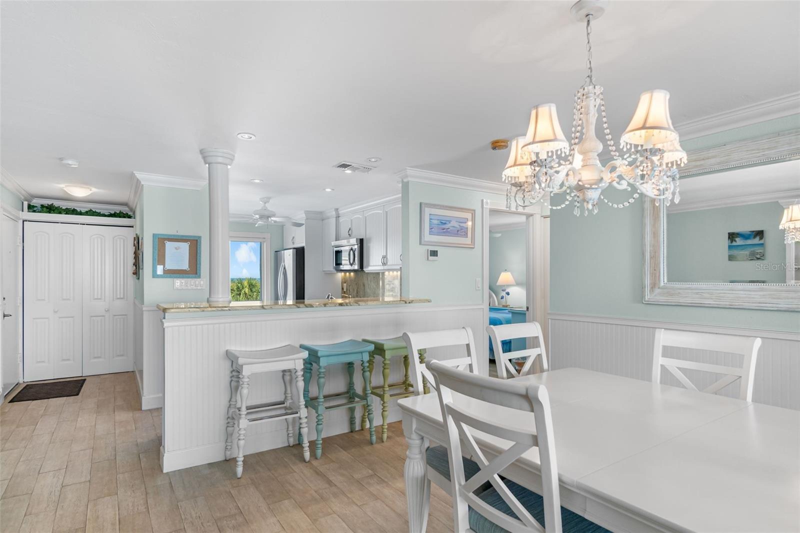 Embrace waterfront living in this end-unitresidence in SunriseCove, an updated, turnkey-furnished 2-bed/2-bath condo offering 1,228 sq ft of coastal style, just one shared wall, tile flooring and crown molding throughout, abundant closets, and a coveted in-unit washer-dryer. The granite kitchen features high-end stainless appliances, two pantries, and generous cabinetry, while impact-rated windows, plantation-shuttered in both bedrooms, capture spectacular sunrise panoramas over Little Sarasota Bay from the living area and screened lanai and serene sunset Gulf views from the kitchen and guest suite. Extra end-unit windows flood the primary suite and guest room with light; newer systems include an HVAC (2022) and water heater (2021). Community highlights: two heated pools (one Olympic length), lighted tennis/pickleball courts, a freshly renovated clubhouse, fitness and game rooms, barbecue area, kayak launch and optional boat docks, all tended by an on-site crew Monday, Friday, with a funded assessment for new roofs, carports, and dock upgrades under way. On-site management supports 30-day rentals for effortless income potential, while Turtle Beach, three restaurants, and the free Siesta Key Breeze trolley are just steps from your door, delivering the complete island lifestyle and an investment opportunity in one.