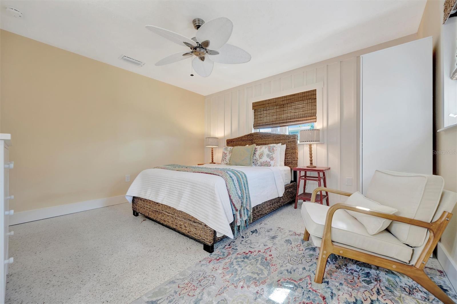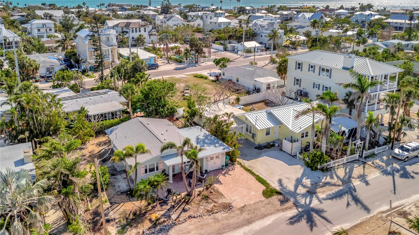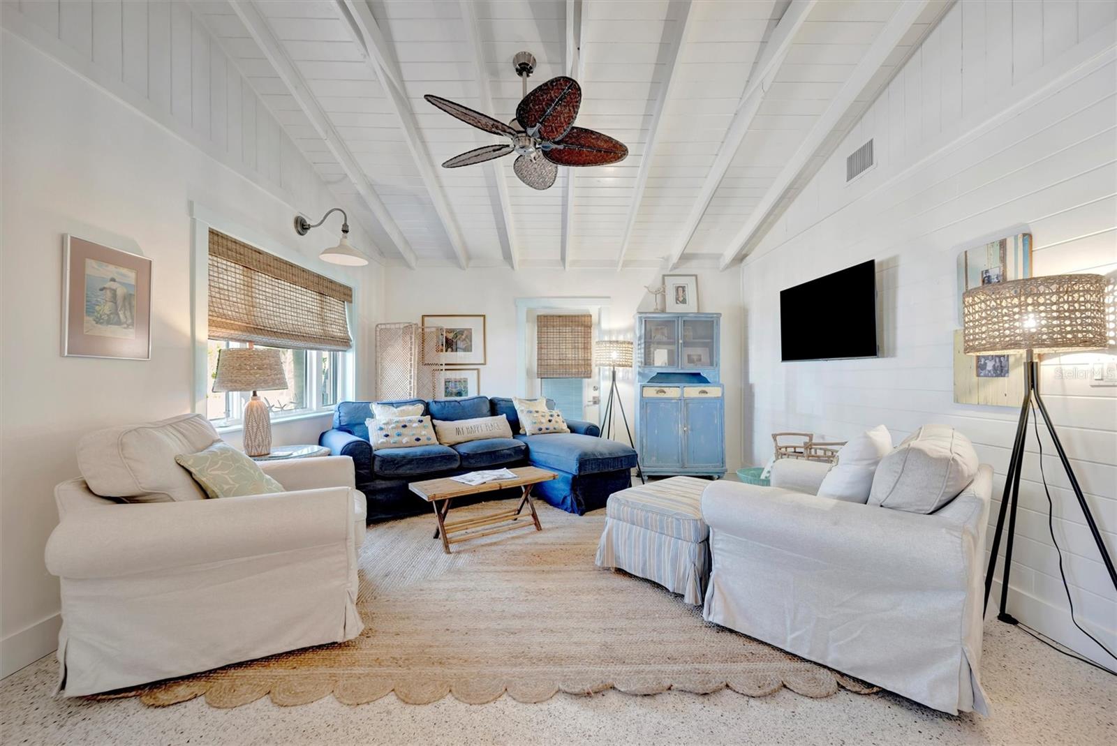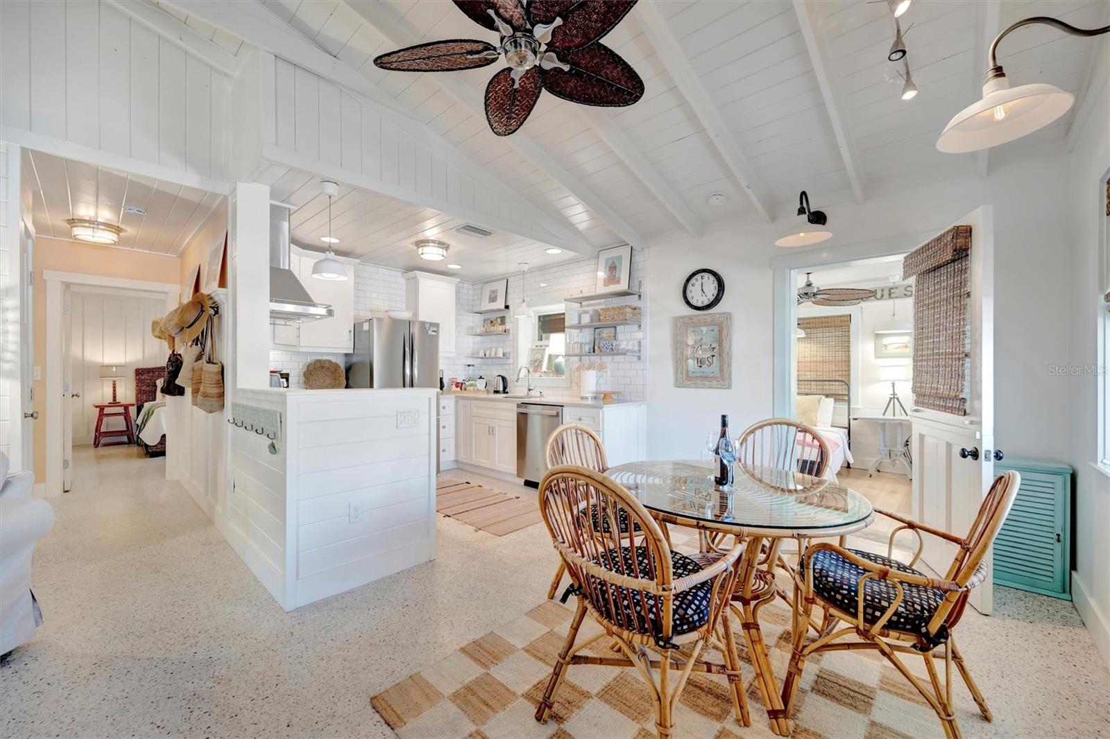 Welcome to Barefoot Gypsy -- a cozy Anna Maria Island cottage bursting with character and located directly across from Tampa Bay on the coveted north end of Anna Maria Island. Completely renovated after Hurricane Helene including NEW ROOF, NEW AC, all new cabinets, appliances, and furnishings, this charming coastal retreat combines timeless charm with modern upgrades. Updated with a professional re-design, the home features vaulted ceilings adorned with reclaimed wood planks from a historic Bean Point home. Gleaming original terrazzo floors flow throughout the cottage, adding authentic Florida charm. The kitchen is thoughtfully designed with quartz countertops, subway tile backsplash, custom built-ins, and brand-new stainless-steel appliances -- perfect for casual beachside entertaining. The home offers two queen-sized bedrooms...one with an en-suite bathroom, and a spacious hall bath complete with separate tub and shower. An additional third bedroom was added in 2017 and features two twin beds along with a full-size washer/dryer and closet area. With its eclectic, beachy flair, this turnkey-furnished home (with some exclusions) is currently part of a successful rental program. There's even room for a pool! Just bring your flip-flops and start living the island dream.