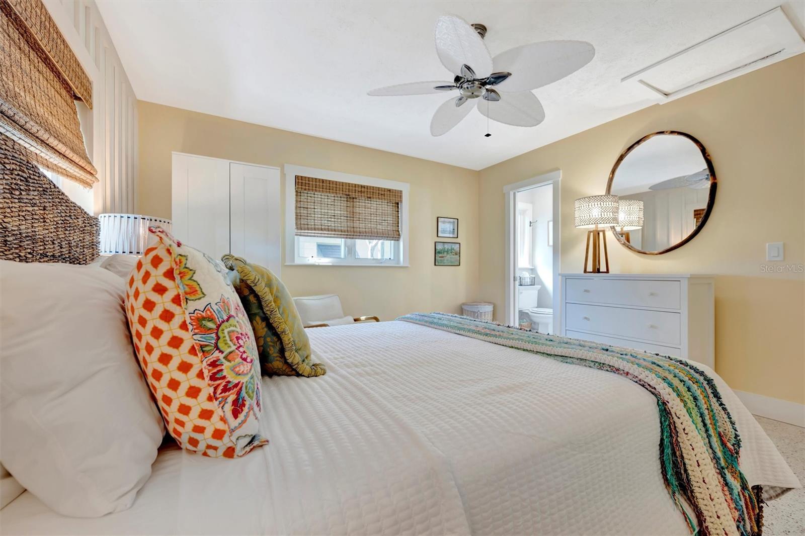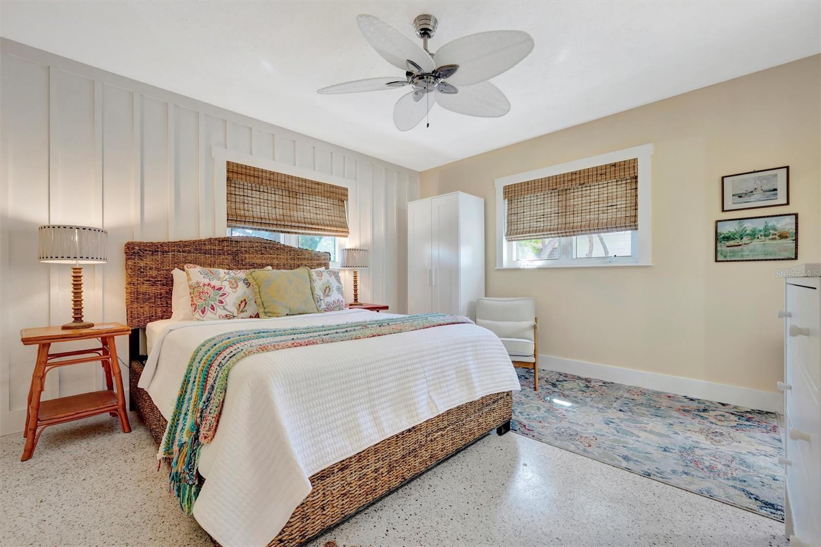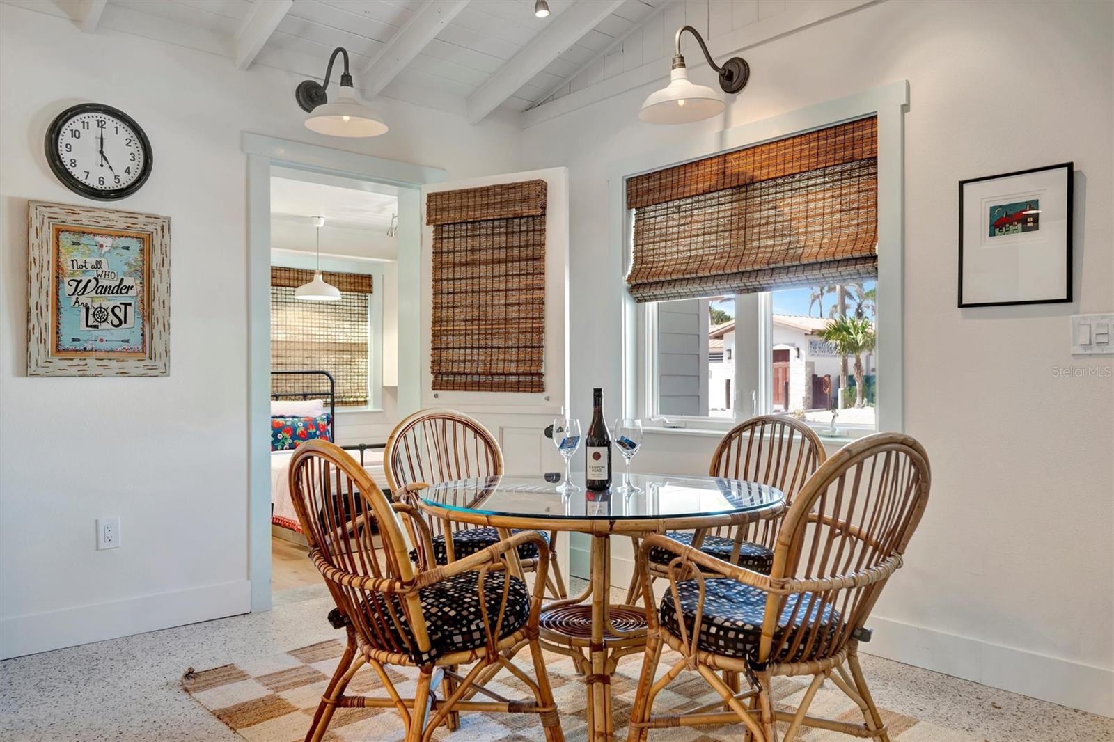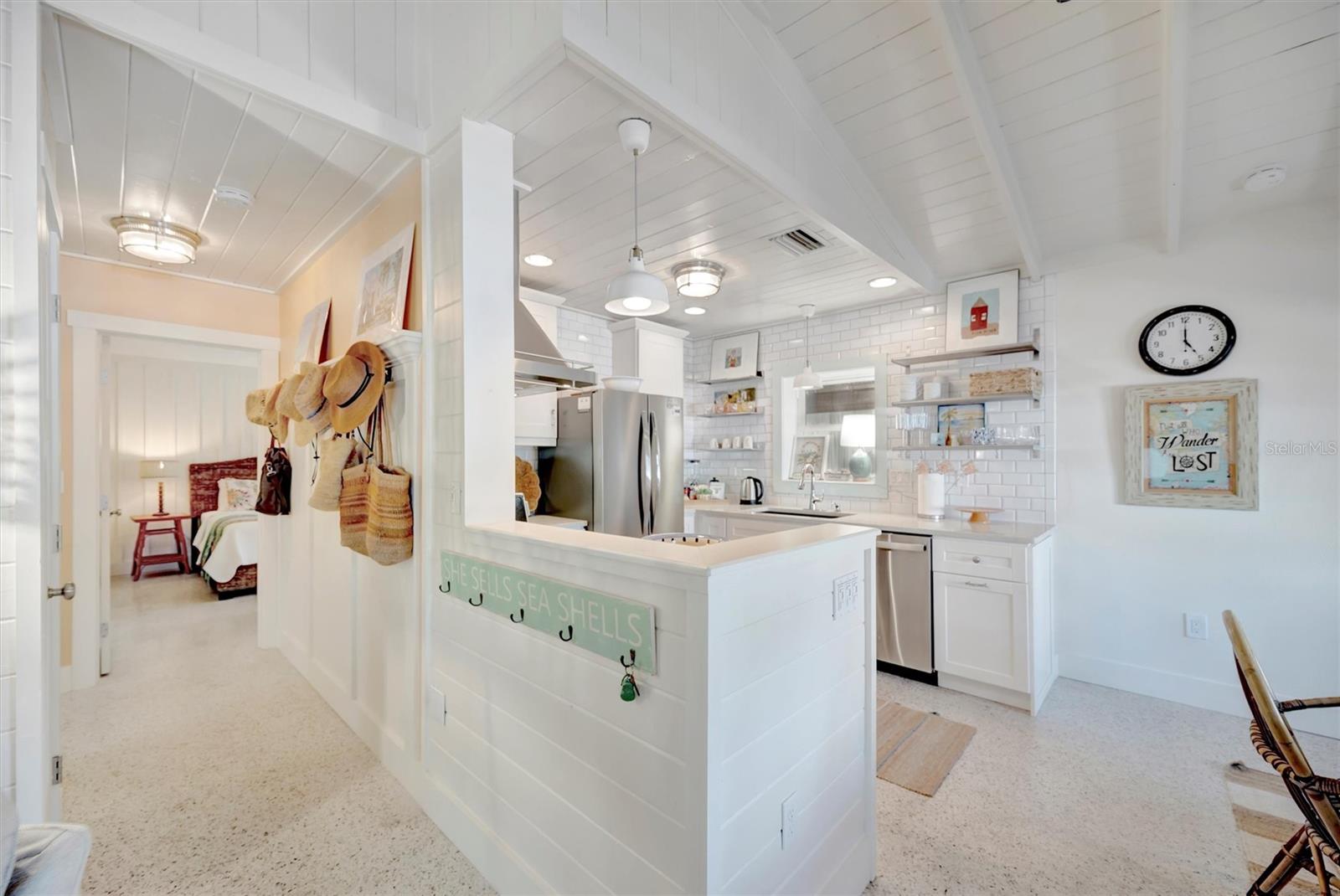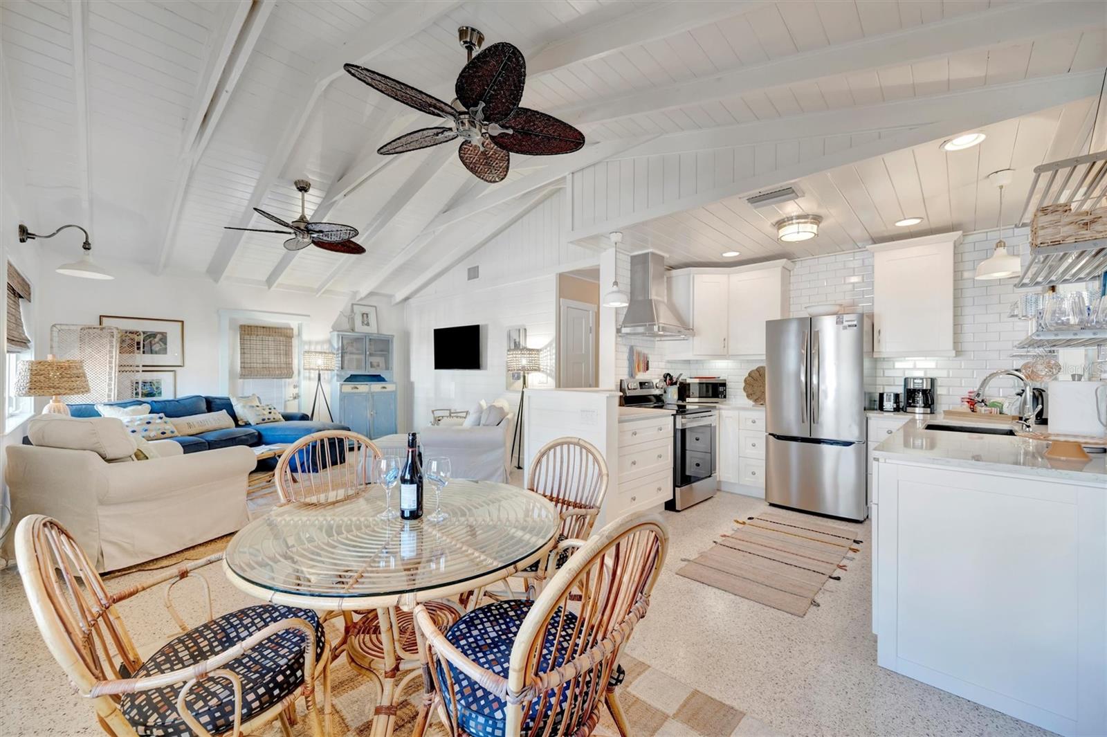 Welcome to Barefoot Gypsy -- a cozy Anna Maria Island cottage bursting with character and located directly across from Tampa Bay on the coveted north end of Anna Maria Island. Completely renovated after Hurricane Helene including NEW ROOF, NEW AC, all new cabinets, appliances, and furnishings, this charming coastal retreat combines timeless charm with modern upgrades. Updated with a professional re-design, the home features vaulted ceilings adorned with reclaimed wood planks from a historic Bean Point home. Gleaming original terrazzo floors flow throughout the cottage, adding authentic Florida charm. The kitchen is thoughtfully designed with quartz countertops, subway tile backsplash, custom built-ins, and brand-new stainless-steel appliances -- perfect for casual beachside entertaining. The home offers two queen-sized bedrooms...one with an en-suite bathroom, and a spacious hall bath complete with separate tub and shower. An additional third bedroom was added in 2017 and features two twin beds along with a full-size washer/dryer and closet area. With its eclectic, beachy flair, this turnkey-furnished home (with some exclusions) is currently part of a successful rental program. There's even room for a pool! Just bring your flip-flops and start living the island dream.