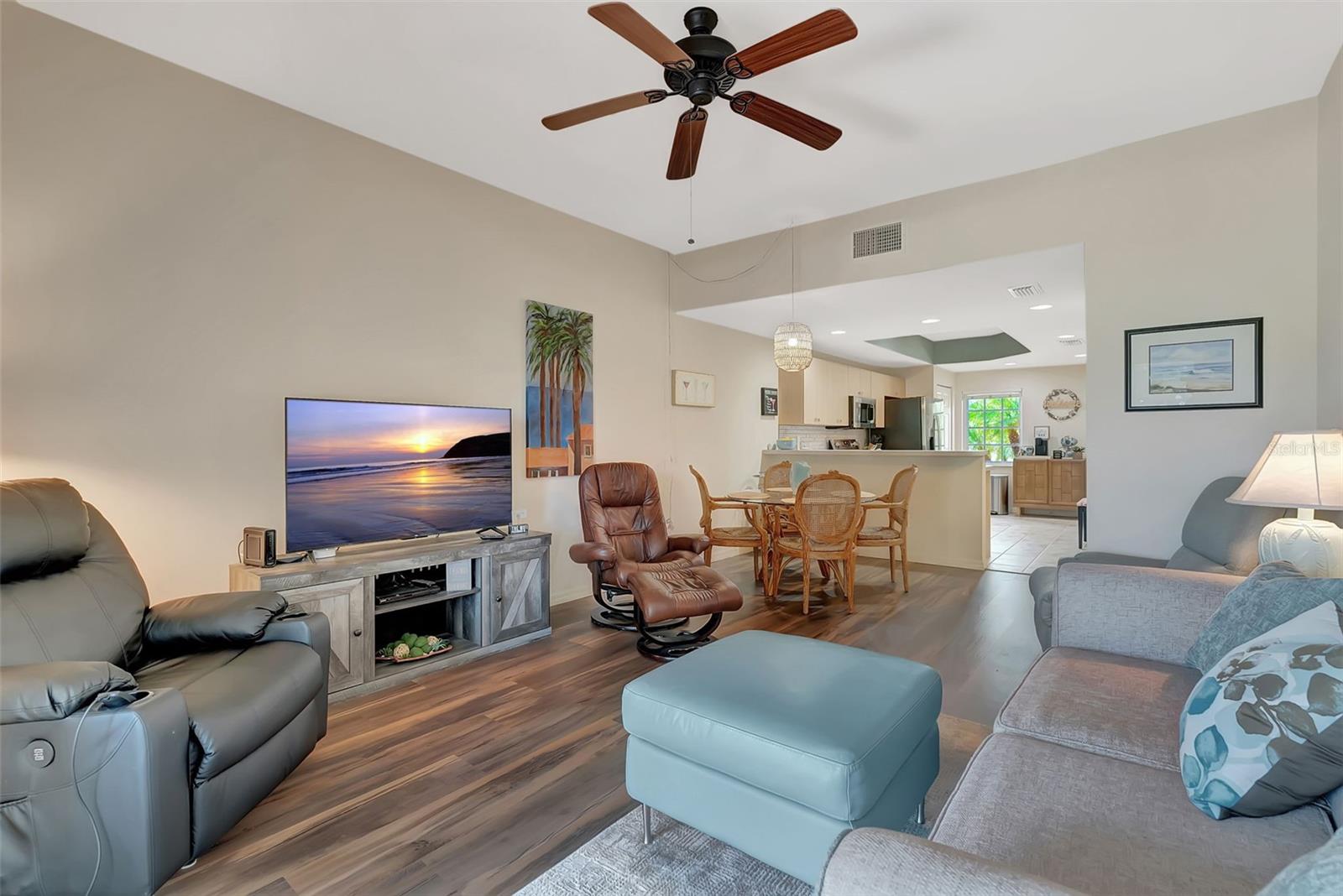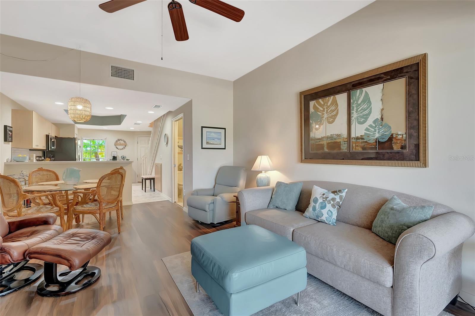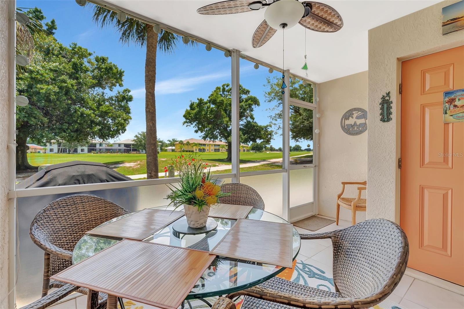 Welcome to your Florida escape in the heart of Deep Creek--a meticulously maintained 2-bedroom, 2.5-bath townhome that blends comfort, style, and an unbeatable view of the 13th hole of the Deep Creek Golf Course. Whether you're a golf lover, snowbird, or a first-time homebuyer, this two-story residence delivers both practical value and a peaceful retreat. Ideally located just steps from the community pool, this townhome showcases thoughtful upgrades for modern living. Enjoy a kitchen appointed with GE stainless steel, energy efficient appliances, a fresh, updated backsplash in soft, coastal-inspired hues, upgraded cabinet pulls offering a polished touch, generous countertop space for meal preparation, a closet pantry, and a breakfast bar that opens to the dining area--perfect for casual meals or entertaining. Stylish and durable vinyl plank flooring flows through the open-concept living and dining area, seamlessly connecting to a private screened lanai--perfect for sipping your morning coffee or unwinding in the evening, all while taking in peaceful fairway views and the gentle Florida breeze. A new cabinet vanity elevates the downstairs half bath, while under-stair storage offers a clever space-saving solution. An abundance of natural light flows through the spacious primary suite on the second level. Sliding glass doors open to a private balcony with golf course views. With dual closets and an en-suite bath showcasing a walk-in shower, the primary suite offers both comfort and functionality. The guest bedroom features a wall closet and private access to the second full bath through a pocket door, which includes a tub/shower combination and a single vanity. The laundry closet is thoughtfully positioned in the hallway for easy access. Situated outside of a flood zone, this townhome also features impact-resistant windows and sliding glass doors for added peace of mind. Enjoy low-maintenance living and one of the lowest HOA fees in the deed-restricted Deep Creek community. It is just under nine miles away from Fishermen's Village, and the historic downtown Punta Gorda district. Enjoy year-round access to boating, fishing, and world-class golf. Gulf Coast beaches await you less than an hour from your doorstep. Located minutes from dining, shopping, parks, and Spring Training facilities--living here places the best of Southwest Florida's lifestyle right at your doorstep. Air travel is both convenient and flexible with Punta Gorda (PGD), Sarasota (SRQ), and Fort Myers (RSW) airports located nearby. Step into your dream Florida lifestyle now! Ask about the beautifully curated furnishings--they are up for negotiation!
