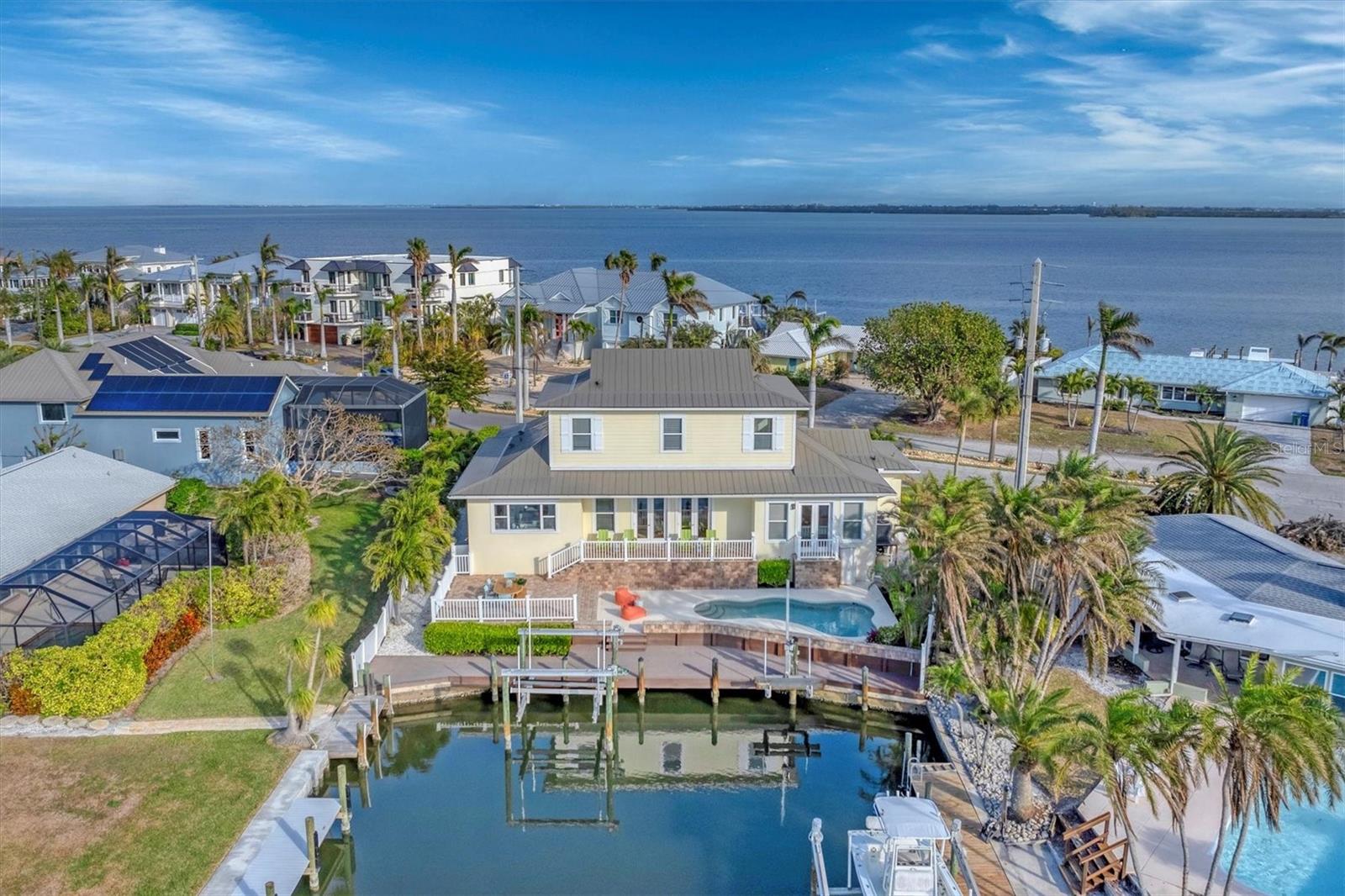 Waterfront Luxury Meets Eco-Friendly Living on Key Royale! Welcome to 634 Key Royale Drive, where coastal elegance, boater's paradise, and energy efficiency blend seamlessly into one exceptional island retreat. Built by Shoreline Builders, this elevated 4-bedroom, 3.5-bath home is one of Anna Maria Island's first Certified Energy-Efficient Homes--designed to deliver sustainable luxury with NO storm damage from the hurricanes! Step into the sun-soaked open-concept layout, where nearly every room boasts breathtaking water views. French doors lead to your private backyard oasis featuring a heated pool, Trex dock, 10,000-lb boat lift, and jet ski lift--perfect for sunset cruises and family fun on the water. The chef-inspired kitchen is the heart of the home with Kraftmaid cabinetry, granite countertops, stainless steel appliances, a large pantry, and an oversized breakfast bar ideal for entertaining. Your private primary suite retreat features a canal-facing balcony, dual vanities, soaking tub, and a nautical touch with charming port windows. Need space to work or create? The downstairs includes two versatile flex rooms perfect for a home office, gym, art studio--or even a 5th bedroom conversion. Upstairs, discover three guest bedrooms, bamboo flooring, two stylish bathrooms, and an open-air balcony that invites ocean breezes. This home is loaded with premium upgrades: Jet Ski Lift ICYNENE spray foam insulation for optimal climate control Two Rinnai tankless water heaters for endless hot water Well-fed irrigation system to keep your lawn lush without the high bills Oversized garage with 12' ceilings and 9' door--store your boat, golf cart, or toys with ease. Located on one of the most desirable streets on Holmes Beach's exclusive Key Royale, you're minutes from the island's sugar sand beaches, golf, dining, and more. This home offers unmatched value, lifestyle, and peace of mind.