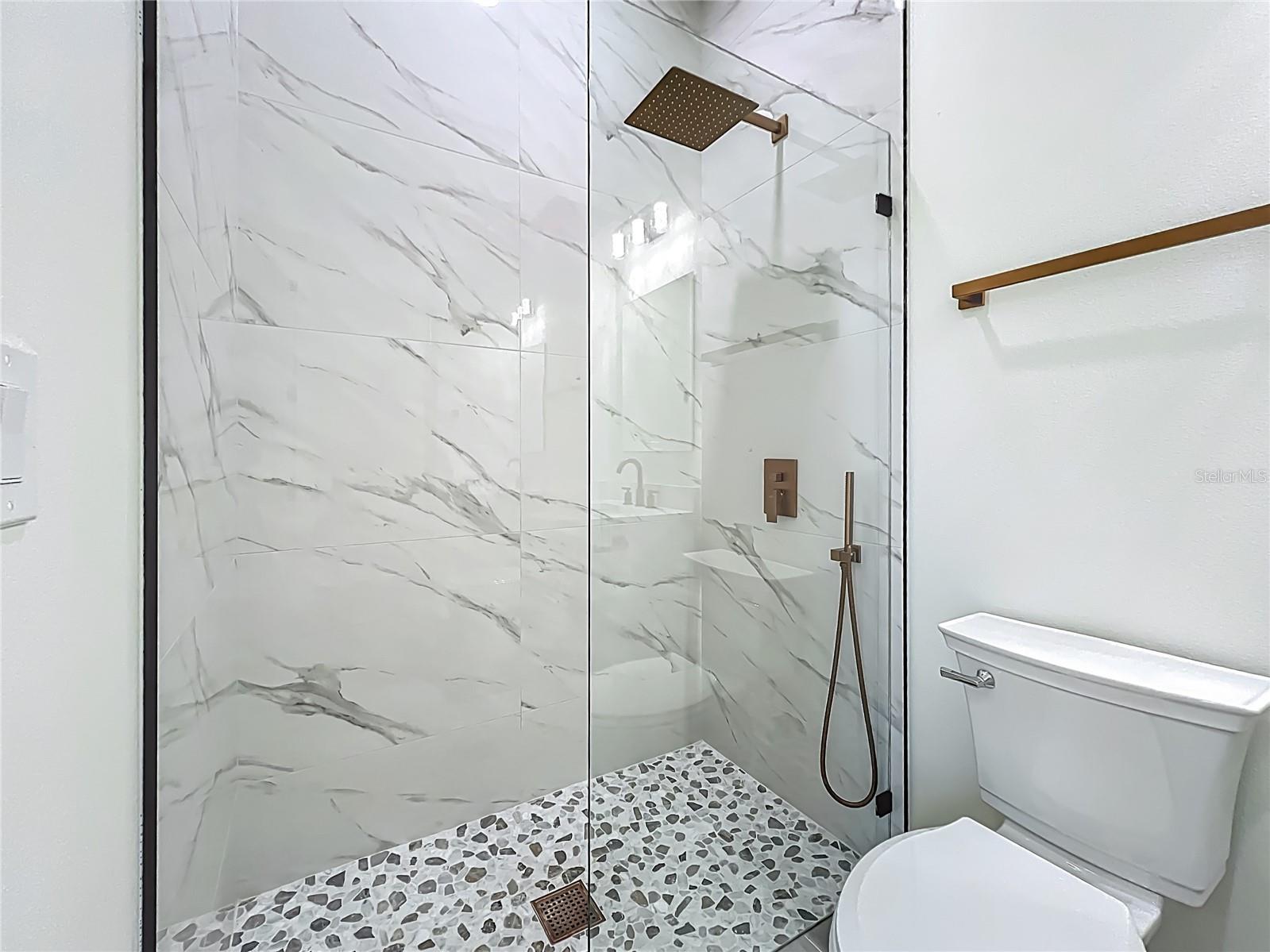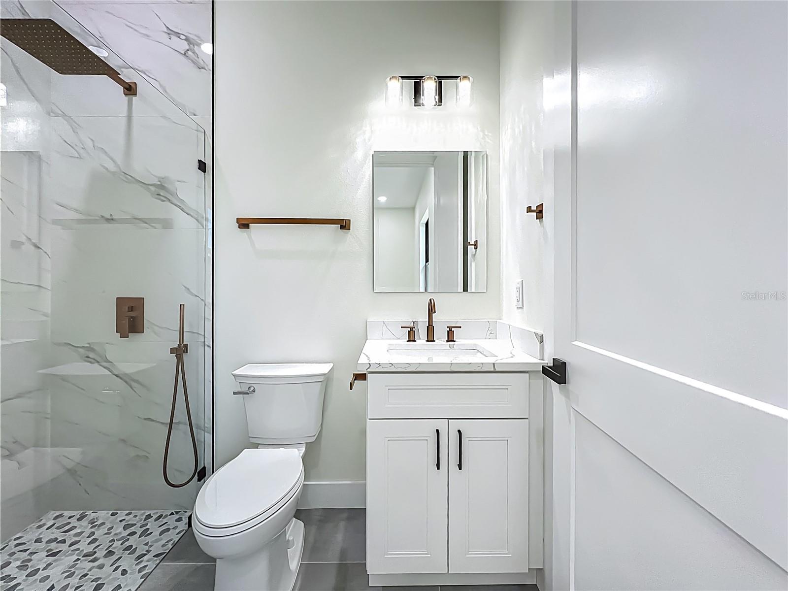 Exterior: Lighting, Outdoor Grill, Outdoor Kitchen, Outdoor Shower, Rain Gutters, Sidewalk, Sliding Doors