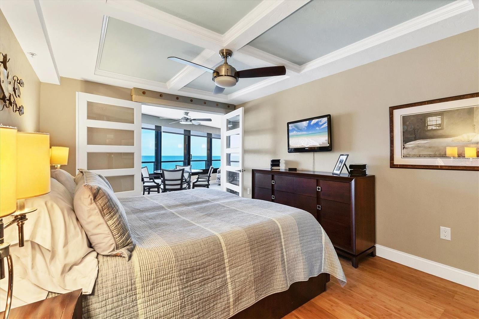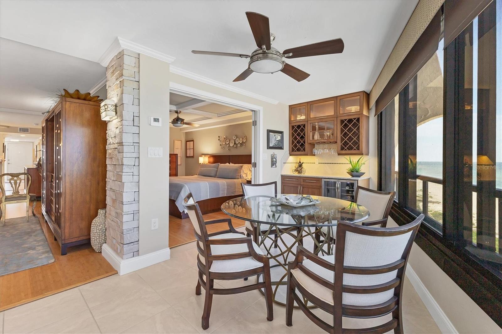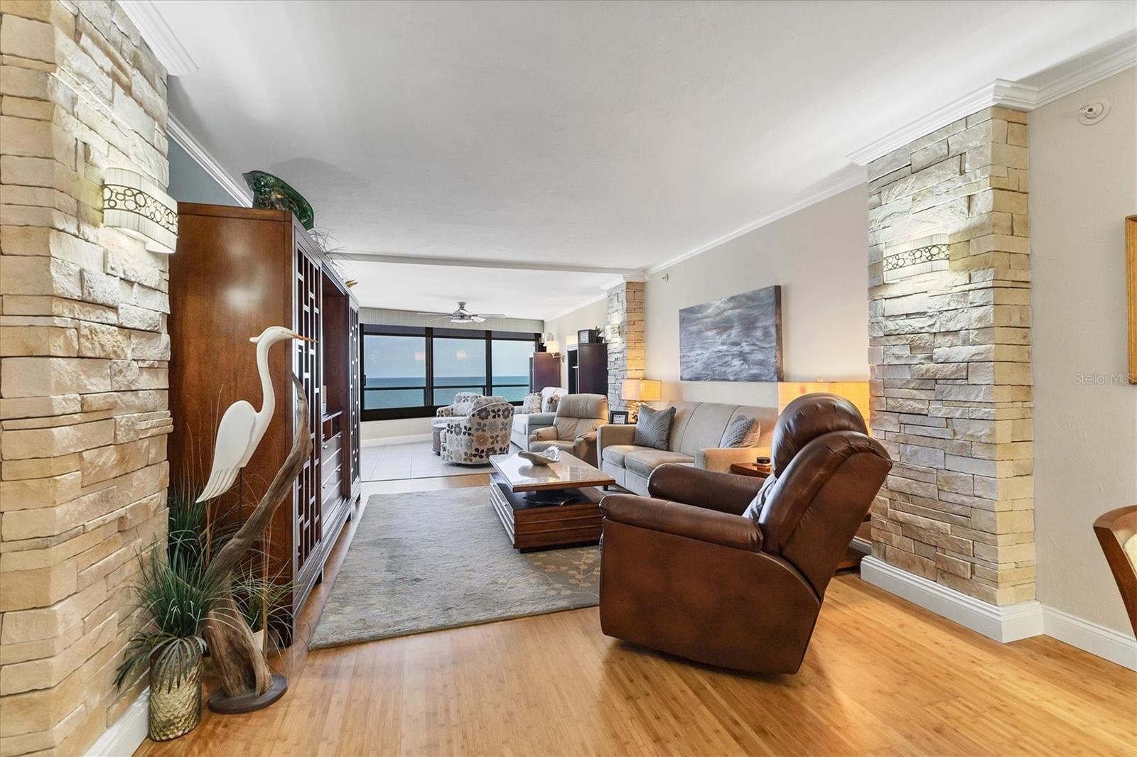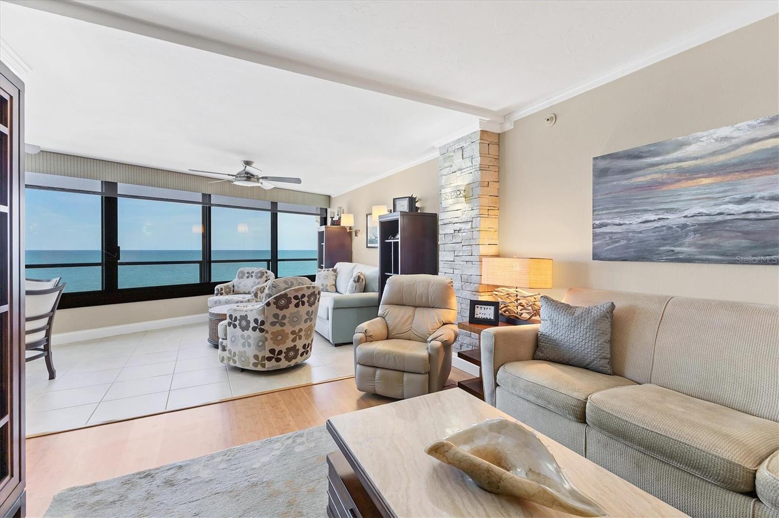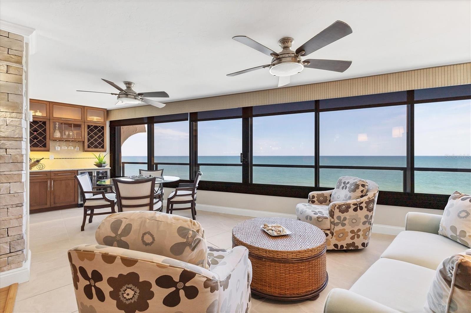 This exceptional, turn-key furnished (with some exclusions) 8th-floor condo in the highly sought-after Sansovino on Venice Island is a true standout. Completely taken down to the studs and reimagined with the expertise of a professional architect and interior designer, this residence offers a rare blend of coastal charm and upscale sophistication. With sweeping 180-degree views of the Gulf and Venice Beach, every corner reflects quality craftsmanship and thoughtful customization.Upon entry, the stacked-stone feature wall in the foyer sets the tone for the elegant updates throughout. The gourmet kitchen impresses with GE Profile appliances, soft-close hardwood cabinetry, neutral granite countertops, a glass-tiled backsplash, and pendant lighting that adds a coastal flair. Adjacent is a well-appointed laundry room with full-sized Electrolux washer and dryer, and additional cabinetry and counter space. The kitchen and foyer share beautiful 24" x 12" neutral tile flooring.The spacious living and dining areas are defined by stunning architectural details--coffered ceilings, a gorgeous lighted Media/Entertainment cabinet, bamboo flooring, dramatic stone-accent walls with attractive sconces, and a chandelier that elevates the space. The living room flows seamlessly into the expansive lanai which offers unmatched views and an entertainer's dream setting. The lanai is outfitted with motorized window shades, two ceiling fans, a beautiful, built-in, granite-topped bar with wine/beer fridge, and an oh-so-comfortable sofabed that sleeps two. The Primary Suite features elegant bamboo flooring, a coffered ceiling with fan, and glass French doors that open to the lanai, revealing stunning Gulf views. The King-sized bed is actually a split king configuration, comprised of two twin articulating beds--each with independent head and foot adjustments to provide customized, ergonomic comfort. Two beautifully appointed walk-in closets with custom wood organizers and a spa-inspired en-suite bath, showcasing a granite double vanity with under-cabinet lighting, a glass-enclosed shower with natural stone flooring, and decorative tile accents, complete the primary retreat.The Guest Bedroom doubles as a spacious office, with a Queen-sized Murphy bed; custom built-in lighted cabinetry; and elegant touches throughout. The Guest Bath continues the theme of understated luxury with granite surfaces, pebbled shower floor, and elegant tile.Additional enhancements include solid wood five-panel interior doors with premium hardware, recessed lighting throughout, superior mattresses on all bedding, a separate shed/storage unit, and a whole-condo water filtration system. Sansovino offers secure building access with two elevators, a newly renovated Club Room, updated walkways and railings, and soon-to-be-completed new roof. Residents also enjoy a heated outdoor pool, private beach access, barbecue area, and a vibrant clubhouse for social gatherings.Minutes to downtown Venice, Crow's Nest, and the Yacht Club--this remarkable home is truly one-of-a-kind. ***The Structural Integrity Reserve Study (SIRS) AND the Milestone Inspection (Structural Assessment) are done. Sansovino is in great condition, both financially and physically!***