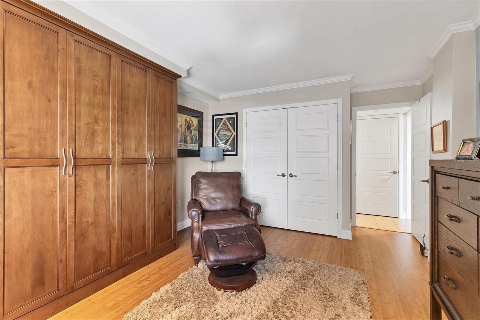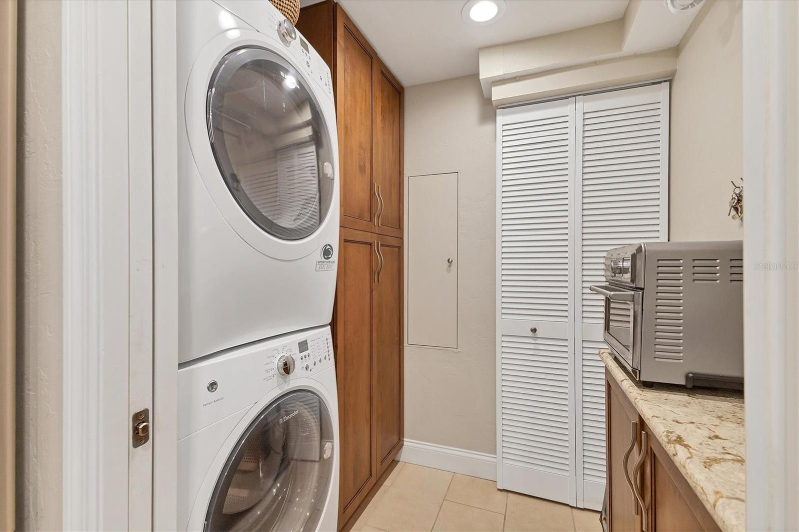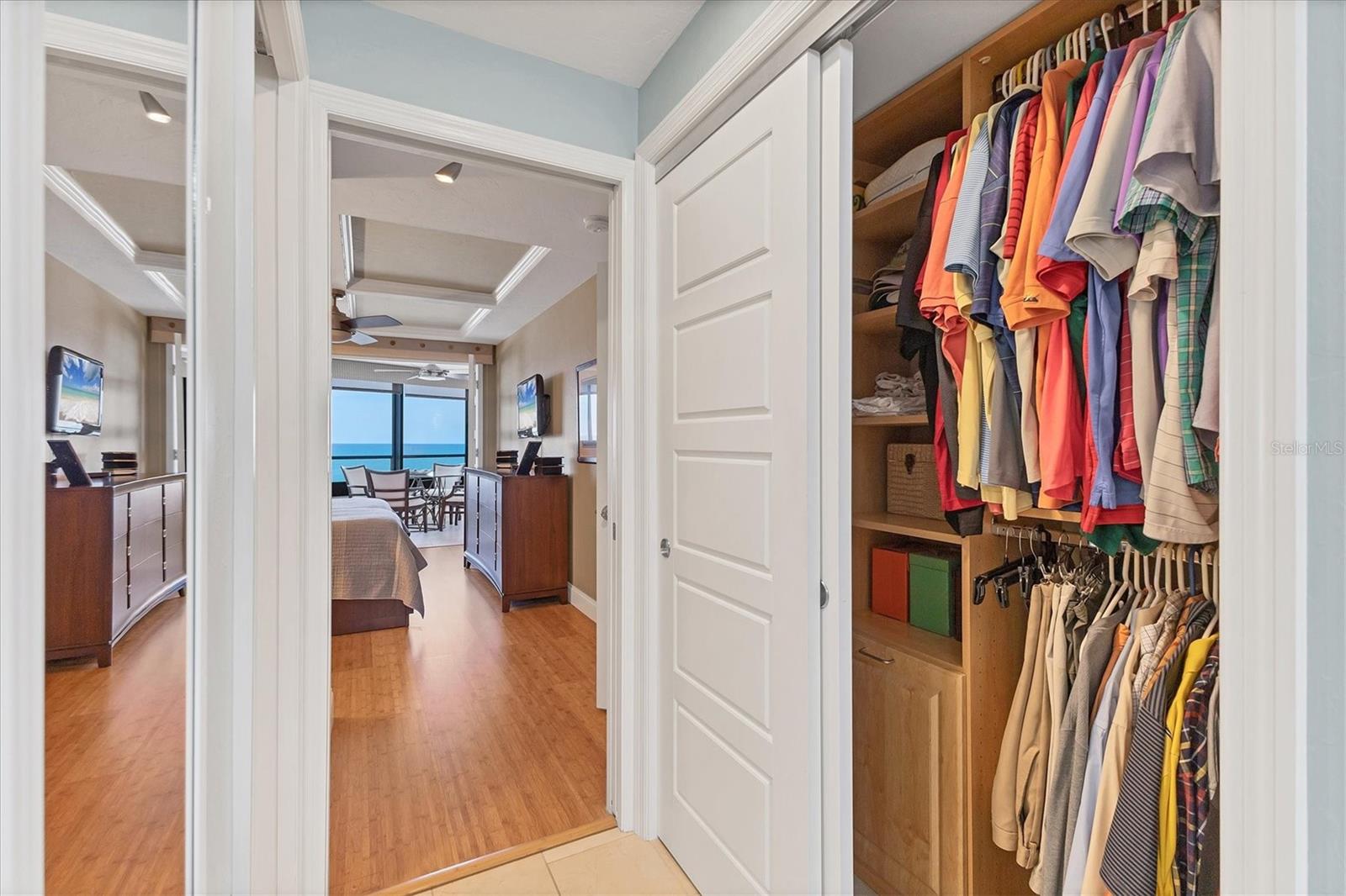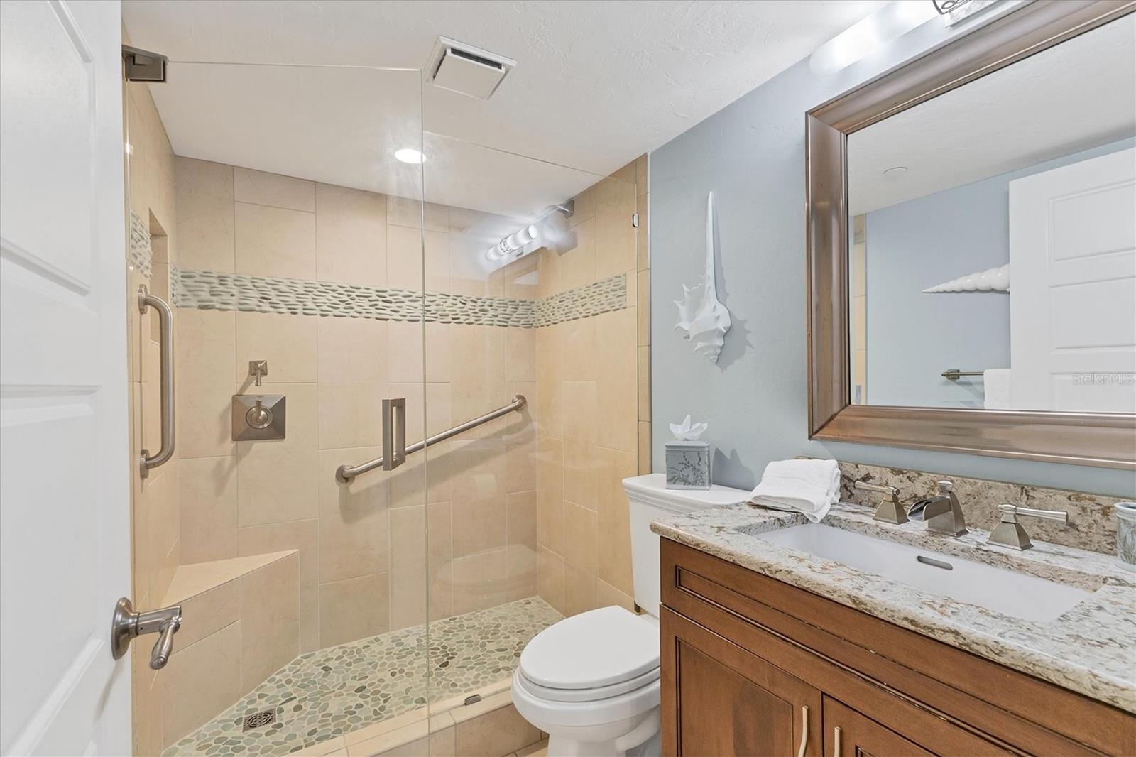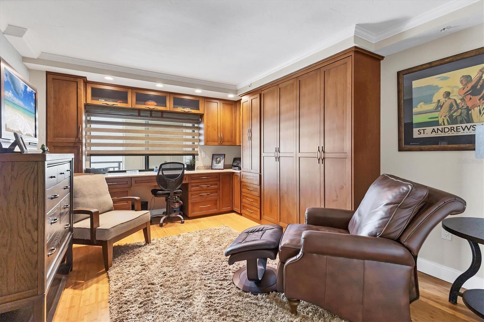 This exceptional, turn-key furnished (with some exclusions) 8th-floor condo in the highly sought-after Sansovino on Venice Island is a true standout. Completely taken down to the studs and reimagined with the expertise of a professional architect and interior designer, this residence offers a rare blend of coastal charm and upscale sophistication. With sweeping 180-degree views of the Gulf and Venice Beach, every corner reflects quality craftsmanship and thoughtful customization.Upon entry, the stacked-stone feature wall in the foyer sets the tone for the elegant updates throughout. The gourmet kitchen impresses with GE Profile appliances, soft-close hardwood cabinetry, neutral granite countertops, a glass-tiled backsplash, and pendant lighting that adds a coastal flair. Adjacent is a well-appointed laundry room with full-sized Electrolux washer and dryer, and additional cabinetry and counter space. The kitchen and foyer share beautiful 24" x 12" neutral tile flooring.The spacious living and dining areas are defined by stunning architectural details--coffered ceilings, a gorgeous lighted Media/Entertainment cabinet, bamboo flooring, dramatic stone-accent walls with attractive sconces, and a chandelier that elevates the space. The living room flows seamlessly into the expansive lanai which offers unmatched views and an entertainer's dream setting. The lanai is outfitted with motorized window shades, two ceiling fans, a beautiful, built-in, granite-topped bar with wine/beer fridge, and an oh-so-comfortable sofabed that sleeps two. The Primary Suite features elegant bamboo flooring, a coffered ceiling with fan, and glass French doors that open to the lanai, revealing stunning Gulf views. The King-sized bed is actually a split king configuration, comprised of two twin articulating beds--each with independent head and foot adjustments to provide customized, ergonomic comfort. Two beautifully appointed walk-in closets with custom wood organizers and a spa-inspired en-suite bath, showcasing a granite double vanity with under-cabinet lighting, a glass-enclosed shower with natural stone flooring, and decorative tile accents, complete the primary retreat.The Guest Bedroom doubles as a spacious office, with a Queen-sized Murphy bed; custom built-in lighted cabinetry; and elegant touches throughout. The Guest Bath continues the theme of understated luxury with granite surfaces, pebbled shower floor, and elegant tile.Additional enhancements include solid wood five-panel interior doors with premium hardware, recessed lighting throughout, superior mattresses on all bedding, a separate shed/storage unit, and a whole-condo water filtration system. Sansovino offers secure building access with two elevators, a newly renovated Club Room, updated walkways and railings, and soon-to-be-completed new roof. Residents also enjoy a heated outdoor pool, private beach access, barbecue area, and a vibrant clubhouse for social gatherings.Minutes to downtown Venice, Crow's Nest, and the Yacht Club--this remarkable home is truly one-of-a-kind. ***The Structural Integrity Reserve Study (SIRS) AND the Milestone Inspection (Structural Assessment) are done. Sansovino is in great condition, both financially and physically!***