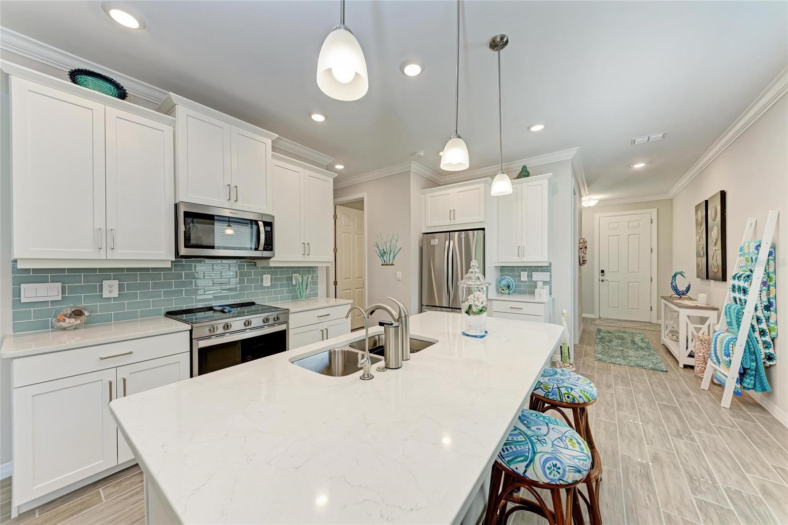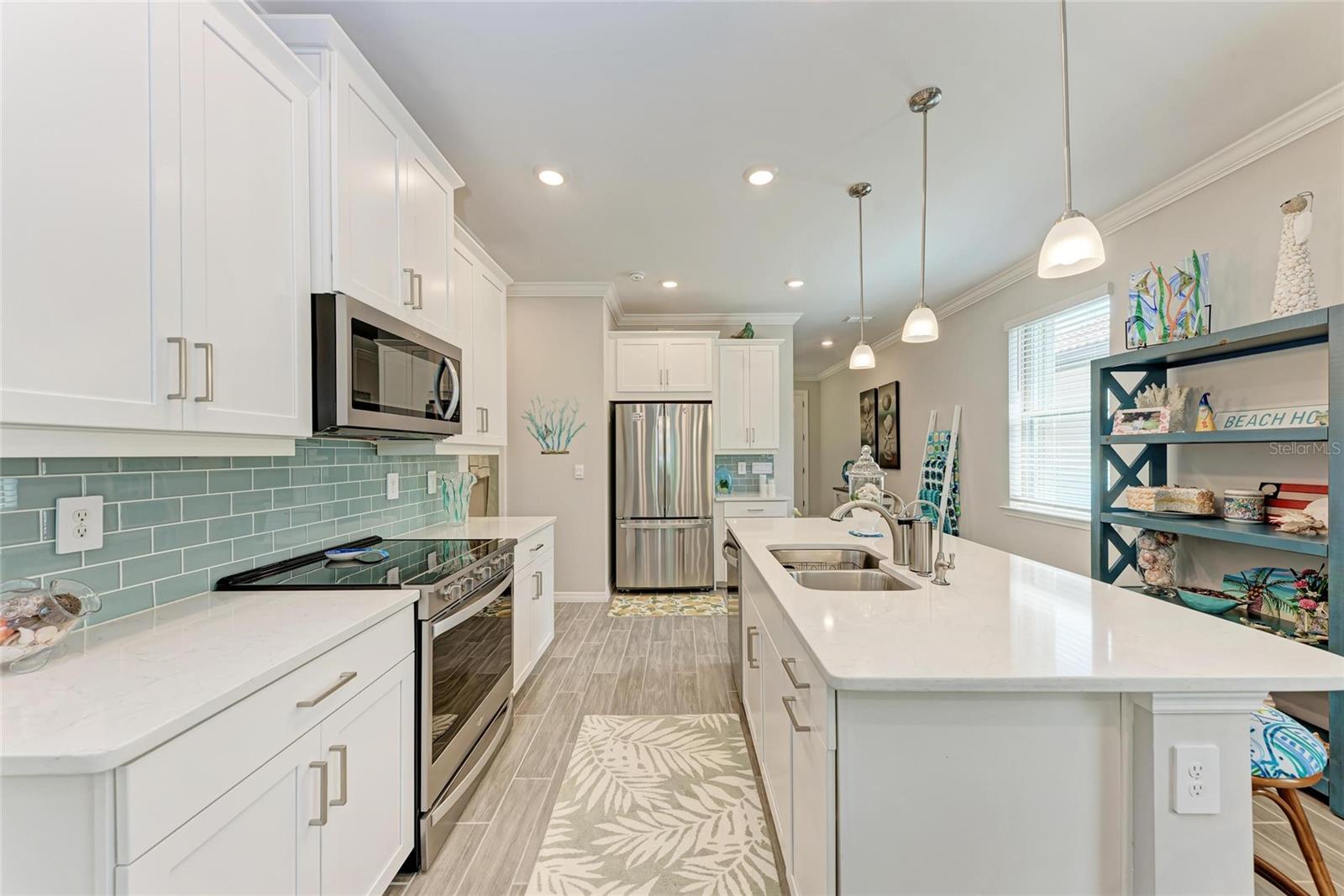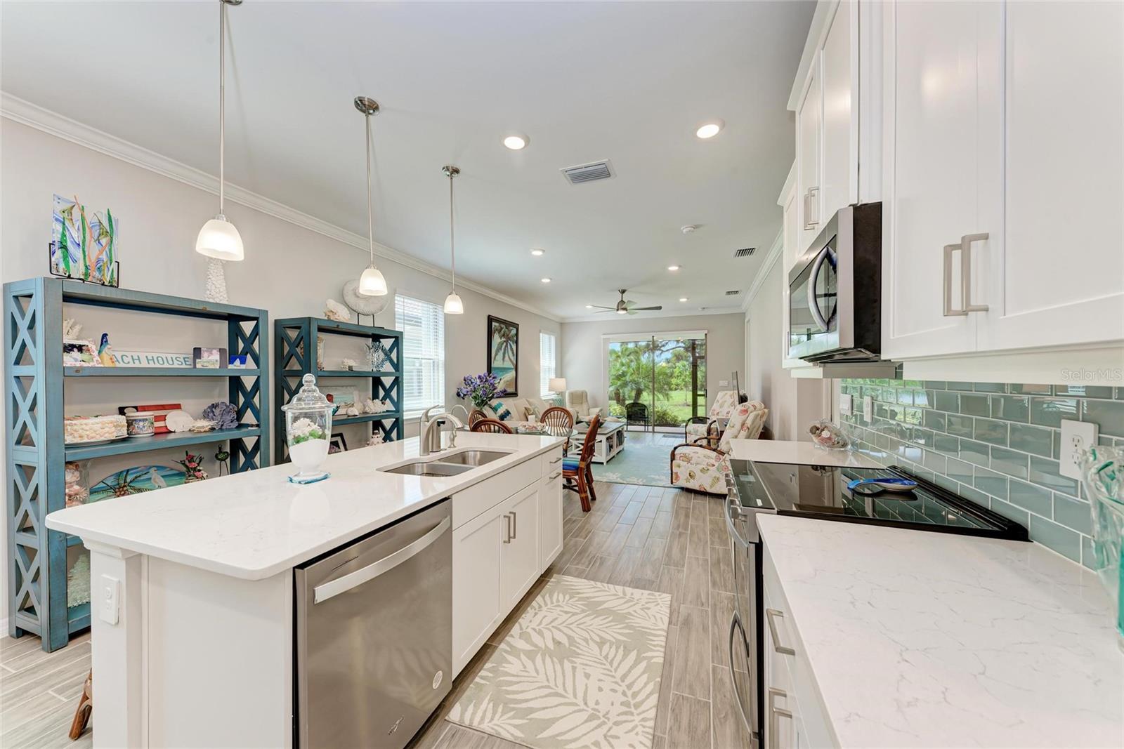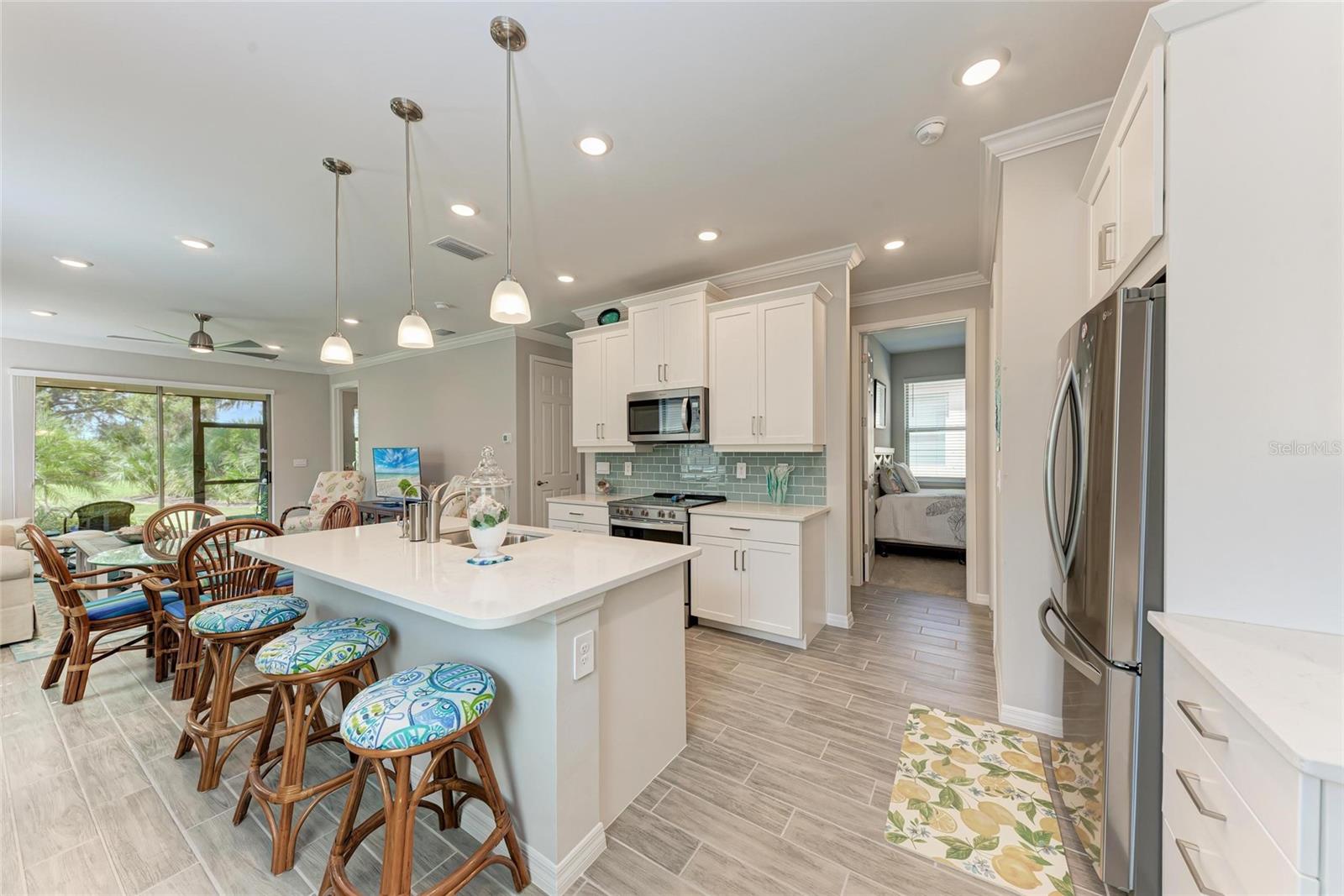 You will adore this well-kept three-bedroom, two-bathroom home on a lovely lot that provides seclusion and a tranquil haven. Savor calm mornings or leisurely nights from the comfort of your paver lanai, which has Clearview Screening offering unhindered views of the shimmering lake, rich landscape, and swaying palm trees.All the amenities you desire in your new home are included in this maintenance-free, move-in ready masterpiece. Enjoy the open concept design, which makes it perfect for daily living and entertaining. The kitchen features quartz countertops, stainless steel appliances, a Kinetico water filtration system, white shaker soft-close cabinets, a huge walk-in pantry, a backsplash of designer glass tiles, and a large island that is ideal for entertaining. Crown molding, custom closets in every bedroom, luxurious carpet in the master bedroom, chic plank tile throughout, and beautiful lighting and fans throughout. Additionally, there is a leaf filter gutter protection system that makes water drainage easier for easy home maintenance. For your peace of mind, there are also more recent accordion-style hurricane shutters and impact glass for the front entry window. This house exudes beauty from the inside out!The community offers an array of resort-style amenities, including: Infinity-edge lakefront pool, firepit, Clubhouse with screened outdoor lounge area tennis, pickleball, and bocce ball courts, playground, dog park and over 200 acres of interconnected lakes with dock to launch your kayak. Conveniently located near Sarasota Memorial Hospital, top-rated medical facilities, shopping, dining, the Legacy Bike Trail, and only minutes to the Gulf Beaches, this home offers the perfect blend of luxury, comfort, and location. Don't miss this must-see home and make it yours today!