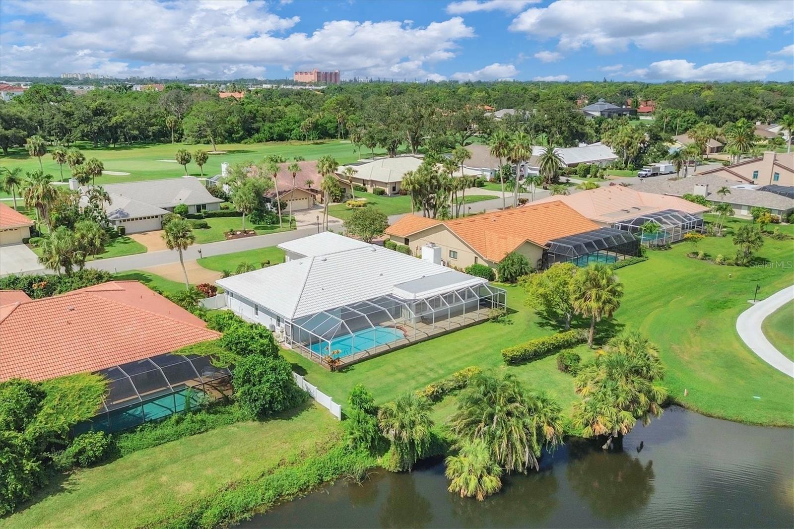 Full of potential and ready for a makeover! A rare opportunity awaits in the guard-gated community of The Country Club of Sarasota. This home offers privacy, space, and breathtaking views of the lake and golf course beyond. Situated on a spacious, private lot in a highly desirable community. Flexible split floorplan and generous rooms throughout with over 2,500 SF of interior living space. Already completed: new Lennox A/C (2025), flat roof extension (2023), Rheem water heater (2022), pool cage (2022). Double-door entry leads to a large living room with a wall of sliders opening to the screened lanai and sparkling pool. Formal dining room flowing into the kitchen, ready for your vision, plus an oversized family room with wood-burning fireplace and access to a spacious enclosed Florida room. Private primary suite with two walk-in closets, ensuite bath and direct lanai access. Large guest room, full bathroom, laundry room, two-car garage and ample storage. Incredible screened outdoor space for entertaining with a covered lanai, sparking pool, and full pool bath for added convenience. Plenty of room for dining and lounging. Located in a well-established, beautifully maintained neighborhood with 24/7 staffed security. Residents also enjoy optional access to the Sarasota Sports Club with tennis courts, fitness center, junior Olympic heated pool, and more. Golf memberships at nearby TPC Prestancia are available but not required. All of this just minutes to world-famous Siesta Key Beach, The Legacy Trail, shopping, dining, the upcoming Sarasota Square redevelopment, and downtown Sarasota's arts and culture scene.