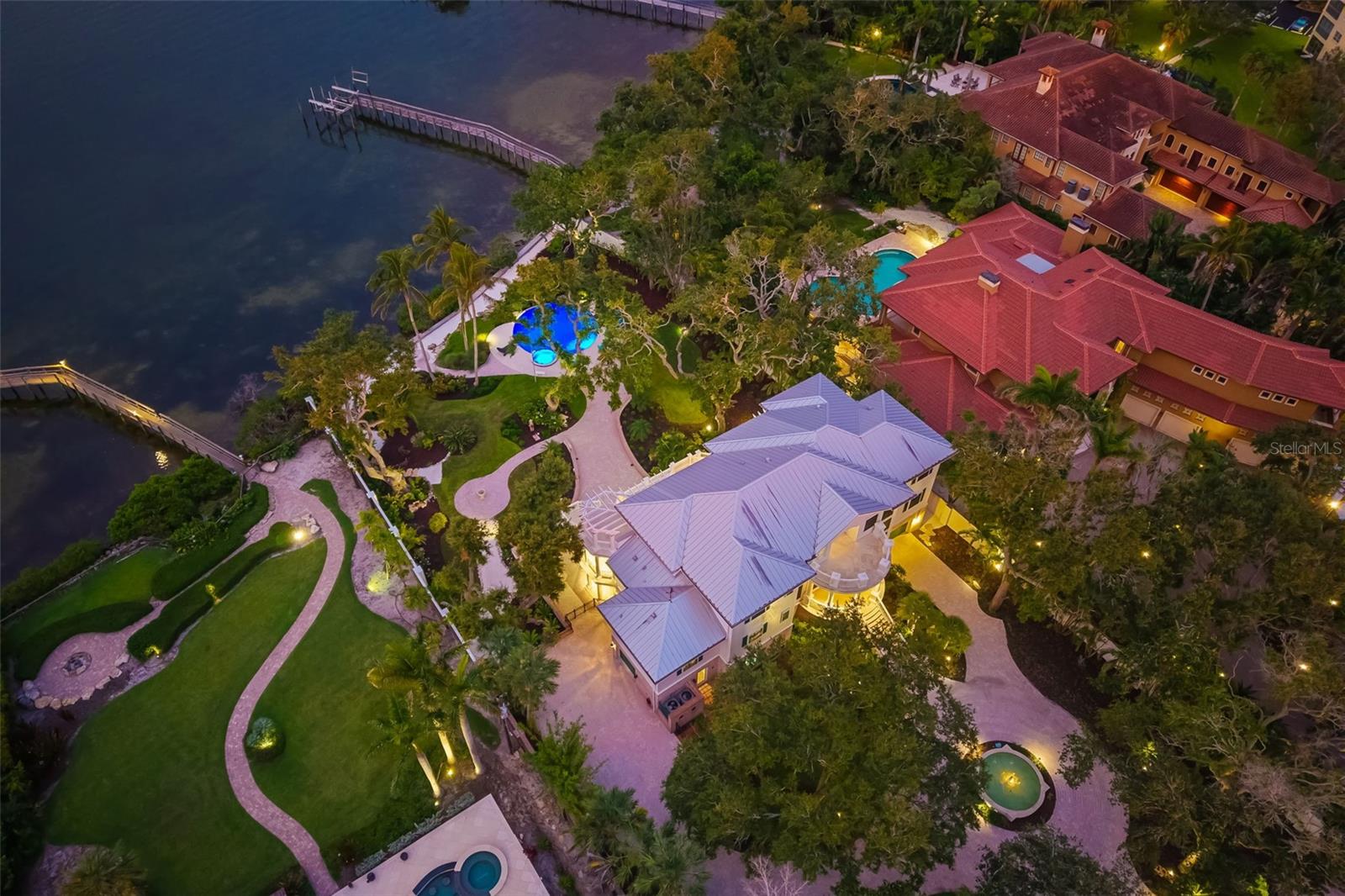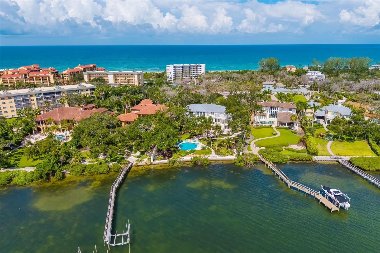 A private legacy estate on Siesta Key. Behind a private gate and walled perimeter on one of Siesta Key's largest residential parcels, this majestic waterfront estate offers a rare opportunity to own a generational property of striking character, scale, and serenity. Set on 1.6 lushly landscaped acres with 132 feet of direct frontage on Little Sarasota Bay, the residence is introduced by a long, winding paver drive, framed by mature oaks and a tranquil pond with fountain -- a cinematic approach that sets the tone for what's to come. Designed for those who value privacy without compromise, the estate offers a seamless blend of timeless architecture, expansive outdoor living, and exclusive access to the bay and beach. In addition to its commanding bayfront presence, the property includes deeded private Gulf beach access just across the way -- an extremely rare amenity for bayfront living on Siesta Key. Custom-built in 2002 and surrounded by multi-level terraces, the 5,727-square-foot residence captures sweeping eastern views of the Intracoastal Waterway from nearly every principal room. A dramatic two-story foyer opens to the grand living room, where 20-foot ceilings, triple sets of French doors, and a carved gas fireplace frame the water beyond. The formal dining room features a crystal chandelier, intricate ceiling medallion, and custom wainscoting -- ideal for elegant gatherings. The newly updated kitchen features 42-inch cabinetry, Carrara marble countertops, a professional Wolf gas range, Sub-Zero refrigerator, center island, and an oversized walk-in pantry. It opens naturally to the breakfast and family rooms, all with direct access to the terrace and bayfront views. The richly paneled cherry library offers a handsome retreat, complete with fireplace, built-ins, and a tin ceiling, along with terrace access. The second-floor primary suite is a luxurious escape with a private bayfront terrace, 13- foot ceilings, sitting area with fireplace, dual custom walk-in closets, and a marble-clad bath with soaking tub, dual vanities, and walk-in shower. Three additional en-suite bedrooms -- including one on the main level -- provide comfortable accommodations for guests or multi-generational living. A heated saltwater infinity-edge pool with spillover spa anchors the outdoor living spaces, enhanced by tropical landscaping, landscape lighting, and a covered patio ideal for alfresco dining. Car collectors will appreciate the garage space for 10-plus vehicles beneath the main living level, with dual side entry, elevator access and climate-controlled storage. Additional features include a greenhouse, whole-house fire sprinkler system, natural gas, hurricane shutters and impact screens, and irrigation via private well. Just minutes from Siesta Key Village and downtown Sarasota, this estate offers an unmatched combination of privacy, beauty and legacy potential in one of Florida's desired coastal communities.