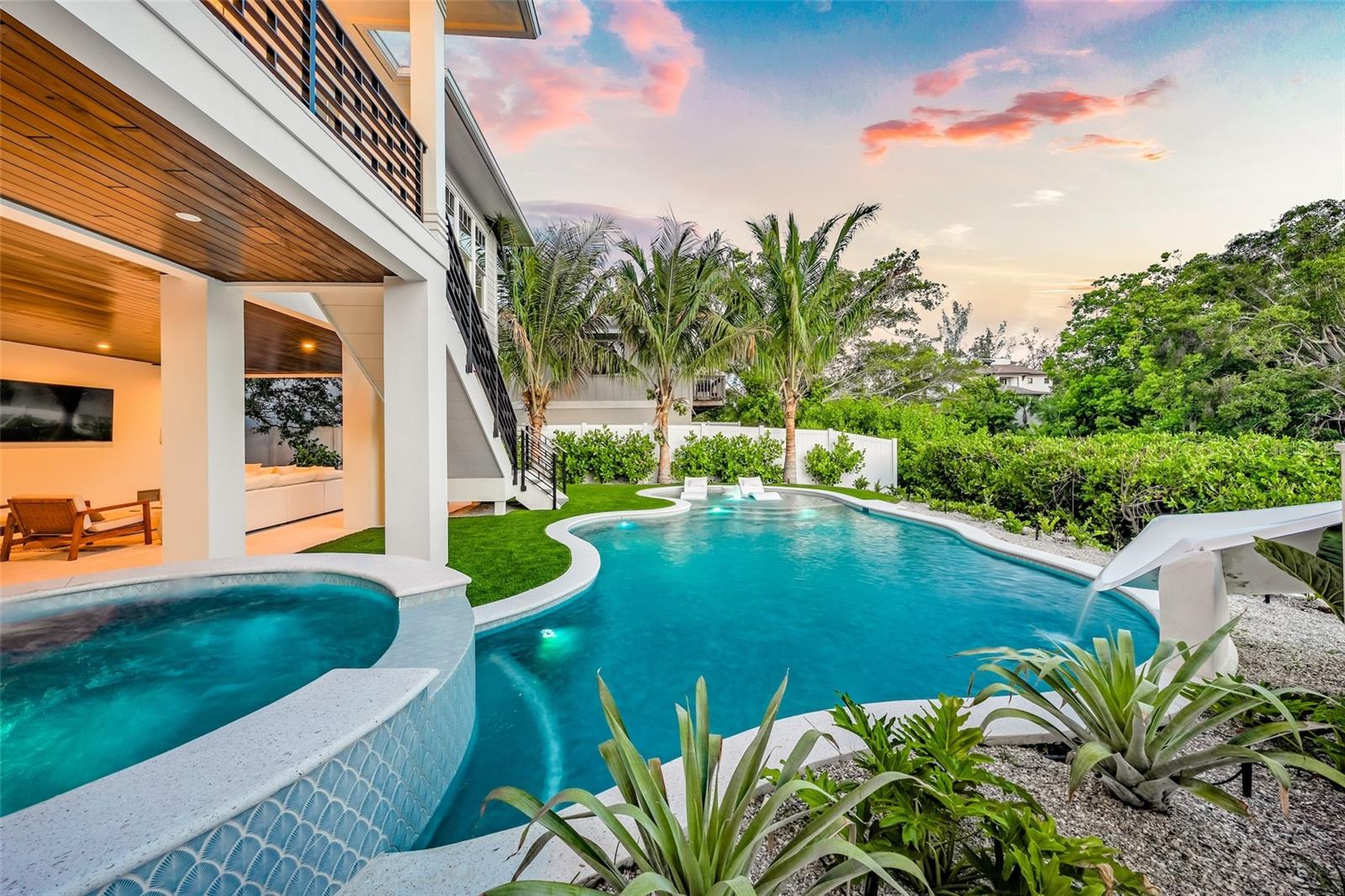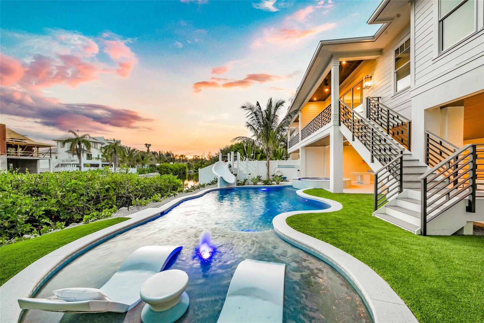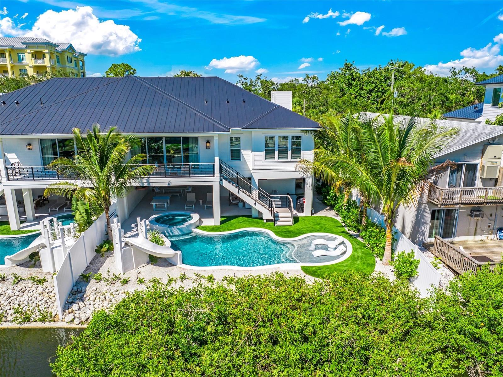 LOCATION, LOCATION, LOCATION ON BEAUTIFUL SIESTA KEY!!! Experience the ultimate in coastal luxury with this stunning new construction home by the renowned Eason Builders Group. Located on the tranquil and exclusive Peacock Road, this four-bedroom, four-and-a-half-bathroom waterfront residence offers a harmonious blend of modern elegance, tropical beauty, and thoughtful design. Be welcomed by sophistication as you enter the great room, where an open floor plan features inviting seating area and expansive sliding doors that bring the tropical breeze inside. The chef-inspired kitchen boasts top-of-the-line appliances, a generous center island, and a bar area with a wine fridge, creating the perfect space for entertaining or preparing gourmet meals. This home's well-thought-out design includes four spacious bedrooms, each with its own en-suite bathroom adorned with designer finishes, ensuring comfort and privacy for every guest. This property is being offered turnkey furnished, allowing you to move in and start enjoying this exquisite home immediately or continue to use as a successful rental property. Outside, your personal paradise awaits. Surrounded by lush tropical landscaping and breathtaking water views, the outdoor living area features a sparkling pool with a water slide, an in-ground spa, and expansive patios perfect for hosting or relaxing. While part of an architecturally stunning paired estate, this home offers the independence and feel of a standalone residence- perfect for refined coastal living. Located in the heart of Siesta Key, this home offers the ultimate convenience. Just minutes from the renowned Siesta Key Beach--or less than a 10-minute walk--you can enjoy the powdery white sand and turquoise waters with ease. The home is also close to local restaurants, marinas, boutique shopping, and Sarasota's vibrant arts and culture scene. Whether you're seeking a serene personal retreat or a lucrative investment property with weekly rentals allowed, this home delivers it all. Don't miss this rare opportunity to own a piece of paradise where luxury, breathtaking views, and the Siesta Key lifestyle come together to create your perfect coastal haven.