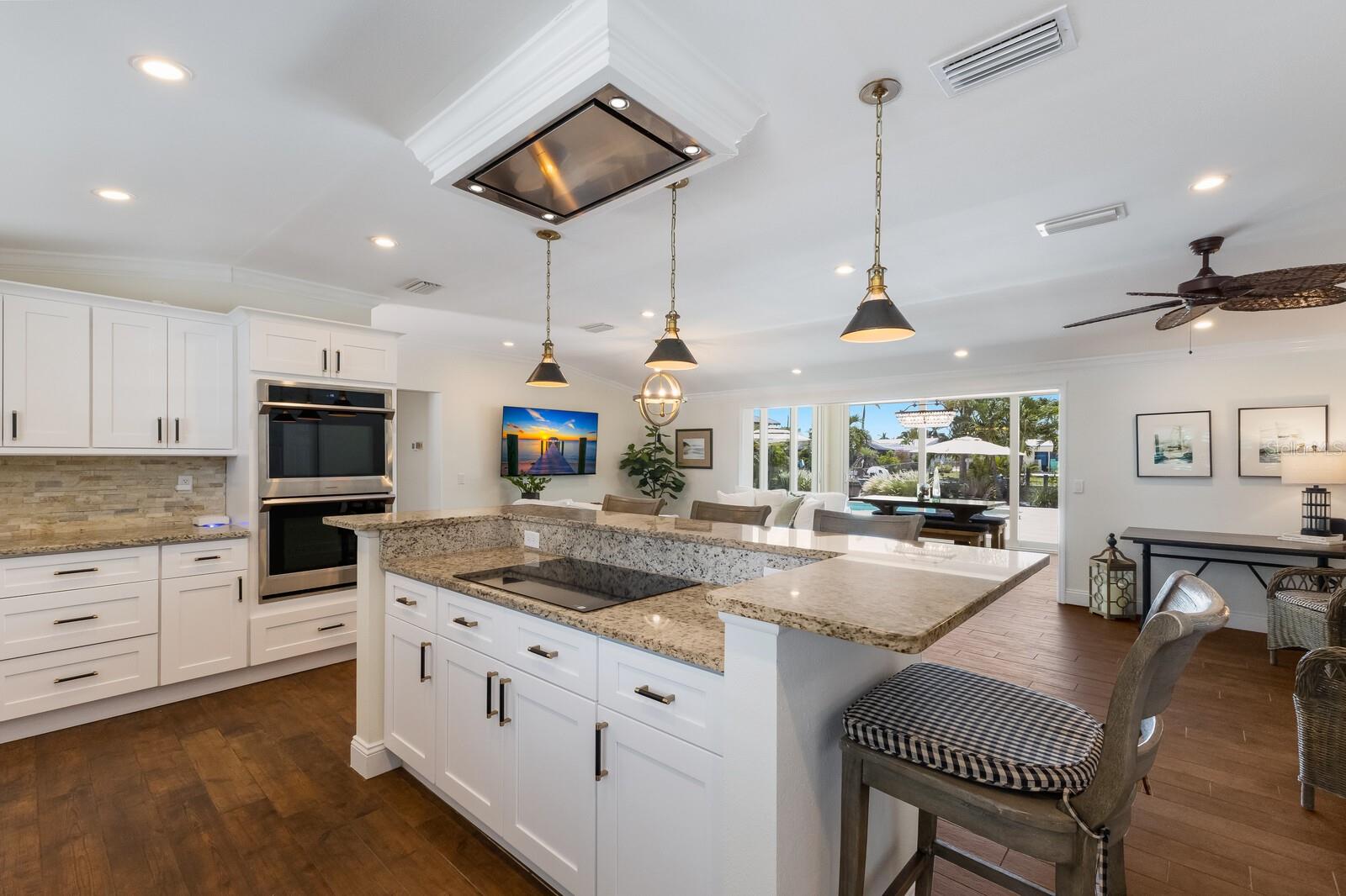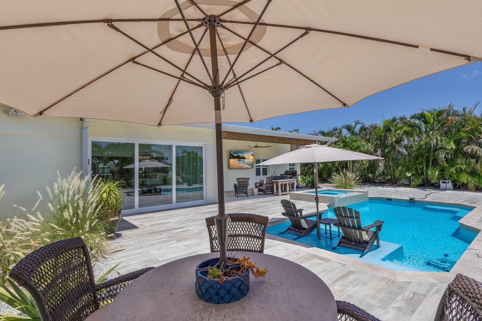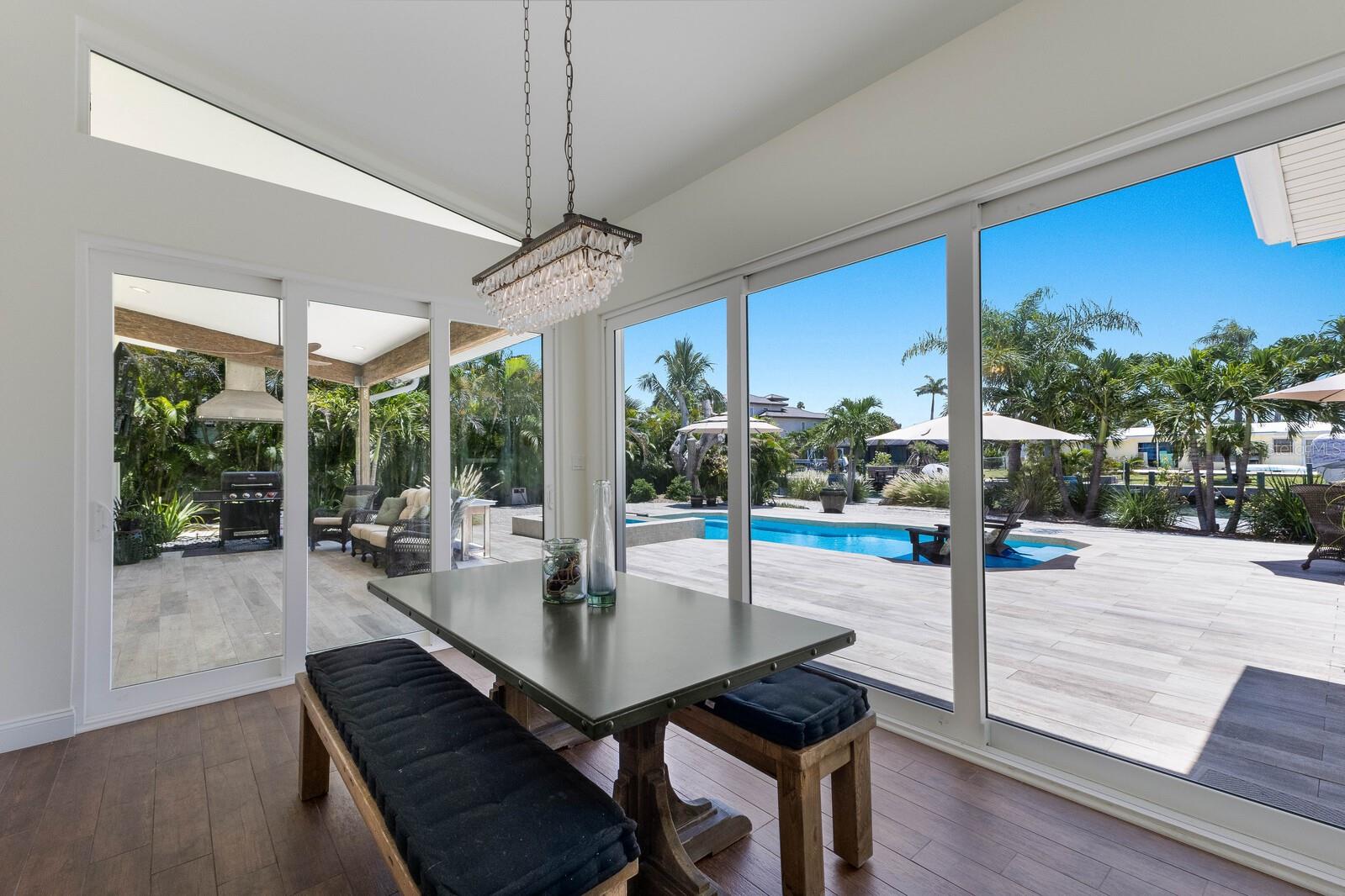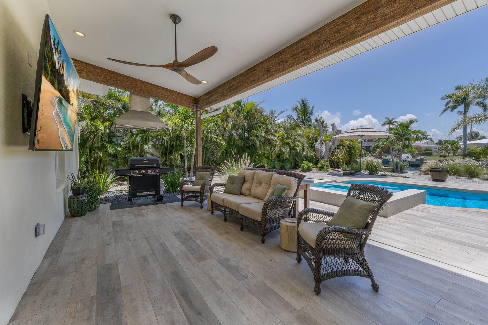 Set along a tranquil canal in the heart of Anna Maria Island, this stunning retreat offers the best of Florida living with its blend of comfort, functionality, and tropical elegance. With three spacious bedrooms and three beautifully appointed bathrooms, this home is designed to impress, featuring expansive sliding glass doors that flood the open-concept living area with natural light and offer seamless access to the private backyard oasis. The kitchen is a standout with sleek finishes, stainless steel appliances, a center island for gathering, a custom dry bar and a striking copper sink that adds a touch of artisan character. The interior features a split bedroom plan offering an easy flowing floor plan with a grand master suite, separate dining space, interior laundry room off the garage and so much more. Outside, the backyard is an entertainer's dream with a sparkling pool and spa surrounded by lush landscaping, multiple seating areas, and direct access to Tampa Bay where a 16,000 lb boat lift and low maintenance dock awaits for effortless days on the water. The garage not only offers ample storage but also includes dedicated space for your golf cart, while clever built-ins and overhead storage racks keep everything neatly in place. Impact windows and doors, newer metal roof and more give extra piece of mind. Whether you're dining indoors with views of the water, lounging poolside under the palms, or heading out by boat from your dock, this home invites you to slow down and savor the island lifestyle in comfort and style. Don't let this perfect slice of island life slip away!