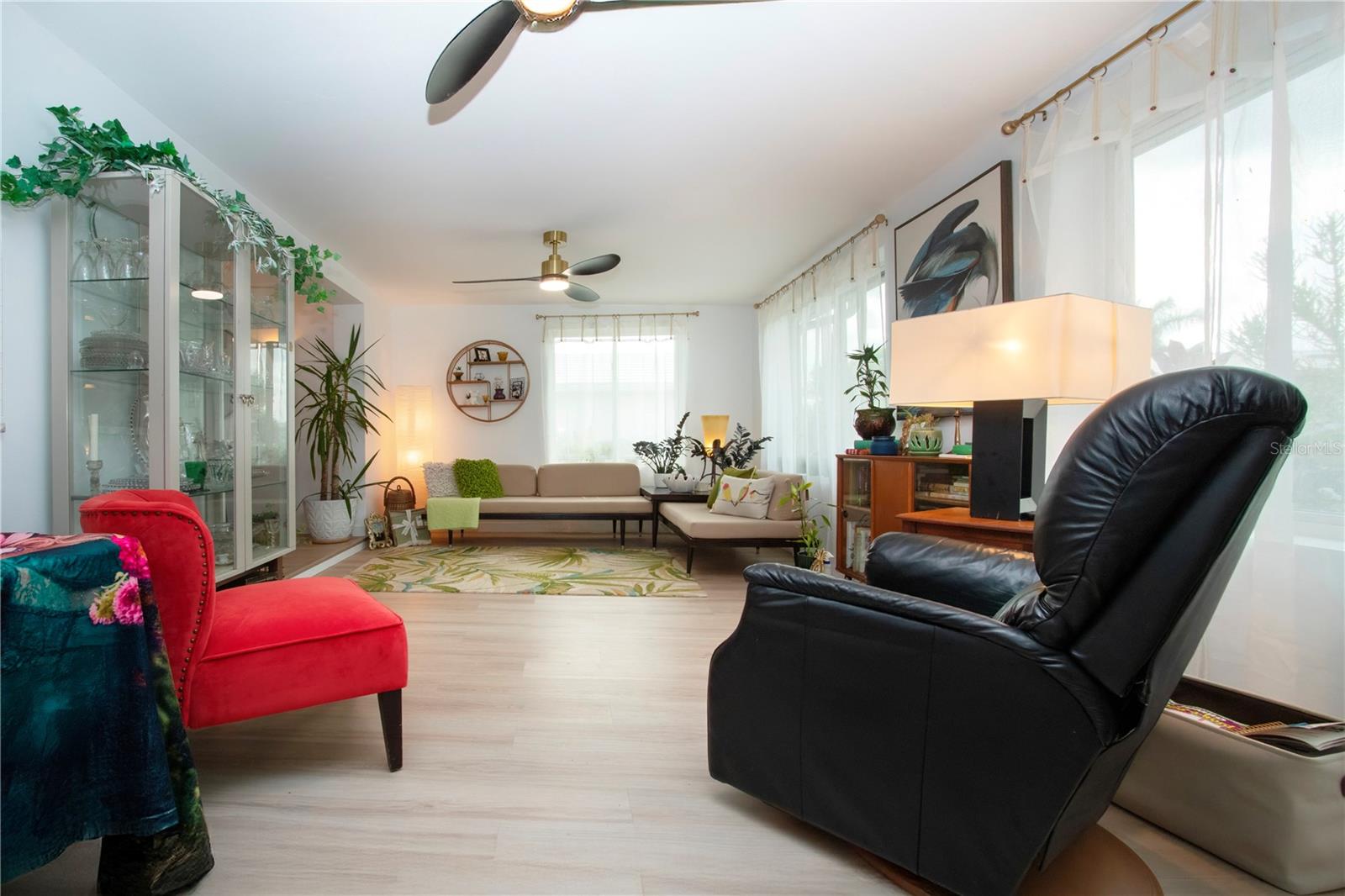 This beautifully updated residence showcases thoughtful upgrades with attention to details located in desirable River Isles a 55+ golf course community with $60/month HOA--among the lowest around. Features include LVP flooring, fresh interior paint, updated baseboards, recessed lighting, and upgraded electrical. Custom kitchen with quartz counters, chic gold fixtures, hand-selected glass and stone tile in a ceiling-height herringbone pattern, decorative tile backsplash, ceiling-height cabinetry, soft-close drawers, and newer smudge-resistant appliances. French doors lead to a spacious Florida room. Oversized patio and curated landscaping. Amenities include clubhouse, heated pool, fitness room, shuffleboard, billiards, library, and social activities. Optional 9-hole executive golf course. Convenient to I-75, shopping, dining, and medical facilities. If you're seeking quality upgrades, low monthly expenses, and a vibrant 55+ community, River Isles is the perfect place to call home.