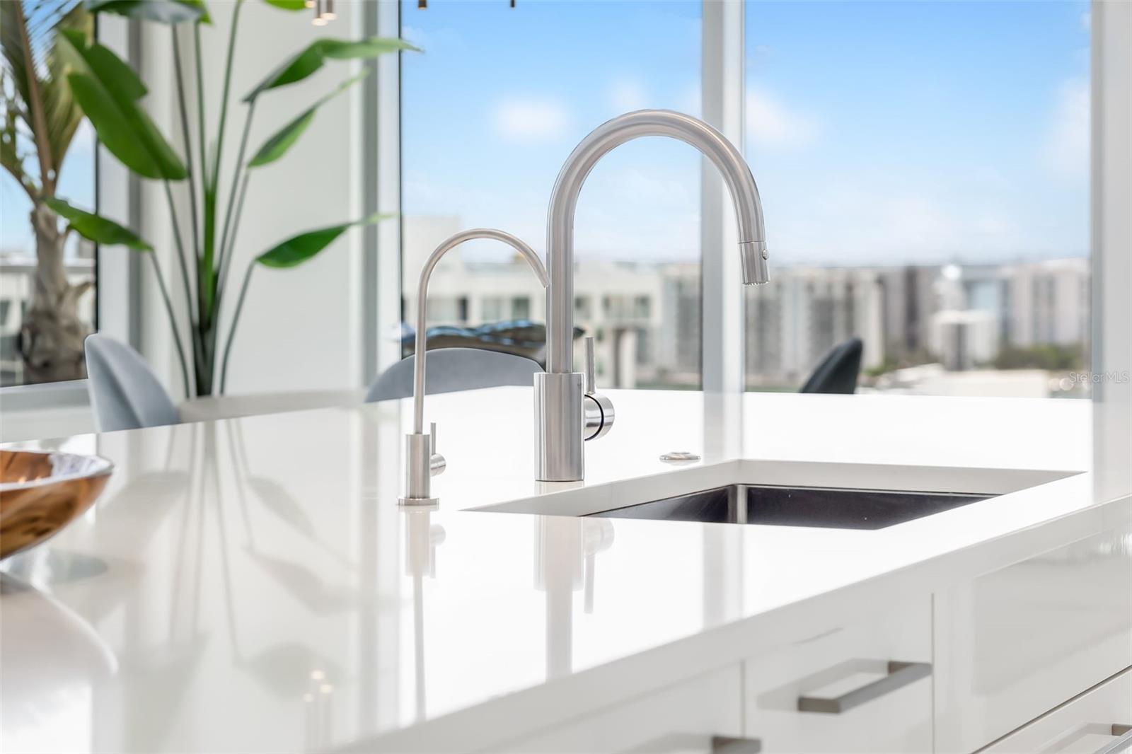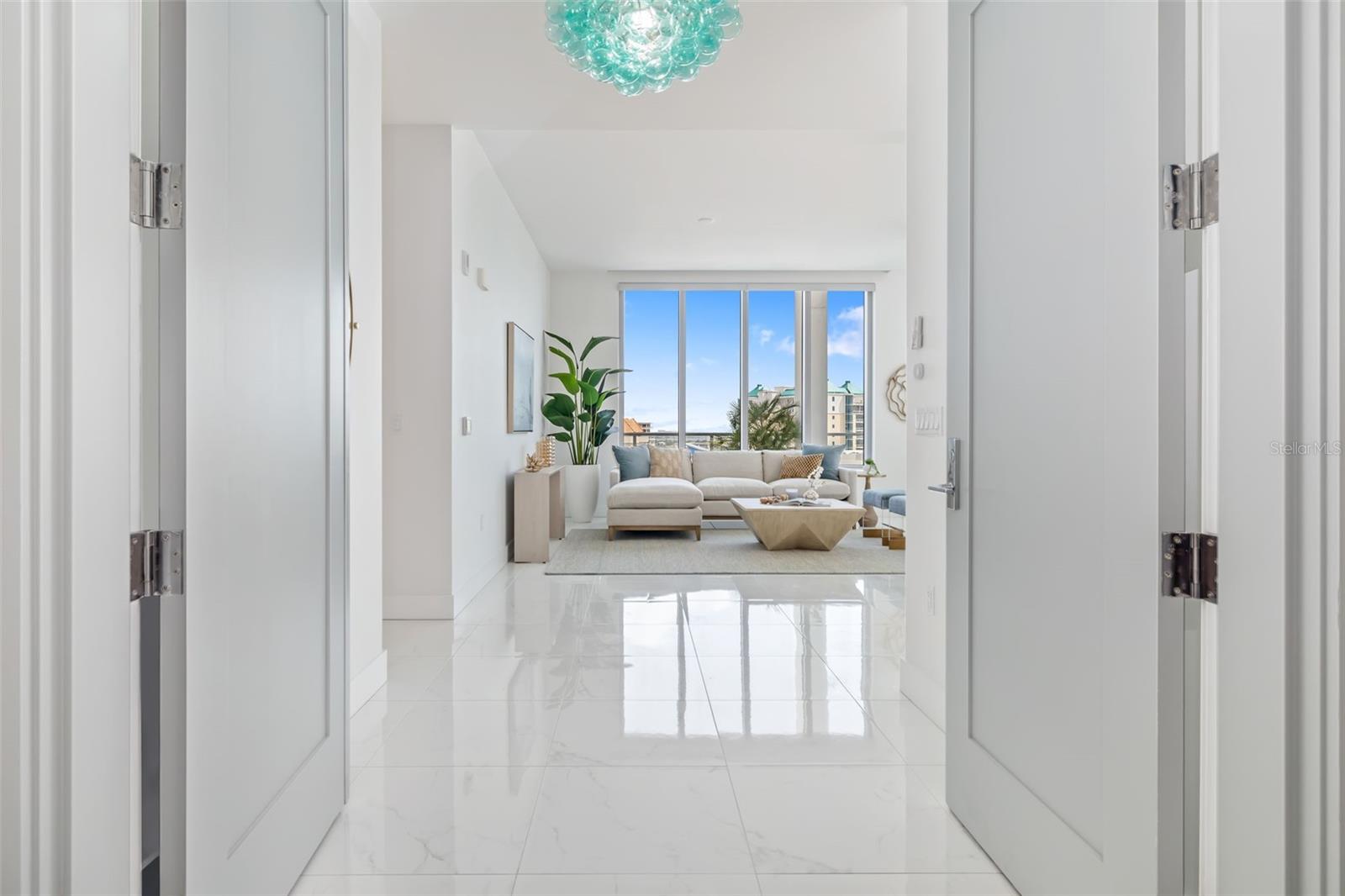 Rare penthouse offering at Mark Sarasota. 111 S Pineapple Ave. #1204 is a one-of-a-kind 12th-floor residence and the largest home in the building, offering 2,845 square feet under air and over 3,600 square feet of total living space including a spacious wraparound covered terrace with uninterrupted views of Sarasota Bay. From the moment you go inside, you're greeted by 11-foot ceilings, double 8-foot entry doors, and expansive 10-foot impact-rated sliding glass doors that blur the line between indoors and out. Gleaming 24-inch white polished porcelain tile floors run throughout the open-concept interior, where a thoughtfully designed layout integrates the living, dining, and family spaces with a chef-caliber kitchen--complete with high-gloss European cabinetry, quartz countertops, and a suite of premium Jenn-Air stainless steel appliances including a 42-inch built-in refrigerator, convection wall oven, and 36-inch induction cooktop. The primary suite is a private oasis, offering panoramic views, dual walk-in closets by California Closets, and a spa-inspired en-suite bath with double vanities, an oversized walk-in shower, deep soaking tub and sleek Grohe fixtures. Two generous guest suites, each with private baths, custom closets and blackout shades, provide comfort and privacy for visitors or family. Additional interior highlights include a convenient and spacious family room/den, automated roller shades throughout with blackout shades in all bedrooms, a full laundry room with custom cabinetry and Whirlpool HE washer and dryer, water filtration and softener systems for the entire residence, and four deeded garage parking spaces plus a same-floor oversized private storage unit. The wraparound covered terrace is an entertainer's dream with commanding views of the water and city skyline. Enjoy alfresco dining at the built-in outdoor kitchen, equipped with an electric grill, under-counter refrigerator, stone countertops, and durable exterior cabinetry. Residents of The Mark enjoy exceptional lifestyle amenities including 24-hour concierge service, a resort-style heated saltwater pool and spa, state-of-the-art fitness center with a dedicated spin room, a club room with catering kitchen, fireplace and billiards, as well as outdoor lounging areas with fire pits, grills, and dining spaces--all just steps from Whole Foods, Bayfront Park, shopping, dining, galleries and Sarasota's renowned cultural venues. This rare penthouse opportunity places you in the heart of downtown Sarasota's most desirable address, where convenience, comfort and coastal elegance converge.
