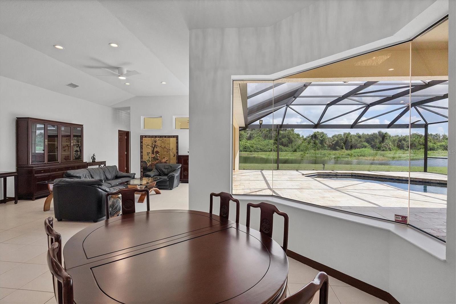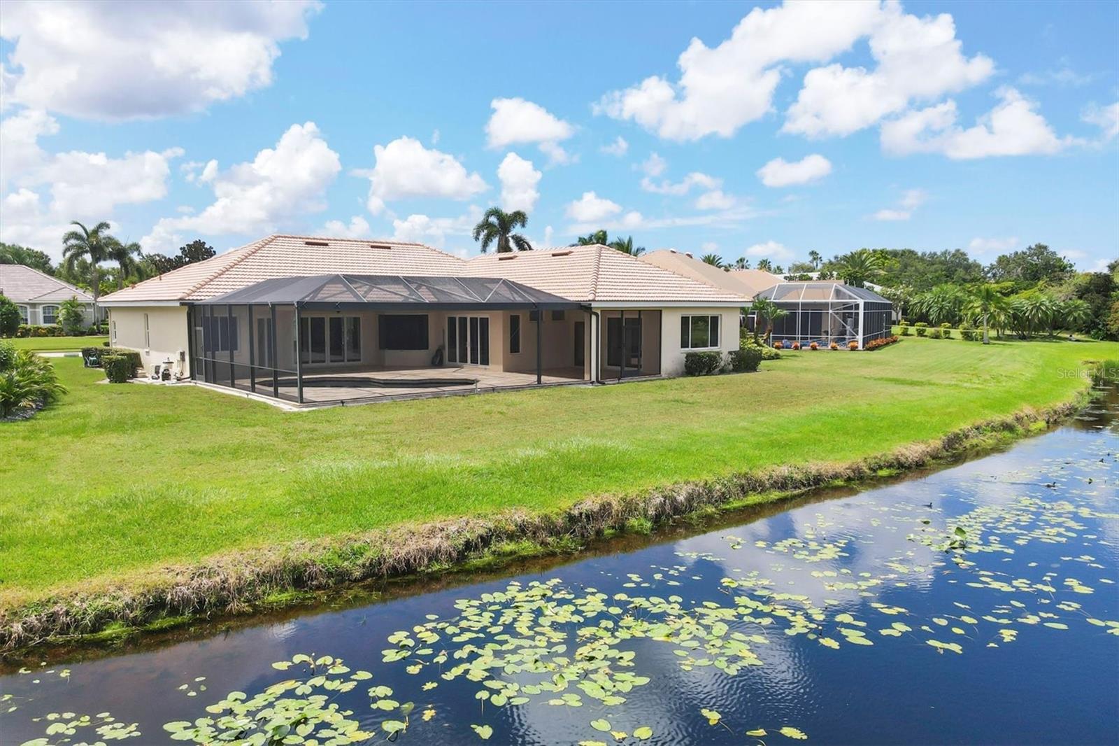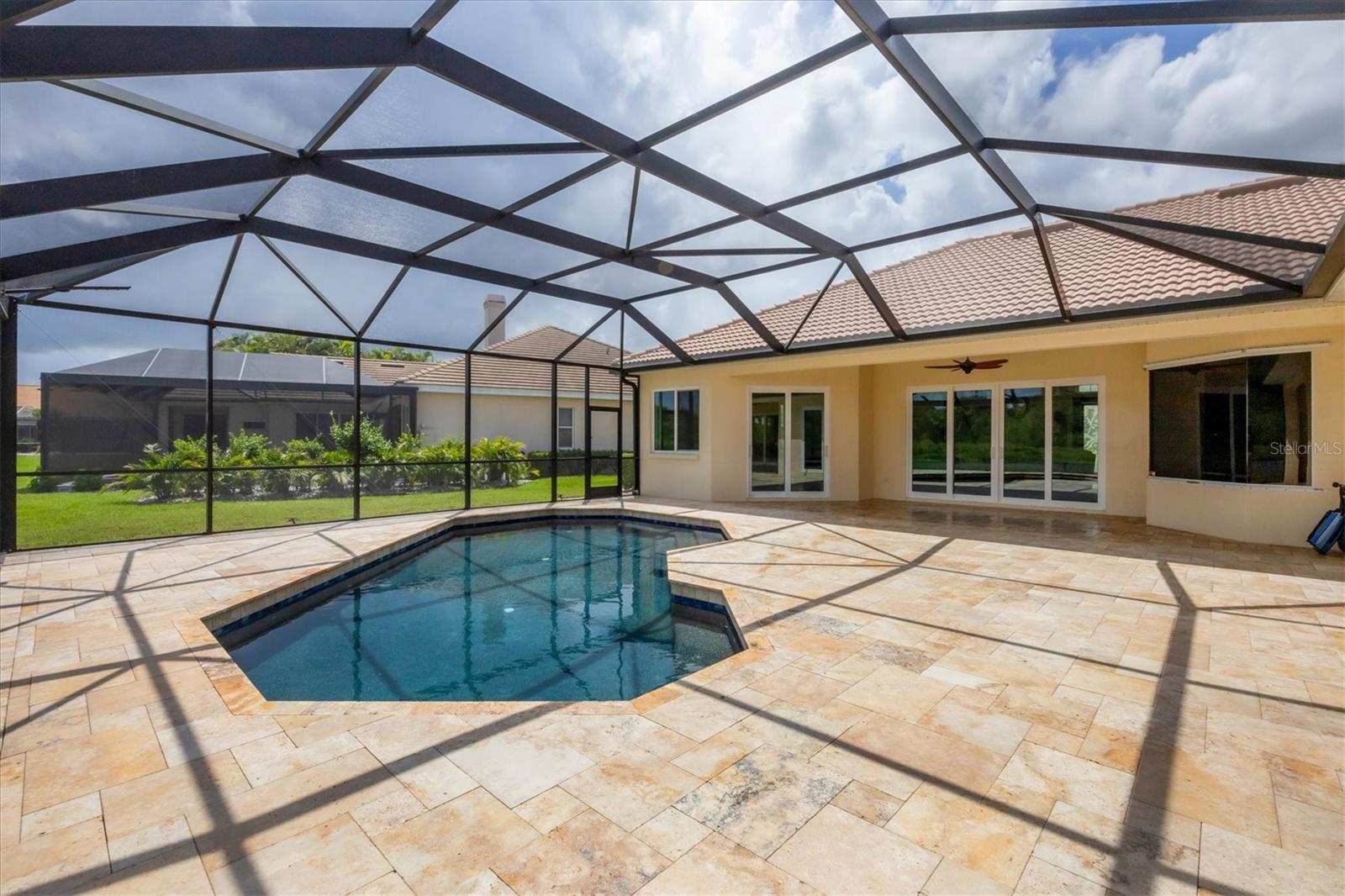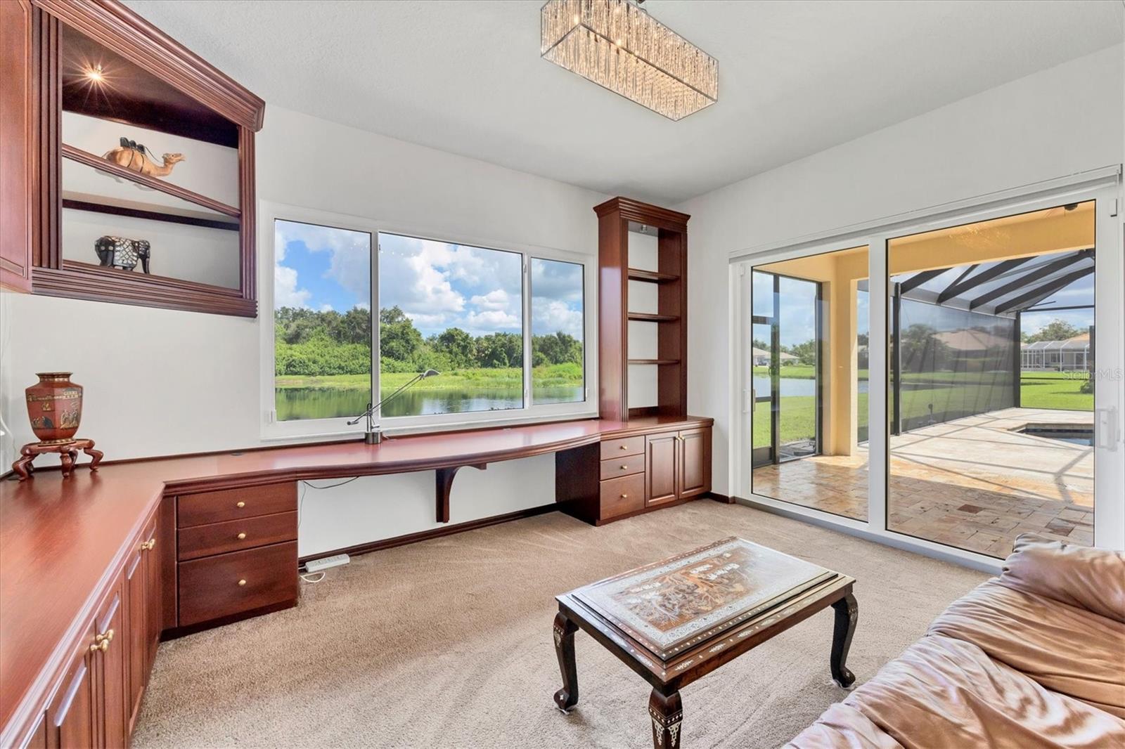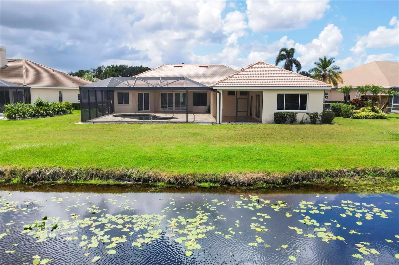 This stunning home is in the popular Mote Ranch, River Bend area. Boasting 2,965 square feet, it features three bedrooms and three baths, and overlooks a calming pond area, providing privacy and beauty. As you enter the home through the double etched doors, you are welcomed into the living room by a stunning view of the pool and pond area. The coffered ceilings in the foyer and den area add an attractive touch to the lofty ceilings and open living space. The den/bonus room boasts plantation shutters. The bright and sunny family room provides ample space for entertainment. The breakfast nook offers space for a table with a bay window overlooking the pool. The family room also features high windows that provide ideal lighting, and double doors that open onto the lanai and pool area. The spacious kitchen offers an abundant area to entertain with ease. The primary bedroom overlooks the oversized lanai and pool and boasts two walk-in closets and a bump-out with plantation shutters for privacy. The generous bath includes a soaking tub, walk-in shower and double sink vanity. The large rear office has stunning built-in cabinetry and generous windows overlooking the pond area. There is a full bath next to the office that can also serve as a pool bath. Two additional bedrooms share a full bath with tub and shower. Opening onto the exceptionally large lanai with travertine, it allows space for an outdoor kitchen. The lovely saltwater pool has been upgraded with new tile surround. This home has received numerous updates, including the lanai area just power washed and sealed. A new roof was installed in 2024, a new water heater in 2023, and new air-conditioning units in 2021 and 2023. Below are renovations completed in 2019. All new hurricane-compliant exterior windows and sliding glass doors were added, along with a new garage door and exterior doors, new lanai pavers, a pool cage, and a screen. The home was painted inside and out, and the pool was resurfaced with new tiles. It also had new carpeting, Samsung refrigerator with computer screen, dishwasher and stove. The location in Mote Ranch is ideal for access to shopping, restaurants, SRQ airport and more. There are no CDD fees in the neighborhood and low HOA fees. Mote Ranch features a junior-sized Olympic pool, a playground, and access to the Braden River for canoeing or kayaking. It has lofty ceilings and features that allow for the best lifestyle and convenience.