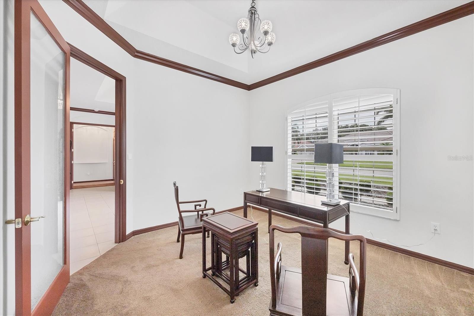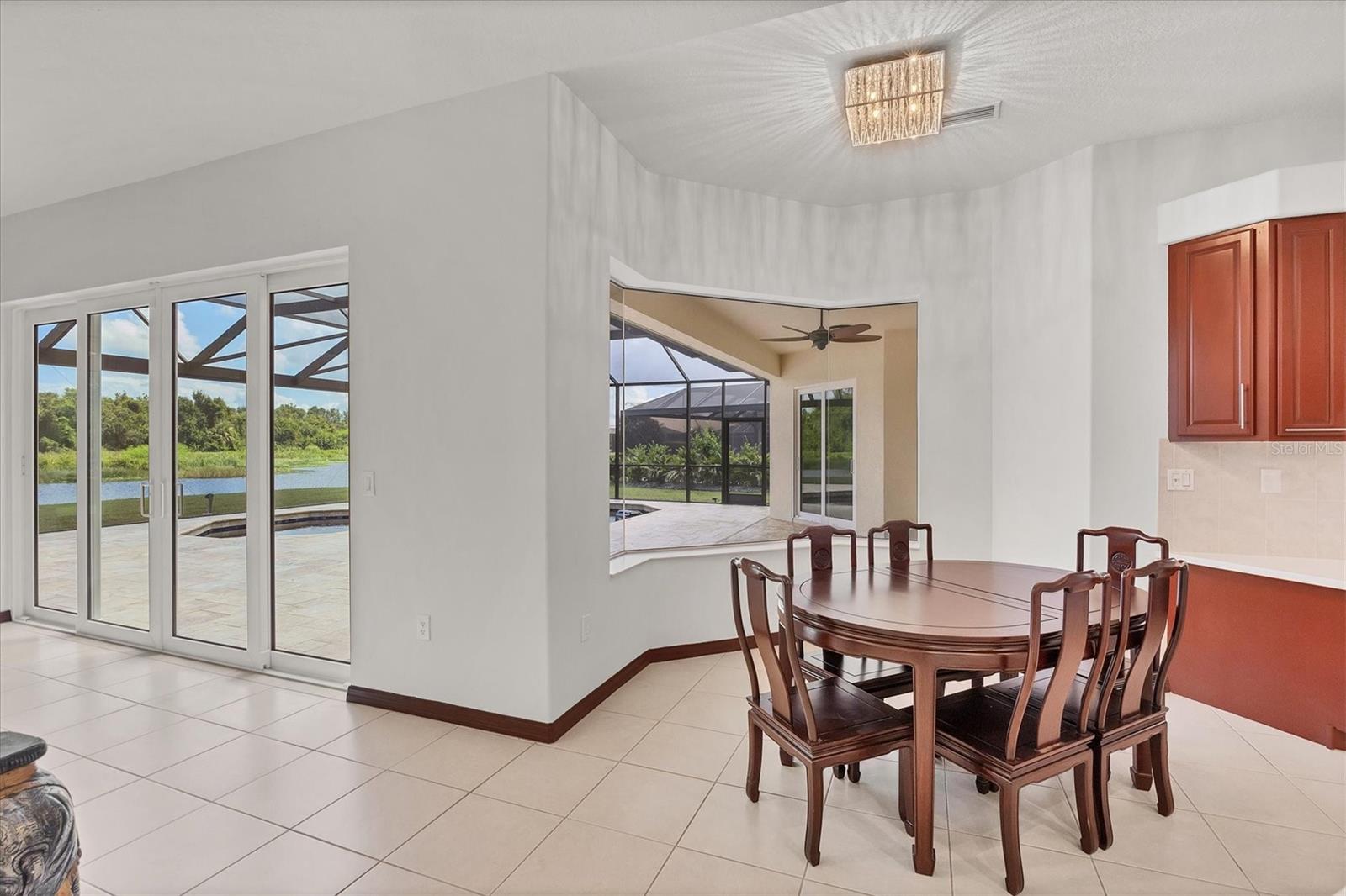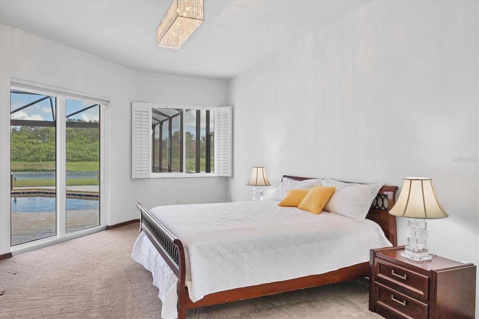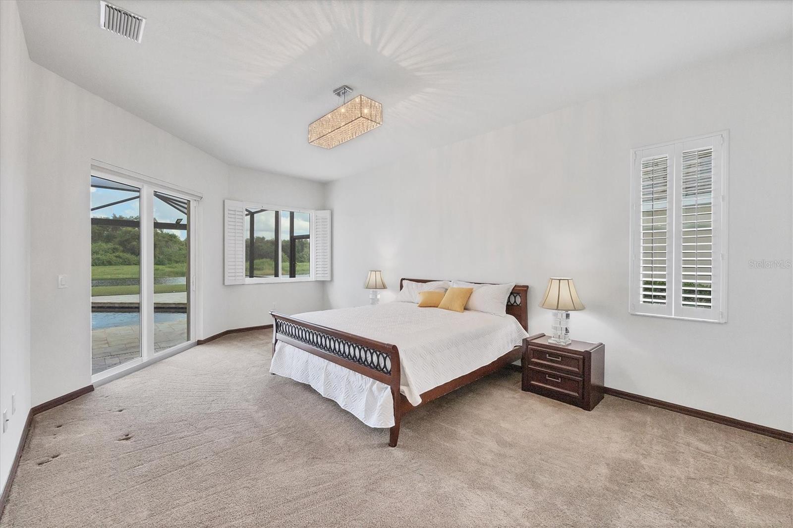 This stunning home is in the popular Mote Ranch, River Bend area. Boasting 2,965 square feet, it features three bedrooms and three baths, and overlooks a calming pond area, providing privacy and beauty. As you enter the home through the double etched doors, you are welcomed into the living room by a stunning view of the pool and pond area. The coffered ceilings in the foyer and den area add an attractive touch to the lofty ceilings and open living space. The den/bonus room boasts plantation shutters. The bright and sunny family room provides ample space for entertainment. The breakfast nook offers space for a table with a bay window overlooking the pool. The family room also features high windows that provide ideal lighting, and double doors that open onto the lanai and pool area. The spacious kitchen offers an abundant area to entertain with ease. The primary bedroom overlooks the oversized lanai and pool and boasts two walk-in closets and a bump-out with plantation shutters for privacy. The generous bath includes a soaking tub, walk-in shower and double sink vanity. The large rear office has stunning built-in cabinetry and generous windows overlooking the pond area. There is a full bath next to the office that can also serve as a pool bath. Two additional bedrooms share a full bath with tub and shower. Opening onto the exceptionally large lanai with travertine, it allows space for an outdoor kitchen. The lovely saltwater pool has been upgraded with new tile surround. This home has received numerous updates, including the lanai area just power washed and sealed. A new roof was installed in 2024, a new water heater in 2023, and new air-conditioning units in 2021 and 2023. Below are renovations completed in 2019. All new hurricane-compliant exterior windows and sliding glass doors were added, along with a new garage door and exterior doors, new lanai pavers, a pool cage, and a screen. The home was painted inside and out, and the pool was resurfaced with new tiles. It also had new carpeting, Samsung refrigerator with computer screen, dishwasher and stove. The location in Mote Ranch is ideal for access to shopping, restaurants, SRQ airport and more. There are no CDD fees in the neighborhood and low HOA fees. Mote Ranch features a junior-sized Olympic pool, a playground, and access to the Braden River for canoeing or kayaking. It has lofty ceilings and features that allow for the best lifestyle and convenience.