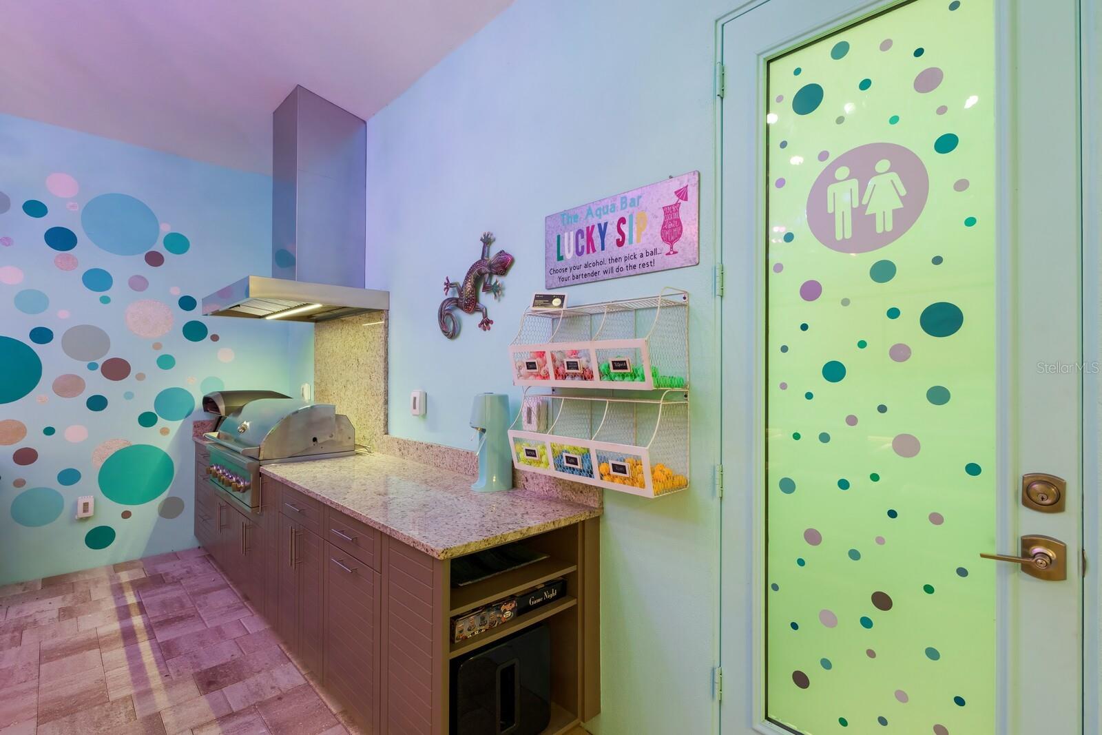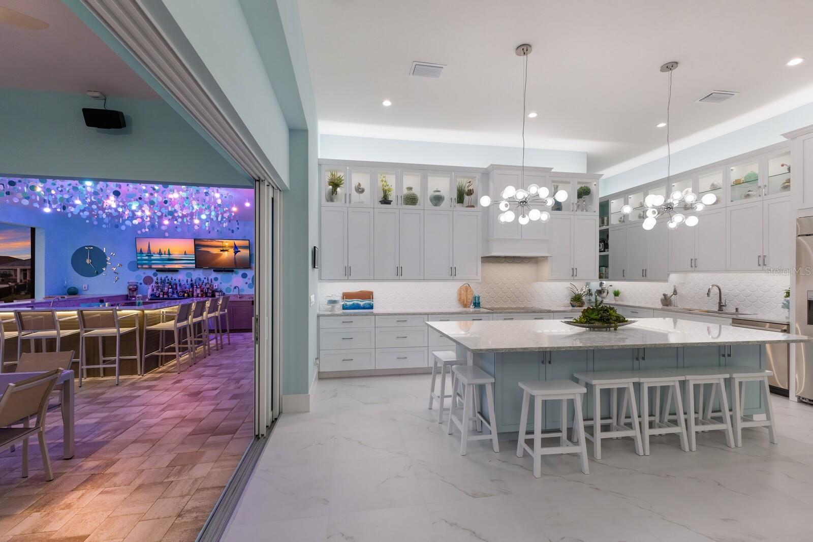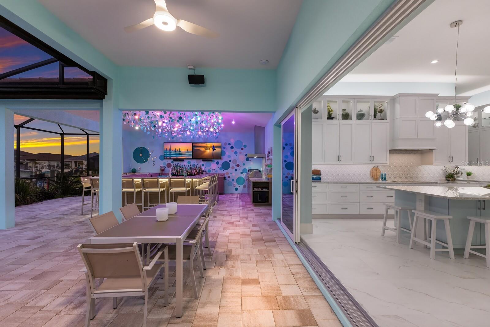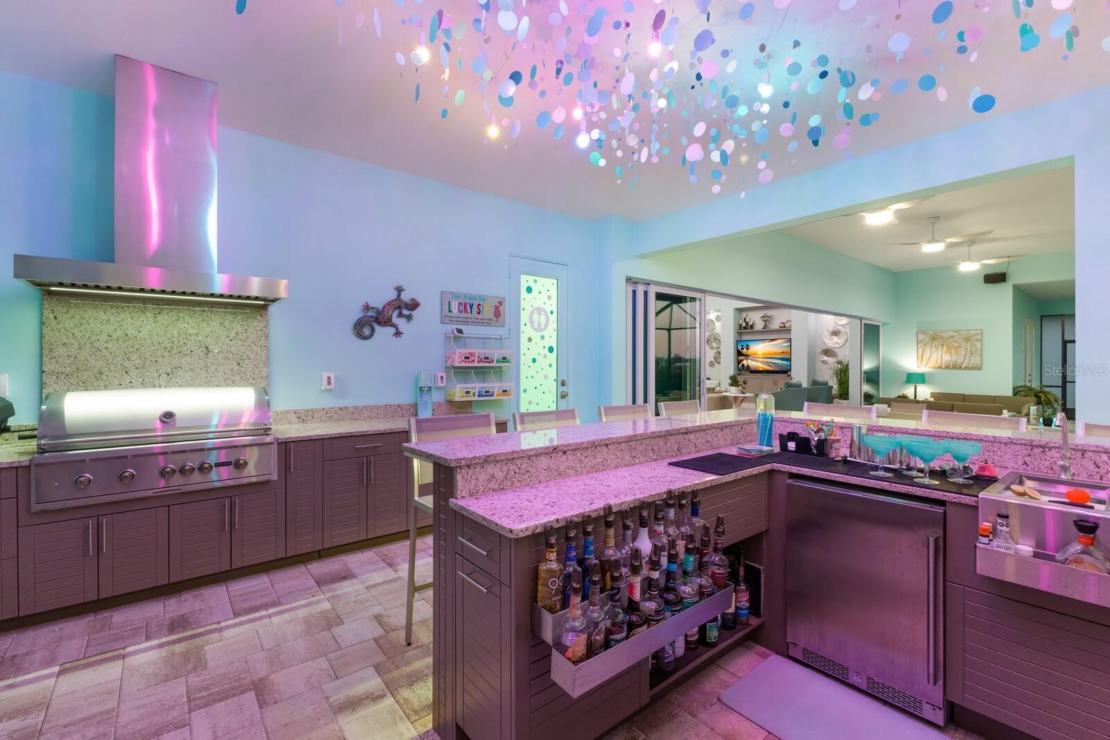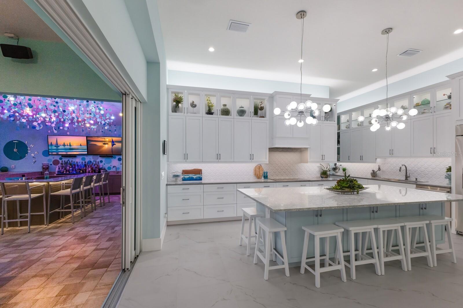 Exterior: French Doors, Outdoor Grill, Outdoor Kitchen, Rain Gutters, Sidewalk, Sliding Doors