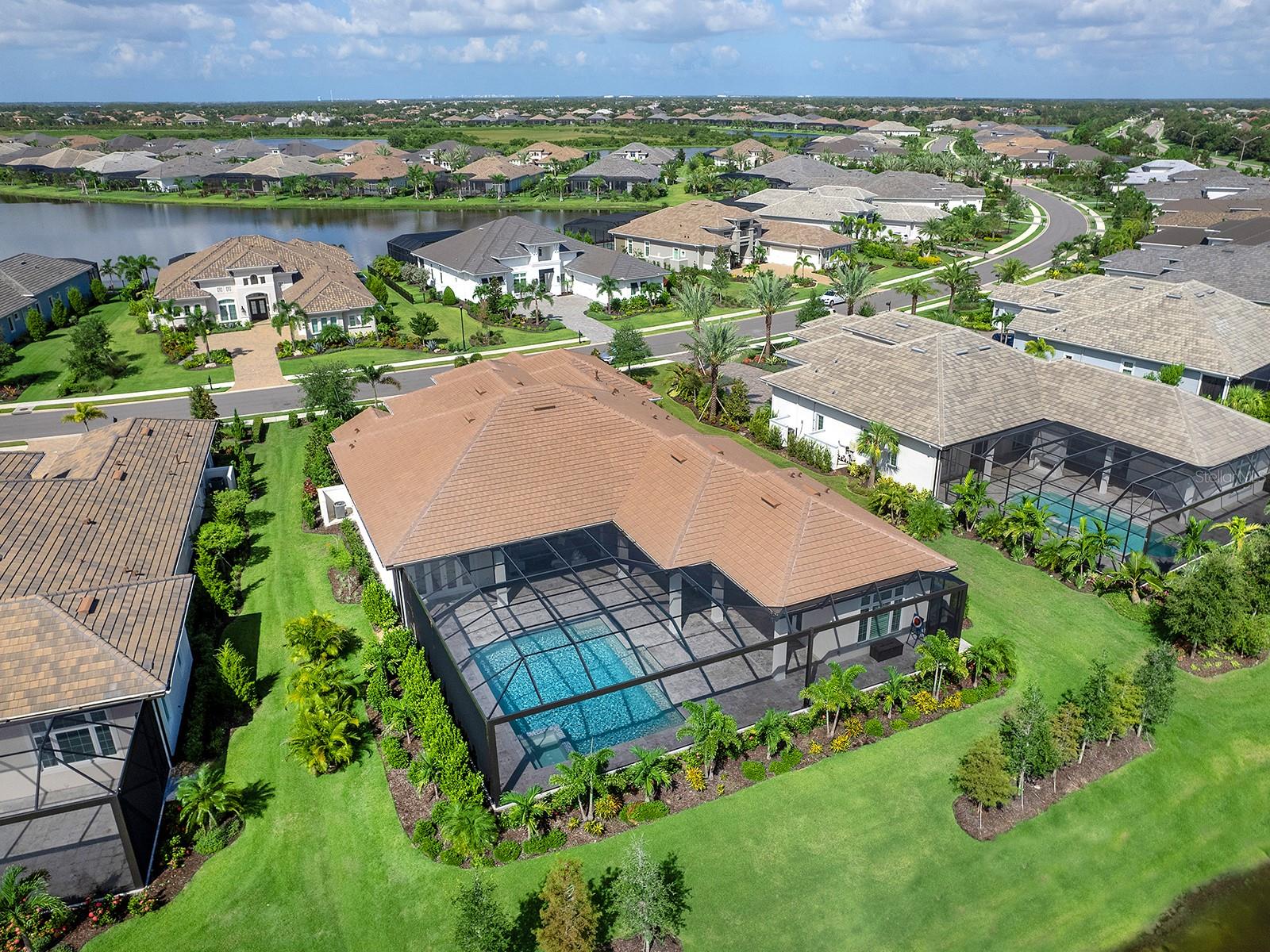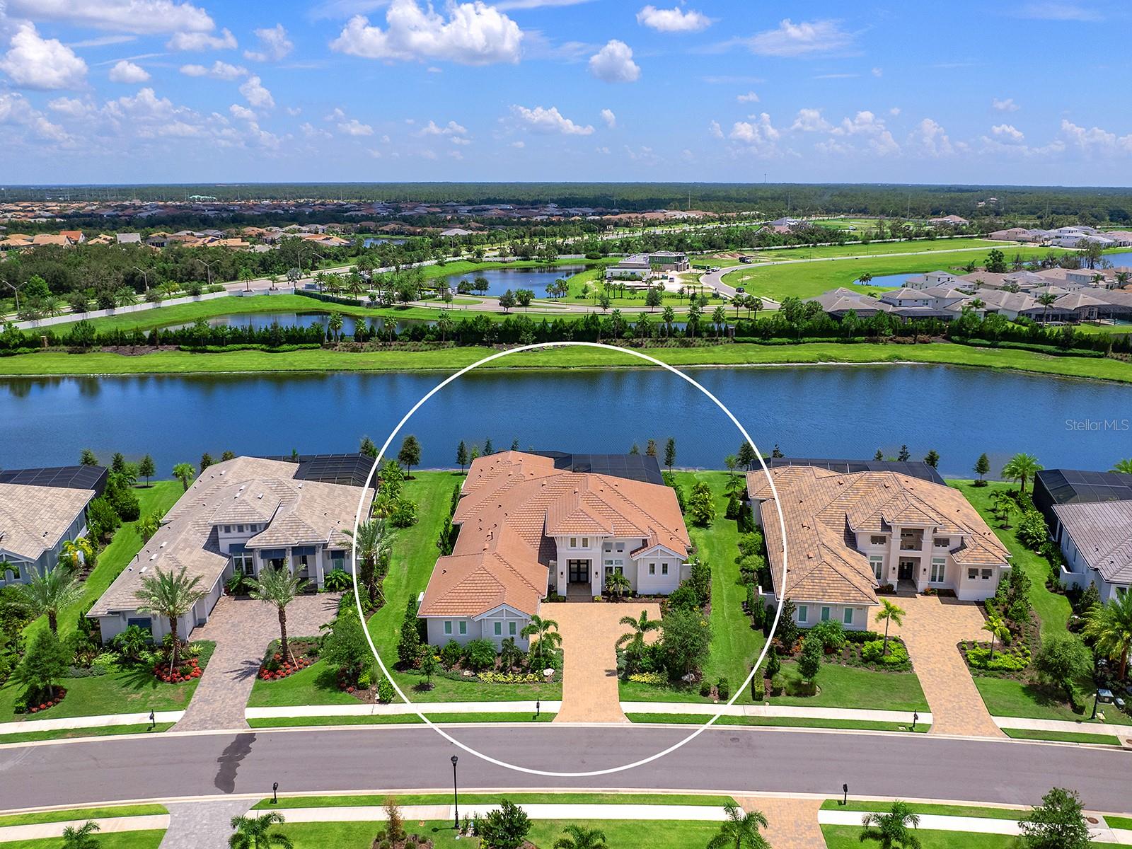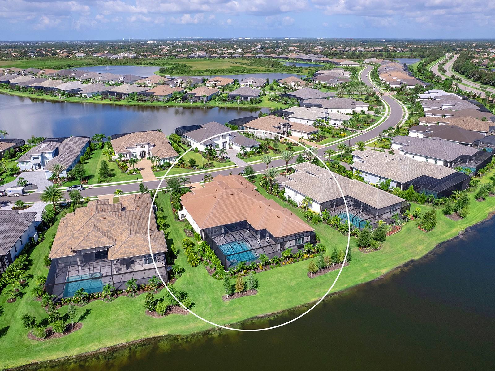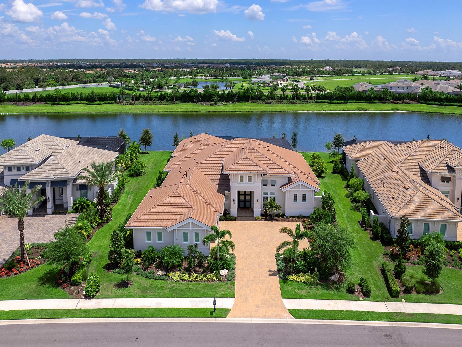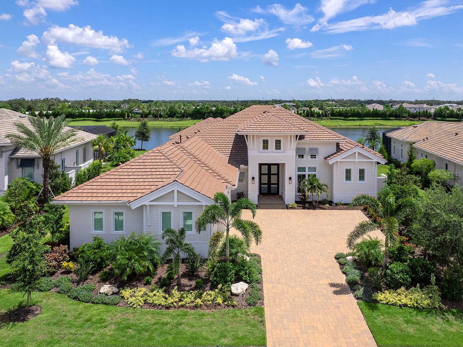 Welcome home to the ideal residence in The Lake Club with gorgeous private water views! One of the most desirable floor plans is this 2023 home offering a coveted separate casita guest house, plus a modern open plan, luxurious primary suite, 3 additional guest bedrooms all with private en-suite bathrooms, study, and expansive air-conditioned 3-car garage. The exterior invites you home with 2025 freshly painted exterior, updated lush landscaping, and wide driveway with parking pad. This residence is filled with clever upgrades that make daily life more enjoyable including IMPACT windows and sliders throughout, security camera system, Wi-Fi extenders, in-ceiling speakers, whole-house water filtration and softener system, Lutron lights, smart home systems, plantation shutters, and wood-look porcelain tile flooring throughout. The great room opens from the foyer with frosted impact glass front door straight onto the lanai through pocketing impact sliding glass doors, offering immediate views of the lake and greenspace beyond, plus a custom ceiling with hand-stained wood beams. The chef's kitchen offers impressive upgrades with an expanded island for extra seating, upscale quartzite counters, custom cabinetry, reverse osmosis, TWO custom walk-in pantries, and high-end appliance suite with 36" side-by-side Sub-Zero refrigerator and freezer, Bosch dishwasher, Wolf dual wall ovens, Wolf gas cooktop and Wolf microwave drawer. Enjoy meals in the dining room featuring a custom dry bar with wine refrigerator and disappearing corner impact sliders. This Florida home was made for an ideal indoor-outdoor entertaining lifestyle with covered dining and living areas on one of the largest lanais in the neighborhood at 3,382 SF. Relax under tray ceilings with oversized modern fans on the travertine lanai; lounge in the sunshine surrounded by the 2024 panoramic extra-strong stainless steel screen enclosure; or dine next to the outdoor kitchen complete with island, stone counters, reverse osmosis, and high-end appliances including Wolf grill, U-Line beverage refrigerator, separate ice maker and Bosch dishwasher. The sparkling saltwater pool is oversized, perfect for swimming laps or splashing in the afternoon, and features a sunken spa with spill-edge perfectly positioned to take in the lake views. Inside the owner's suite offers the ultimate relaxation with tray ceiling, seating area, French doors to the lanai with a porch area and two custom walk-in closets. The primary bathroom rivals a five-star hotel with separate vanities, large linen storage tower, water closet with Toto toilet, freestanding modern tub, walk-in shower with rainhead and 4 body sprayers. Guests will enjoy their own 3 bedrooms all with their own private and luxurious en-suite bathrooms. Plus the rear bedroom can be used as bonus room with a full pool bathroom for even more flexible spaces. The guest house casita is ideal for long-term guests, teens, live-in assistance, an in-law suite or a second office with a large studio bedroom, kitchenette wet bar, private lanai area and en-suite bathroom. Completing this residence is a private study, spacious laundry room with hidden ironing board and guest powder bathroom. The air-conditioned and insulated 3-car garage offers expanded room for cars and toys, 2 AC splitters, custom storage and a dual electric car charger. The Lake Club is an exclusive premier, gated community with a Grande Clubhouse, restaurant, pool, tennis, pickleball and more.