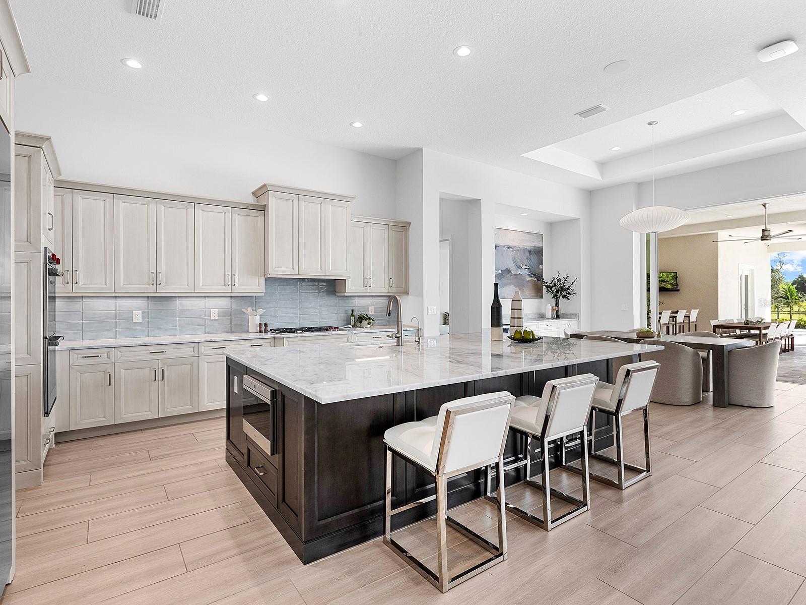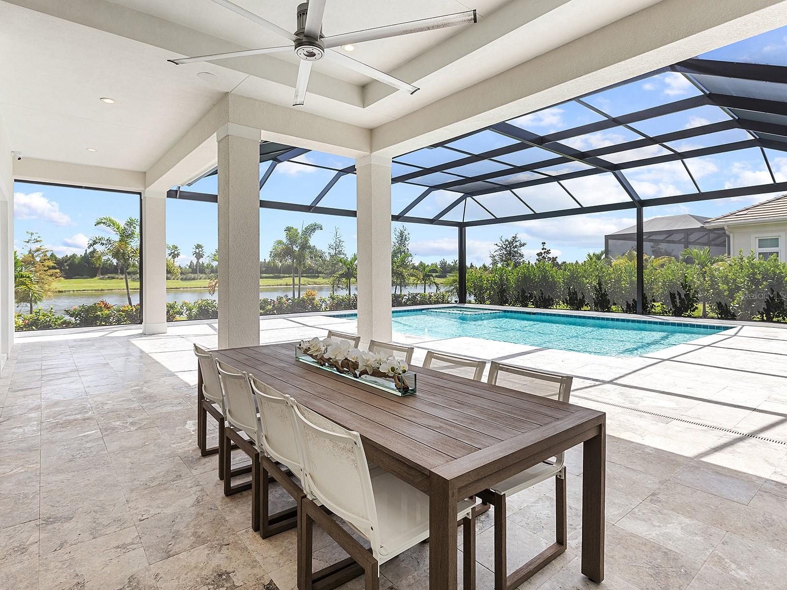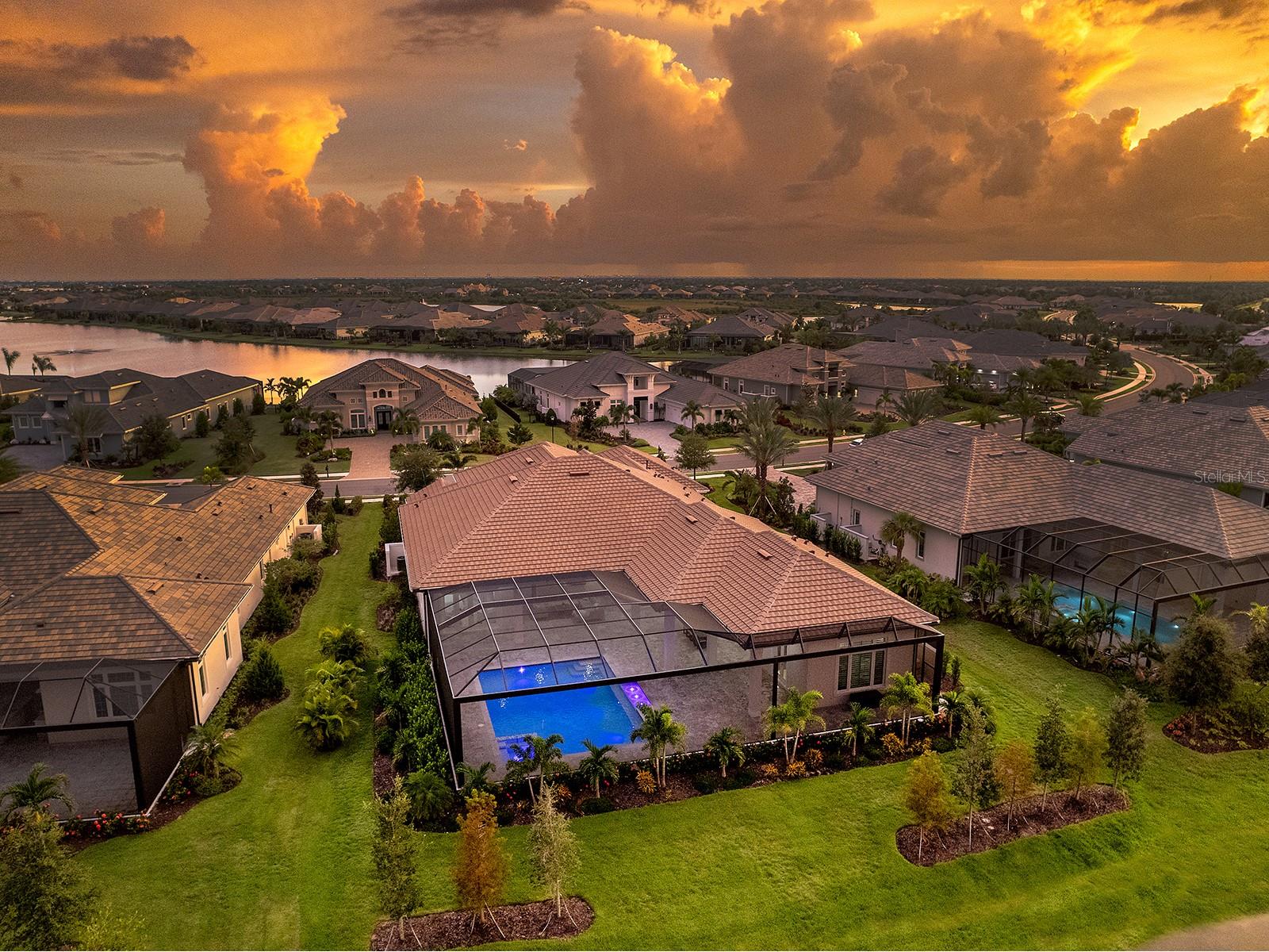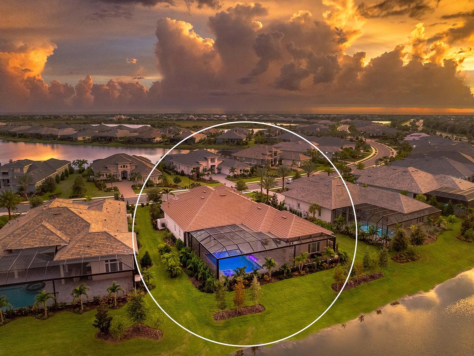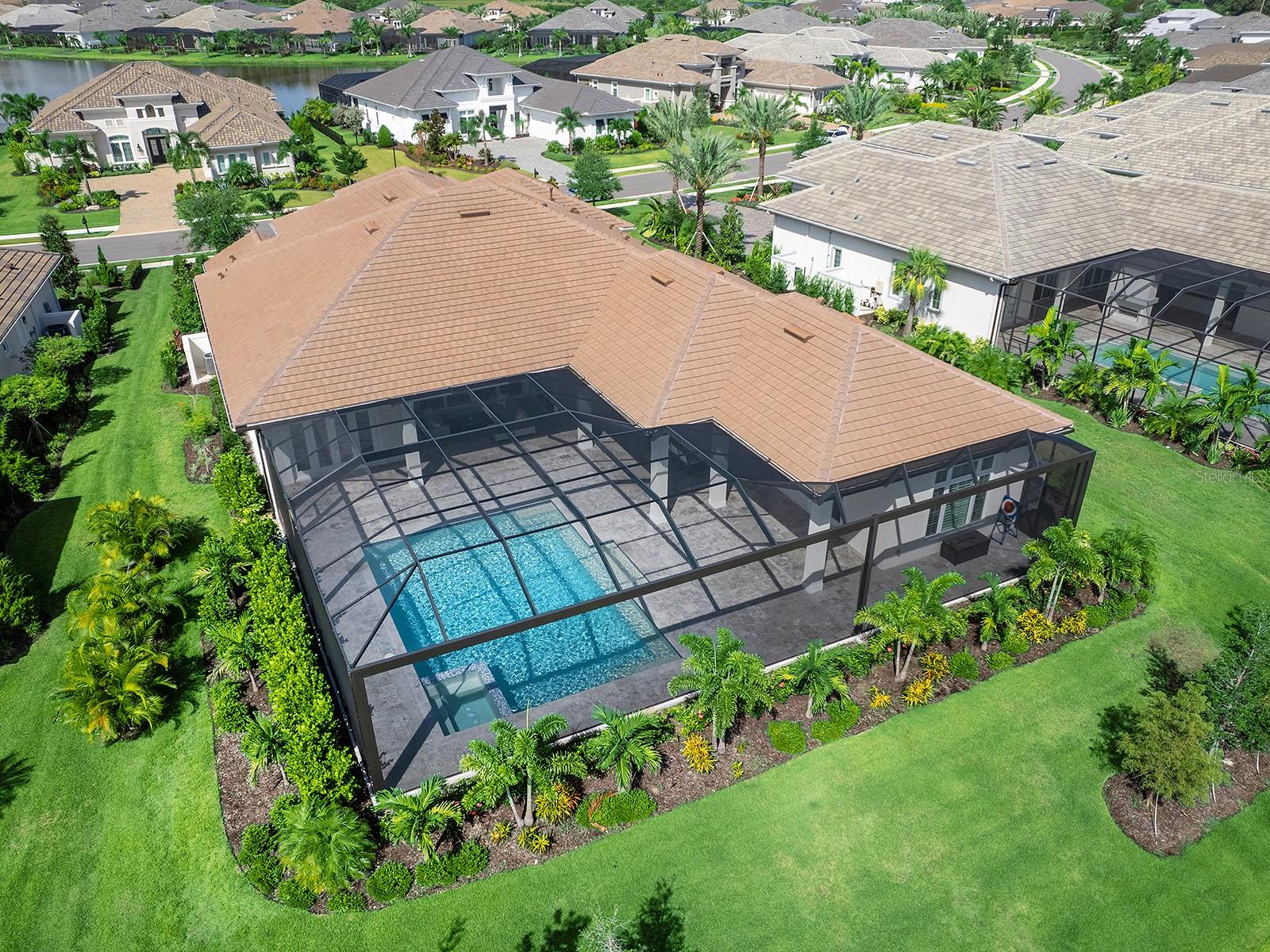 Welcome home to the ideal residence in The Lake Club with gorgeous private water views! One of the most desirable floor plans is this 2023 home offering a coveted separate casita guest house, plus a modern open plan, luxurious primary suite, 3 additional guest bedrooms all with private en-suite bathrooms, study, and expansive air-conditioned 3-car garage. The exterior invites you home with 2025 freshly painted exterior, updated lush landscaping, and wide driveway with parking pad. This residence is filled with clever upgrades that make daily life more enjoyable including IMPACT windows and sliders throughout, security camera system, Wi-Fi extenders, in-ceiling speakers, whole-house water filtration and softener system, Lutron lights, smart home systems, plantation shutters, and wood-look porcelain tile flooring throughout. The great room opens from the foyer with frosted impact glass front door straight onto the lanai through pocketing impact sliding glass doors, offering immediate views of the lake and greenspace beyond, plus a custom ceiling with hand-stained wood beams. The chef's kitchen offers impressive upgrades with an expanded island for extra seating, upscale quartzite counters, custom cabinetry, reverse osmosis, TWO custom walk-in pantries, and high-end appliance suite with 36" side-by-side Sub-Zero refrigerator and freezer, Bosch dishwasher, Wolf dual wall ovens, Wolf gas cooktop and Wolf microwave drawer. Enjoy meals in the dining room featuring a custom dry bar with wine refrigerator and disappearing corner impact sliders. This Florida home was made for an ideal indoor-outdoor entertaining lifestyle with covered dining and living areas on one of the largest lanais in the neighborhood at 3,382 SF. Relax under tray ceilings with oversized modern fans on the travertine lanai; lounge in the sunshine surrounded by the 2024 panoramic extra-strong stainless steel screen enclosure; or dine next to the outdoor kitchen complete with island, stone counters, reverse osmosis, and high-end appliances including Wolf grill, U-Line beverage refrigerator, separate ice maker and Bosch dishwasher. The sparkling saltwater pool is oversized, perfect for swimming laps or splashing in the afternoon, and features a sunken spa with spill-edge perfectly positioned to take in the lake views. Inside the owner's suite offers the ultimate relaxation with tray ceiling, seating area, French doors to the lanai with a porch area and two custom walk-in closets. The primary bathroom rivals a five-star hotel with separate vanities, large linen storage tower, water closet with Toto toilet, freestanding modern tub, walk-in shower with rainhead and 4 body sprayers. Guests will enjoy their own 3 bedrooms all with their own private and luxurious en-suite bathrooms. Plus the rear bedroom can be used as bonus room with a full pool bathroom for even more flexible spaces. The guest house casita is ideal for long-term guests, teens, live-in assistance, an in-law suite or a second office with a large studio bedroom, kitchenette wet bar, private lanai area and en-suite bathroom. Completing this residence is a private study, spacious laundry room with hidden ironing board and guest powder bathroom. The air-conditioned and insulated 3-car garage offers expanded room for cars and toys, 2 AC splitters, custom storage and a dual electric car charger. The Lake Club is an exclusive premier, gated community with a Grande Clubhouse, restaurant, pool, tennis, pickleball and more.