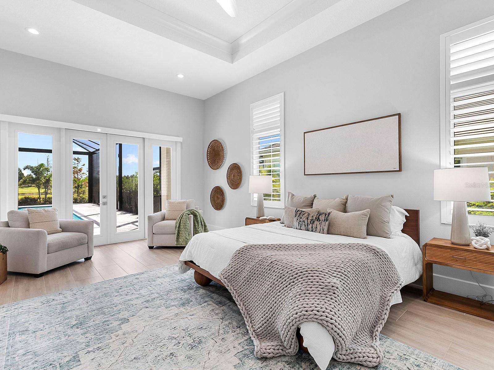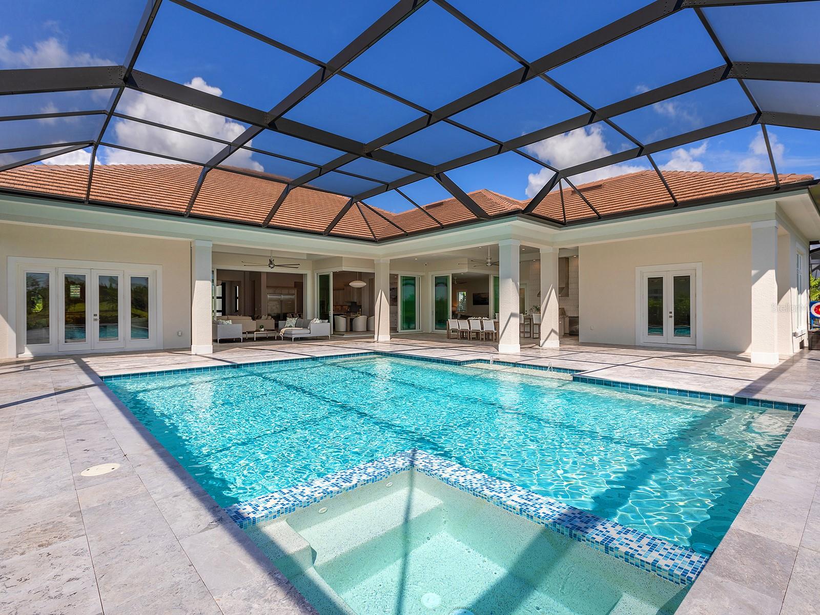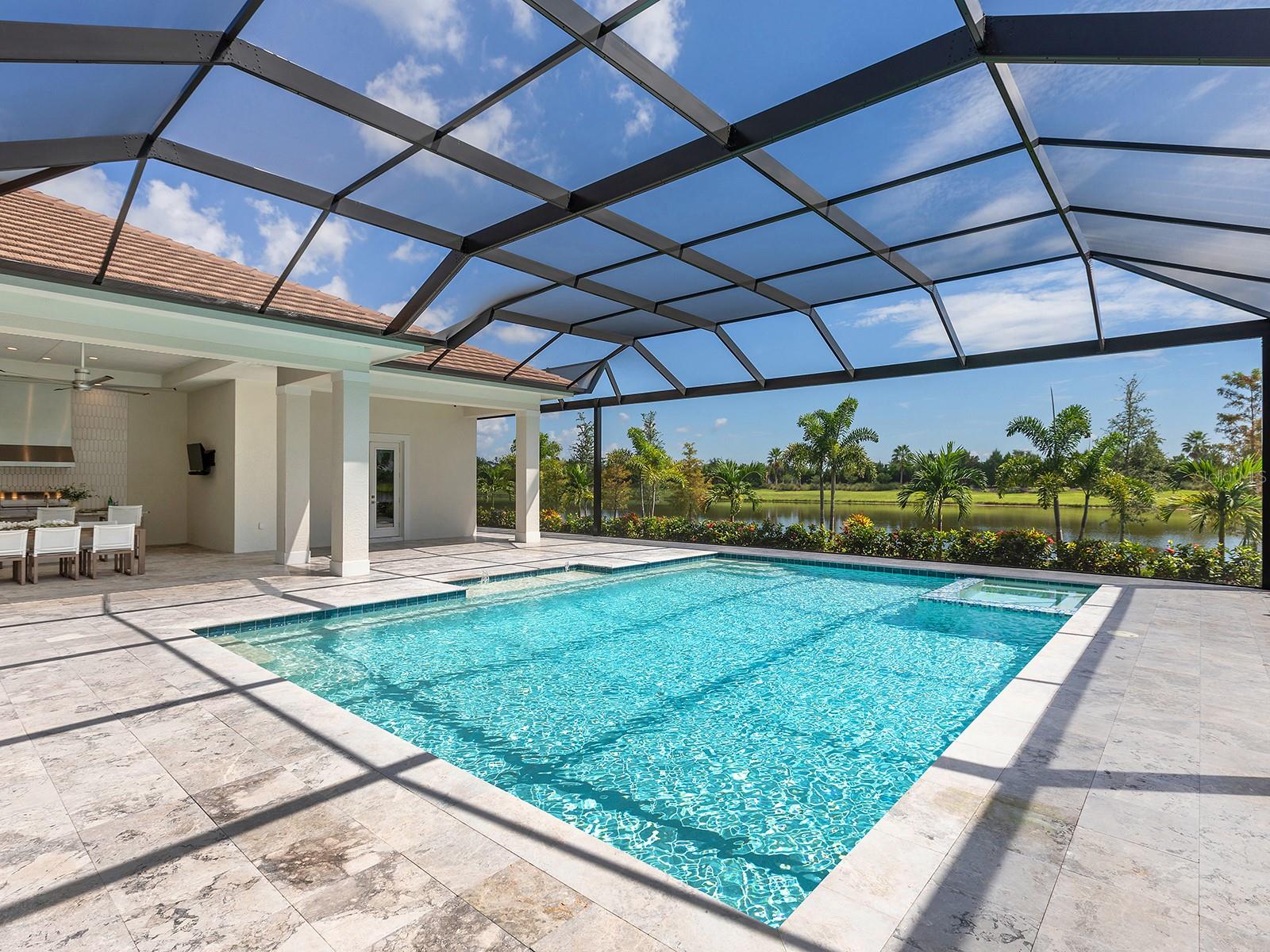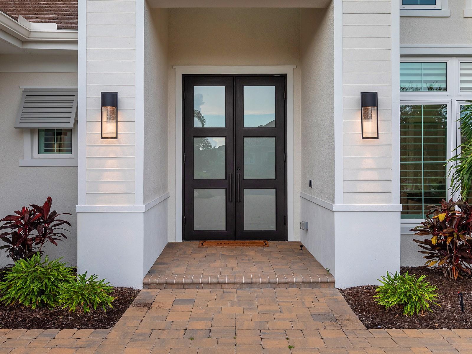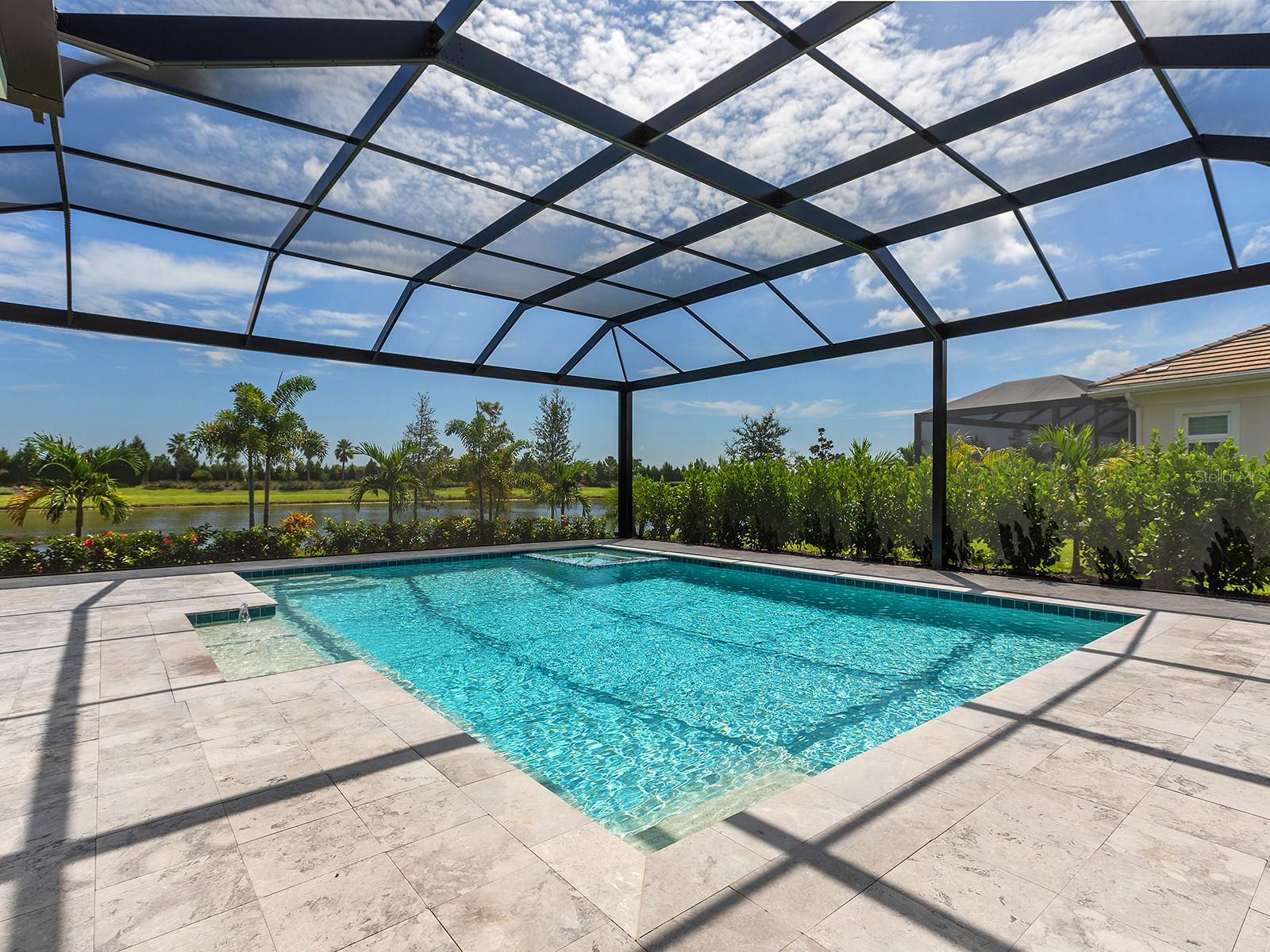Welcome home to the ideal residence in The Lake Club with gorgeous private water views! One of the most desirable floor plans is this 2023 home offering a coveted separate casita guest house, plus a modern open plan, luxurious primary suite, 3 additional guest bedrooms all with private en-suite bathrooms, study, and expansive air-conditioned 3-car garage. The exterior invites you home with 2025 freshly painted exterior, updated lush landscaping, and wide driveway with parking pad. This residence is filled with clever upgrades that make daily life more enjoyable including IMPACT windows and sliders throughout, security camera system, Wi-Fi extenders, in-ceiling speakers, whole-house water filtration and softener system, Lutron lights, smart home systems, plantation shutters, and wood-look porcelain tile flooring throughout. The great room opens from the foyer with frosted impact glass front door straight onto the lanai through pocketing impact sliding glass doors, offering immediate views of the lake and greenspace beyond, plus a custom ceiling with hand-stained wood beams. The chef's kitchen offers impressive upgrades with an expanded island for extra seating, upscale quartzite counters, custom cabinetry, reverse osmosis, TWO custom walk-in pantries, and high-end appliance suite with 36" side-by-side Sub-Zero refrigerator and freezer, Bosch dishwasher, Wolf dual wall ovens, Wolf gas cooktop and Wolf microwave drawer. Enjoy meals in the dining room featuring a custom dry bar with wine refrigerator and disappearing corner impact sliders. This Florida home was made for an ideal indoor-outdoor entertaining lifestyle with covered dining and living areas on one of the largest lanais in the neighborhood at 3,382 SF. Relax under tray ceilings with oversized modern fans on the travertine lanai; lounge in the sunshine surrounded by the 2024 panoramic extra-strong stainless steel screen enclosure; or dine next to the outdoor kitchen complete with island, stone counters, reverse osmosis, and high-end appliances including Wolf grill, U-Line beverage refrigerator, separate ice maker and Bosch dishwasher. The sparkling saltwater pool is oversized, perfect for swimming laps or splashing in the afternoon, and features a sunken spa with spill-edge perfectly positioned to take in the lake views. Inside the owner's suite offers the ultimate relaxation with tray ceiling, seating area, French doors to the lanai with a porch area and two custom walk-in closets. The primary bathroom rivals a five-star hotel with separate vanities, large linen storage tower, water closet with Toto toilet, freestanding modern tub, walk-in shower with rainhead and 4 body sprayers. Guests will enjoy their own 3 bedrooms all with their own private and luxurious en-suite bathrooms. Plus the rear bedroom can be used as bonus room with a full pool bathroom for even more flexible spaces. The guest house casita is ideal for long-term guests, teens, live-in assistance, an in-law suite or a second office with a large studio bedroom, kitchenette wet bar, private lanai area and en-suite bathroom. Completing this residence is a private study, spacious laundry room with hidden ironing board and guest powder bathroom. The air-conditioned and insulated 3-car garage offers expanded room for cars and toys, 2 AC splitters, custom storage and a dual electric car charger. The Lake Club is an exclusive premier, gated community with a Grande Clubhouse, restaurant, pool, tennis, pickleball and more.