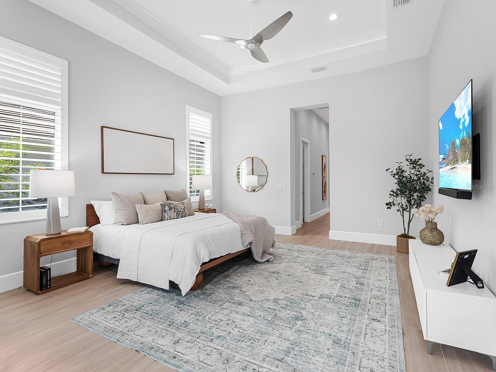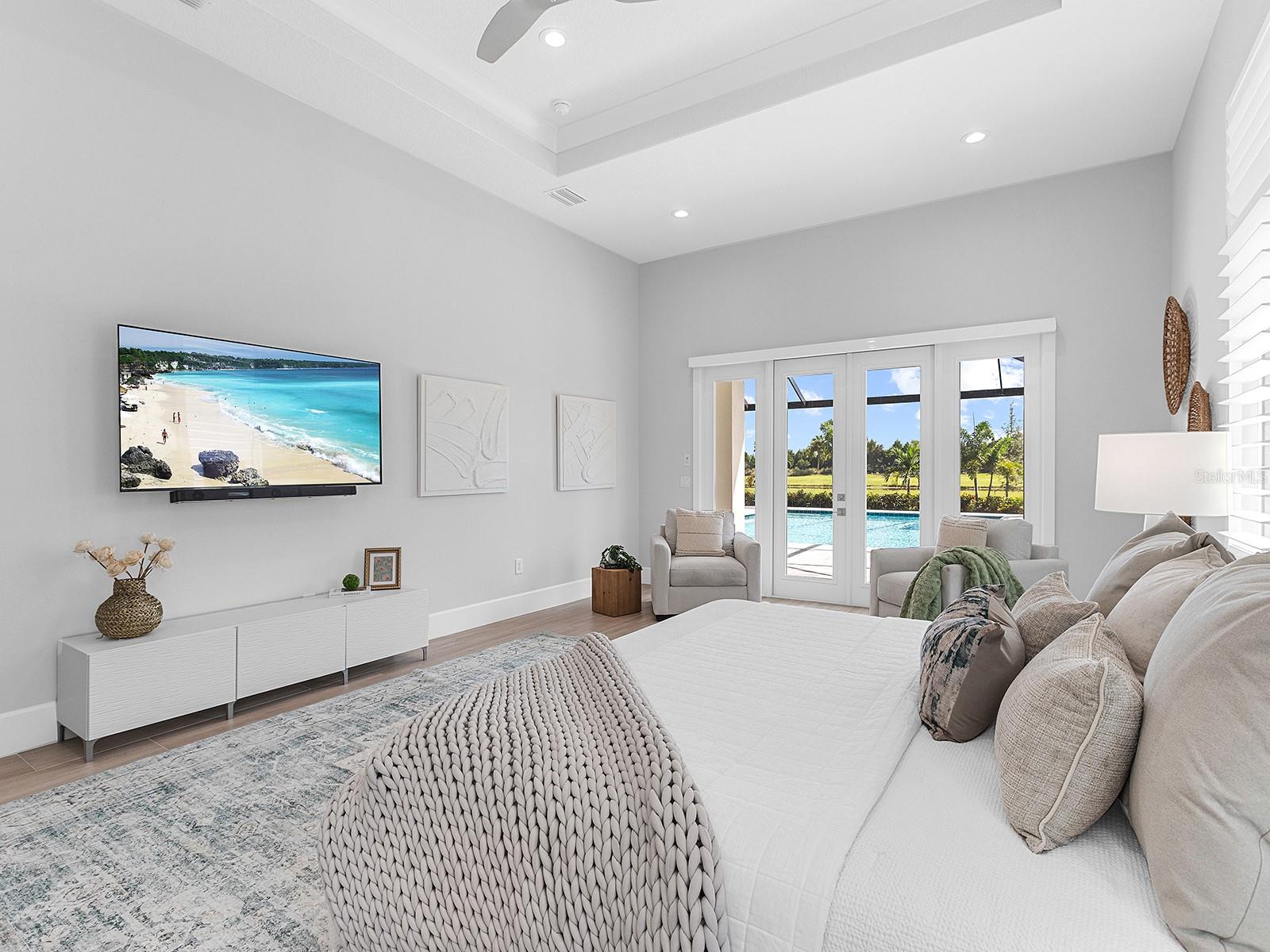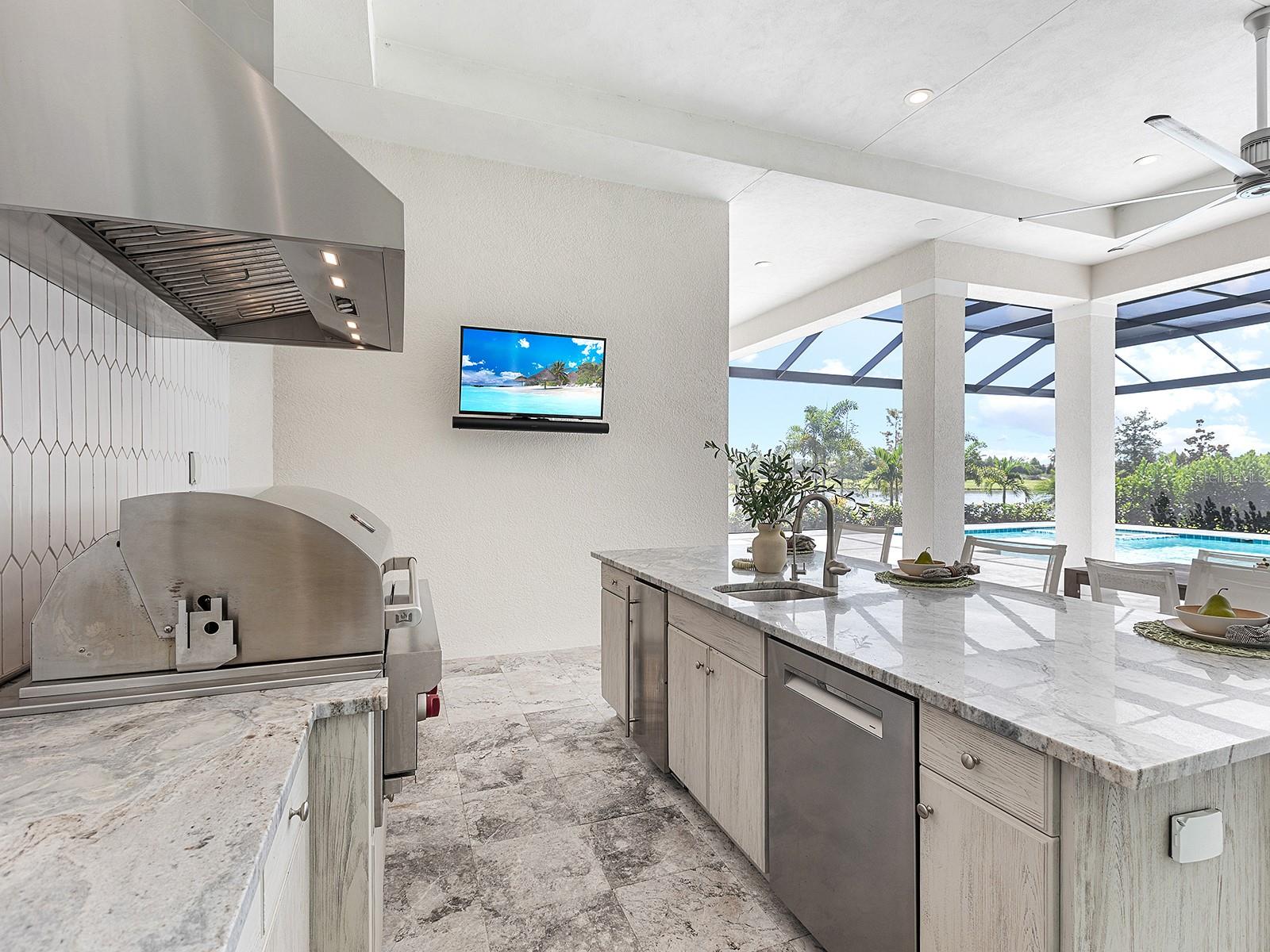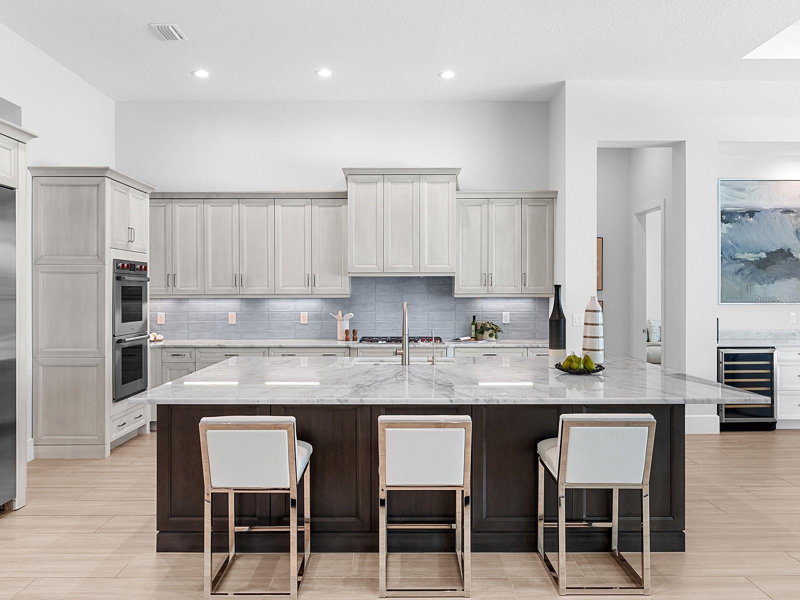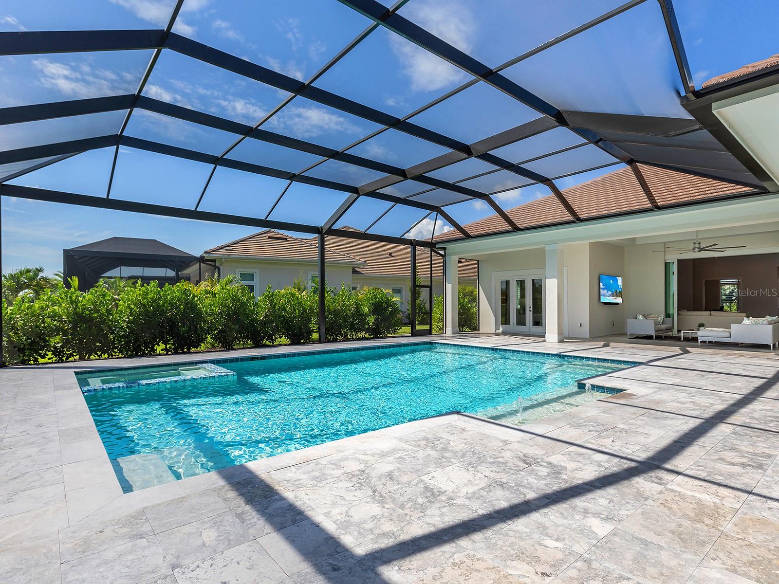 Welcome home to the ideal residence in The Lake Club with gorgeous private water views! One of the most desirable floor plans is this 2023 home offering a coveted separate casita guest house, plus a modern open plan, luxurious primary suite, 3 additional guest bedrooms all with private en-suite bathrooms, study, and expansive air-conditioned 3-car garage. The exterior invites you home with 2025 freshly painted exterior, updated lush landscaping, and wide driveway with parking pad. This residence is filled with clever upgrades that make daily life more enjoyable including IMPACT windows and sliders throughout, security camera system, Wi-Fi extenders, in-ceiling speakers, whole-house water filtration and softener system, Lutron lights, smart home systems, plantation shutters, and wood-look porcelain tile flooring throughout. The great room opens from the foyer with frosted impact glass front door straight onto the lanai through pocketing impact sliding glass doors, offering immediate views of the lake and greenspace beyond, plus a custom ceiling with hand-stained wood beams. The chef's kitchen offers impressive upgrades with an expanded island for extra seating, upscale quartzite counters, custom cabinetry, reverse osmosis, TWO custom walk-in pantries, and high-end appliance suite with 36" side-by-side Sub-Zero refrigerator and freezer, Bosch dishwasher, Wolf dual wall ovens, Wolf gas cooktop and Wolf microwave drawer. Enjoy meals in the dining room featuring a custom dry bar with wine refrigerator and disappearing corner impact sliders. This Florida home was made for an ideal indoor-outdoor entertaining lifestyle with covered dining and living areas on one of the largest lanais in the neighborhood at 3,382 SF. Relax under tray ceilings with oversized modern fans on the travertine lanai; lounge in the sunshine surrounded by the 2024 panoramic extra-strong stainless steel screen enclosure; or dine next to the outdoor kitchen complete with island, stone counters, reverse osmosis, and high-end appliances including Wolf grill, U-Line beverage refrigerator, separate ice maker and Bosch dishwasher. The sparkling saltwater pool is oversized, perfect for swimming laps or splashing in the afternoon, and features a sunken spa with spill-edge perfectly positioned to take in the lake views. Inside the owner's suite offers the ultimate relaxation with tray ceiling, seating area, French doors to the lanai with a porch area and two custom walk-in closets. The primary bathroom rivals a five-star hotel with separate vanities, large linen storage tower, water closet with Toto toilet, freestanding modern tub, walk-in shower with rainhead and 4 body sprayers. Guests will enjoy their own 3 bedrooms all with their own private and luxurious en-suite bathrooms. Plus the rear bedroom can be used as bonus room with a full pool bathroom for even more flexible spaces. The guest house casita is ideal for long-term guests, teens, live-in assistance, an in-law suite or a second office with a large studio bedroom, kitchenette wet bar, private lanai area and en-suite bathroom. Completing this residence is a private study, spacious laundry room with hidden ironing board and guest powder bathroom. The air-conditioned and insulated 3-car garage offers expanded room for cars and toys, 2 AC splitters, custom storage and a dual electric car charger. The Lake Club is an exclusive premier, gated community with a Grande Clubhouse, restaurant, pool, tennis, pickleball and more.