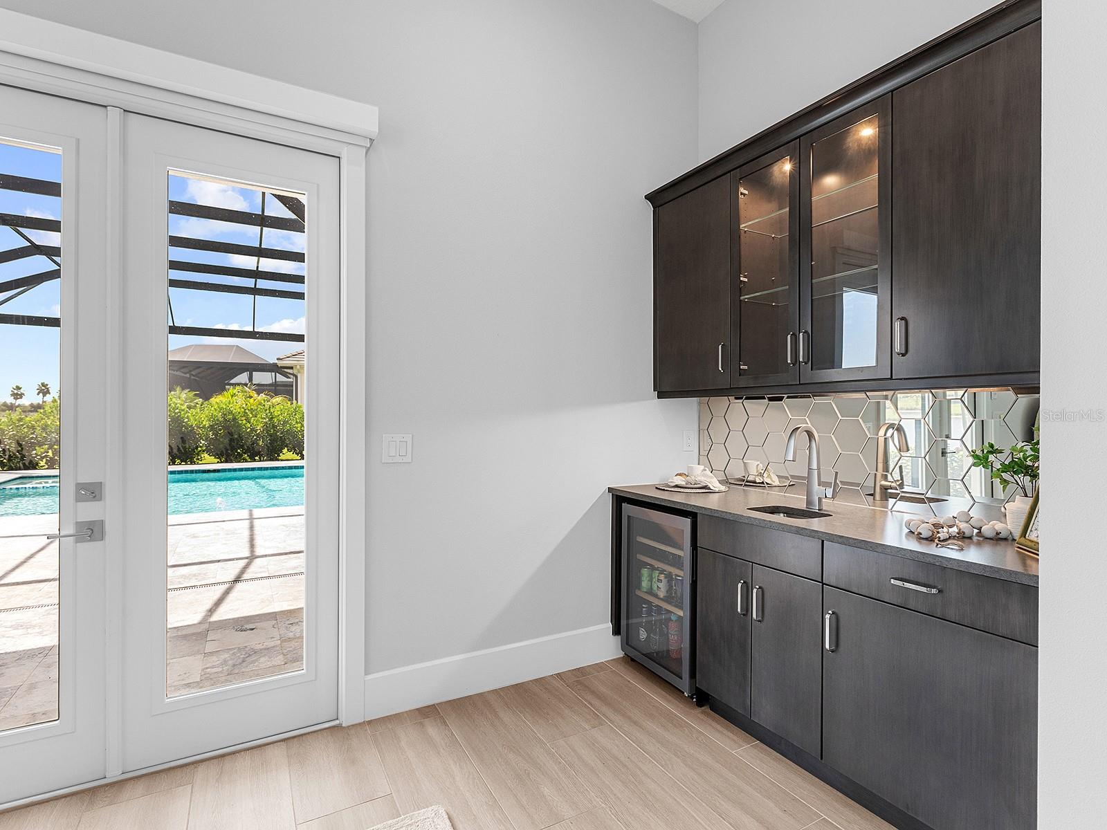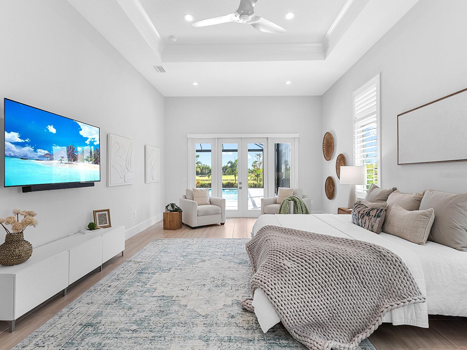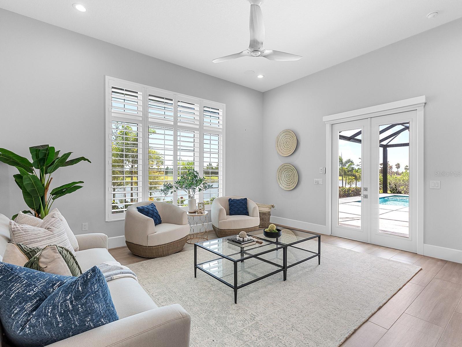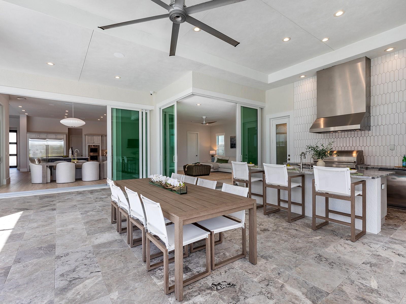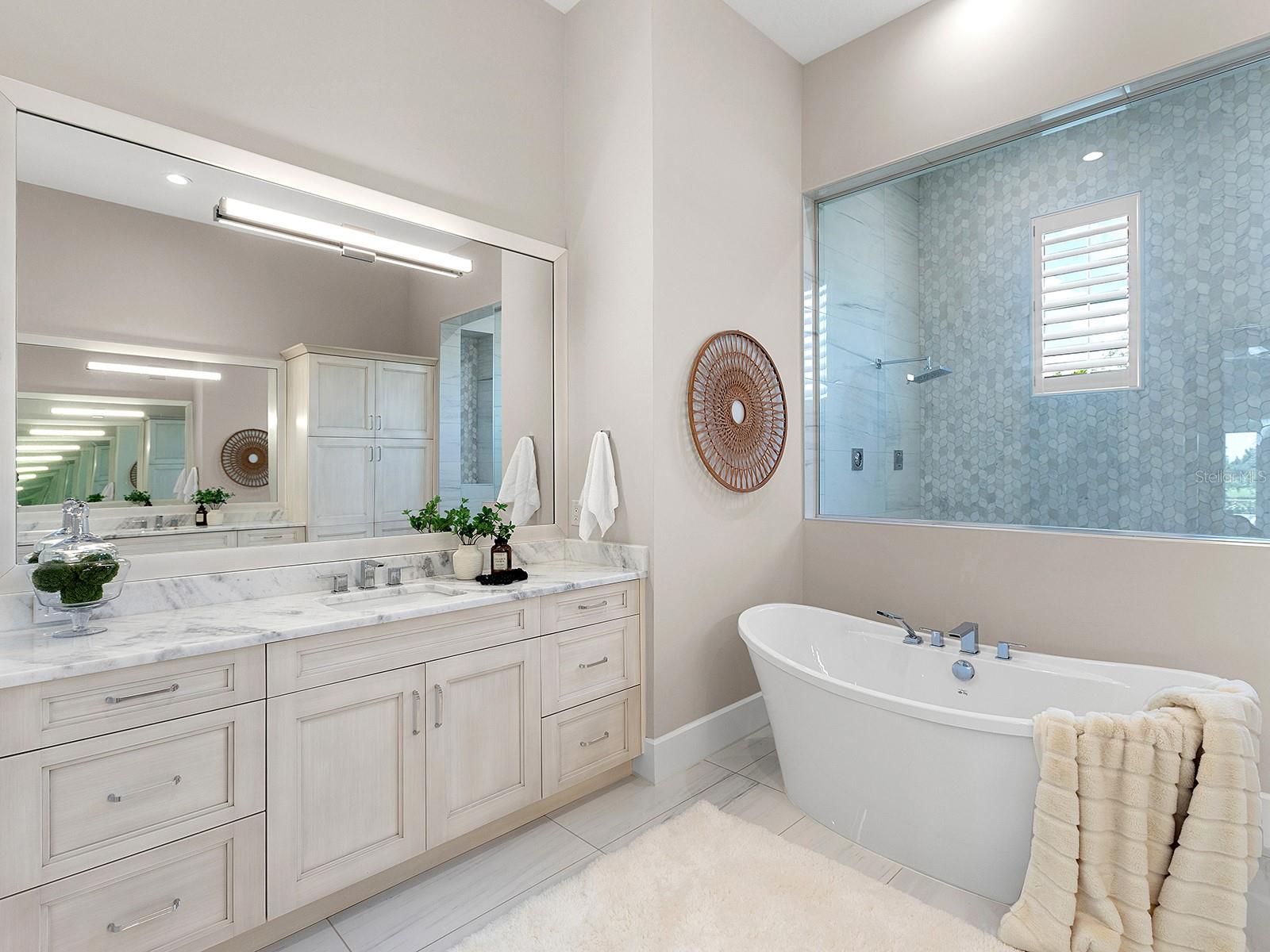 Welcome home to the ideal residence in The Lake Club with gorgeous private water views! One of the most desirable floor plans is this 2023 home offering a coveted separate casita guest house, plus a modern open plan, luxurious primary suite, 3 additional guest bedrooms all with private en-suite bathrooms, study, and expansive air-conditioned 3-car garage. The exterior invites you home with 2025 freshly painted exterior, updated lush landscaping, and wide driveway with parking pad. This residence is filled with clever upgrades that make daily life more enjoyable including IMPACT windows and sliders throughout, security camera system, Wi-Fi extenders, in-ceiling speakers, whole-house water filtration and softener system, Lutron lights, smart home systems, plantation shutters, and wood-look porcelain tile flooring throughout. The great room opens from the foyer with frosted impact glass front door straight onto the lanai through pocketing impact sliding glass doors, offering immediate views of the lake and greenspace beyond, plus a custom ceiling with hand-stained wood beams. The chef's kitchen offers impressive upgrades with an expanded island for extra seating, upscale quartzite counters, custom cabinetry, reverse osmosis, TWO custom walk-in pantries, and high-end appliance suite with 36" side-by-side Sub-Zero refrigerator and freezer, Bosch dishwasher, Wolf dual wall ovens, Wolf gas cooktop and Wolf microwave drawer. Enjoy meals in the dining room featuring a custom dry bar with wine refrigerator and disappearing corner impact sliders. This Florida home was made for an ideal indoor-outdoor entertaining lifestyle with covered dining and living areas on one of the largest lanais in the neighborhood at 3,382 SF. Relax under tray ceilings with oversized modern fans on the travertine lanai; lounge in the sunshine surrounded by the 2024 panoramic extra-strong stainless steel screen enclosure; or dine next to the outdoor kitchen complete with island, stone counters, reverse osmosis, and high-end appliances including Wolf grill, U-Line beverage refrigerator, separate ice maker and Bosch dishwasher. The sparkling saltwater pool is oversized, perfect for swimming laps or splashing in the afternoon, and features a sunken spa with spill-edge perfectly positioned to take in the lake views. Inside the owner's suite offers the ultimate relaxation with tray ceiling, seating area, French doors to the lanai with a porch area and two custom walk-in closets. The primary bathroom rivals a five-star hotel with separate vanities, large linen storage tower, water closet with Toto toilet, freestanding modern tub, walk-in shower with rainhead and 4 body sprayers. Guests will enjoy their own 3 bedrooms all with their own private and luxurious en-suite bathrooms. Plus the rear bedroom can be used as bonus room with a full pool bathroom for even more flexible spaces. The guest house casita is ideal for long-term guests, teens, live-in assistance, an in-law suite or a second office with a large studio bedroom, kitchenette wet bar, private lanai area and en-suite bathroom. Completing this residence is a private study, spacious laundry room with hidden ironing board and guest powder bathroom. The air-conditioned and insulated 3-car garage offers expanded room for cars and toys, 2 AC splitters, custom storage and a dual electric car charger. The Lake Club is an exclusive premier, gated community with a Grande Clubhouse, restaurant, pool, tennis, pickleball and more.